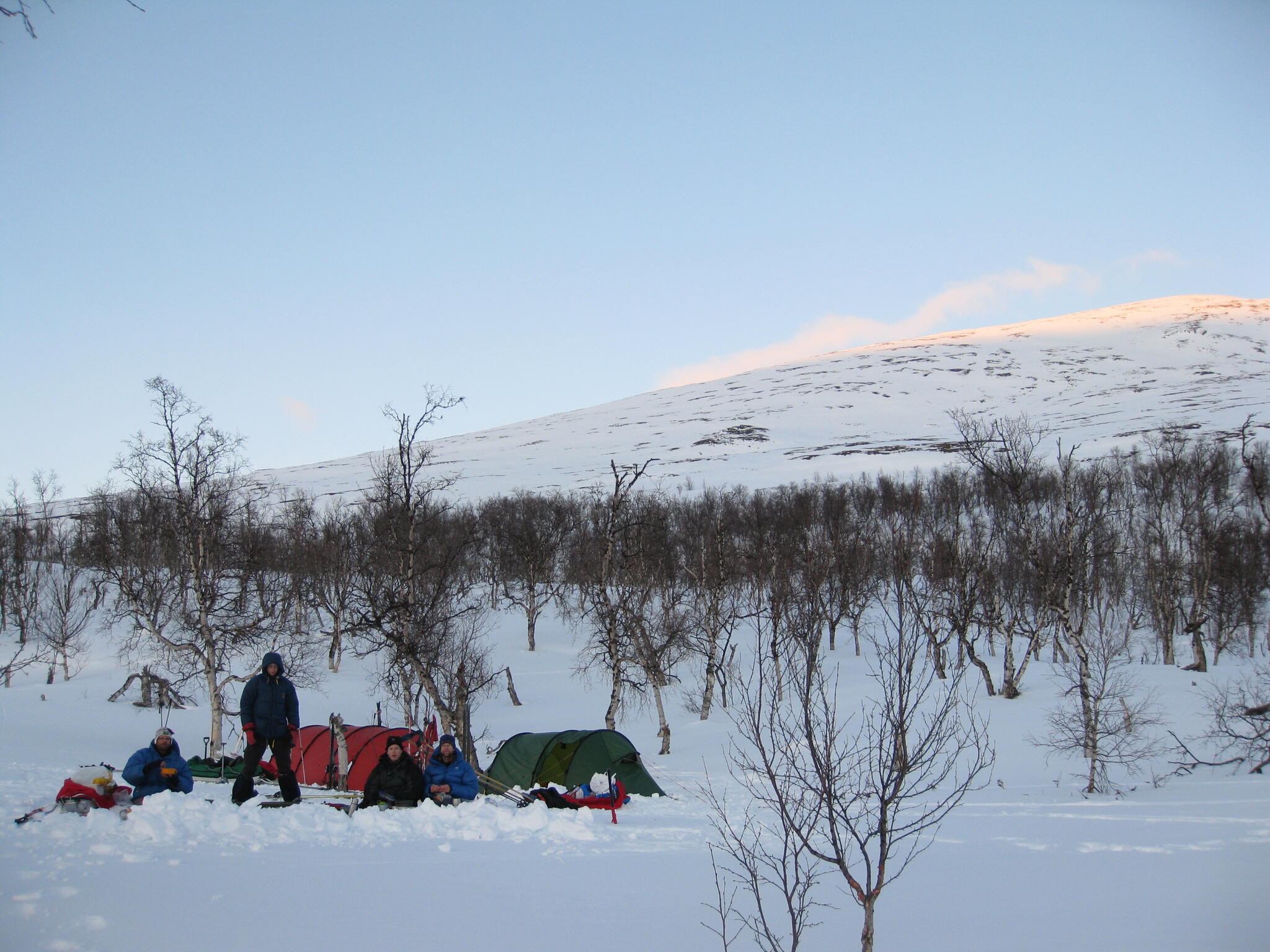 Skaren bar relativt bra i björkskogen och vi slog upp tälten vid väständan av Bihppás-fjällets fot.