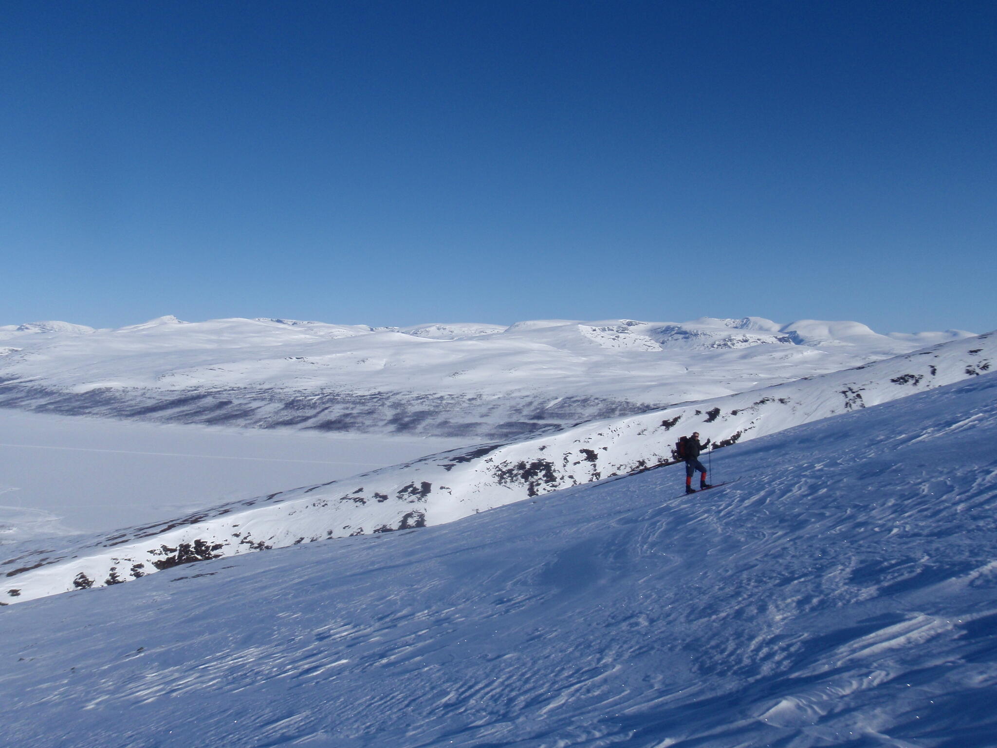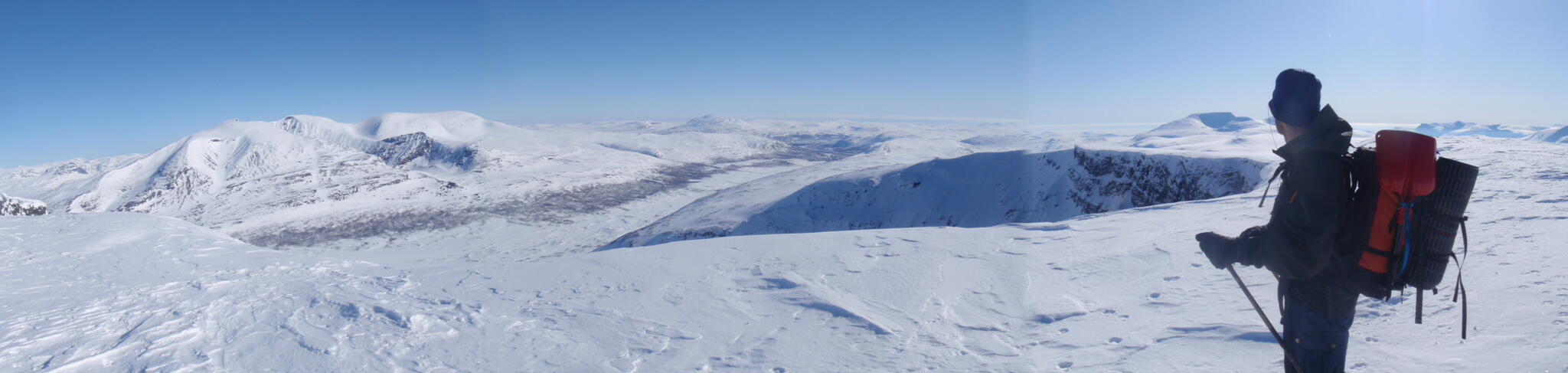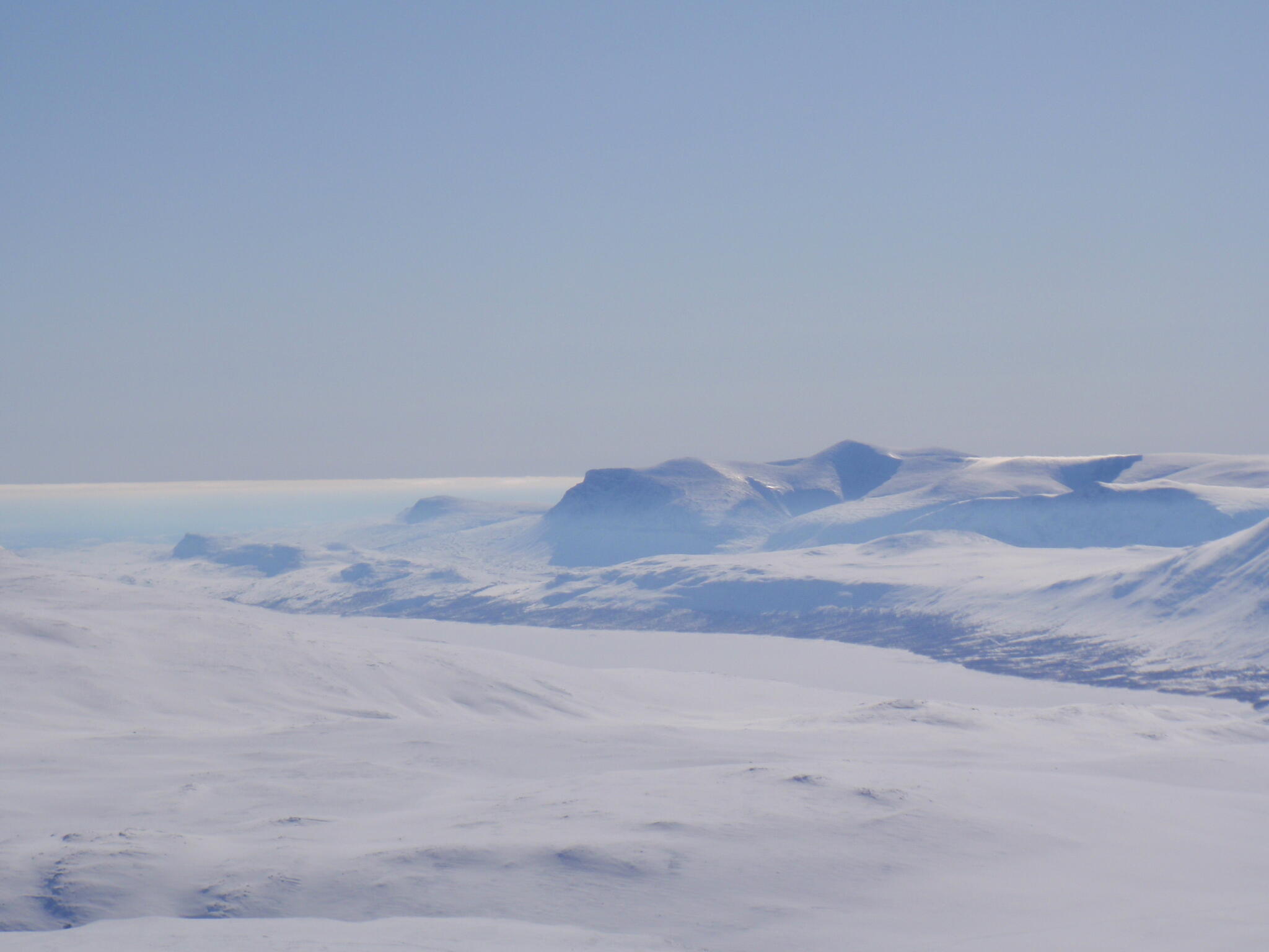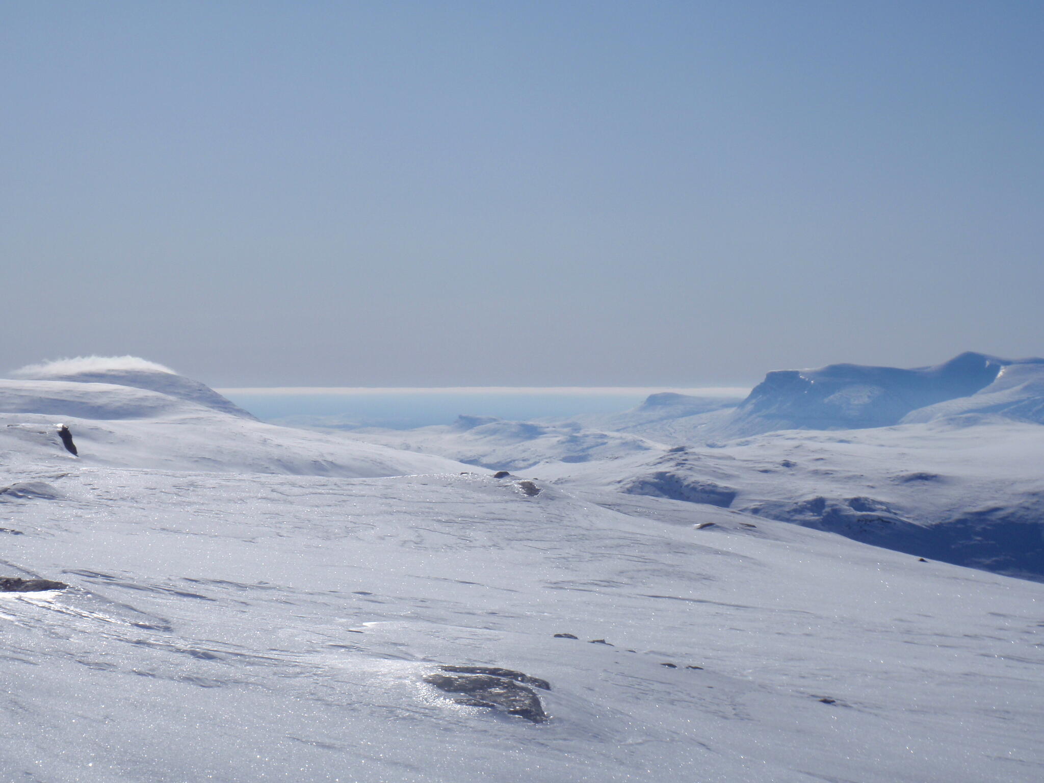 Resten av dagen blev strålande klar. Vi kunde se att det var dimmor runt om oss på längre höjd, även i Anjavassdalen. På grund av det avstod vi från att skida ditåt. Vi skidade därför istället på längs fjällen en bit upp.