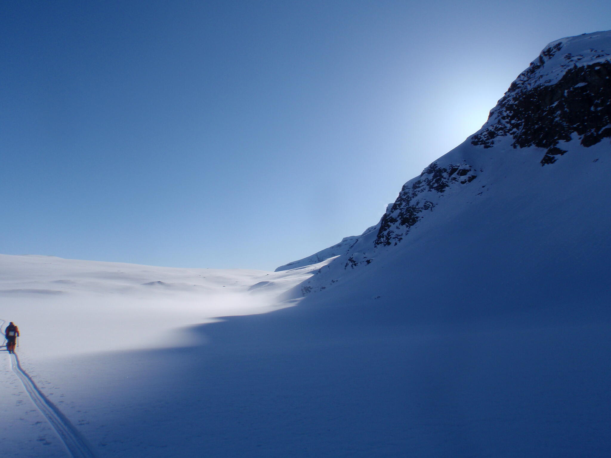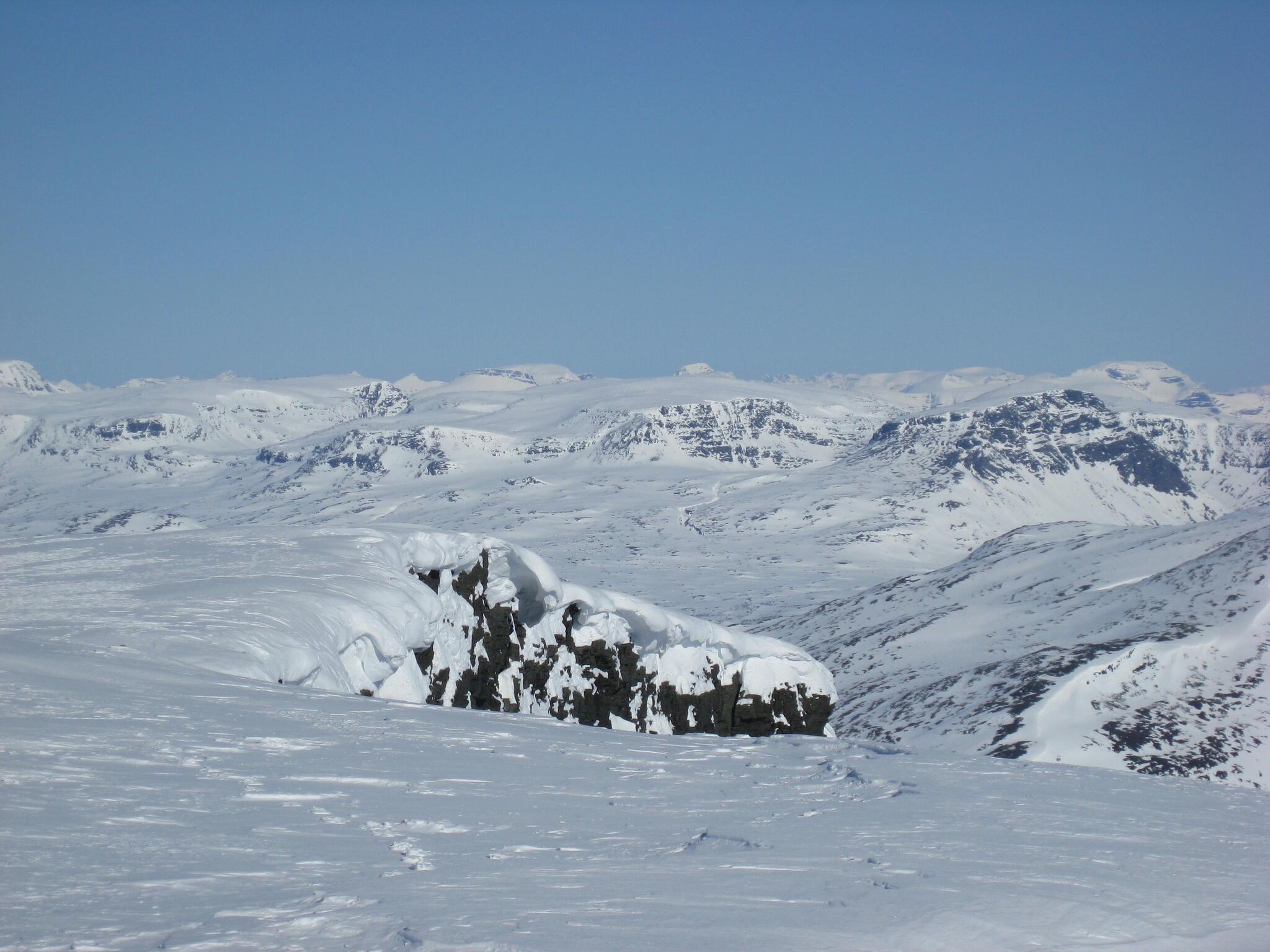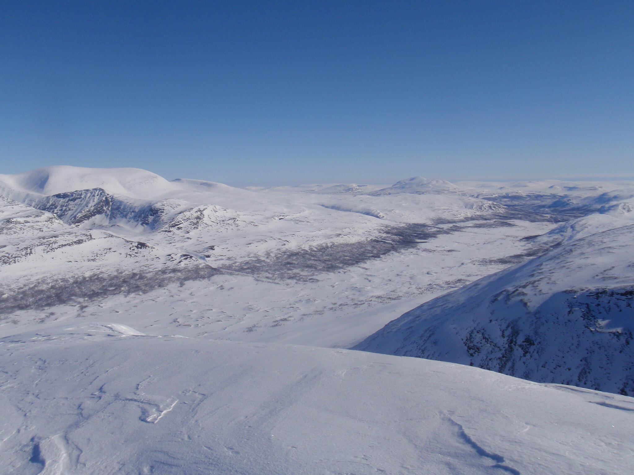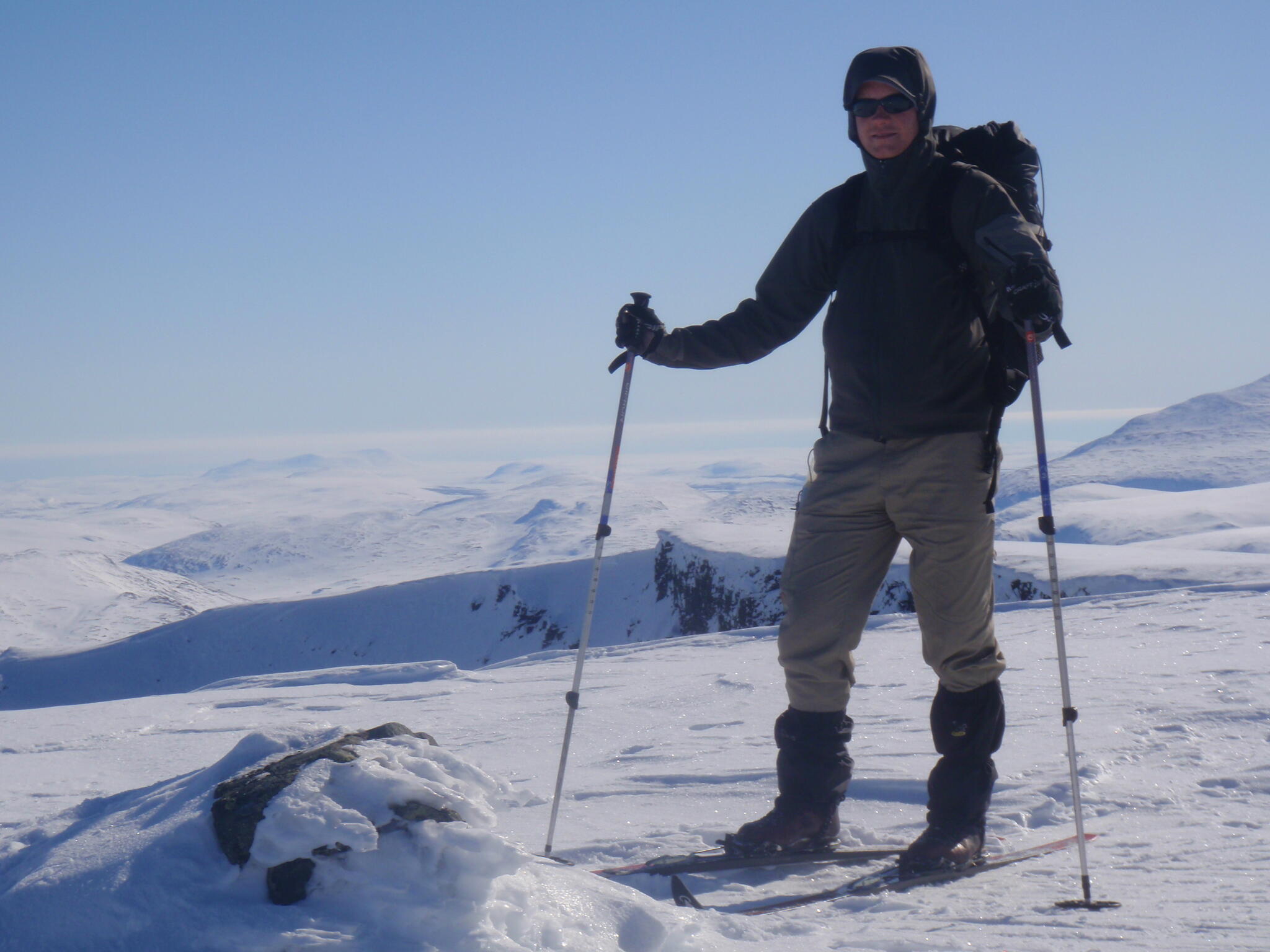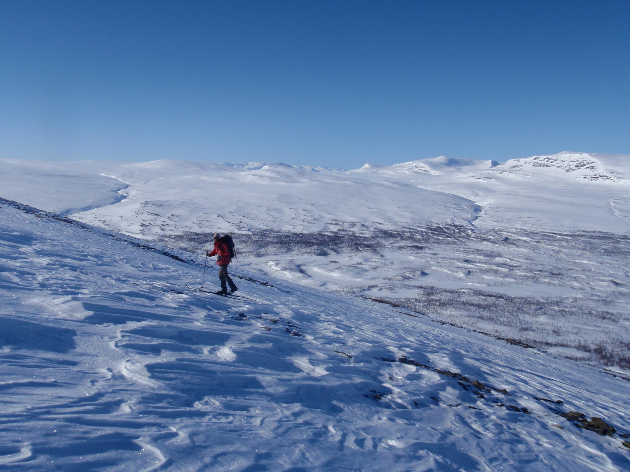 Resten av dagen blev strålande klar. Vi kunde se att det var dimmor runt om oss på längre höjd, även i Anjavassdalen. På grund av det avstod vi från att skida ditåt. Vi skidade därför istället på längs fjällen en bit upp.