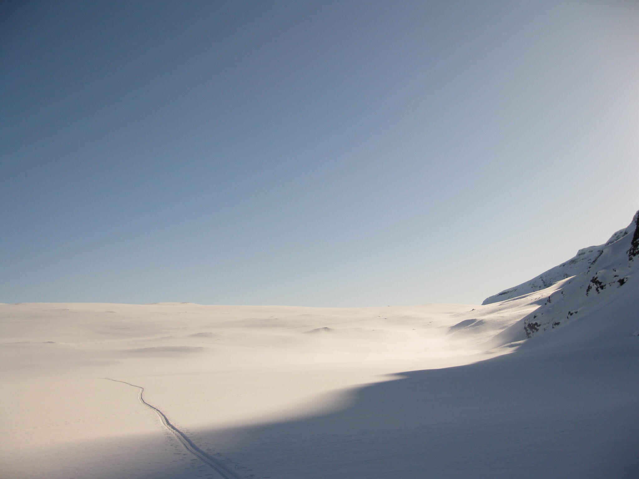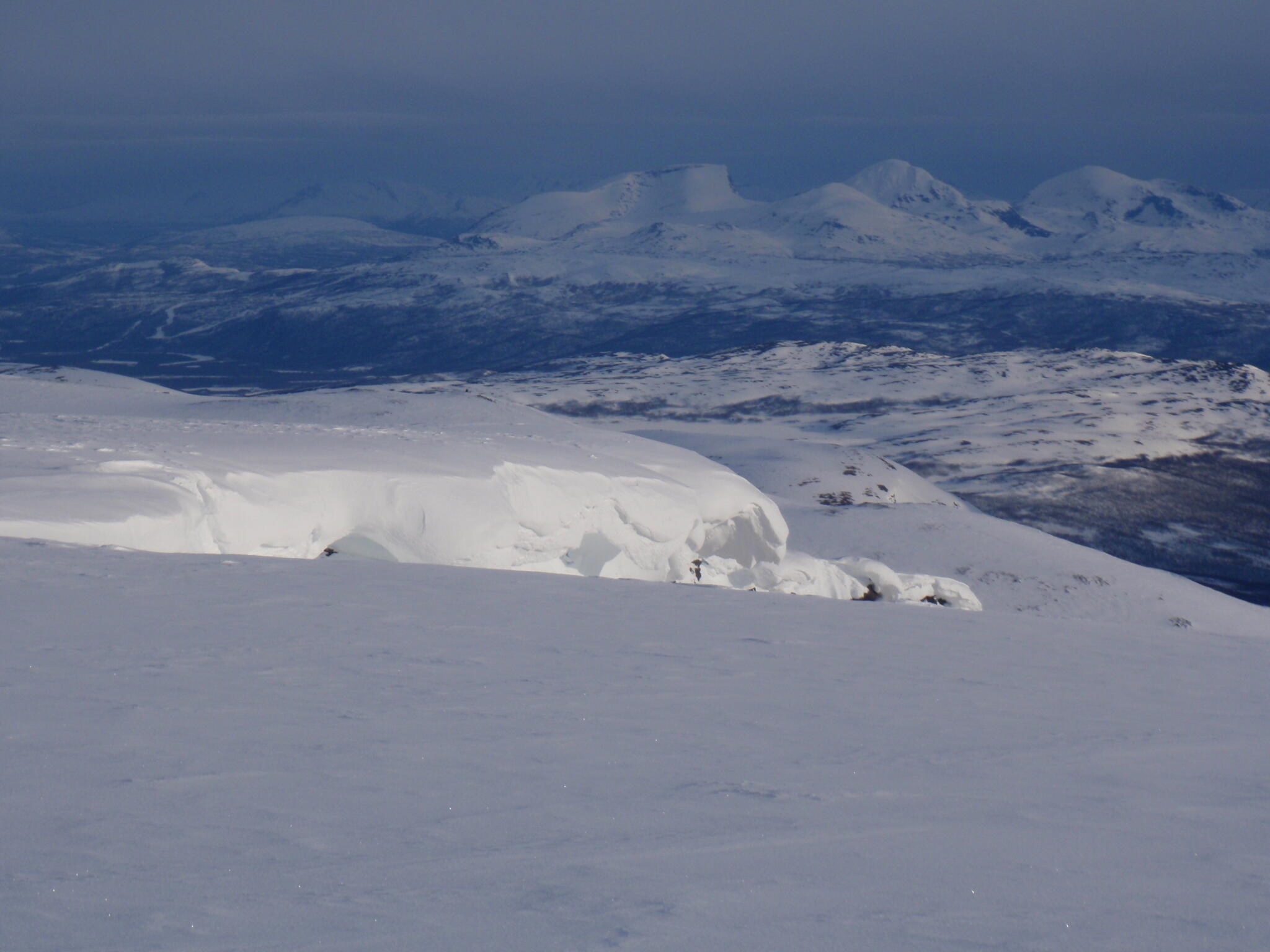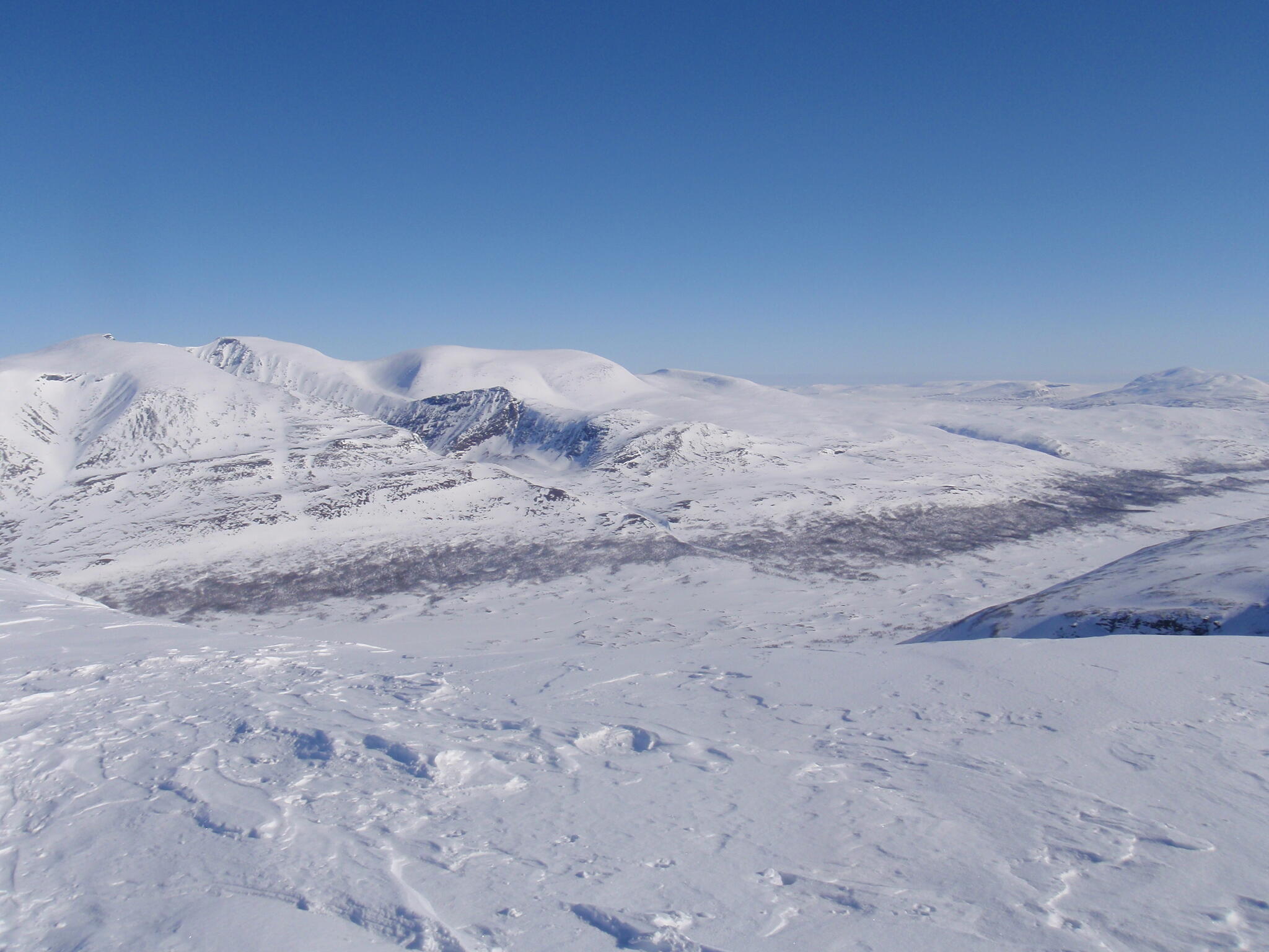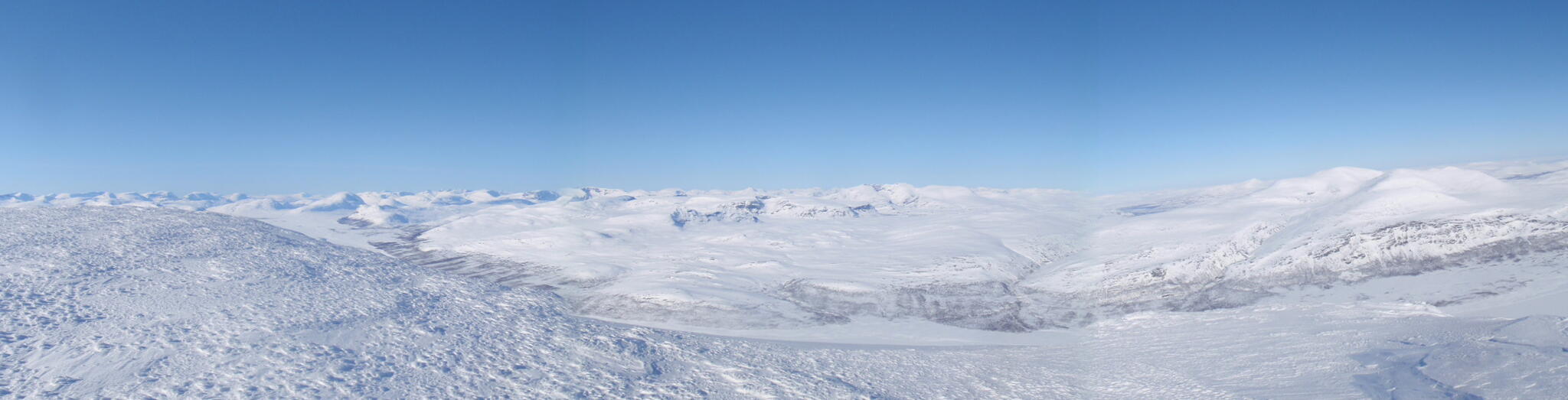 Resten av dagen blev strålande klar. Vi kunde se att det var dimmor runt om oss på längre höjd, även i Anjavassdalen. På grund av det avstod vi från att skida ditåt. Vi skidade därför istället på längs fjällen en bit upp.