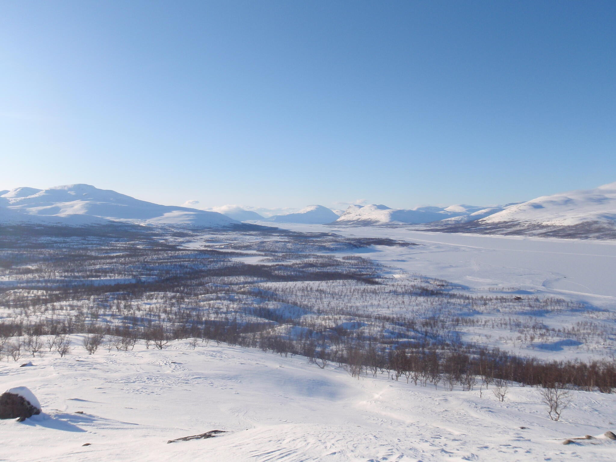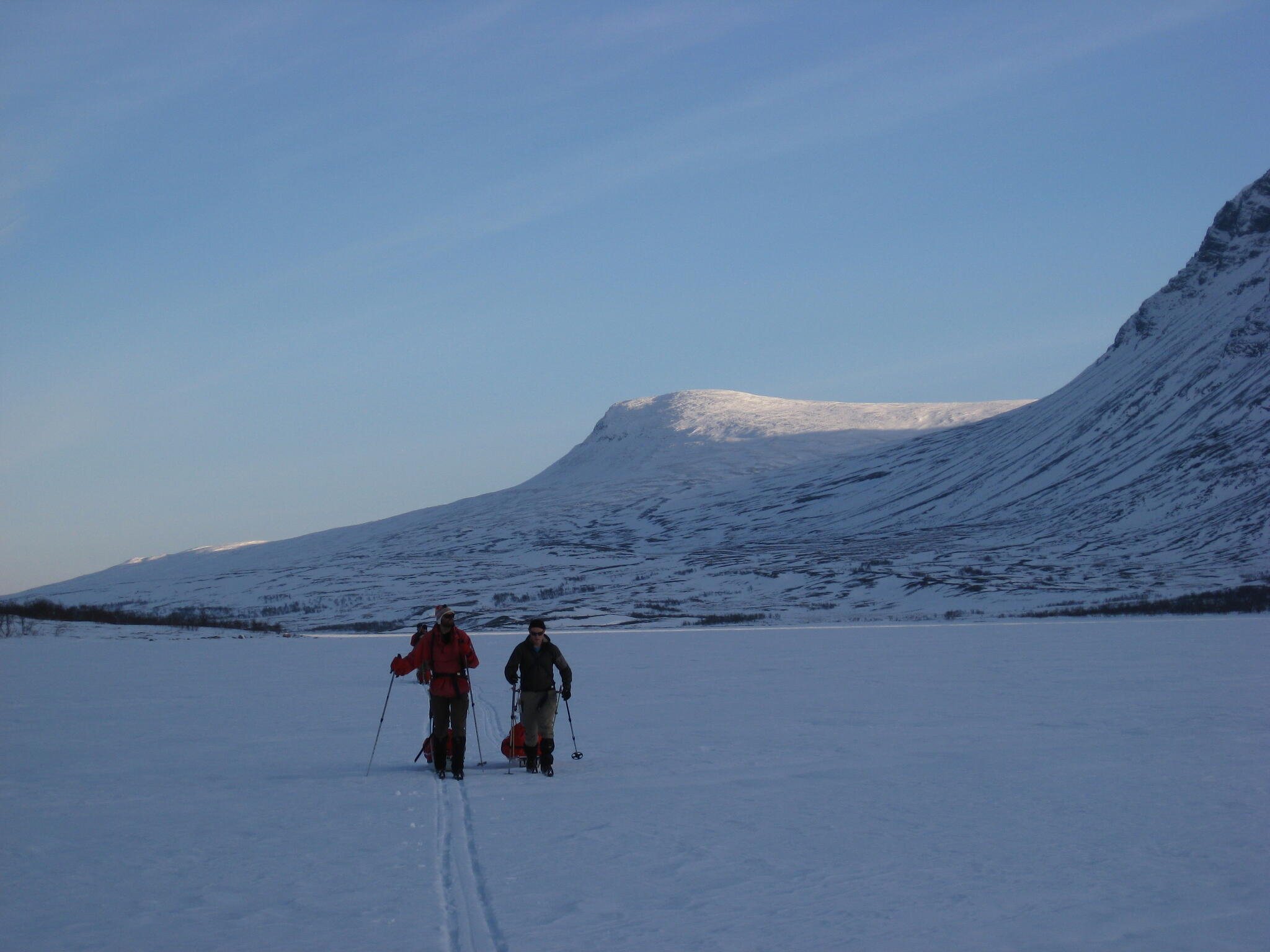 Vi skidade ner mot sjön Torneträsk, vilken är Sveriges sjätte största sjö. Vi ville lämna sjön långt in i viken Láimoluokta. Nu behövde vi bestämma oss om vi skulle runda halvön norrut och fjället Bieskecohkka eller om vi skulle gena via Rásakluokta. Vi valde det senare.