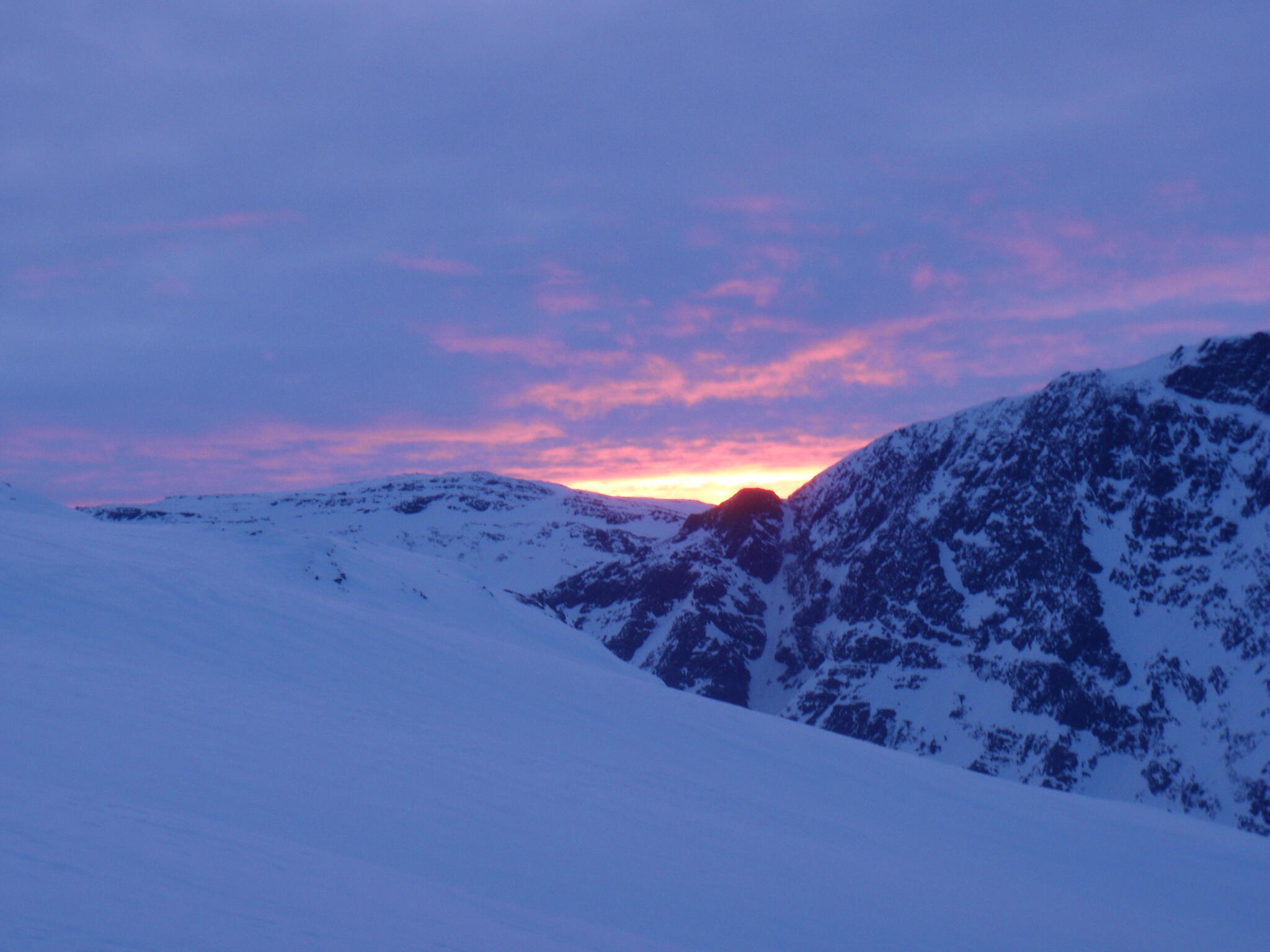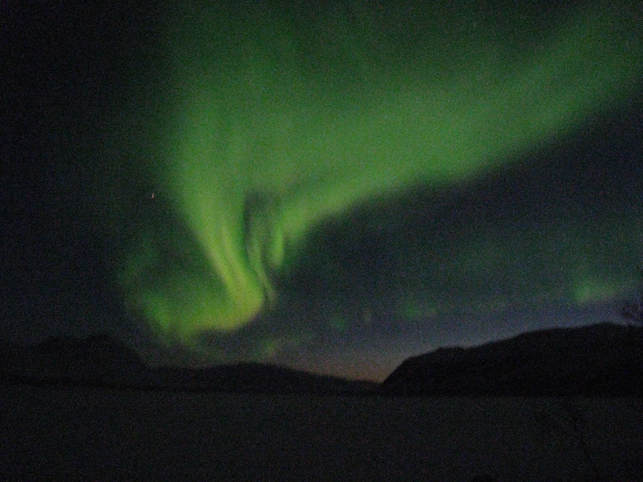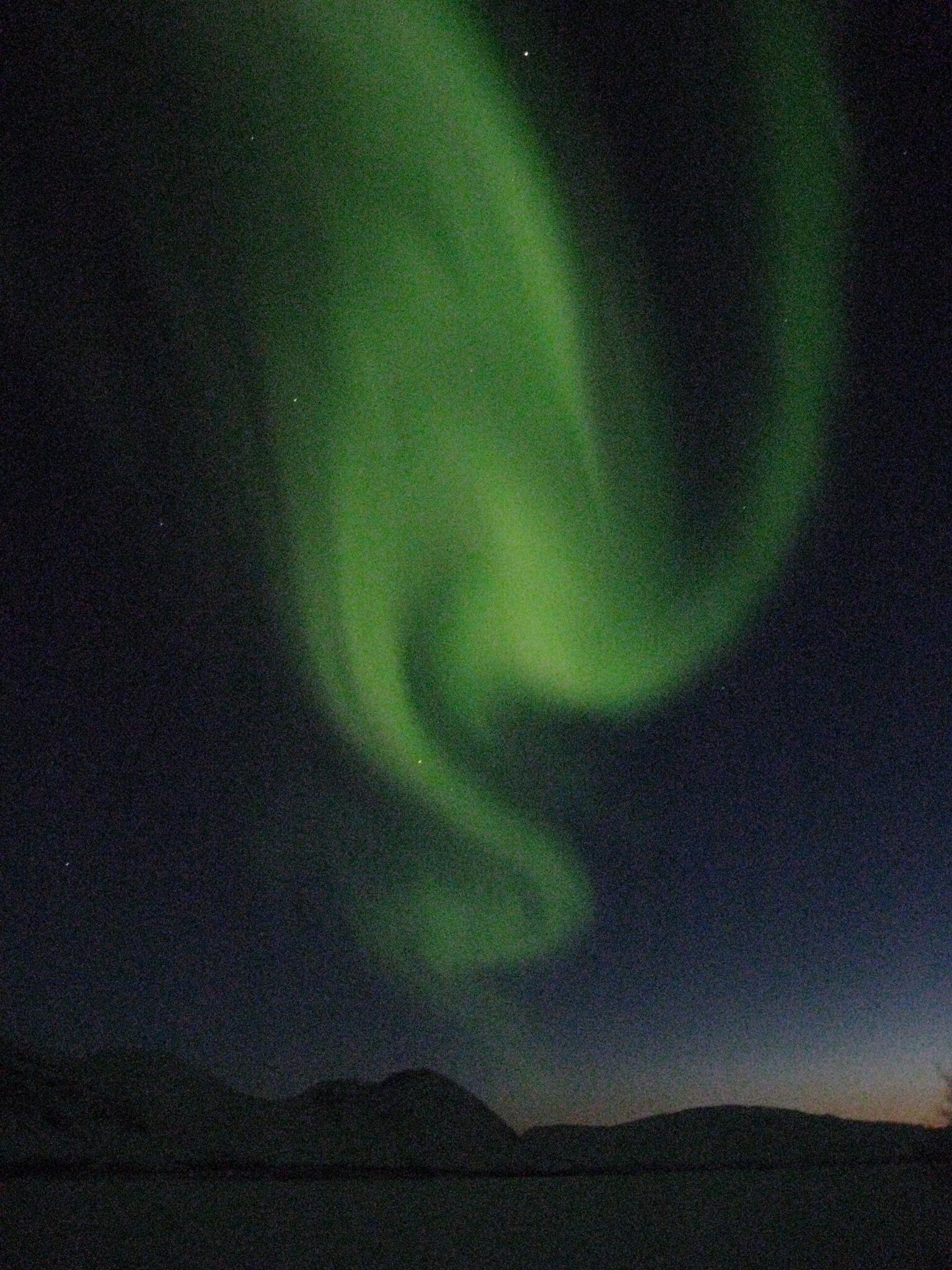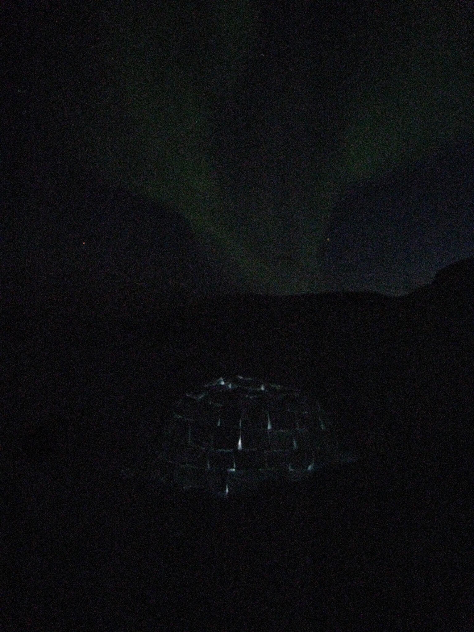Solen gick ner bland de lådformade fjällen runt om oss. Snart kom norrskenet igång.