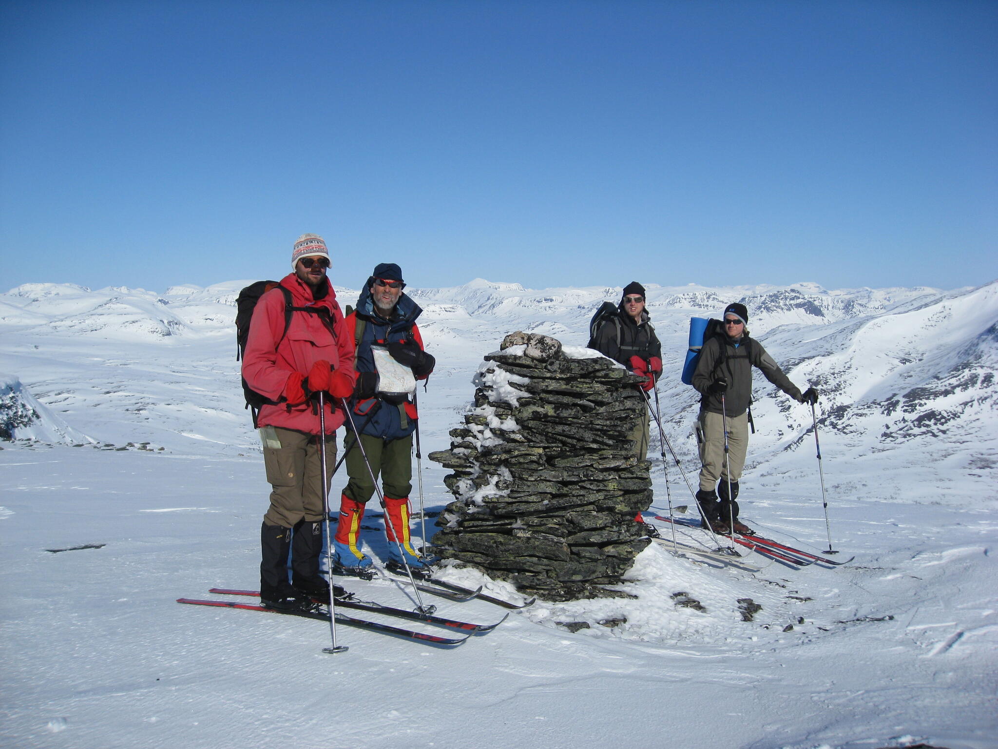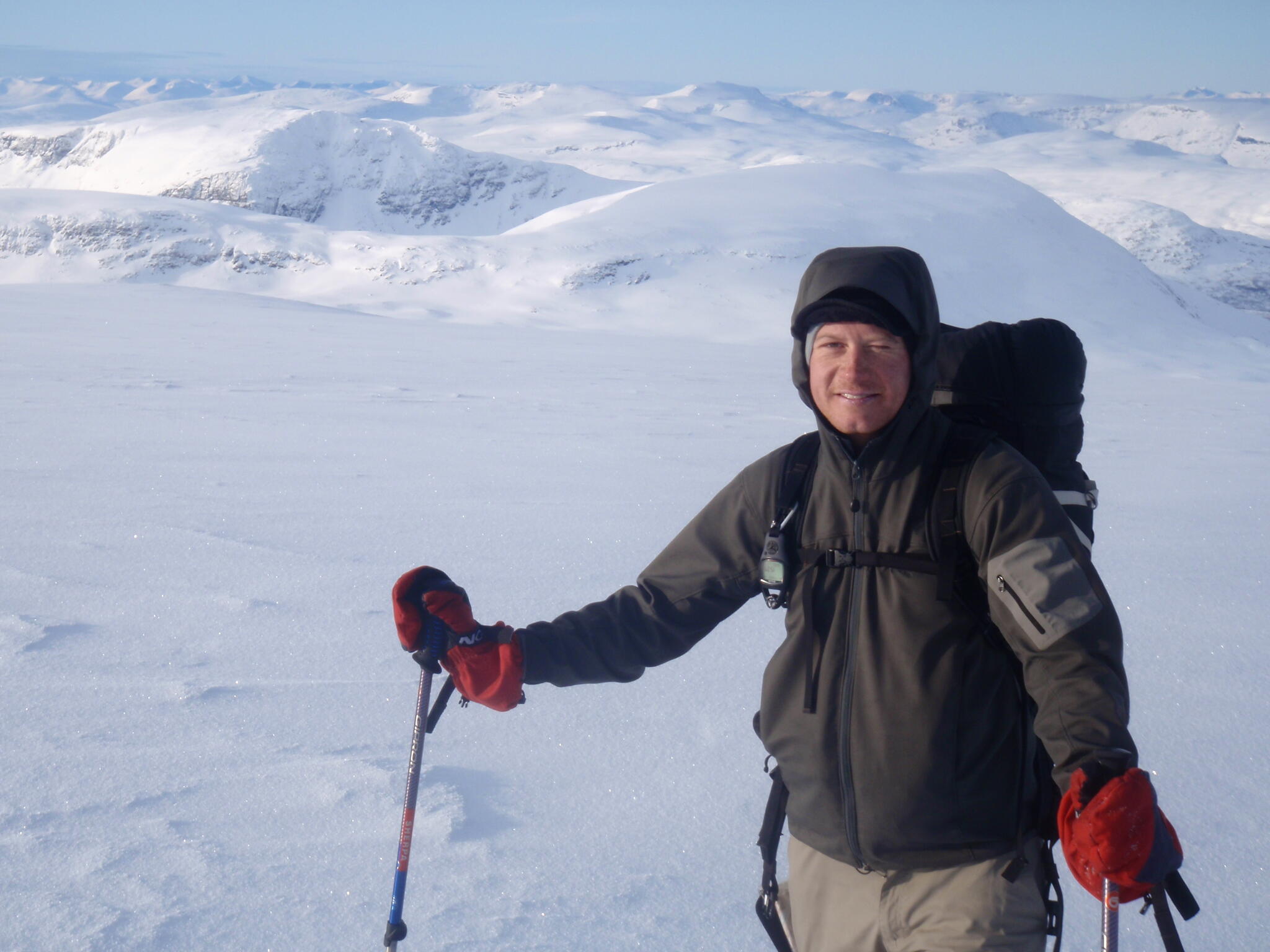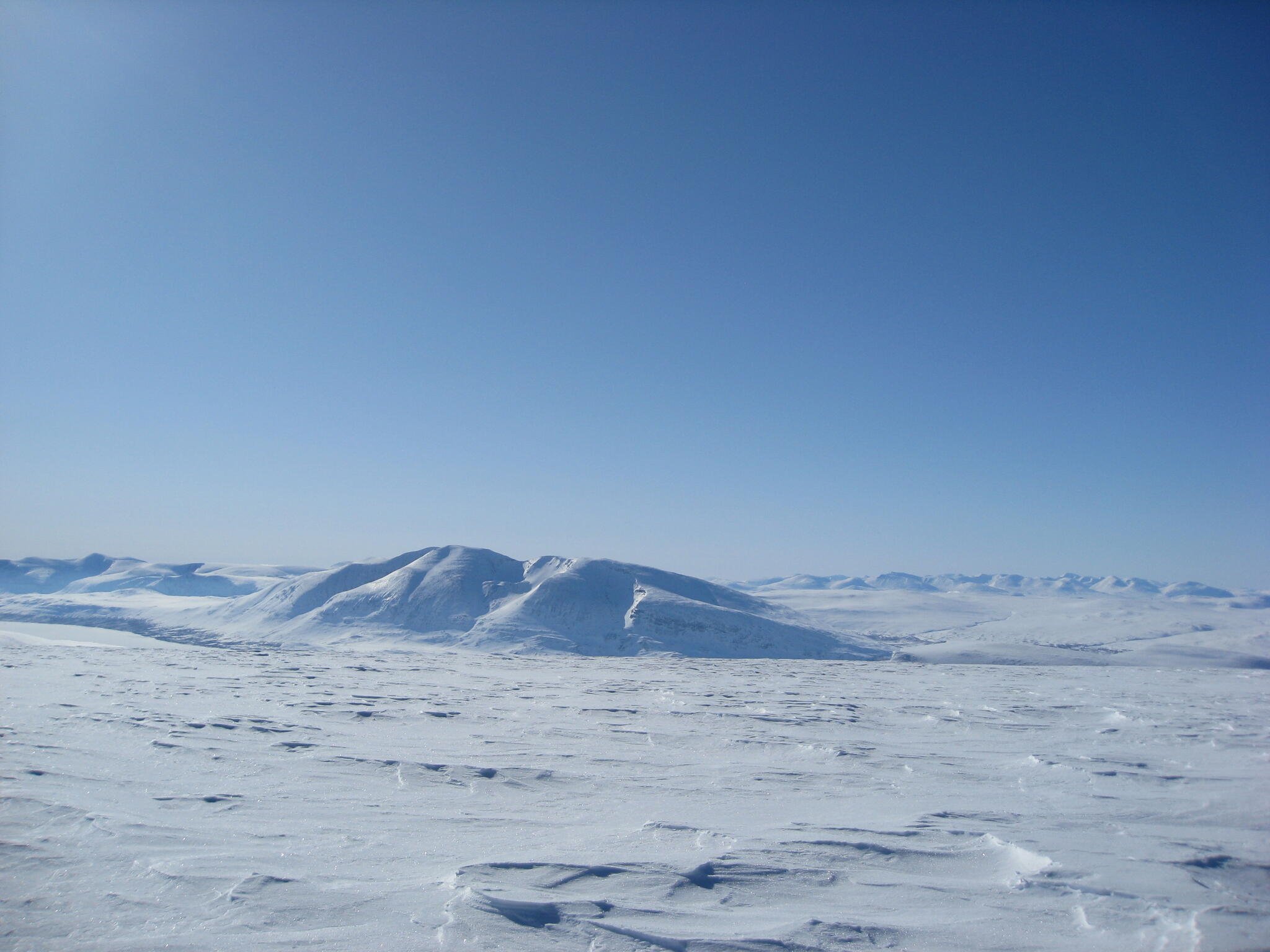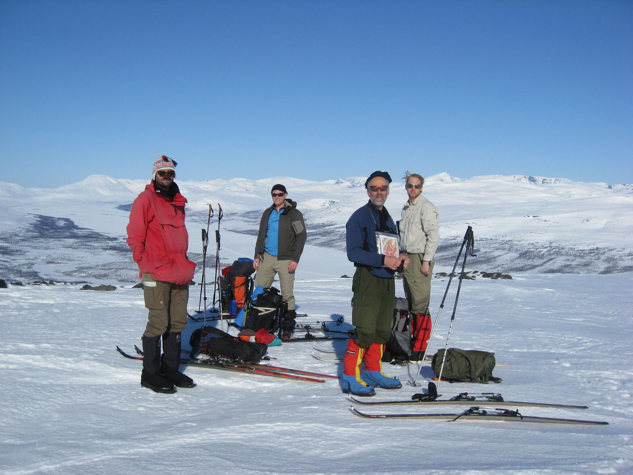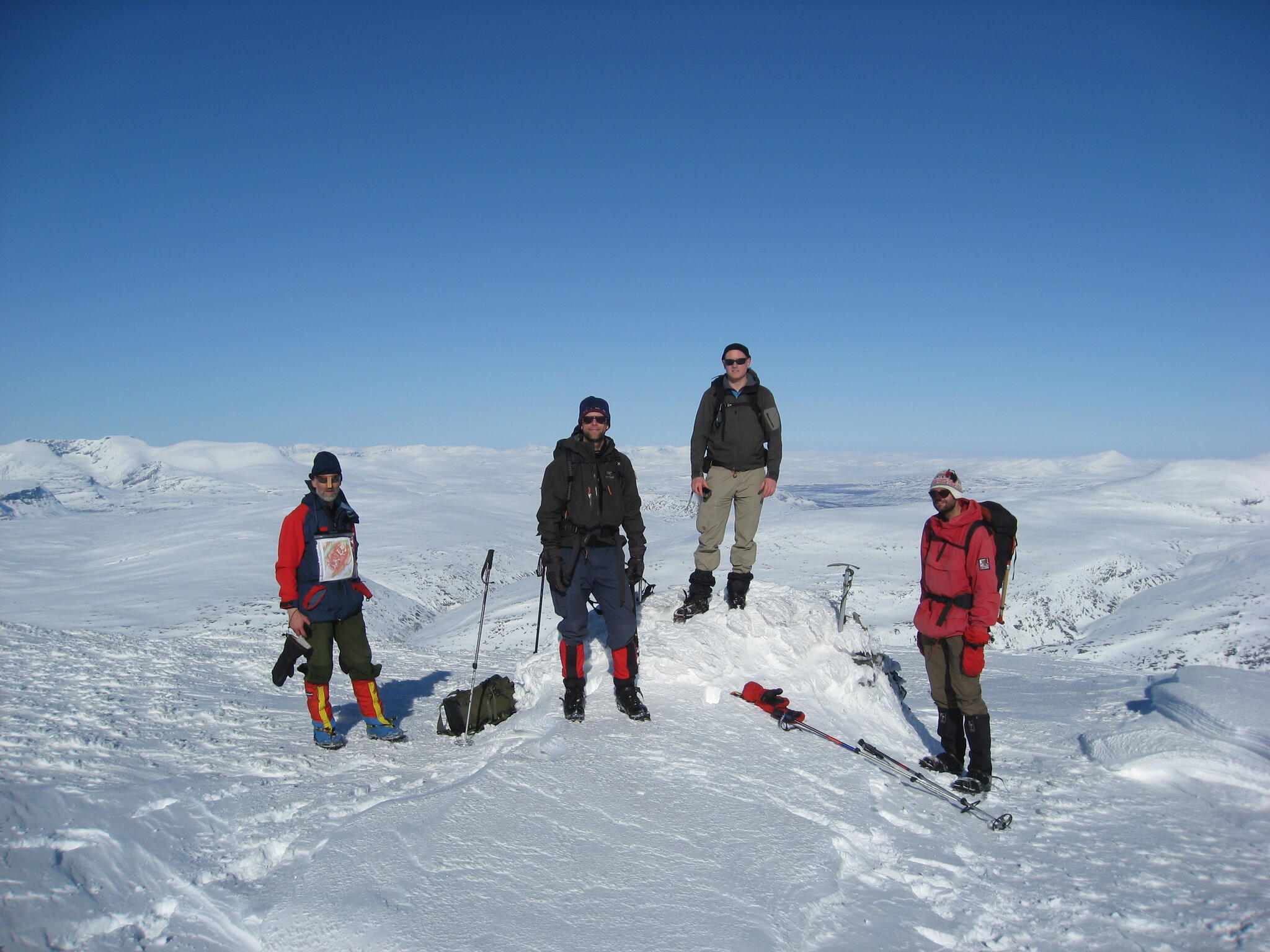 Redan hemma vid köksbordet hade vi valt ut några berg som vi ville bestiga. Ett av dem var Bihppás (1659 möh) som står relativt ensligt och som bjöd på en enastående utsikt. Vi gjorde en varm och solig kamvandring från toppen 1560 till huvudtoppen. Ytterligare en topp som vi hade tänkt bestiga var Njunis, på vars topp det finns en radarstation (för att spionera på Sverige?). Vi valde dock att gå upp på Gaibagáisi istället, som med sin väldigt platta topp och oerhört branta kanter är spektakulär. De tredje och sista toppen vi hade tänkt gå upp på var Isogaisi, då den verkade vara lätt att gå upp på och att man skulle kunna få en fin utsikt därifrån mot lågländerna norrut samt de trånga dalarna som omger berget. Vi hade läger vid södra sluttningen två nätter för att dels kunna bygga en igloo och dels kunna få ett bra toppturstillfälle. Första gången vi var uppe på toppen var den ingen sikt på toppen. Vid andra tillfället var vi två av oss som gick upp på toppen sista morgonen för att kunna få fin sikt. Vi nådde toppen kl 6 på morgonen och sikten var perfekt.