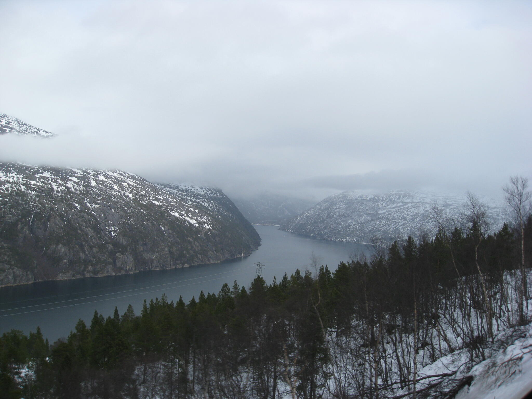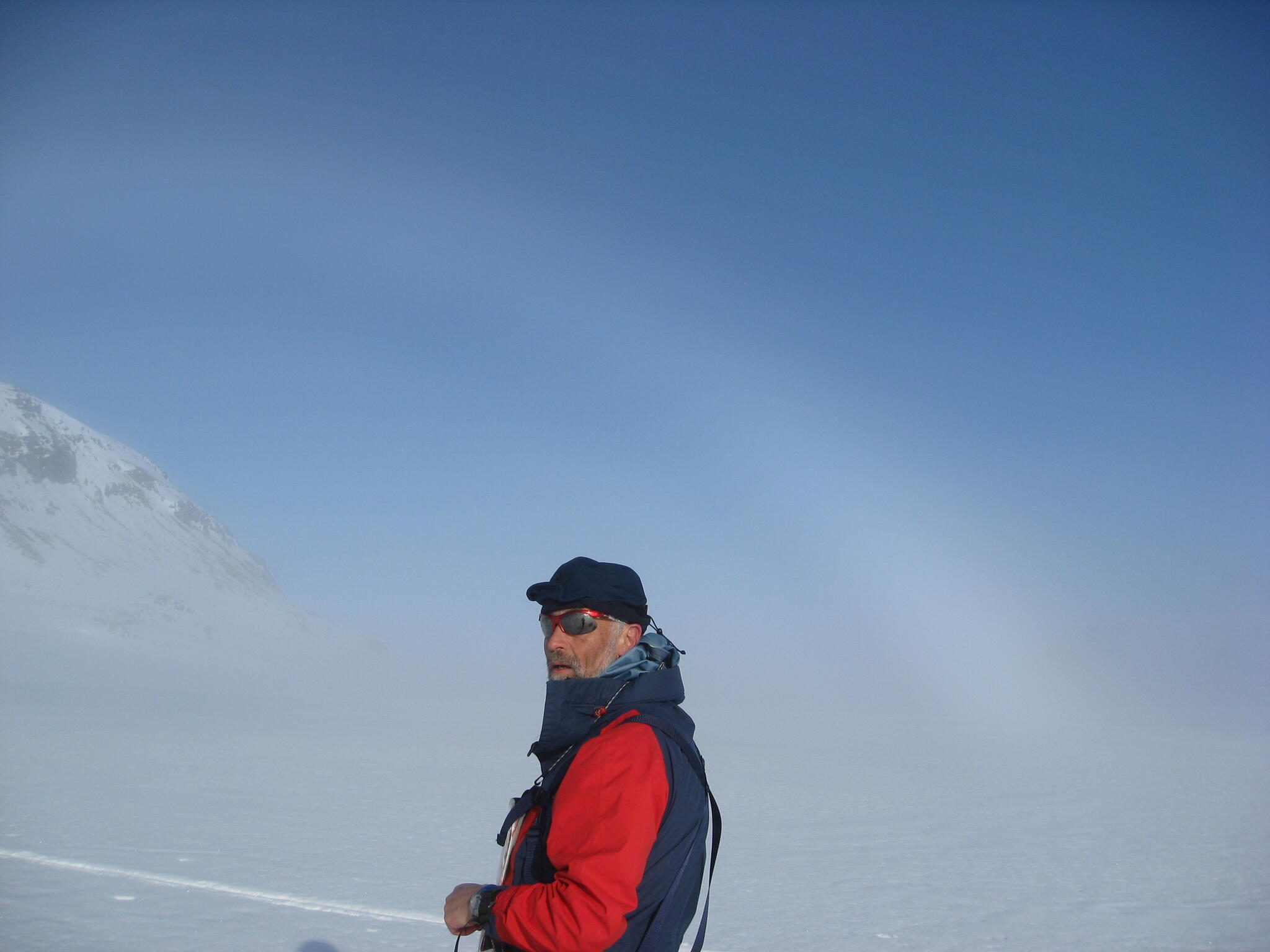 Vi skidade ner på Altevatnet och passerade Storbukthytta. Där pratade vi med några som menade att dimman kom från Sverige.