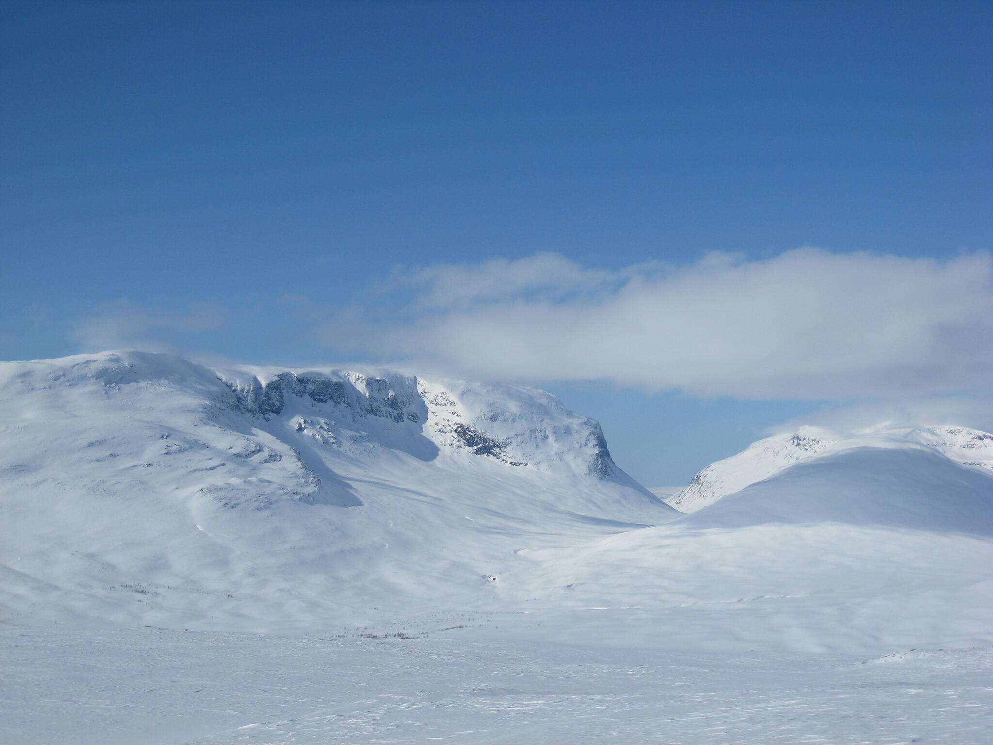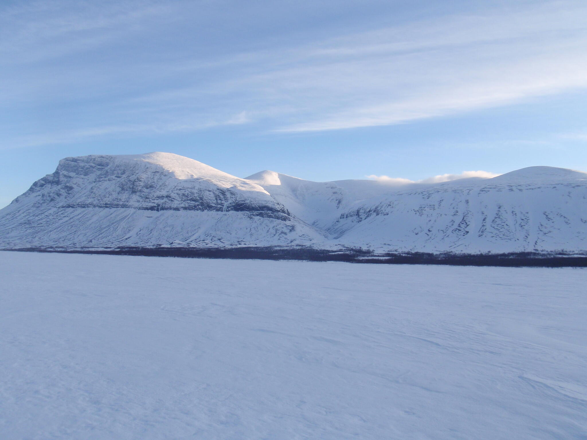 När kom fram till Nordkalottleden svängde vi västerut. Så vi skidade på södra sidan av fjällmassivet Gaibagáisi. Fjället har branta sidor och platt topp.