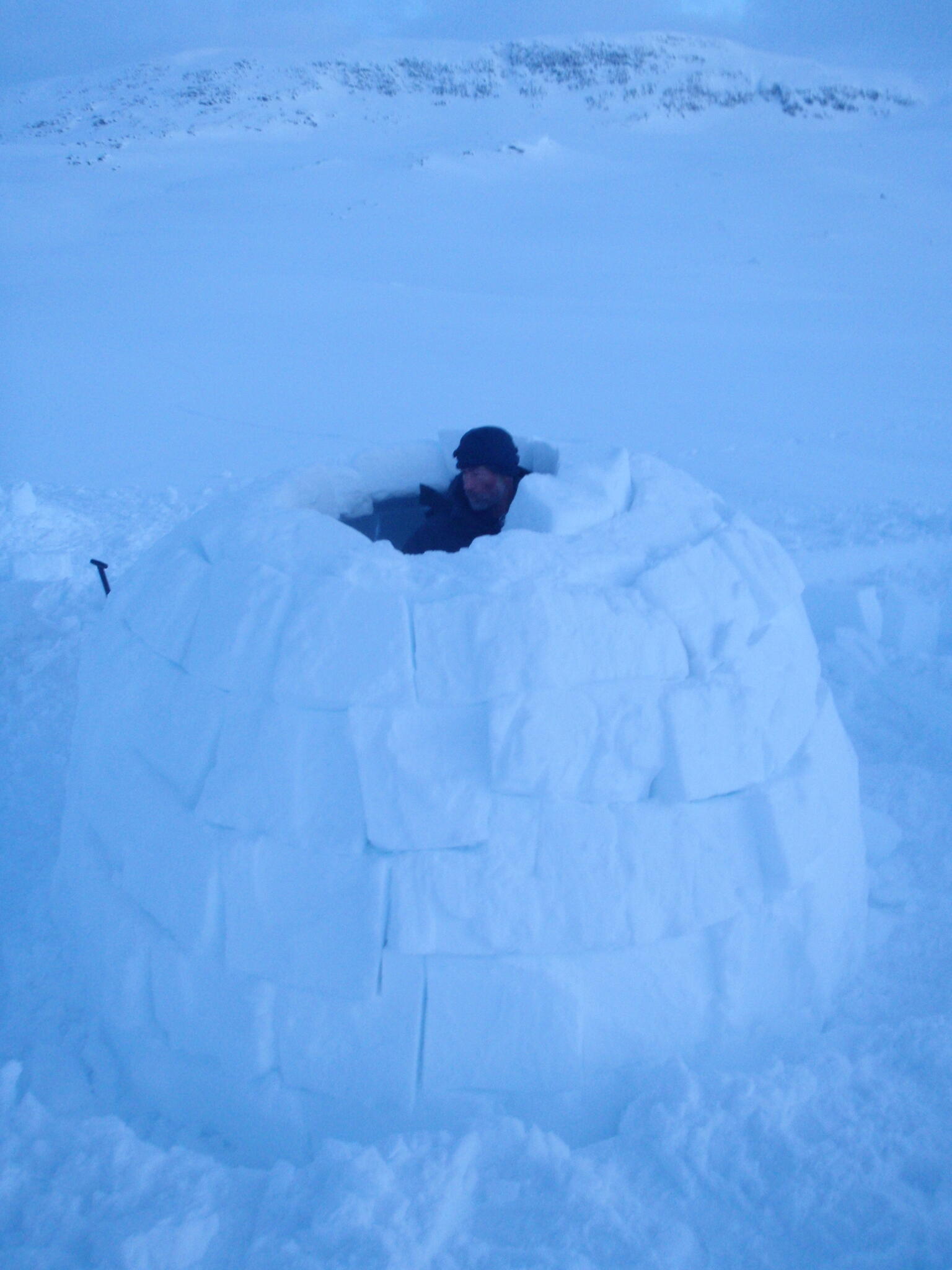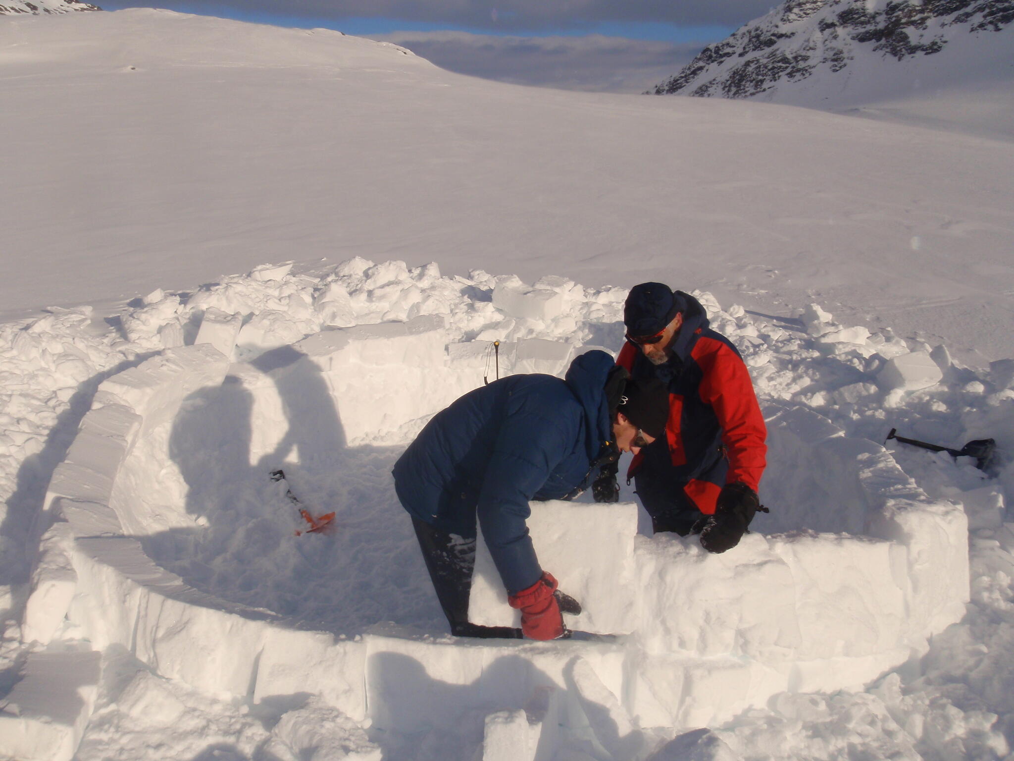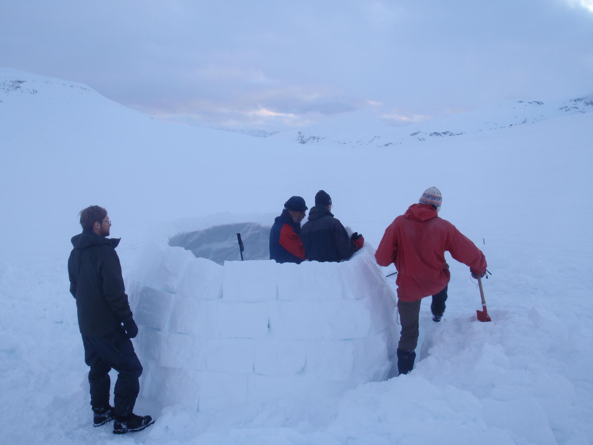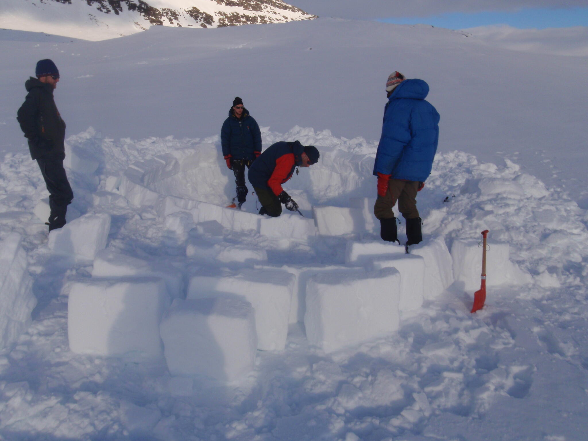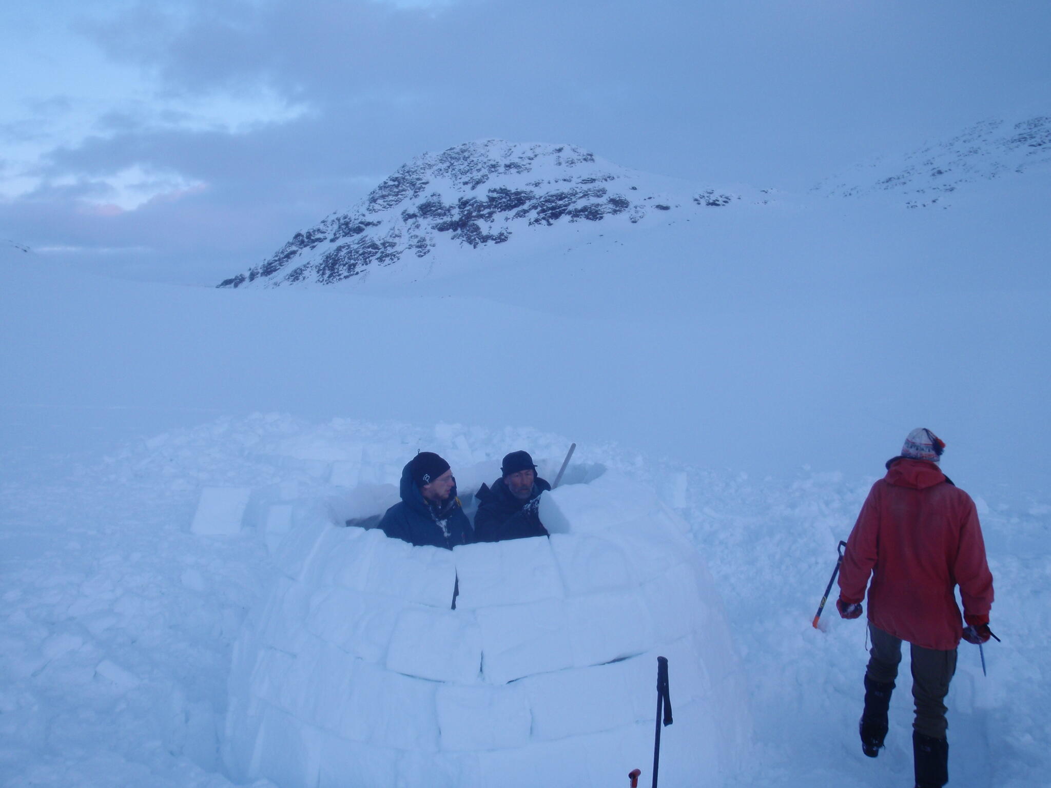 När vi kommit ner till tälten klarnade vädret upp. Vi fortsatte med igloobyggandet.