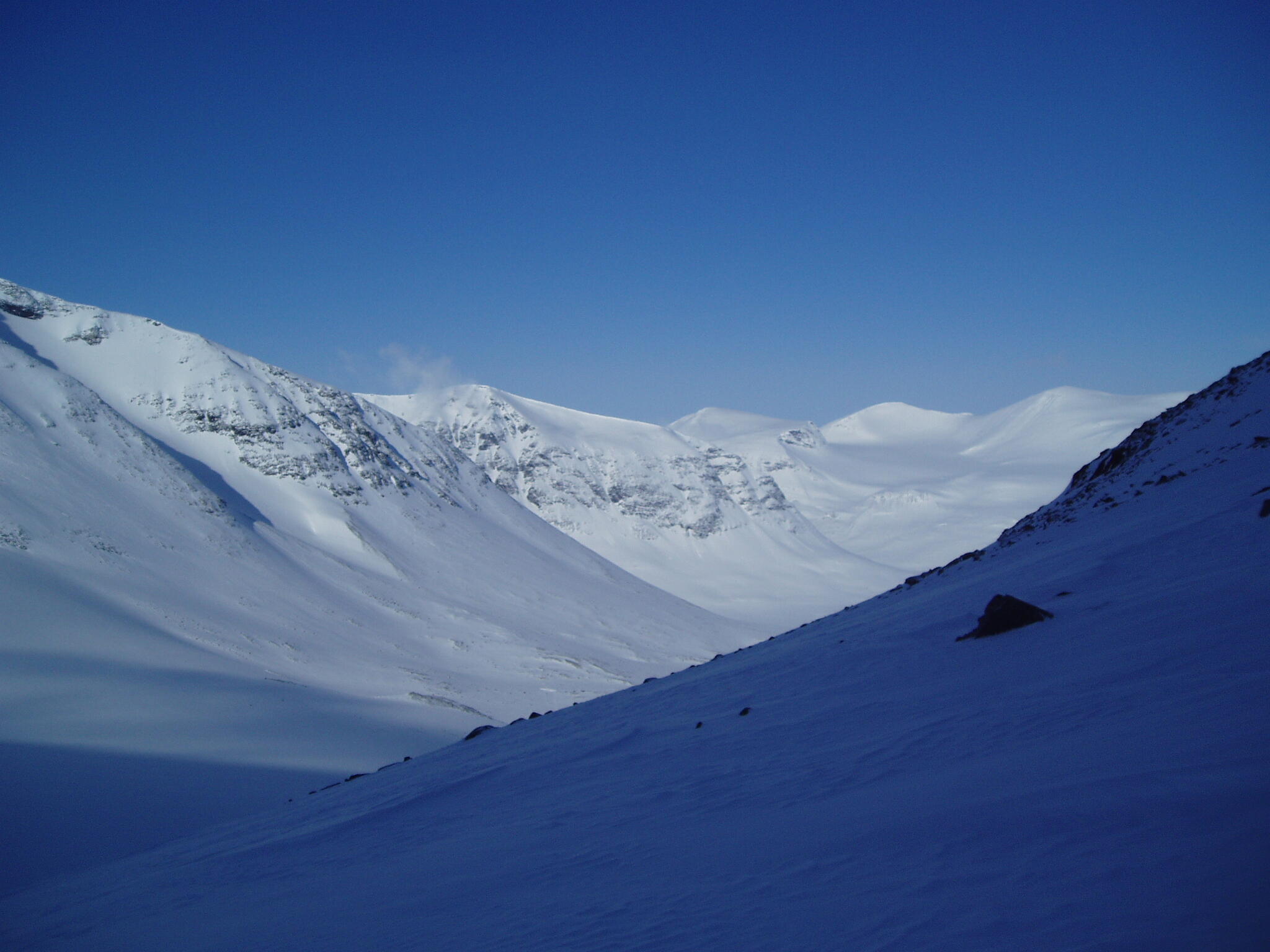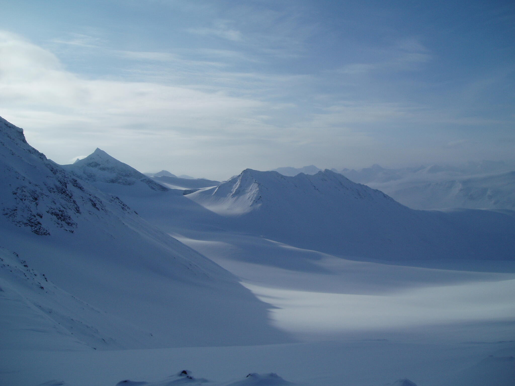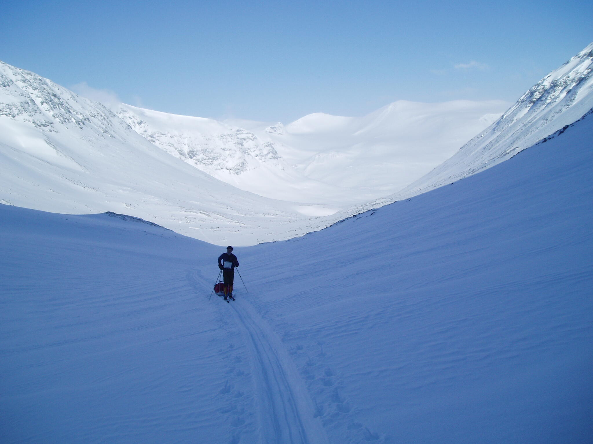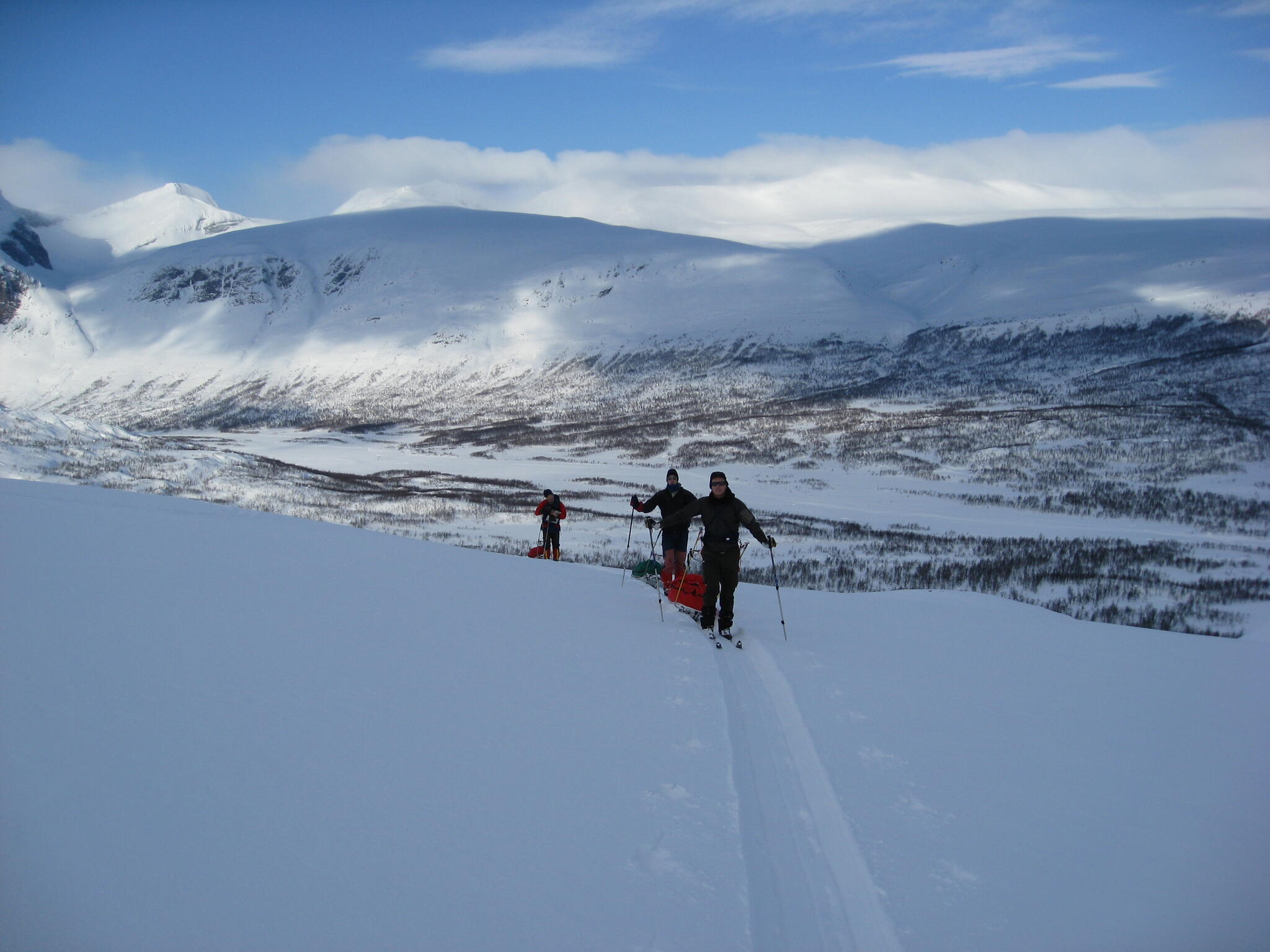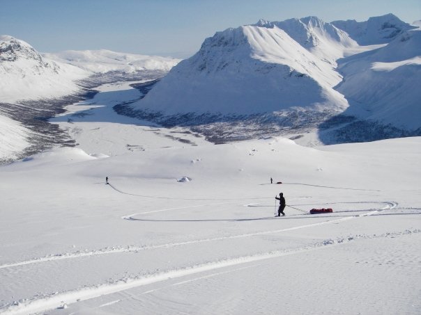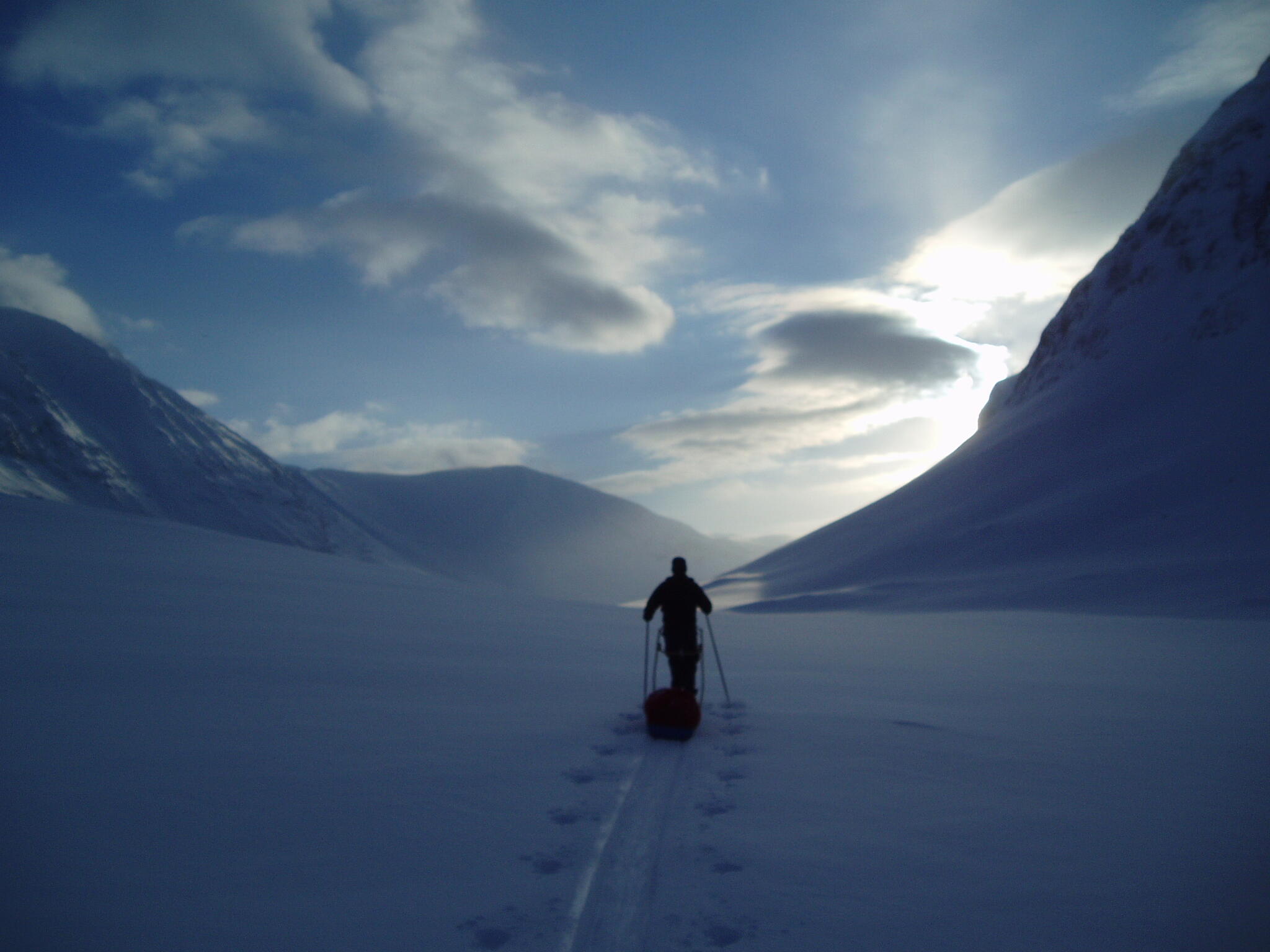 På väg ner i Rapadalen. Vill egentligen inte lämna denna utsikt. Observera min fina hemgjorda pulka : ) Foto: Michael Heuman