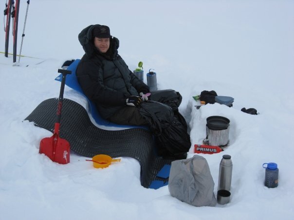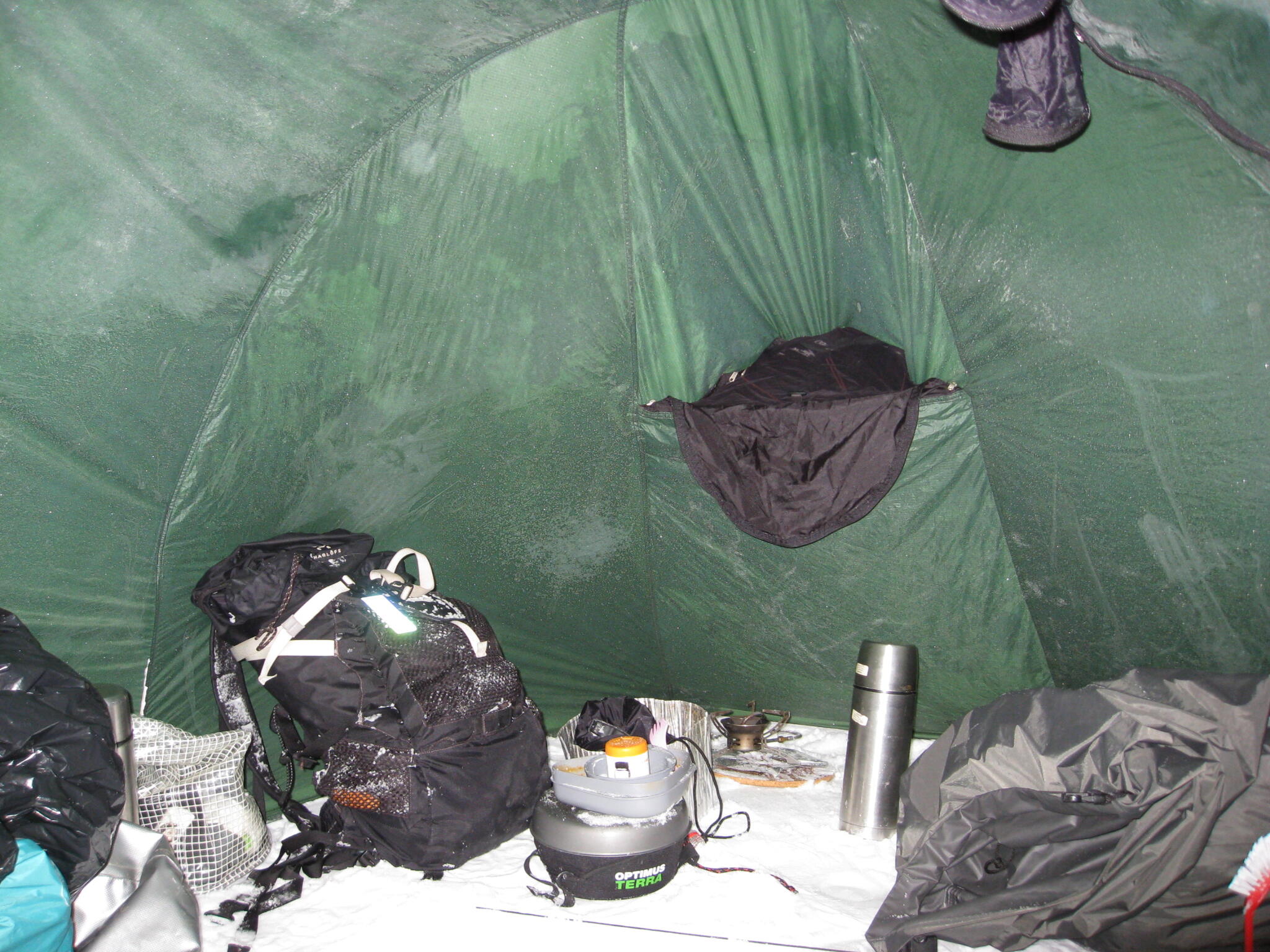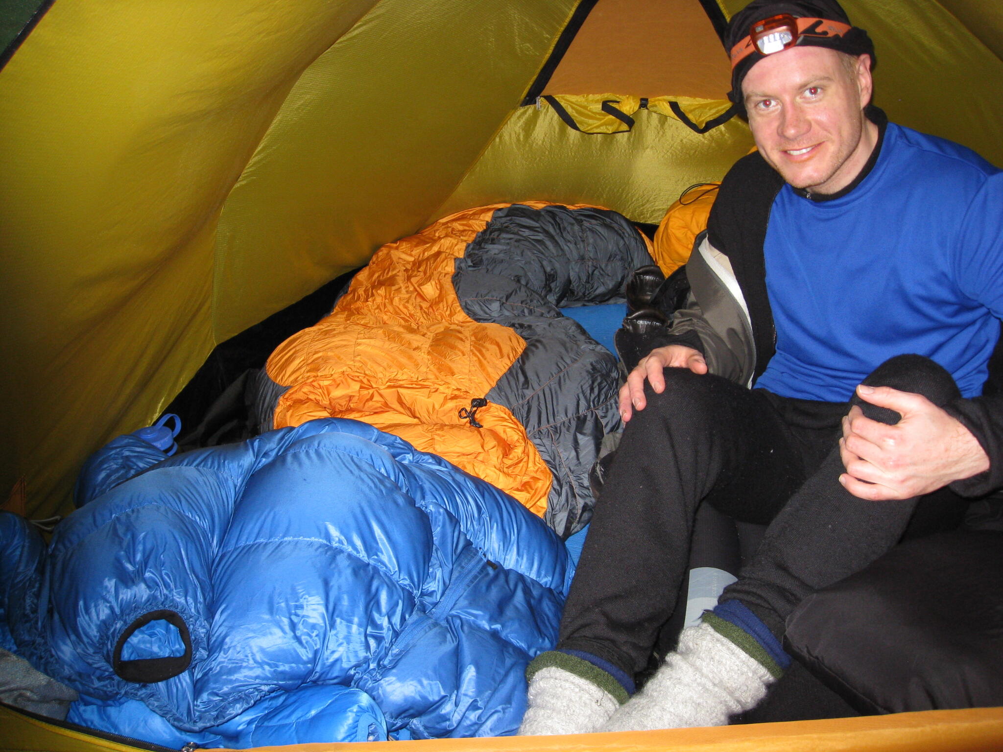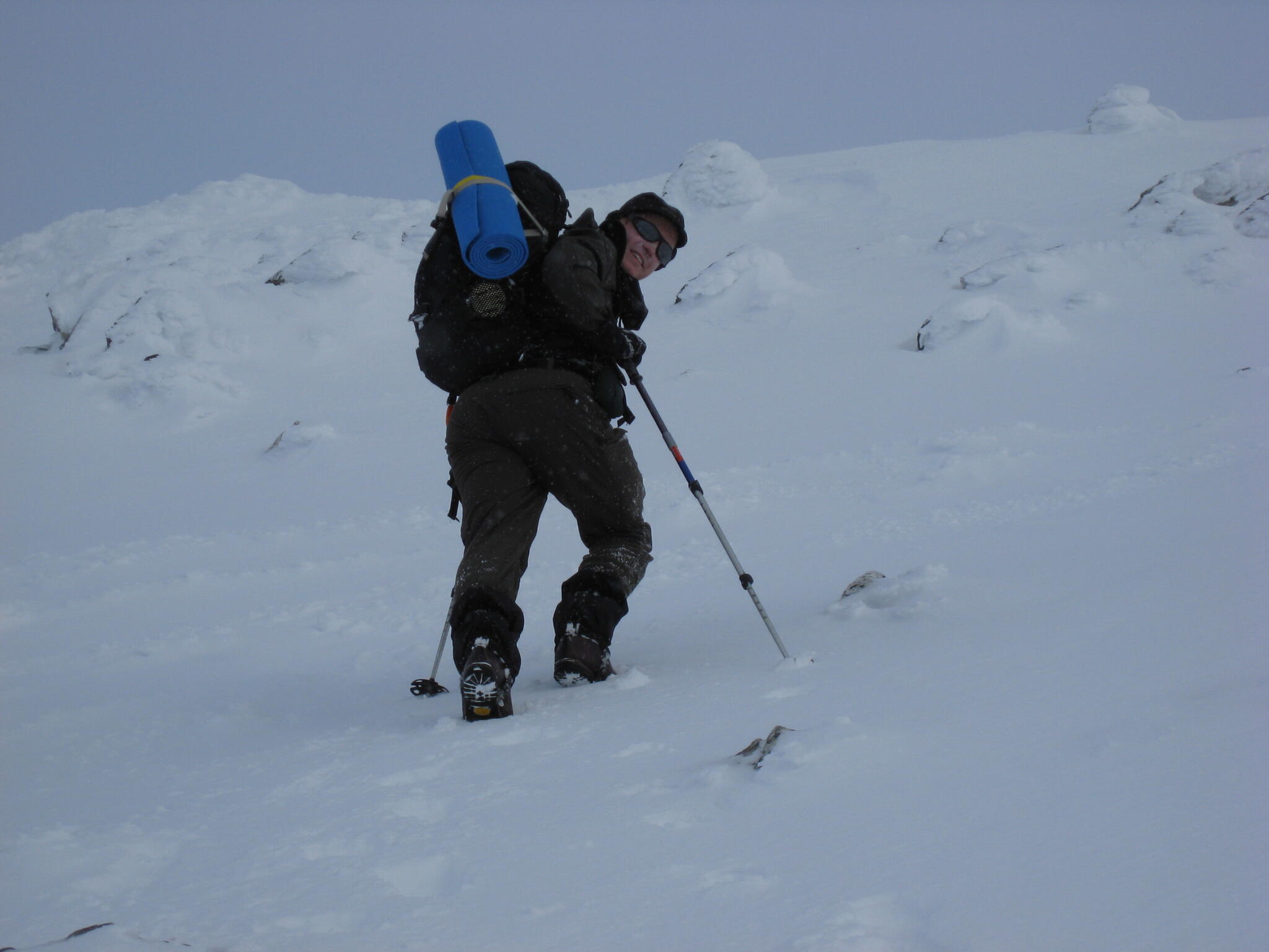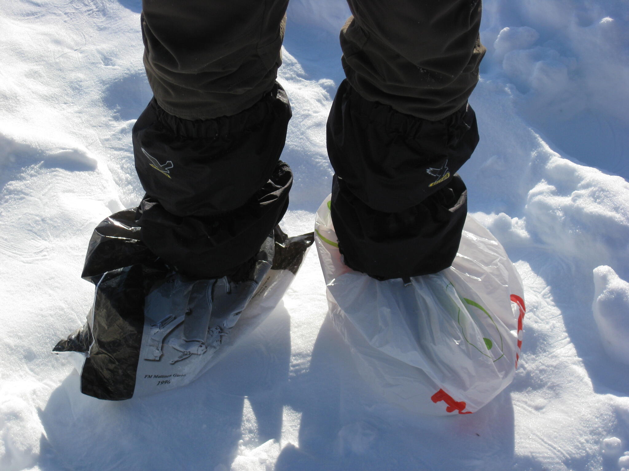 På denna tur hade jag ännu inte köpt några bivackskor. Jag använde duntofflor med plastpåsar utanpå. Väldigt halt blev det. Foto: Michael Heuman