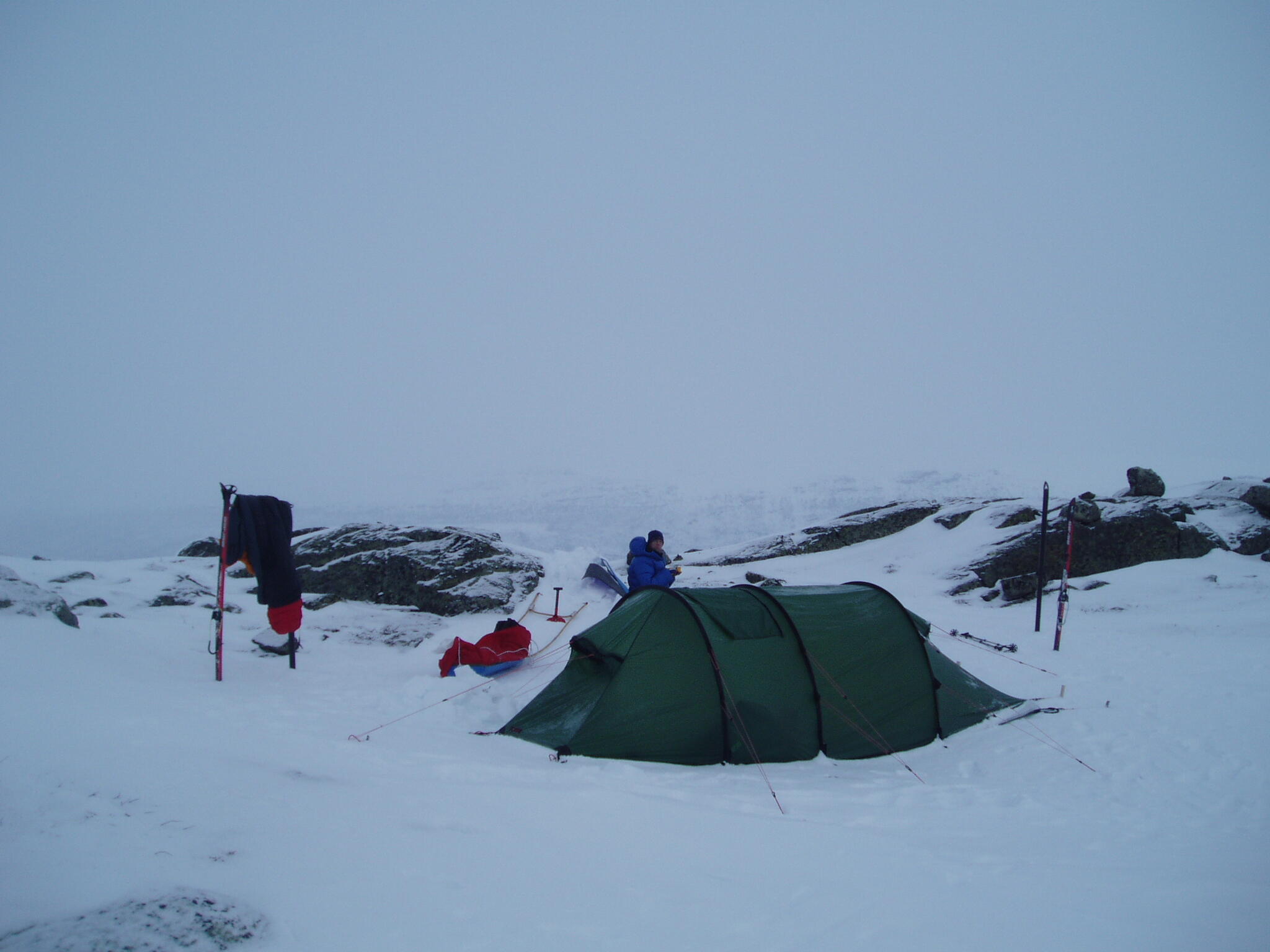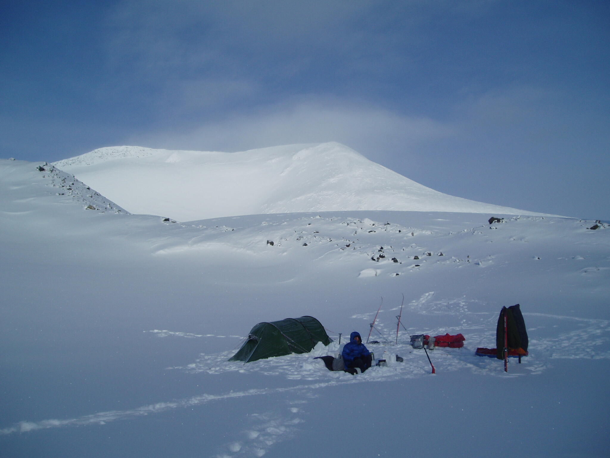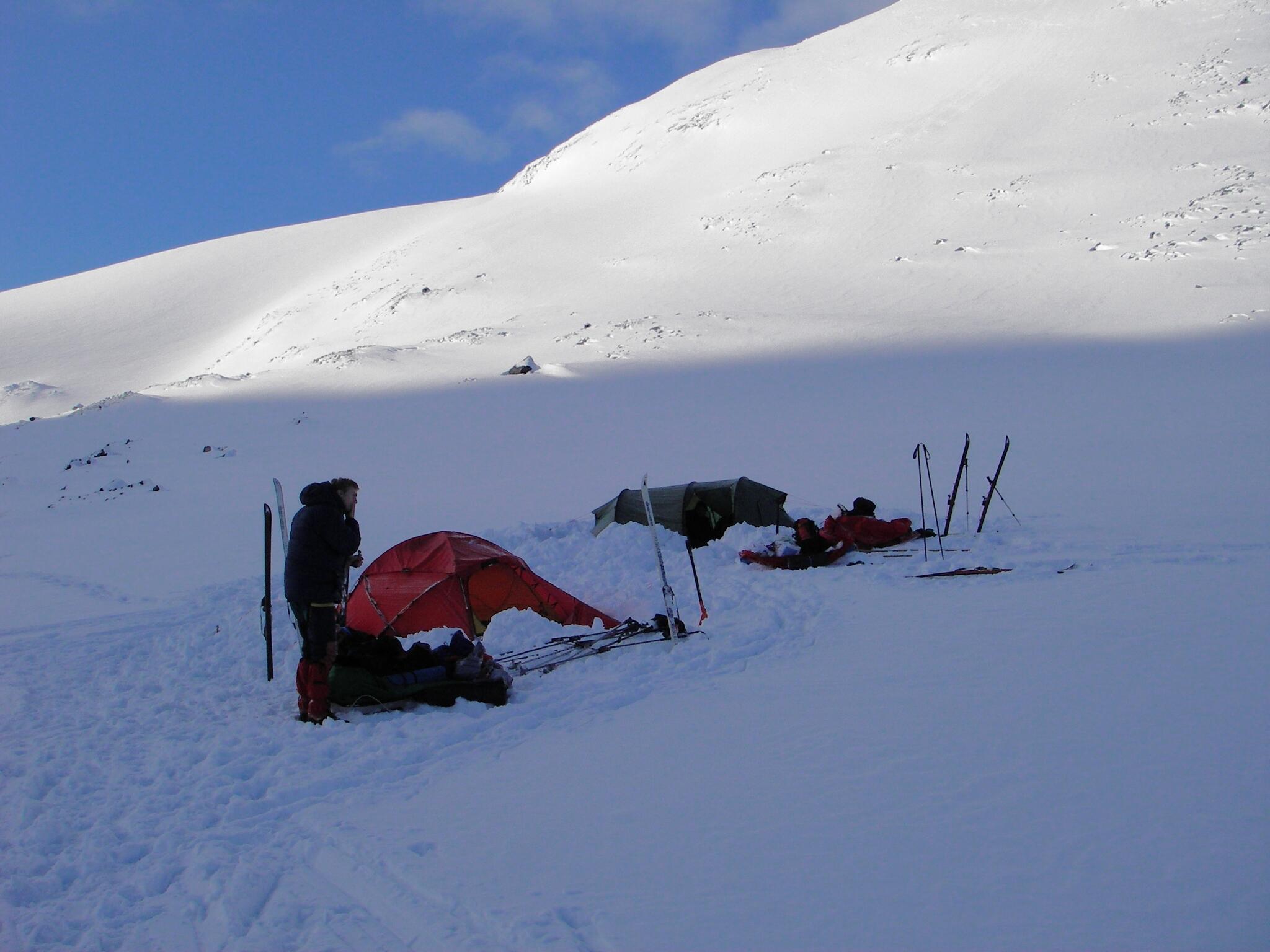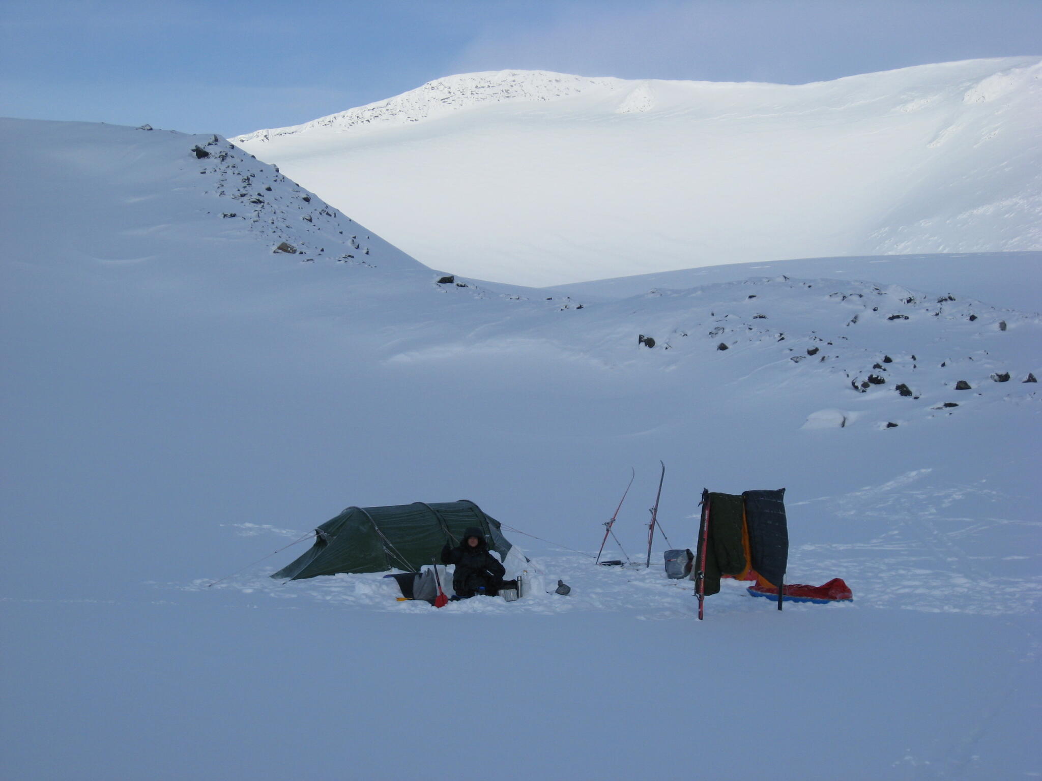 Vi satte upp lägret uppe i passet nedanför Sarektjåkka. Sedan gav i oss av mot toppen.