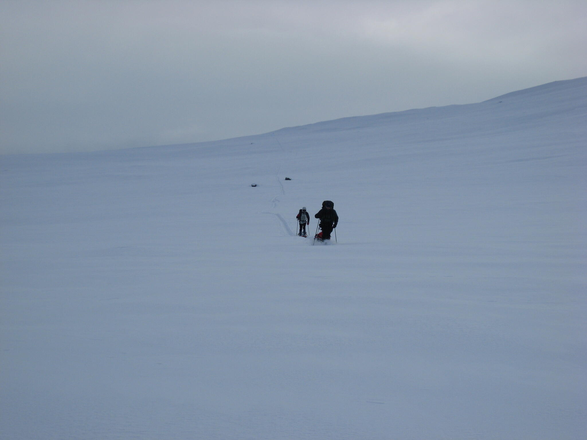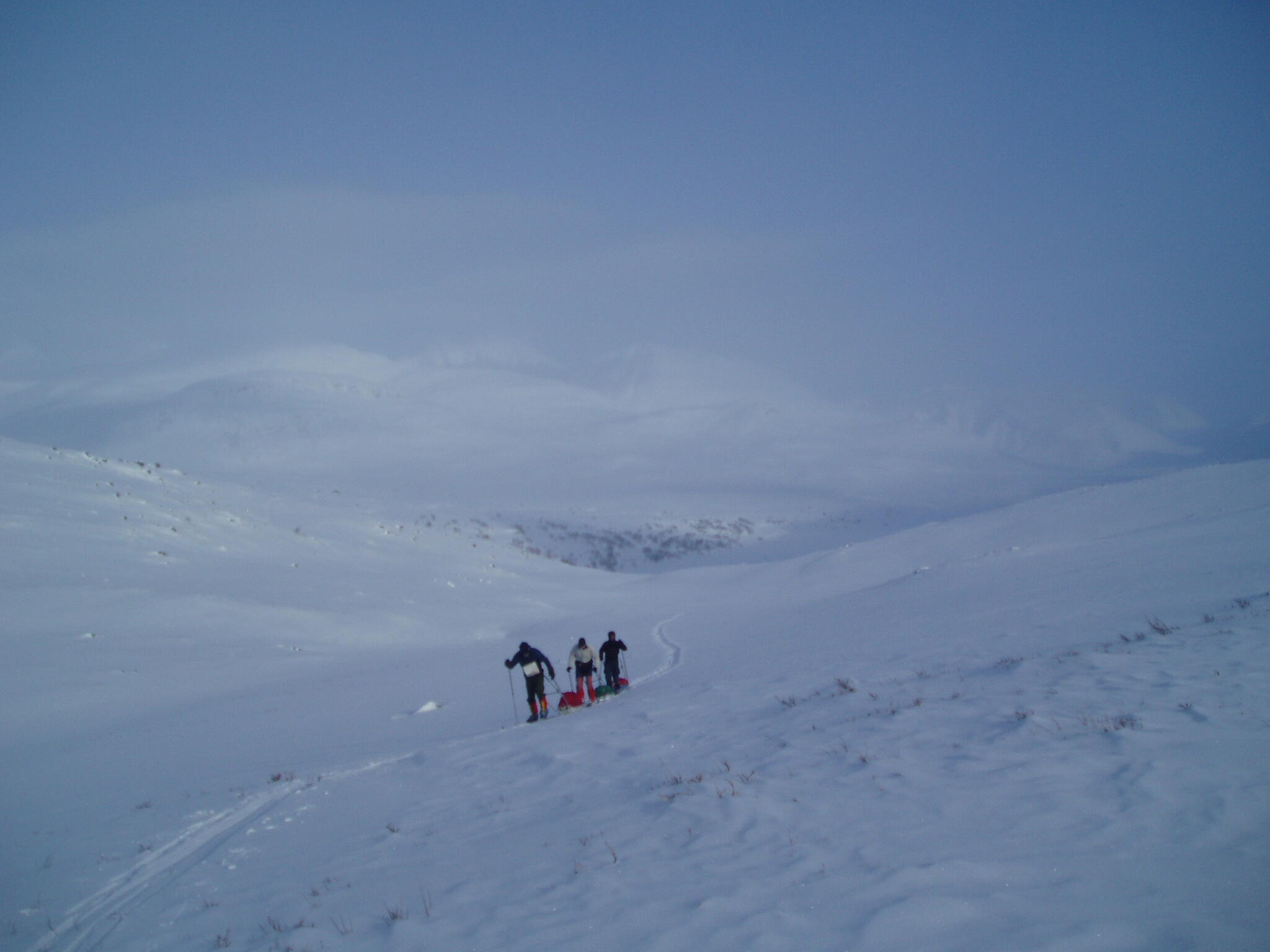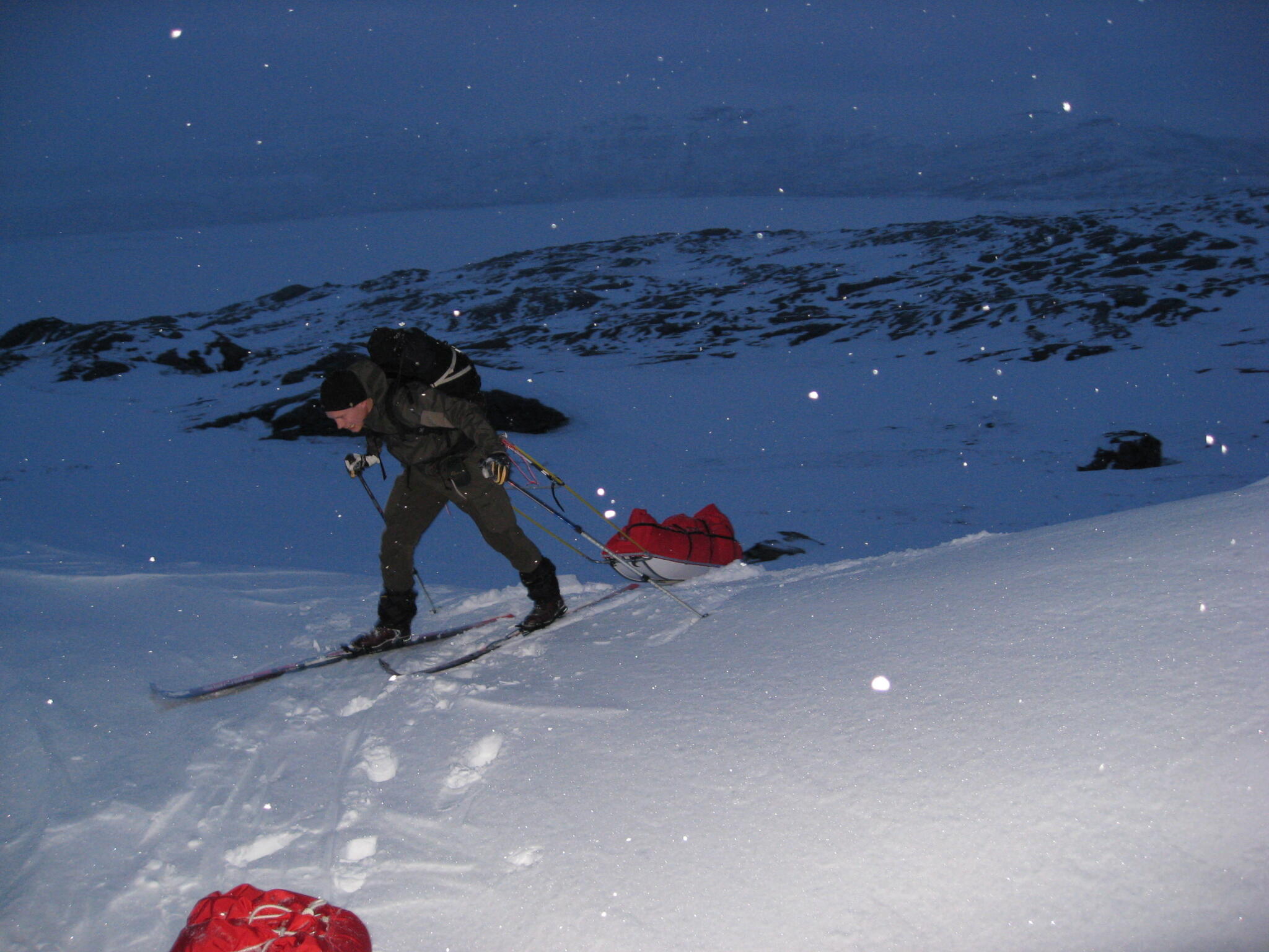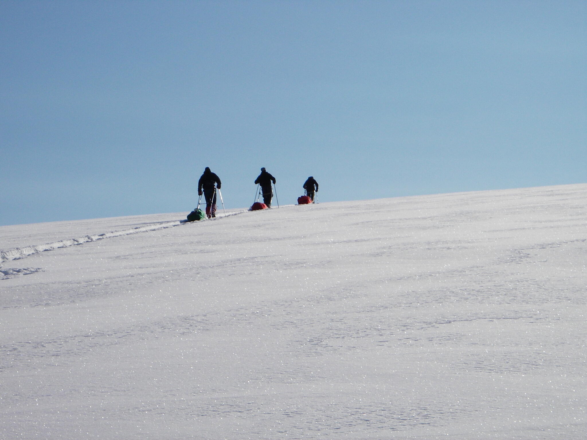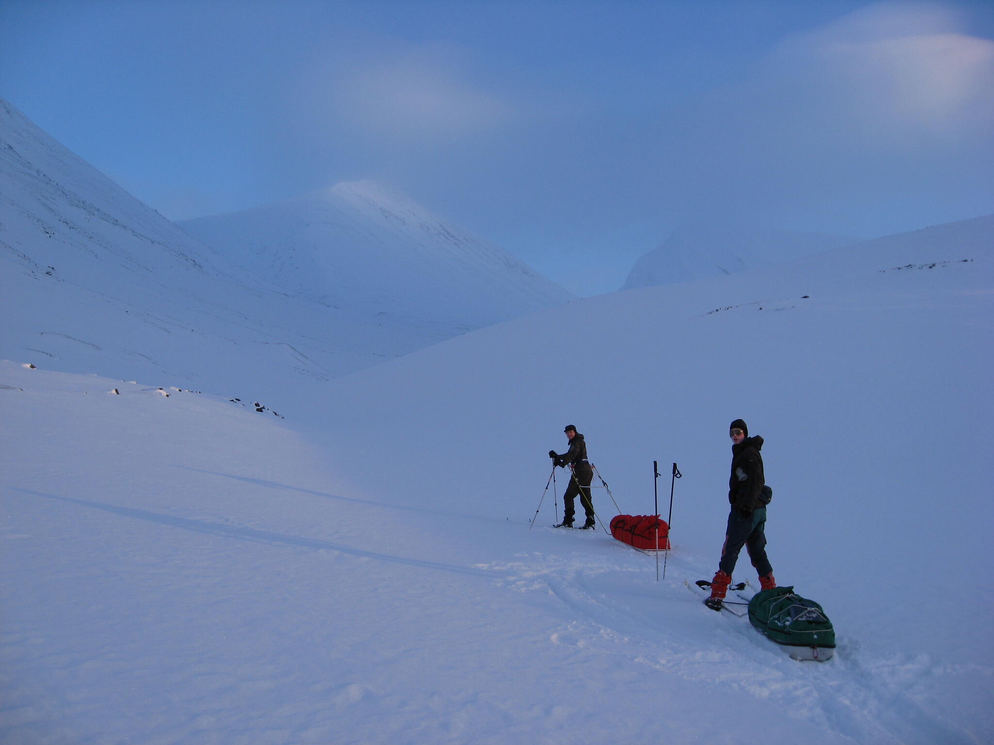 Vi kämpade oss uppför kanalpasset mellan Kanalberget och Axel Hambergs topp. Det var kallt, blåsigt och brant. Väl uppe väntade en annan värld. Här på väg uppför den plana glaciären Jågåsjgaskajiegna, där vi slog läger.