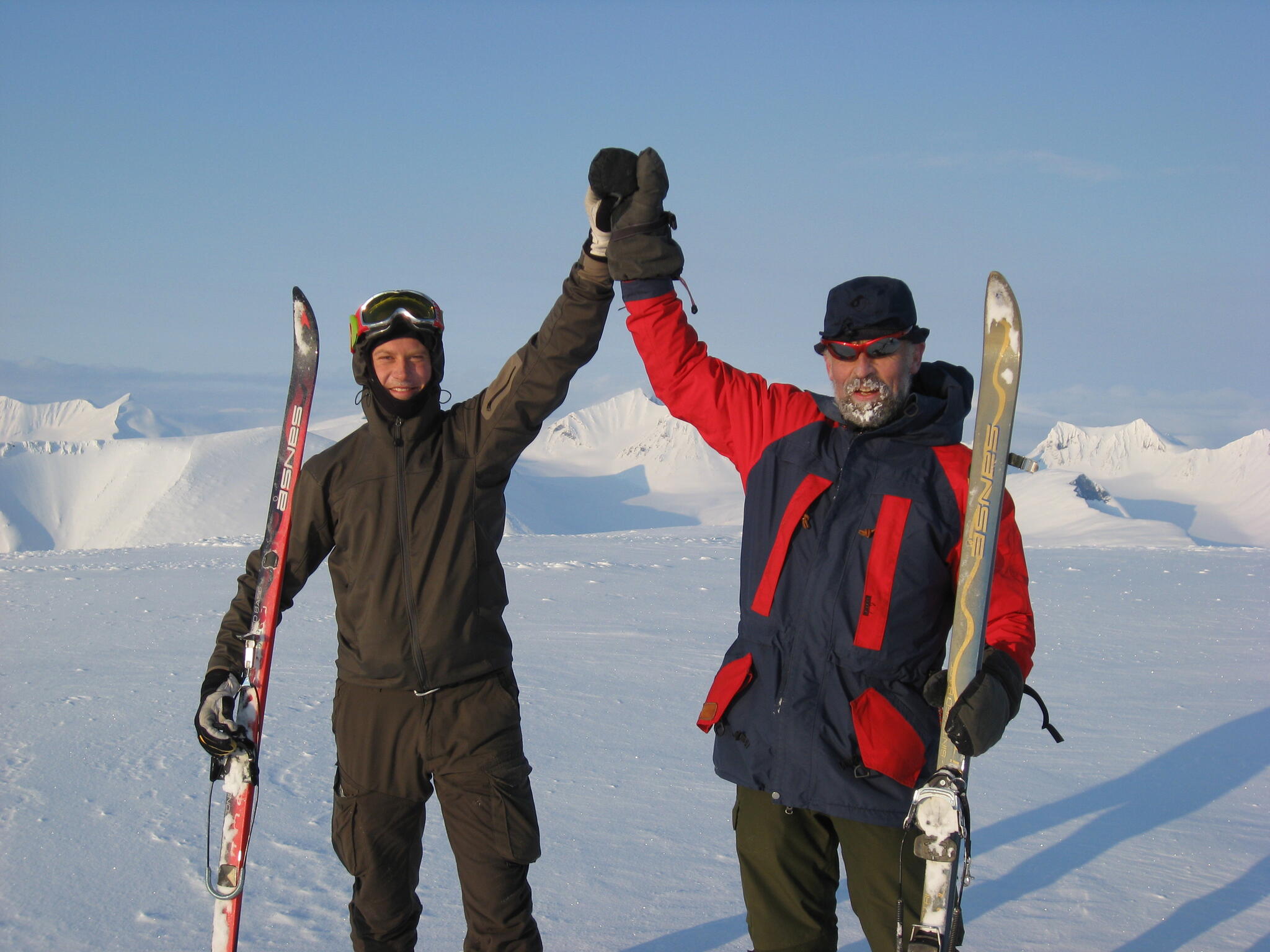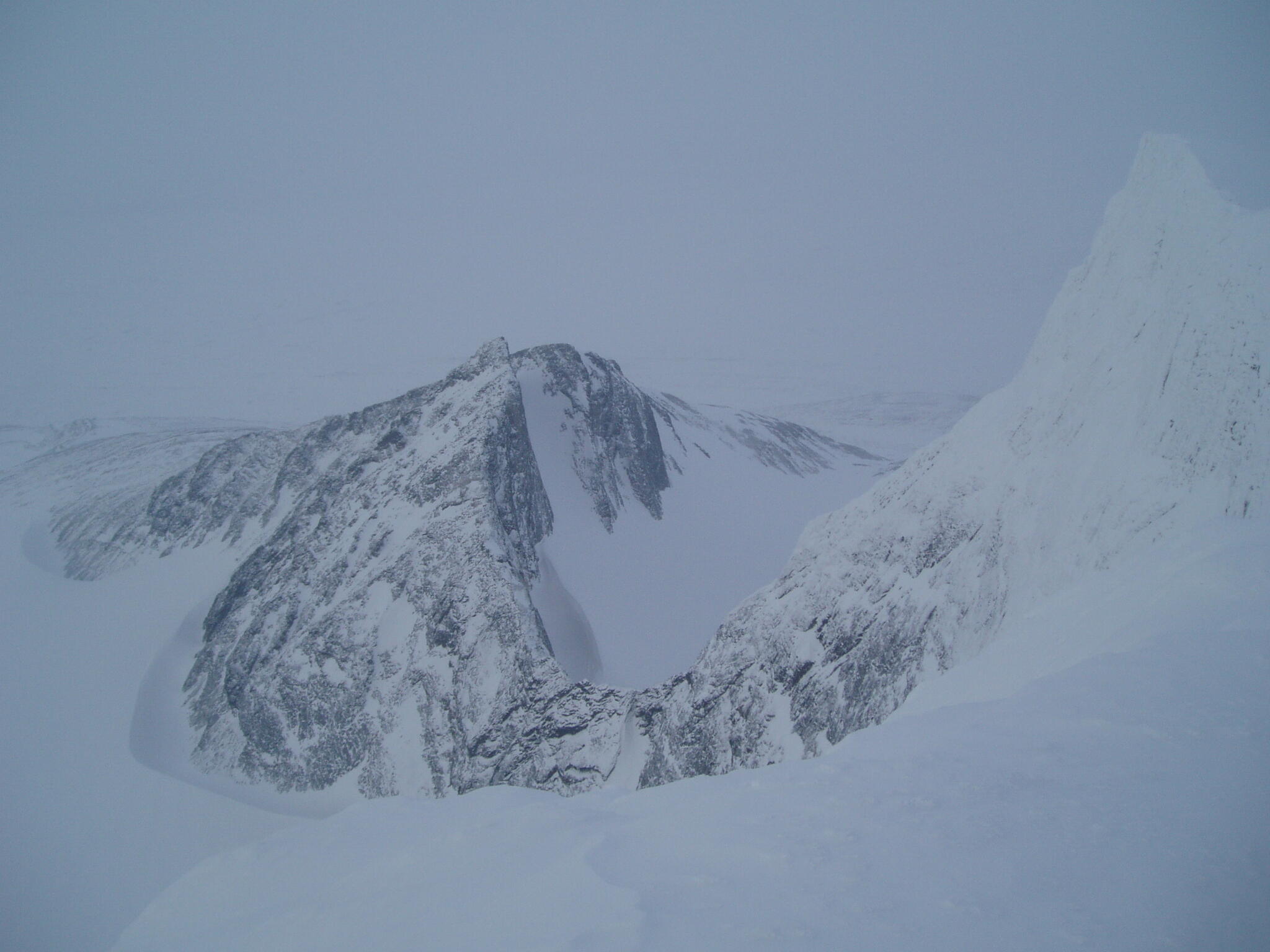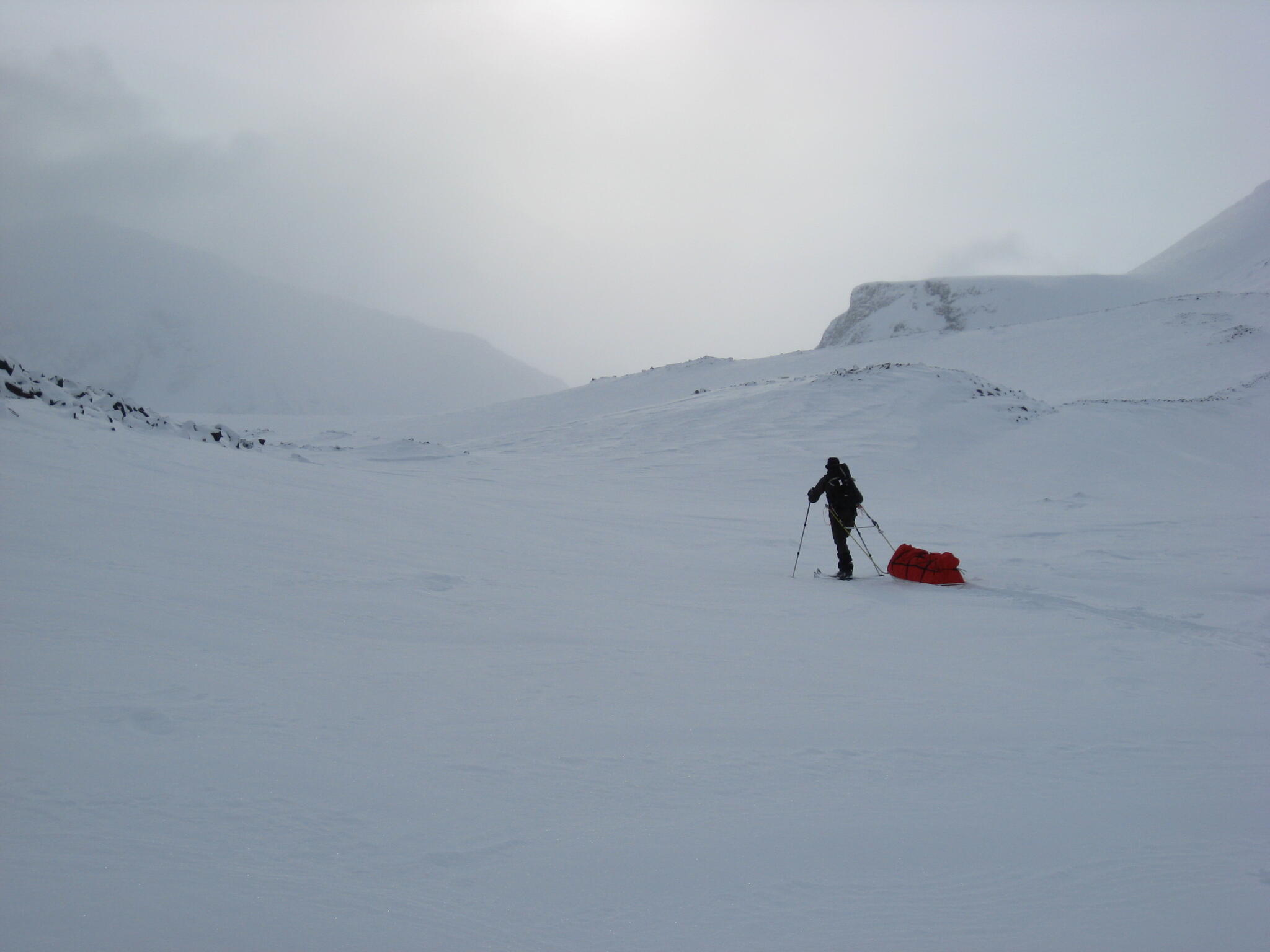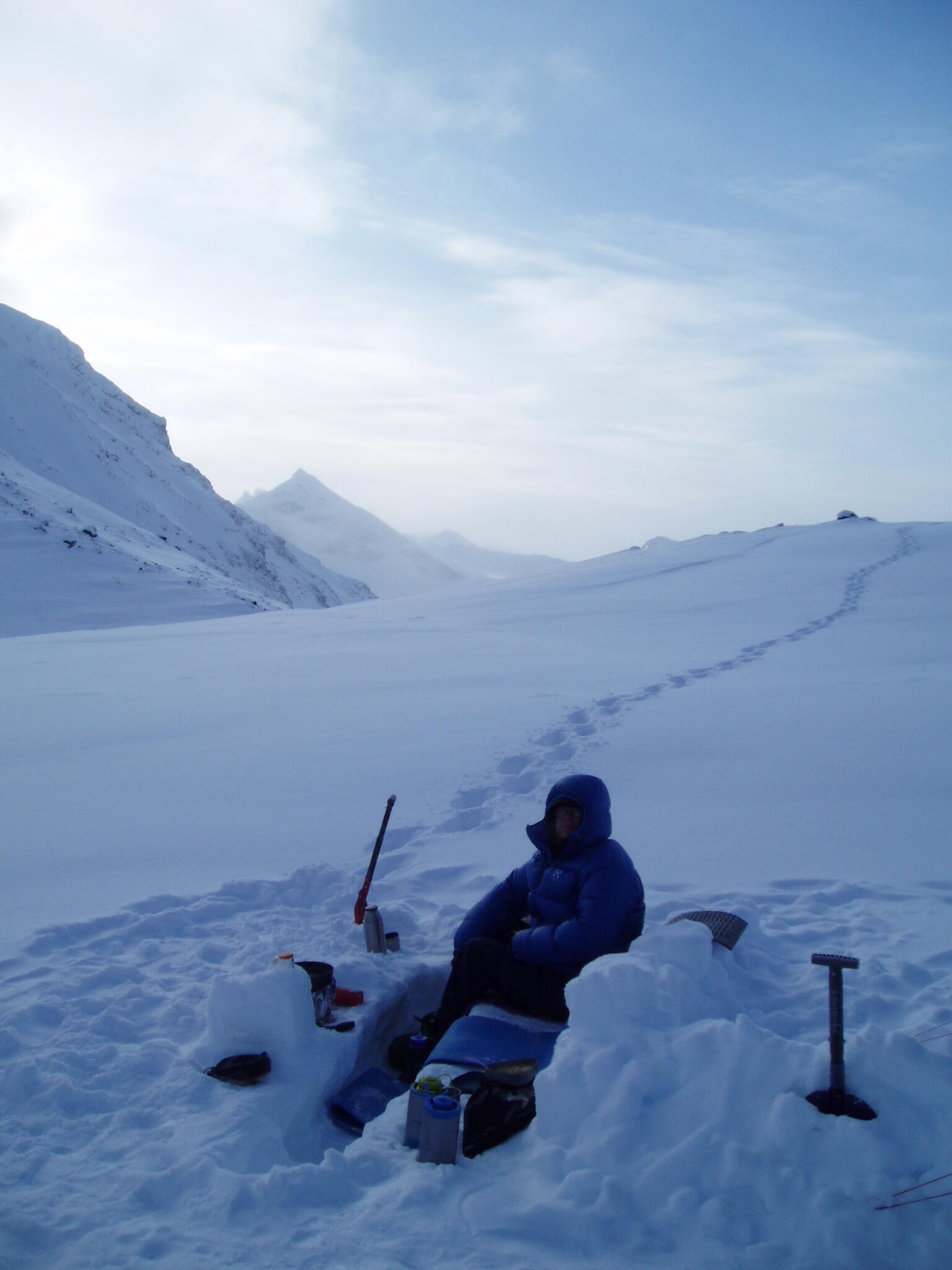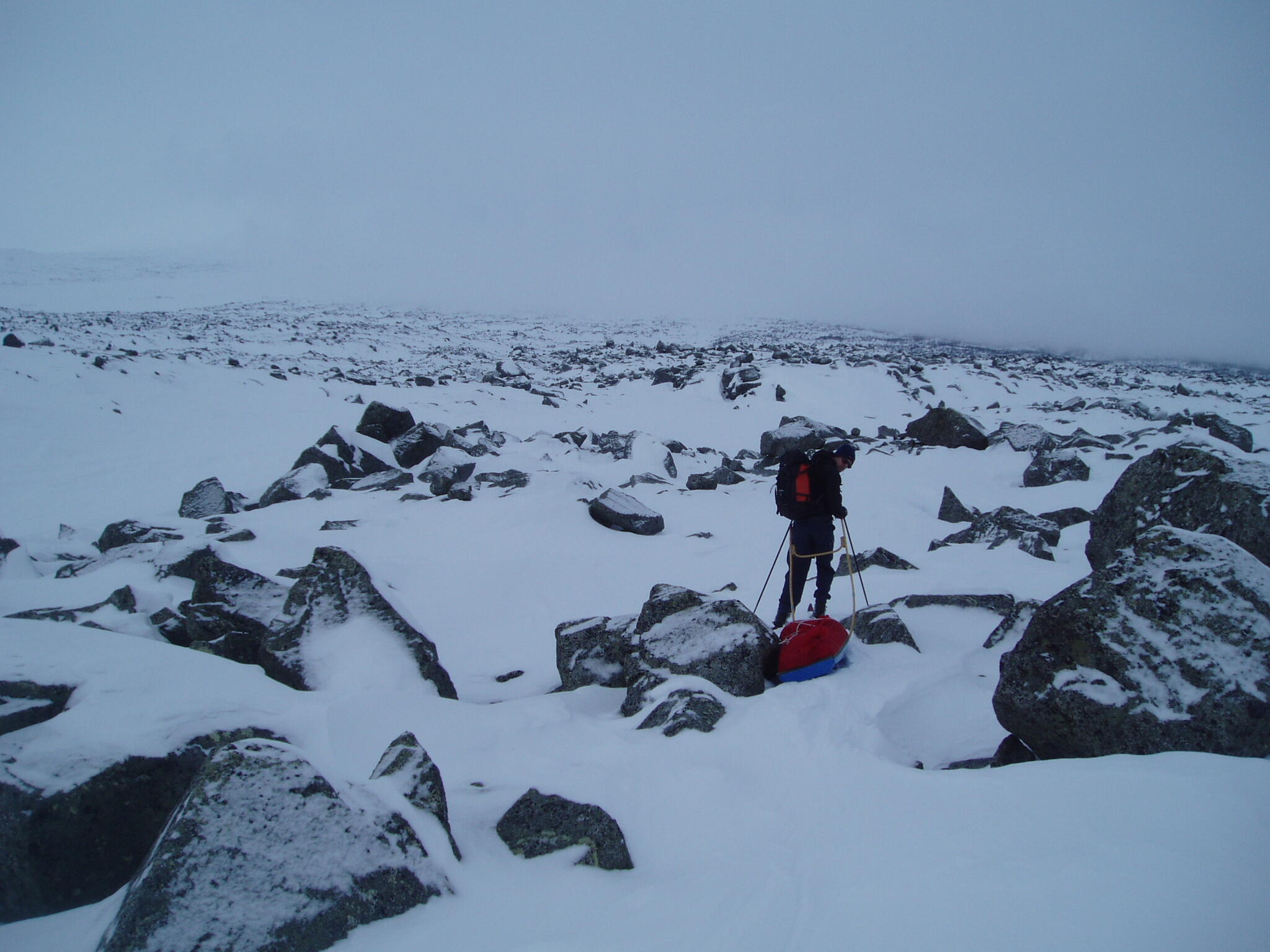 Vi kämpade oss uppför kanalpasset mellan Kanalberget och Axel Hambergs topp. Det var kallt, blåsigt och brant. Väl uppe väntade en annan värld. Här på väg uppför den plana glaciären Jågåsjgaskajiegna, där vi slog läger.