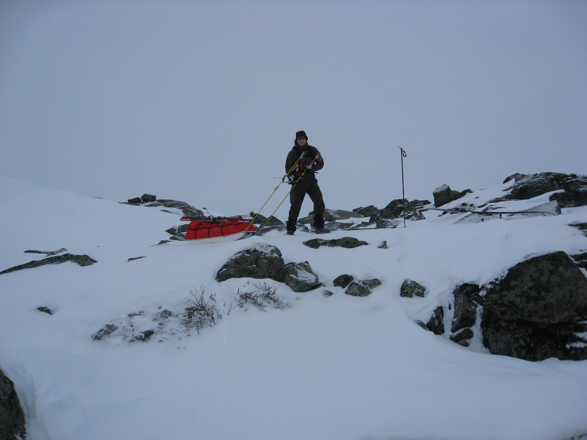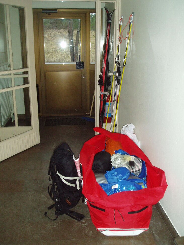 Min packning för skidturen. Till den här turen hade jag gjort klart min pulka. Det var framförallt kapellet som inte var klart tidigare, men även skackeln gjordes klar. Jag hade påbörjat arbetet med pulkan under min utbildning på Malungs folkhögskola 2005/06.