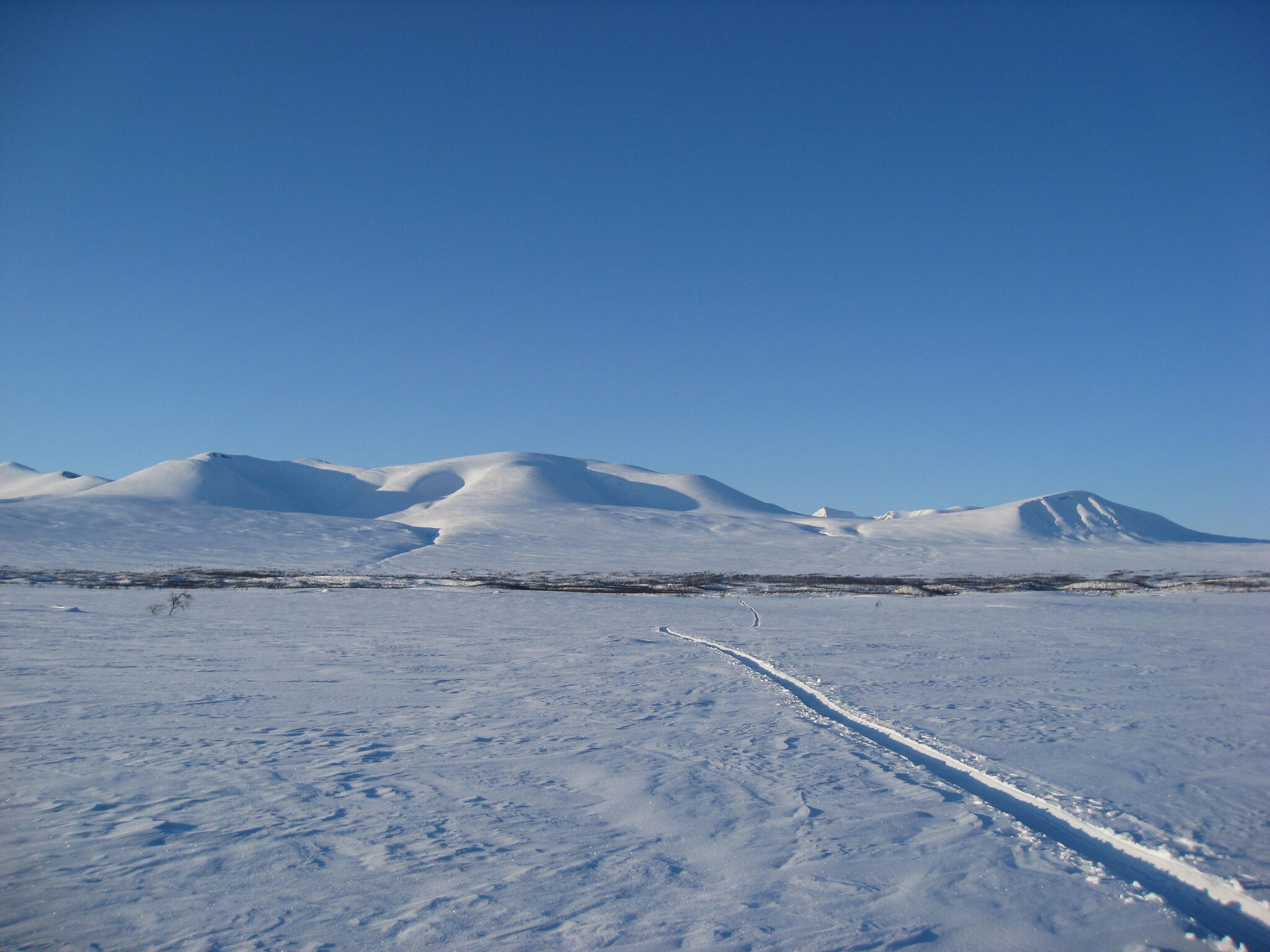Dags att återvända till civilisationen, via skoterspår. Här hade vi som kallast på natten: -38,5 grader när vi tittade på termometern tidigt på morgonen!