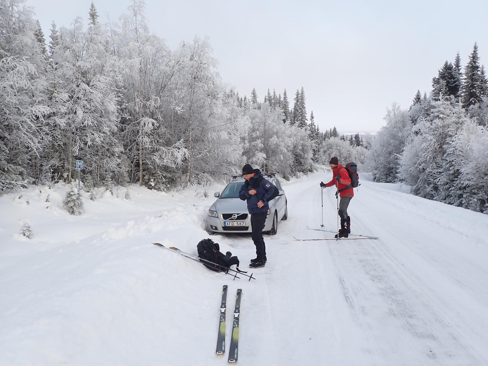 Vi parkerade på vägen väster om Kallsjön där den är som högst. Skottade upp en parkeringsficka så vi inte skulle hindra trafiken på vägen.
