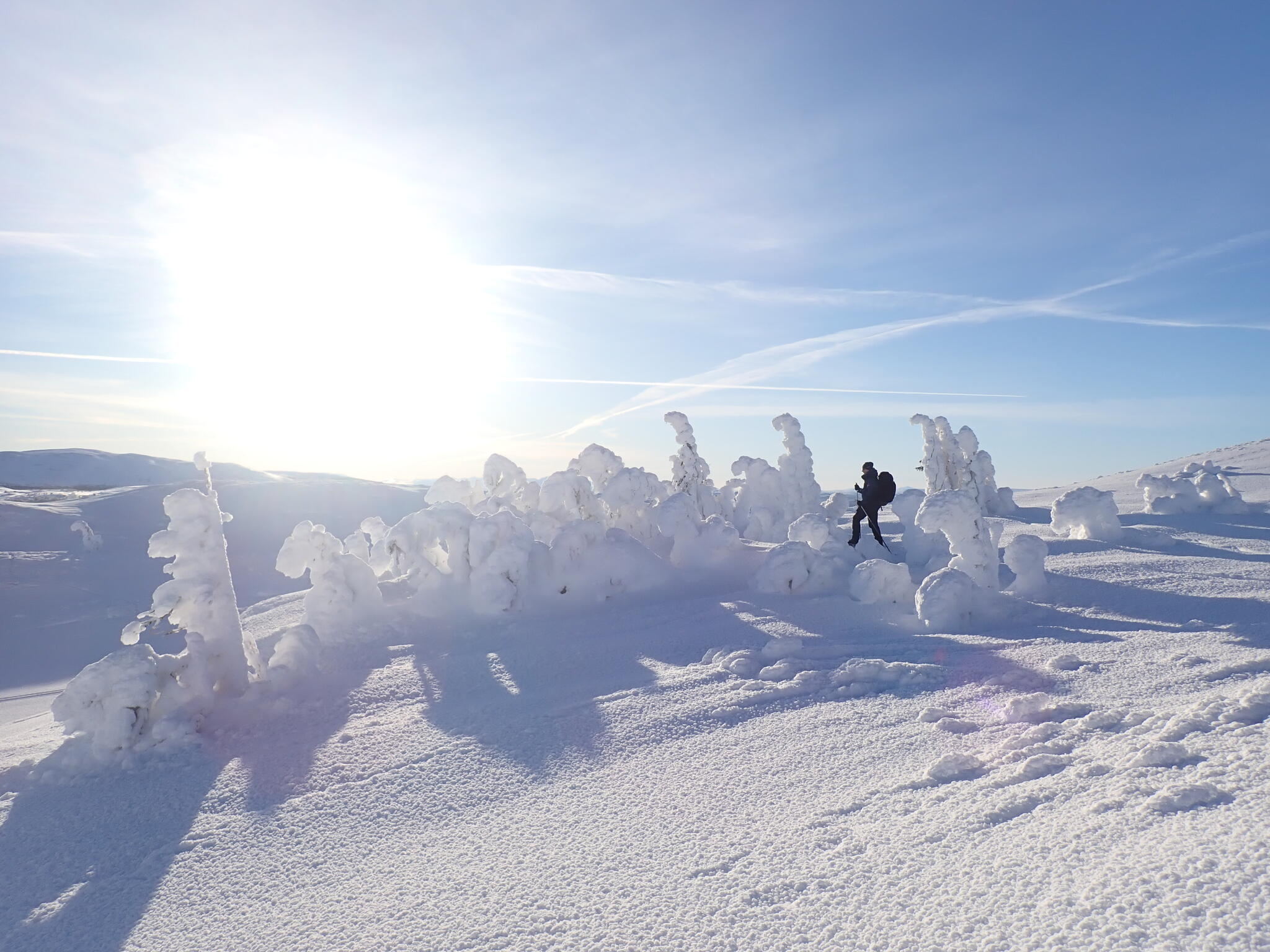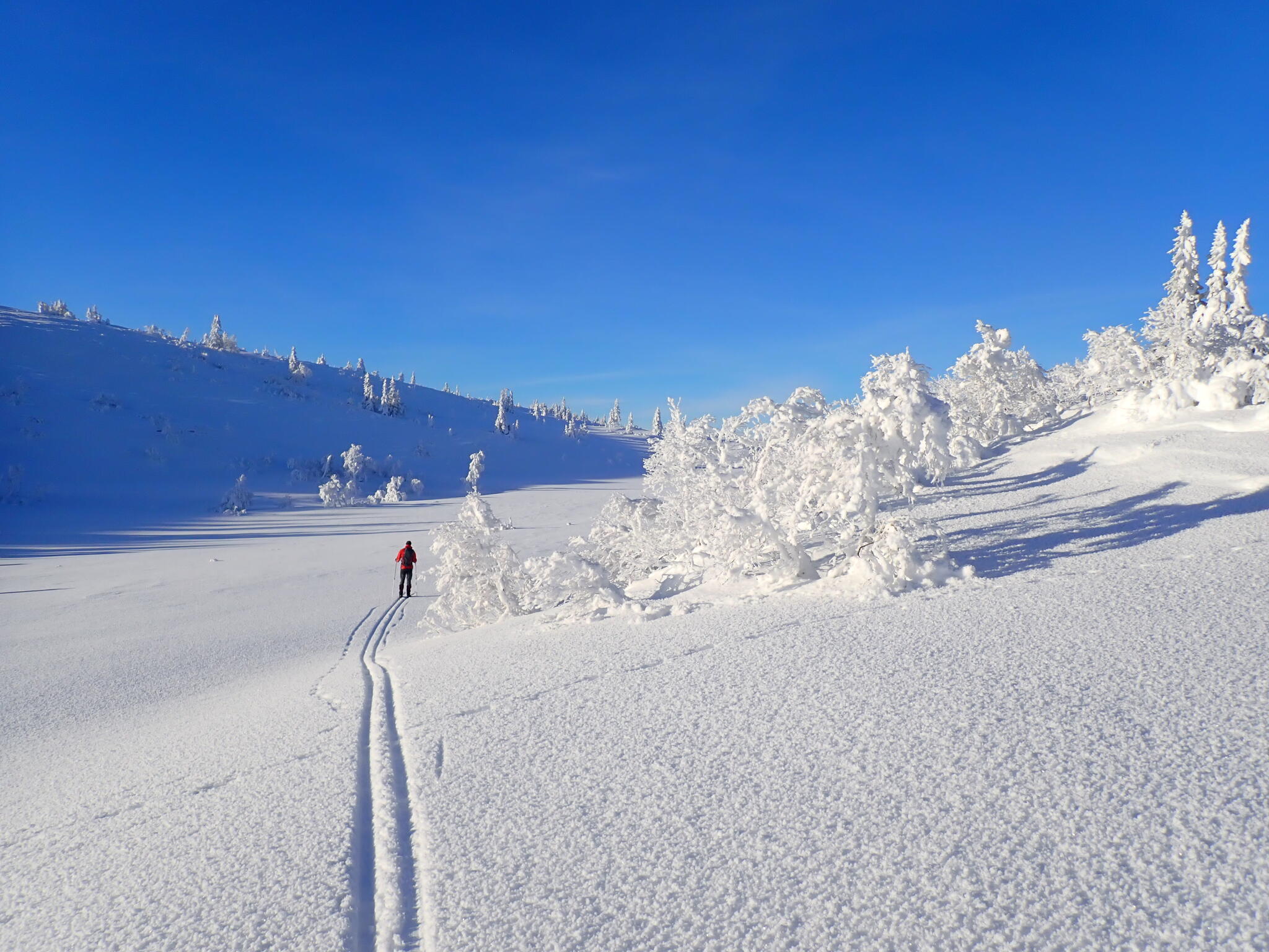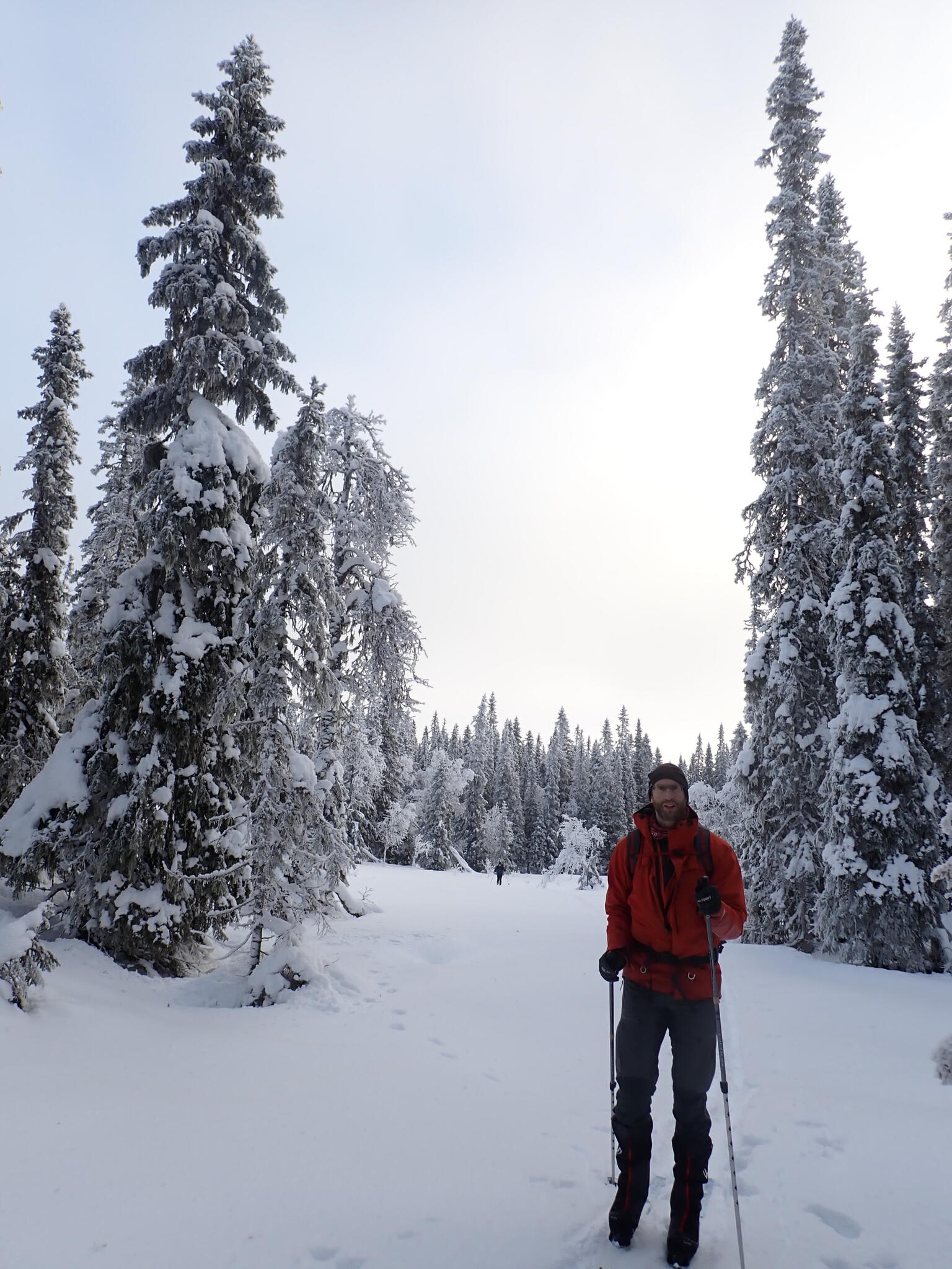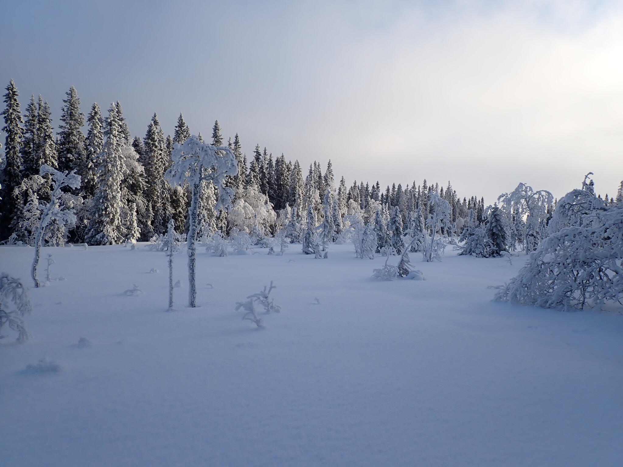 När vi kom upp på kalfjällsmyrarna slogs jag av hur otroligt vackert det var. Sol, massa snö på träden, upplegor och vindstilla. Skidföret var också perfekt. Det fanns inget att klaga på.