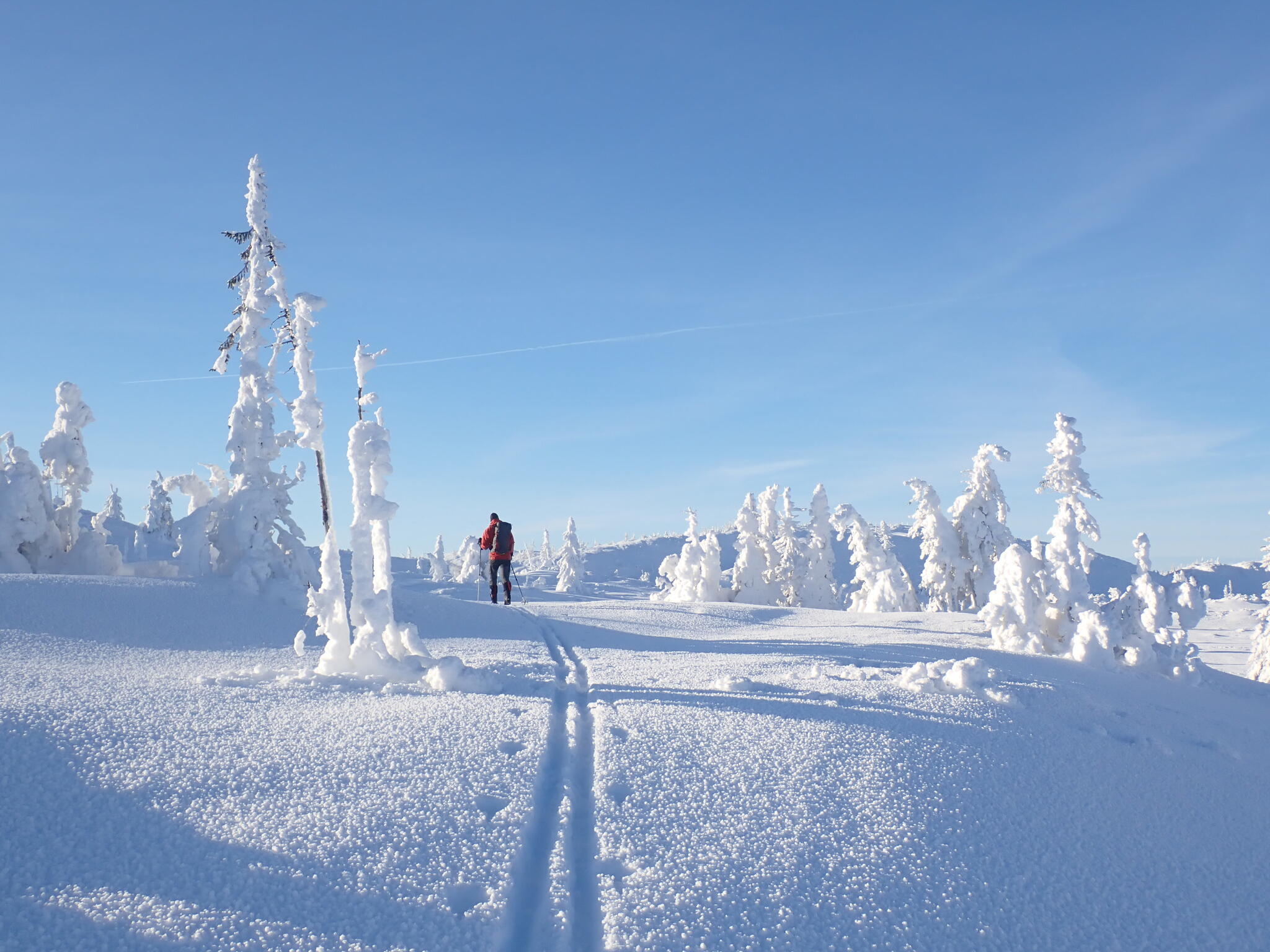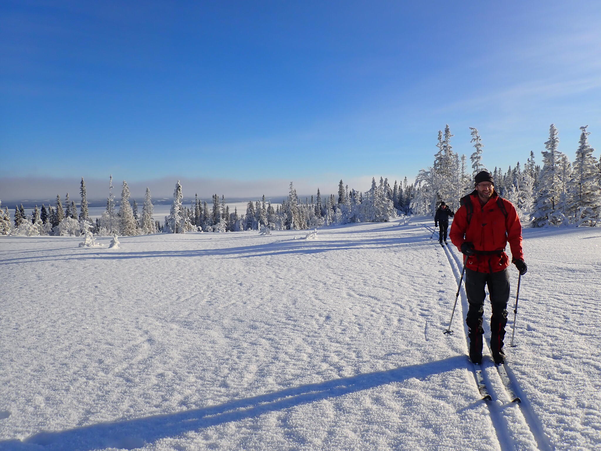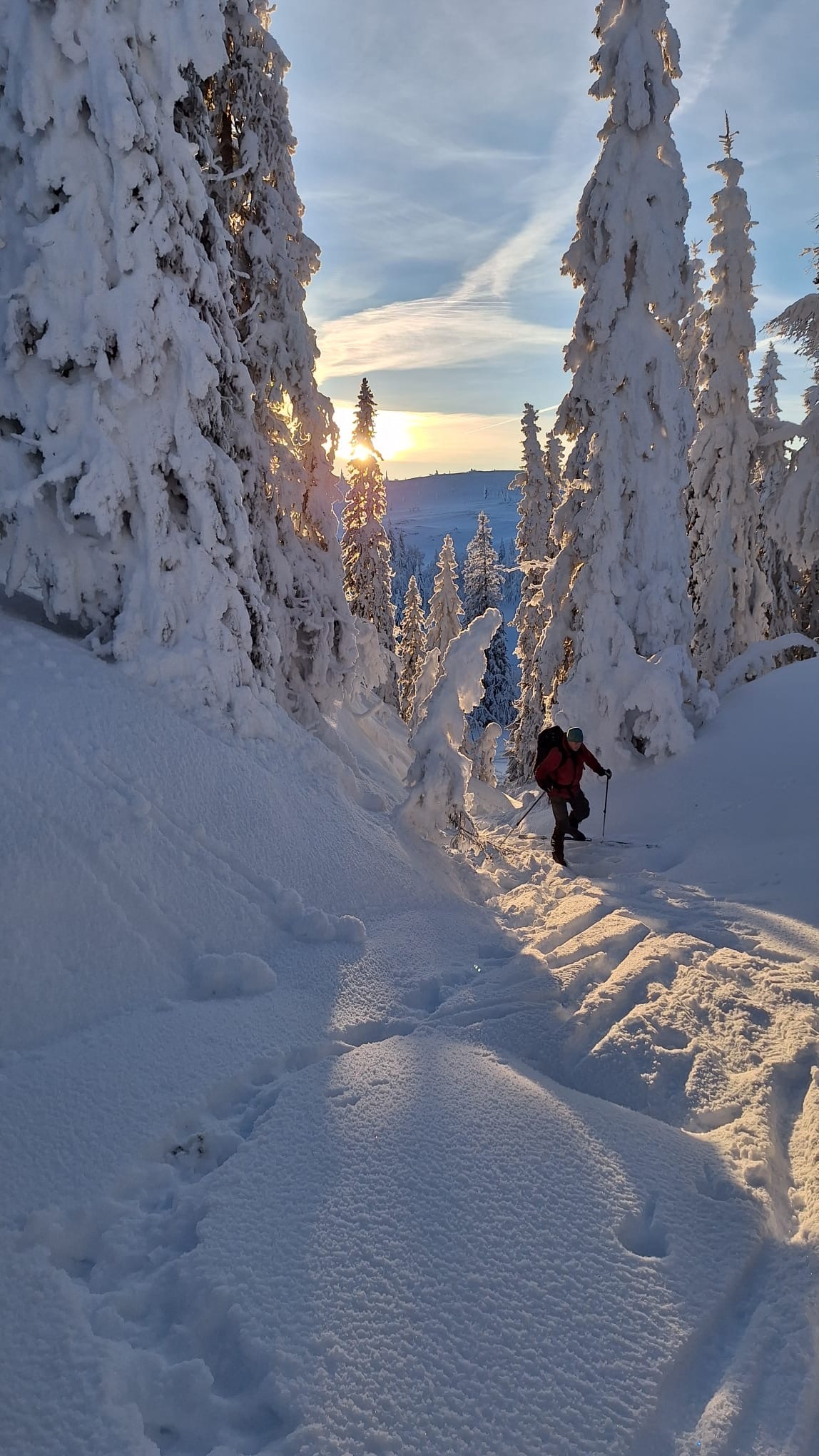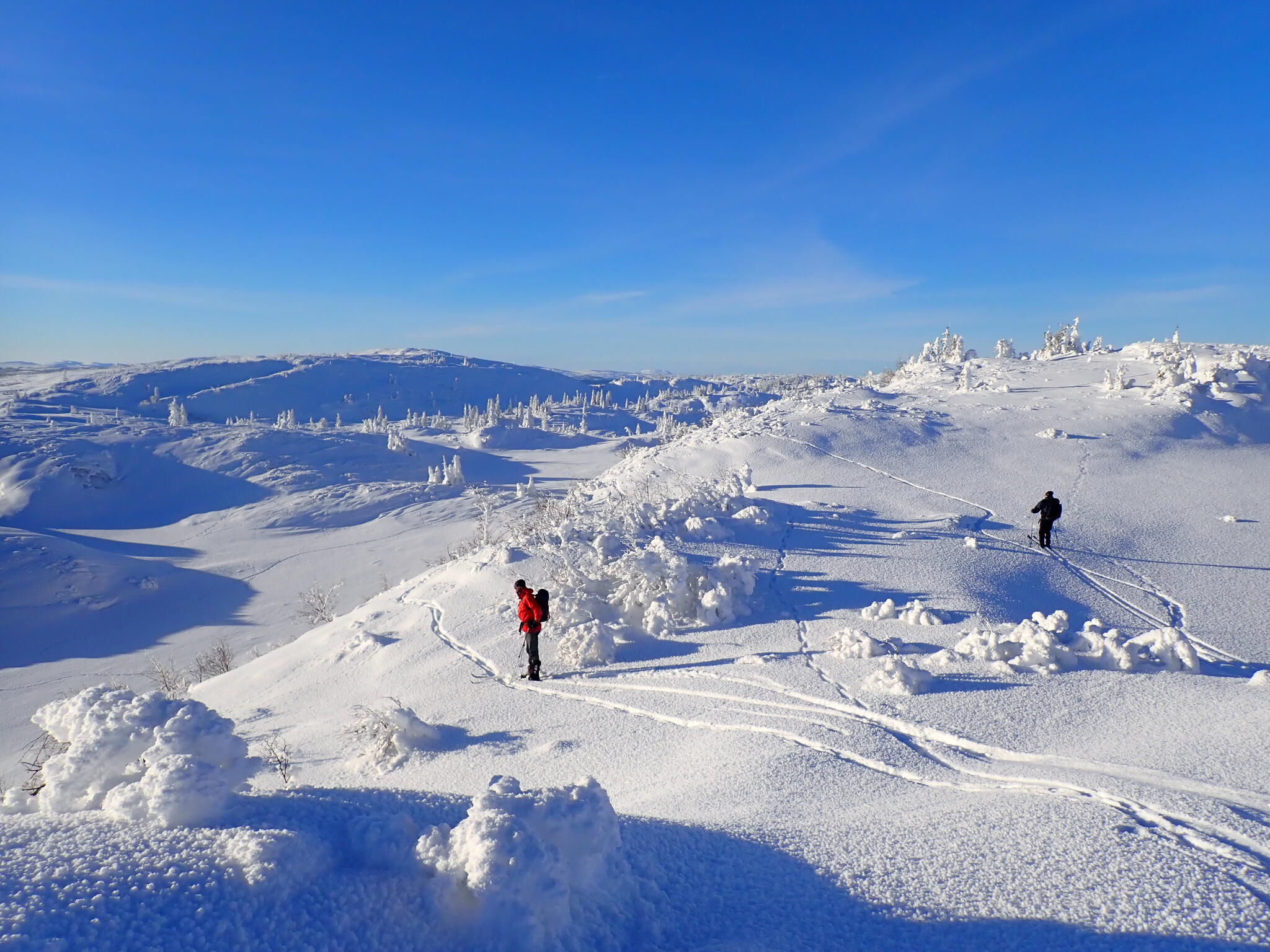 När vi kom upp på kalfjällsmyrarna slogs jag av hur otroligt vackert det var. Sol, massa snö på träden, upplegor och vindstilla. Skidföret var också perfekt. Det fanns inget att klaga på.