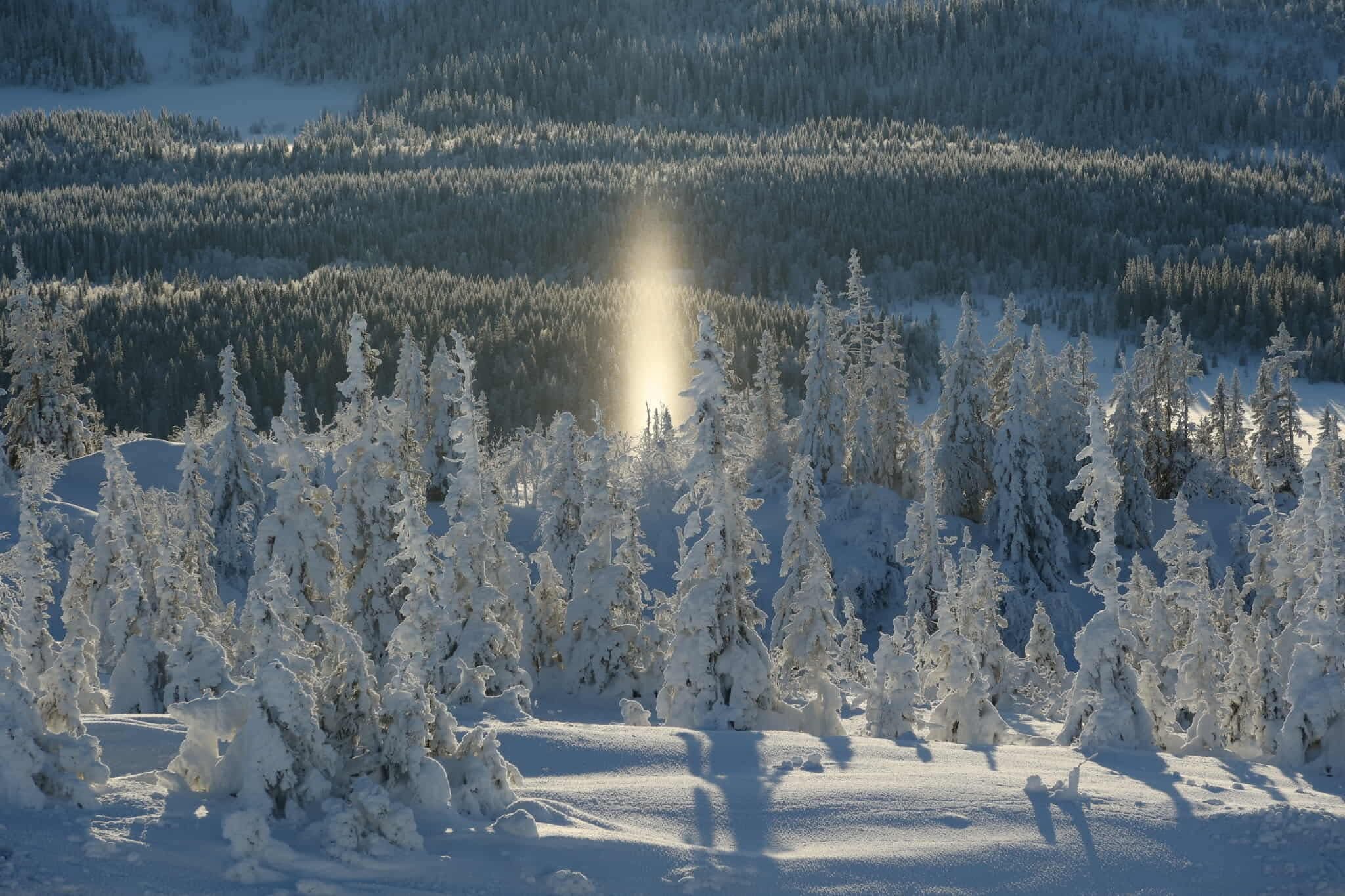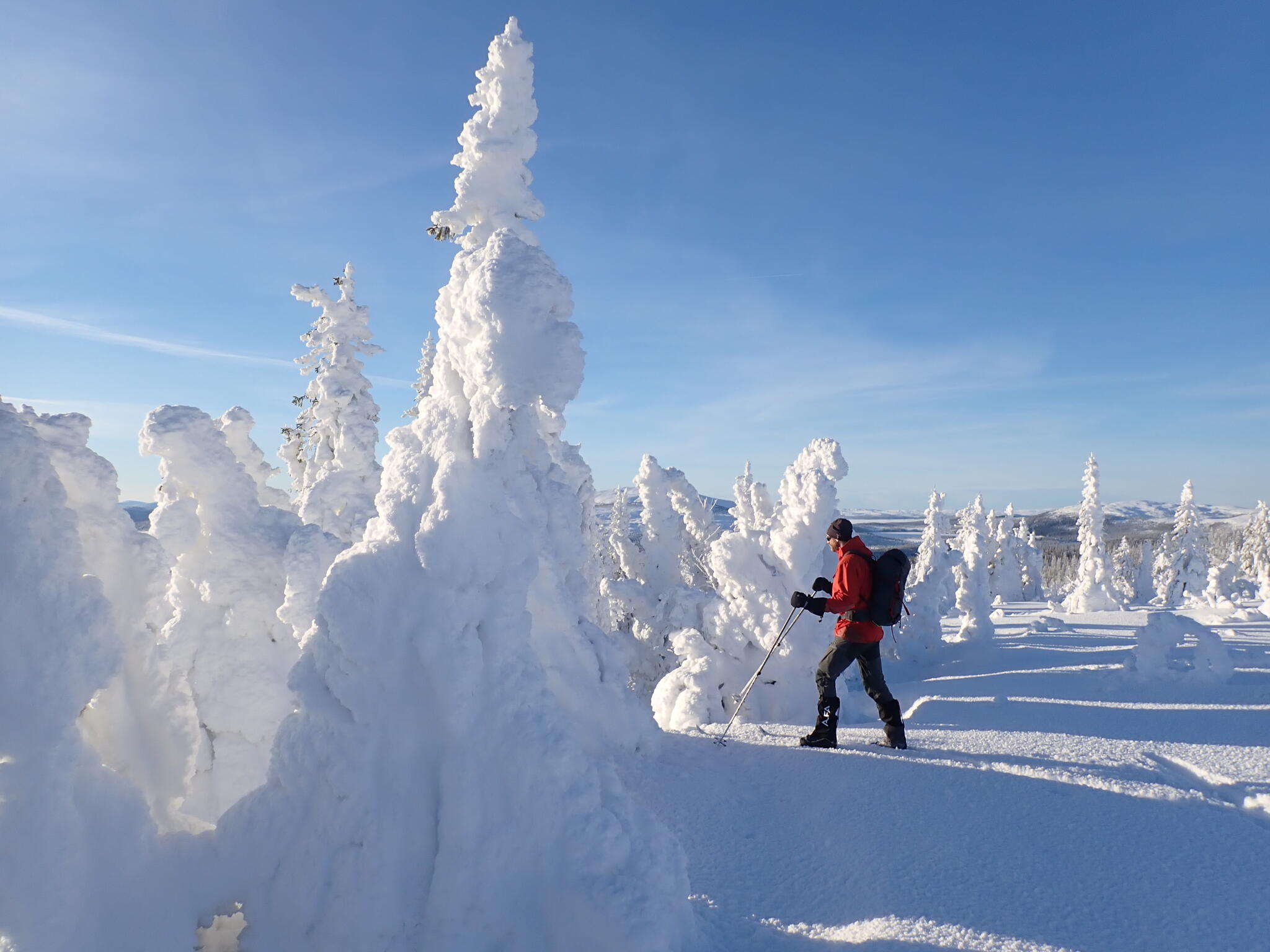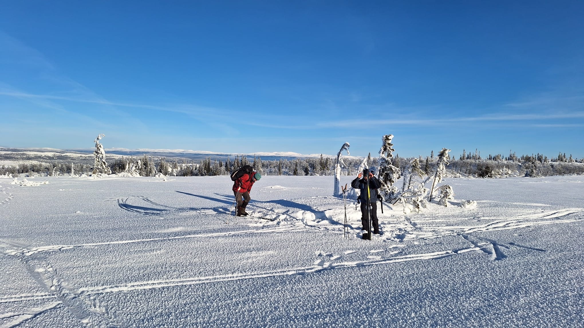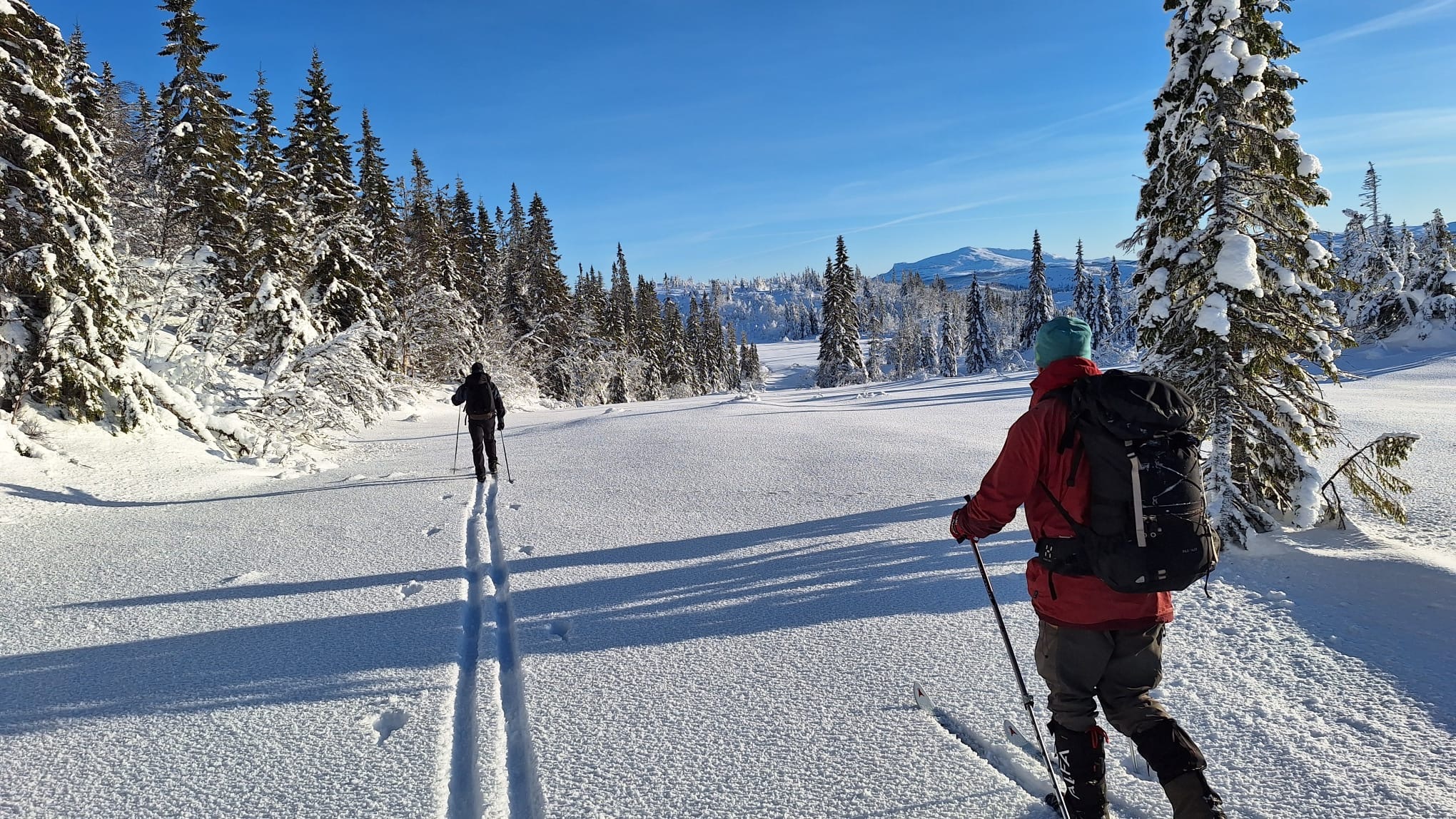 När vi kom upp på kalfjällsmyrarna slogs jag av hur otroligt vackert det var. Sol, massa snö på träden, upplegor och vindstilla. Skidföret var också perfekt. Det fanns inget att klaga på.