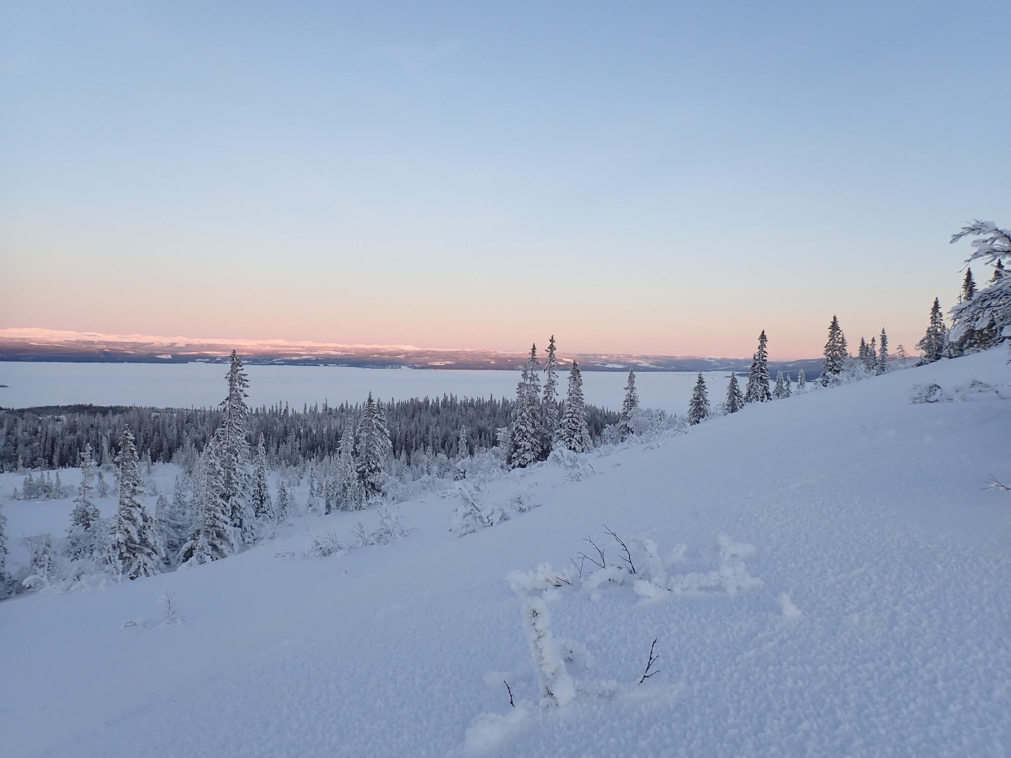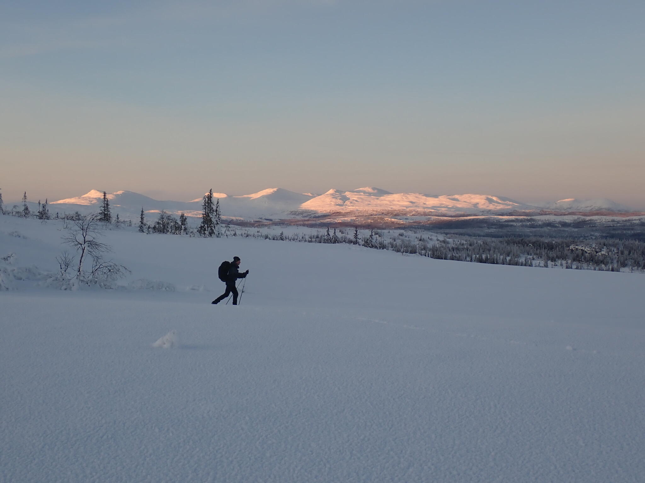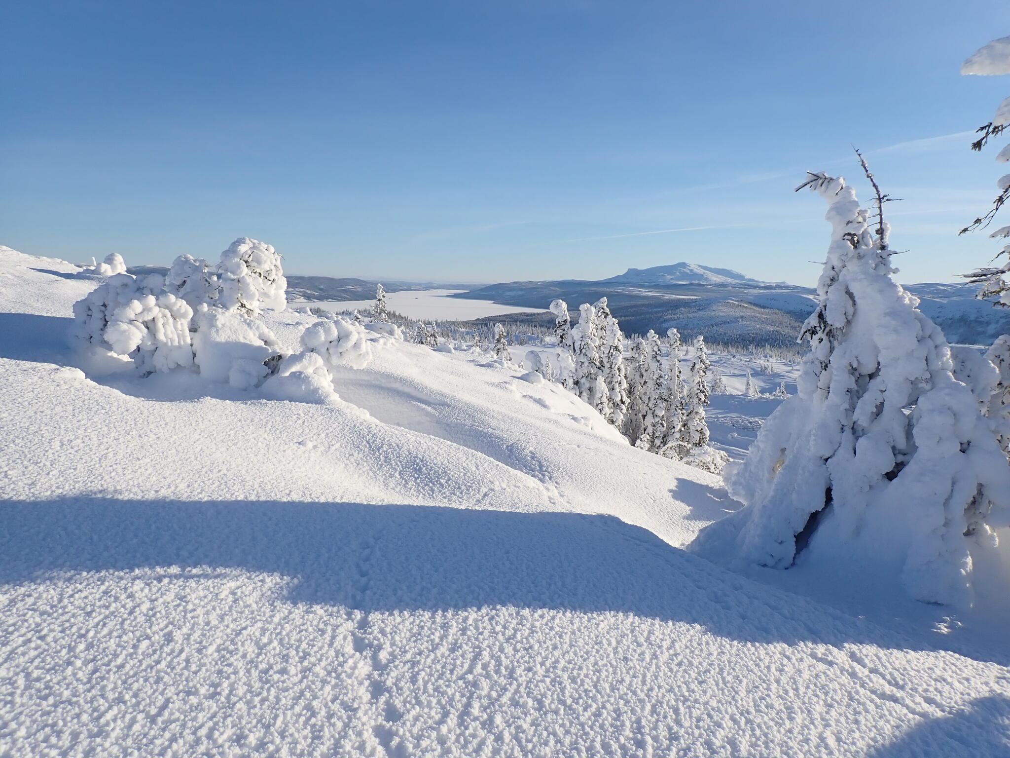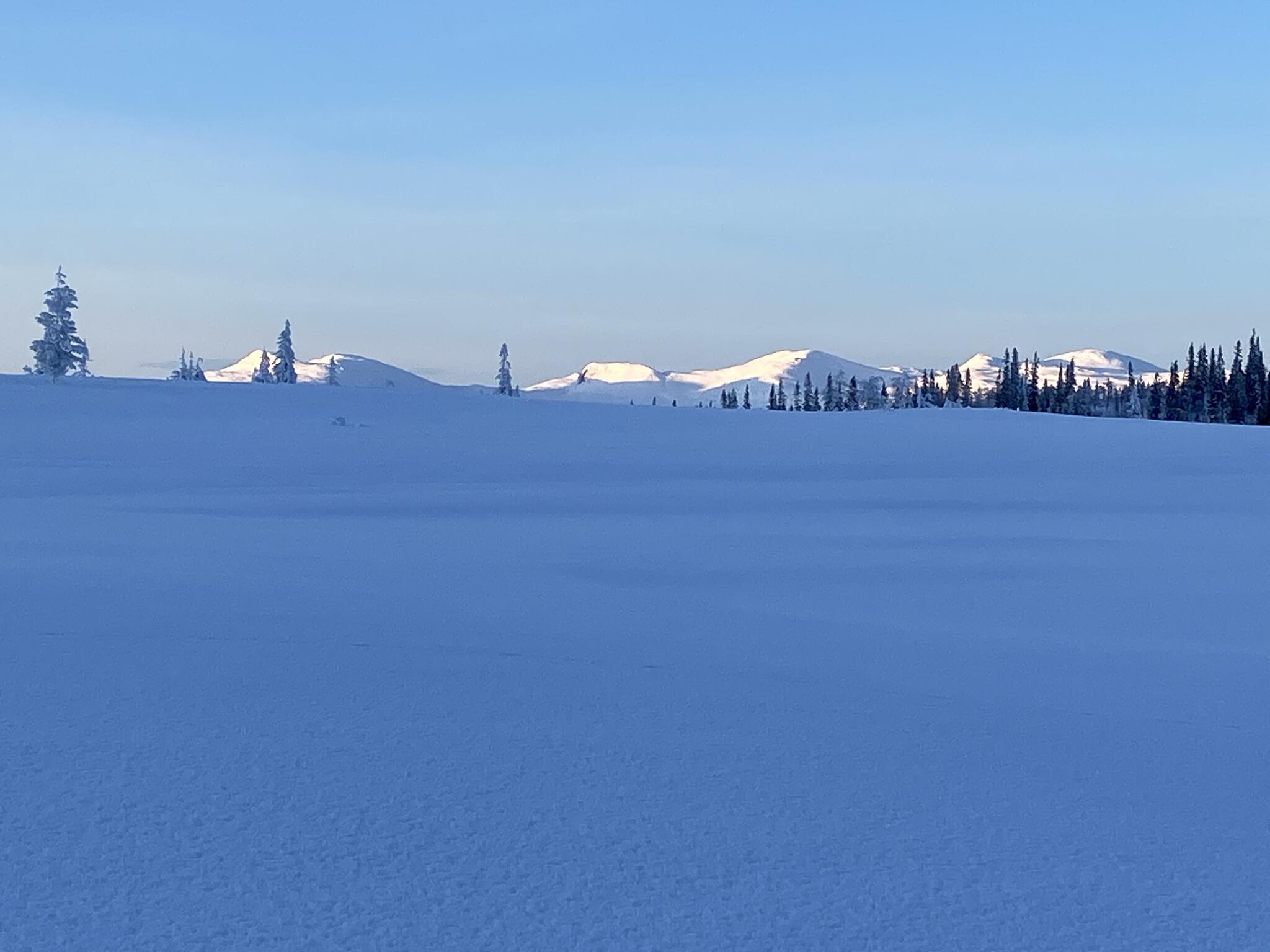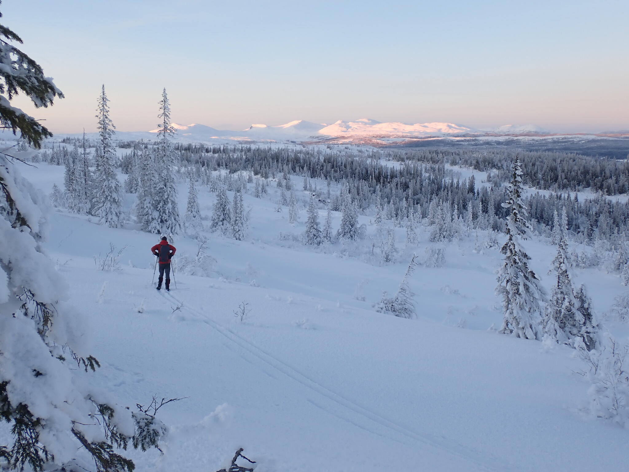 Vi skidade på fjällryggen för Österängsvalen. Den består av mindre kullar och dalar med lite träd på här och var. Otroligt fint med alla snöklädda små träd och högre fjäll i fjärran.