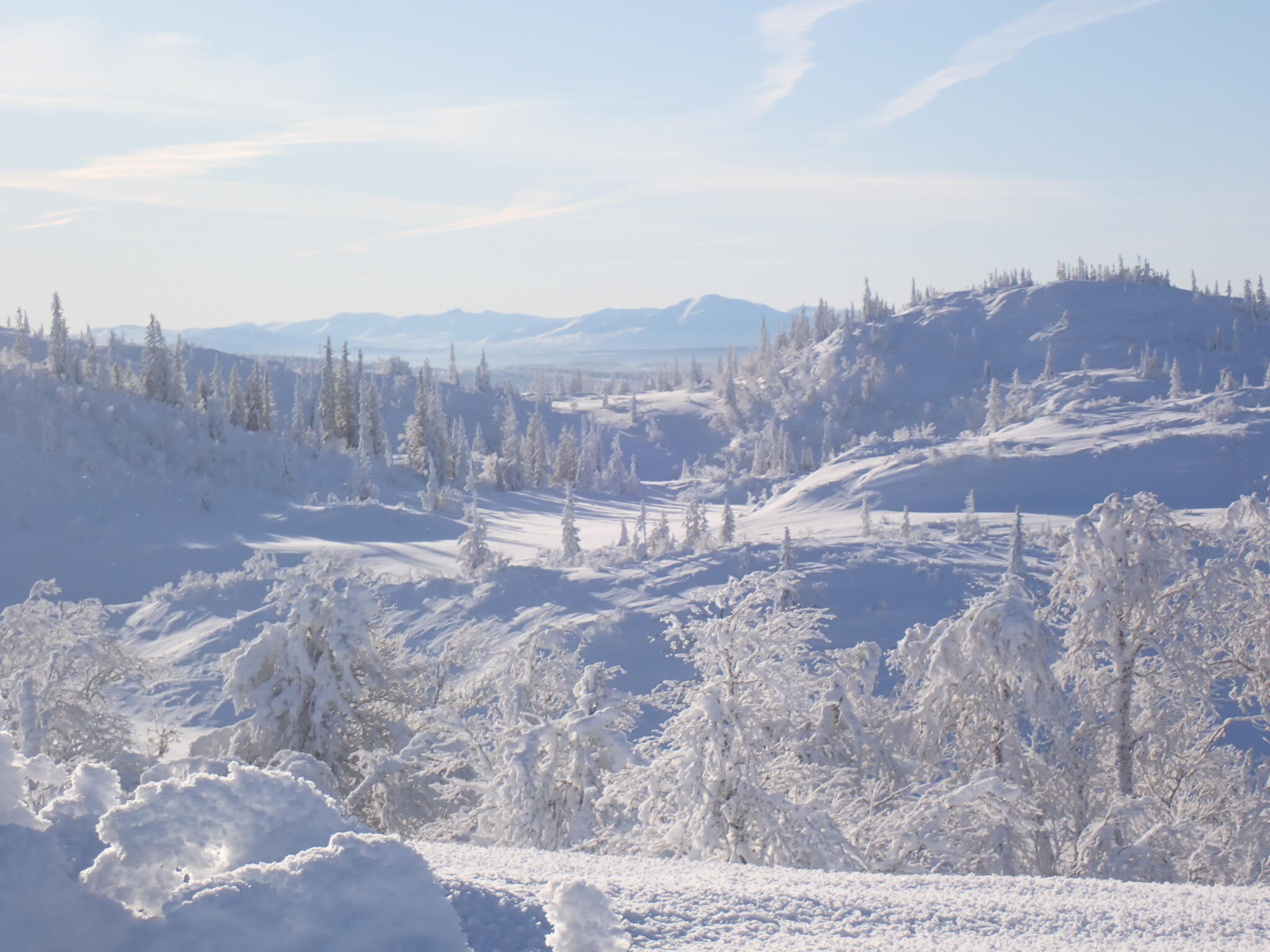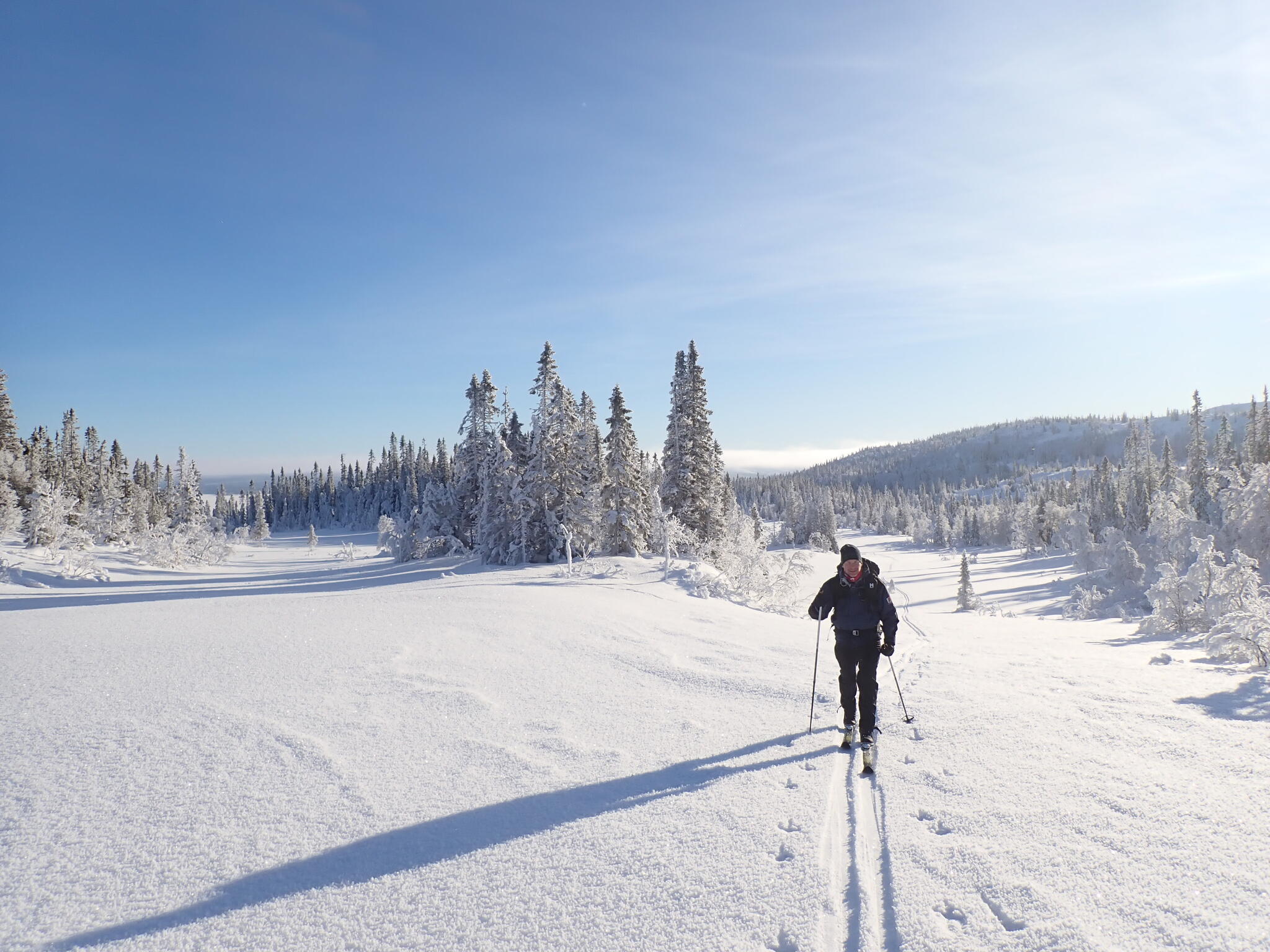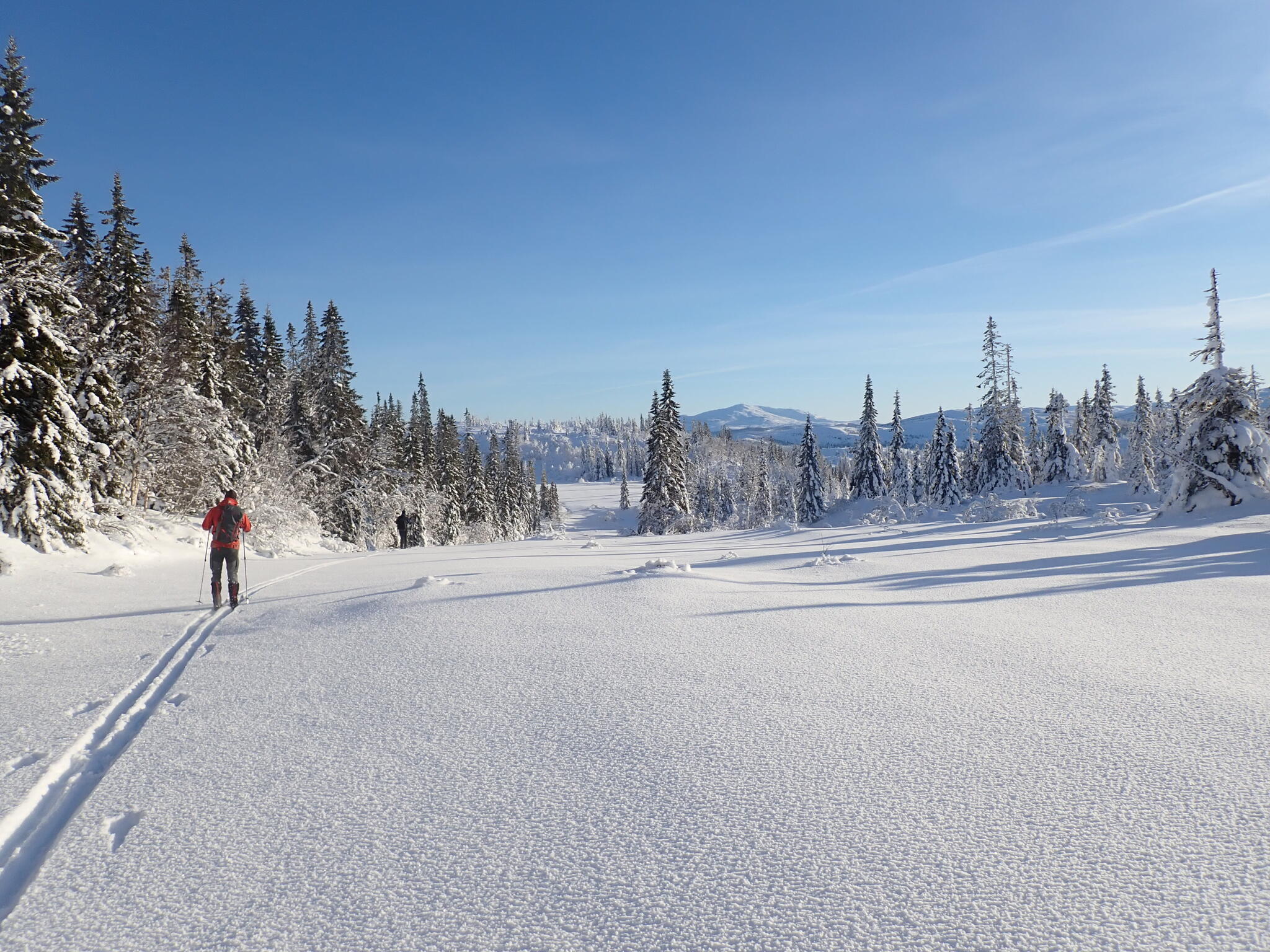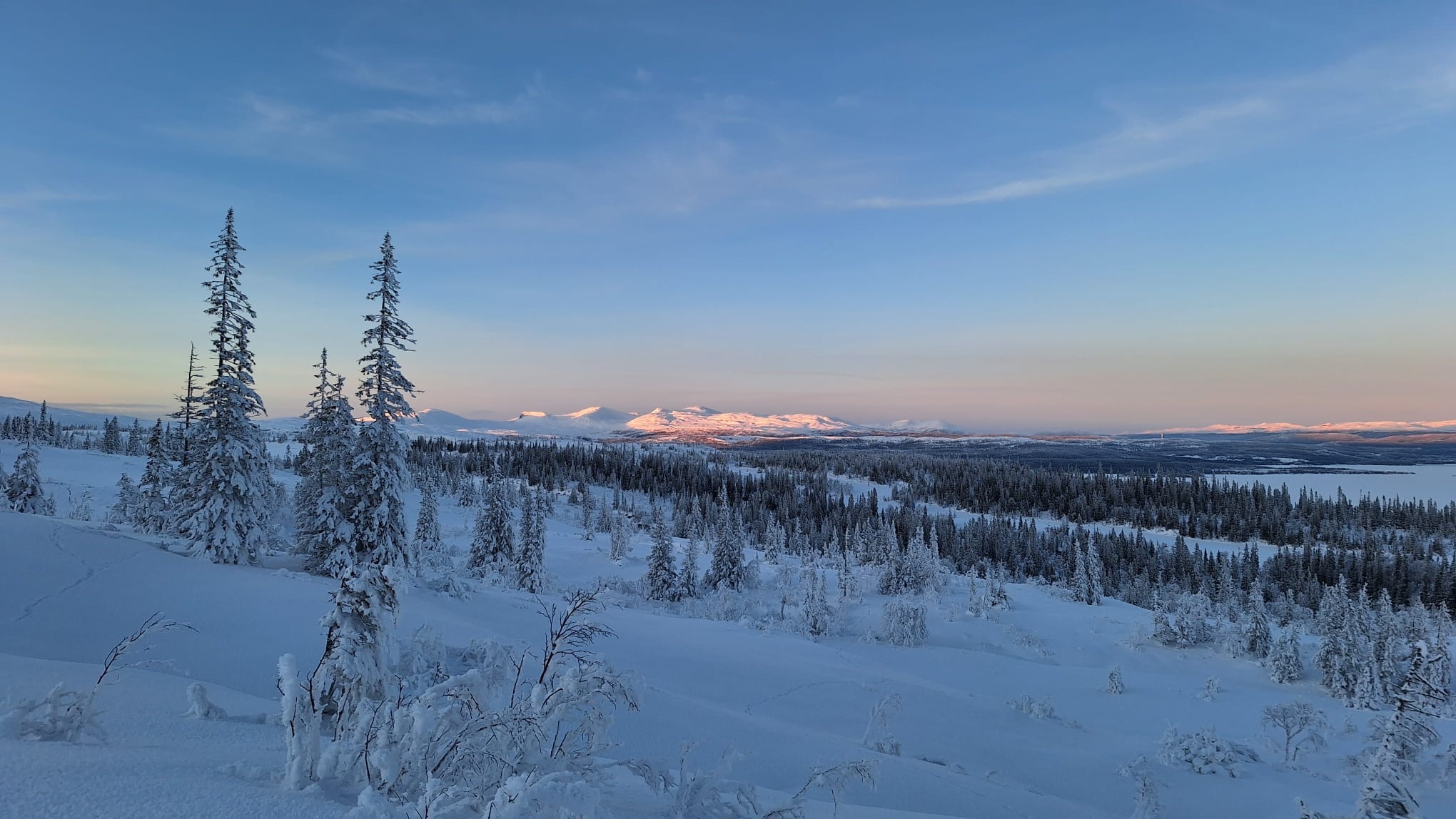 Vi skidade på fjällryggen för Österängsvalen. Den består av mindre kullar och dalar med lite träd på här och var. Otroligt fint med alla snöklädda små träd och högre fjäll i fjärran.