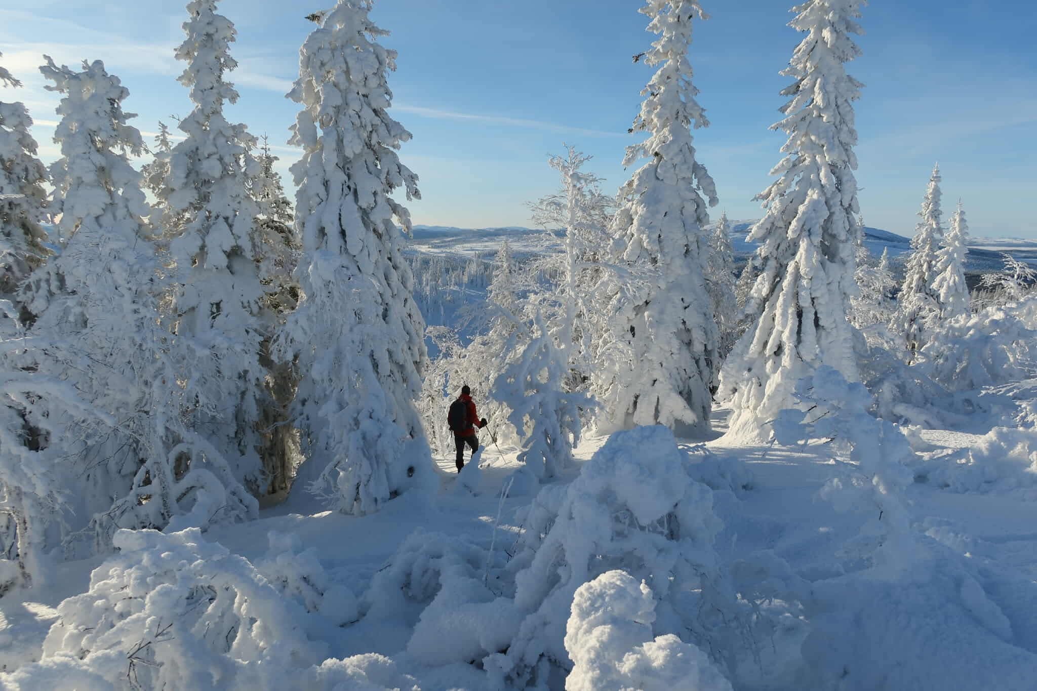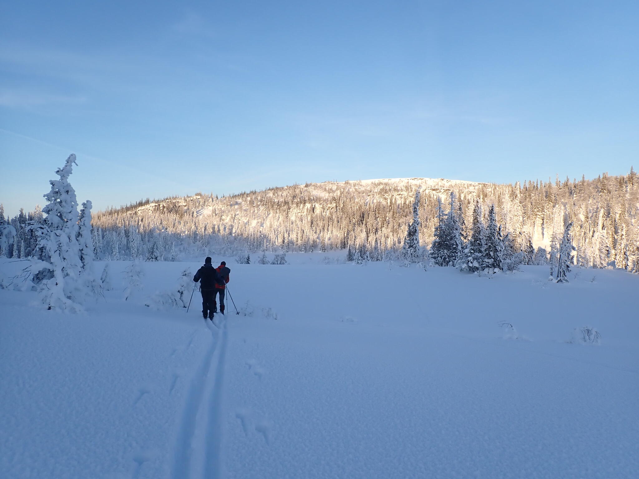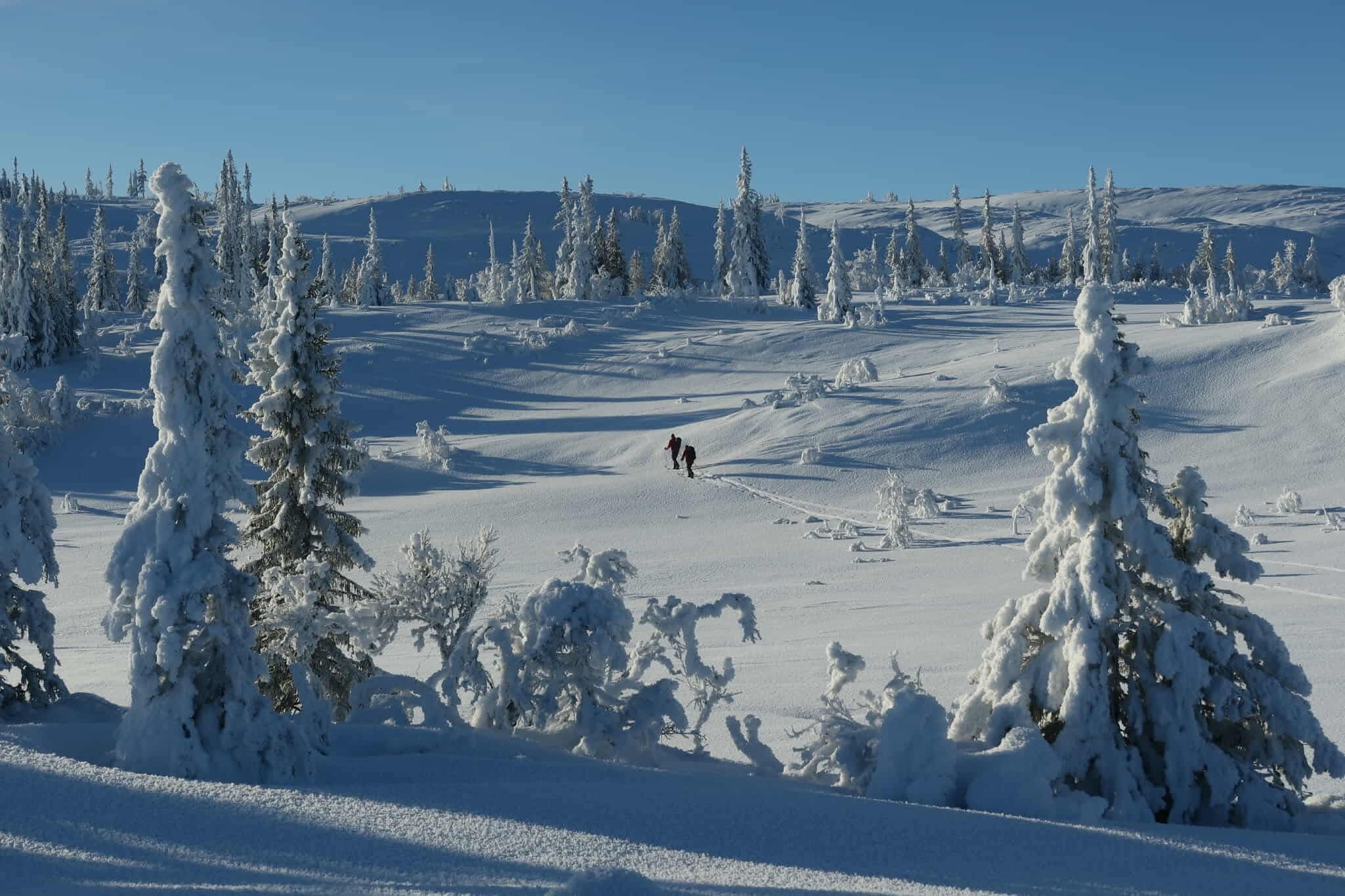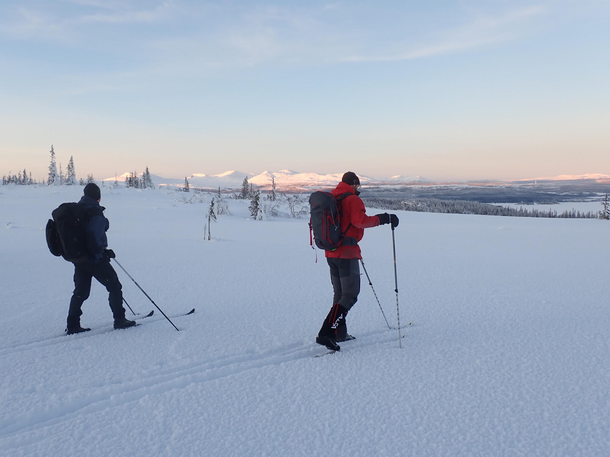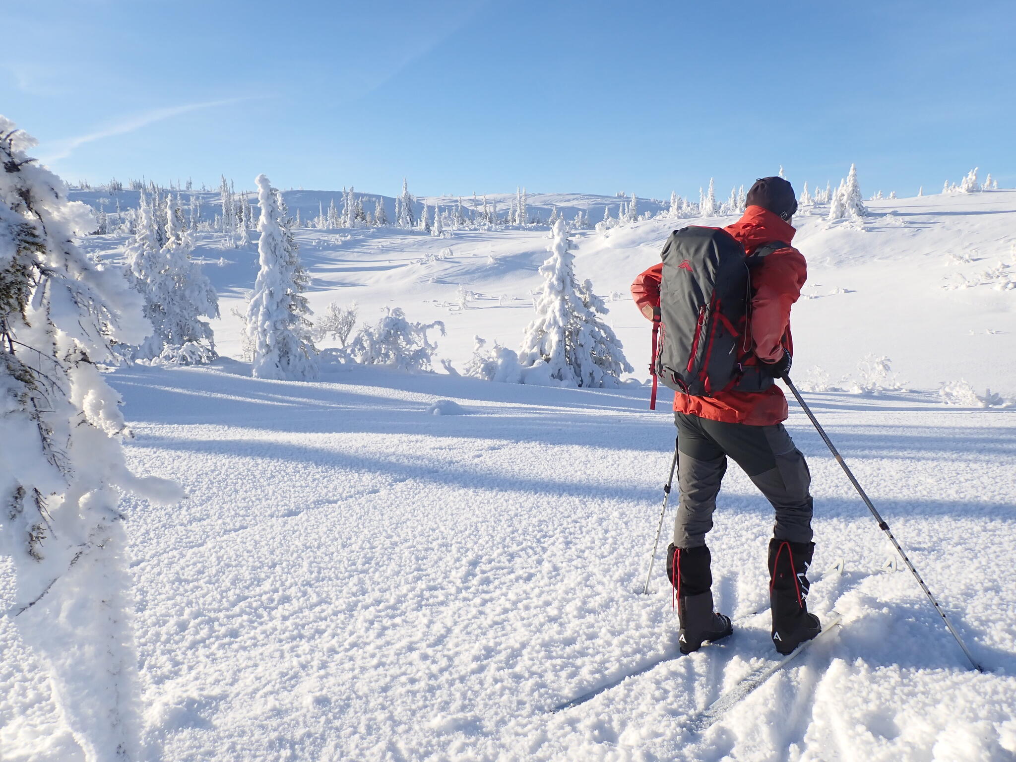 Vi skidade på fjällryggen för Österängsvalen. Den består av mindre kullar och dalar med lite träd på här och var. Otroligt fint med alla snöklädda små träd och högre fjäll i fjärran.