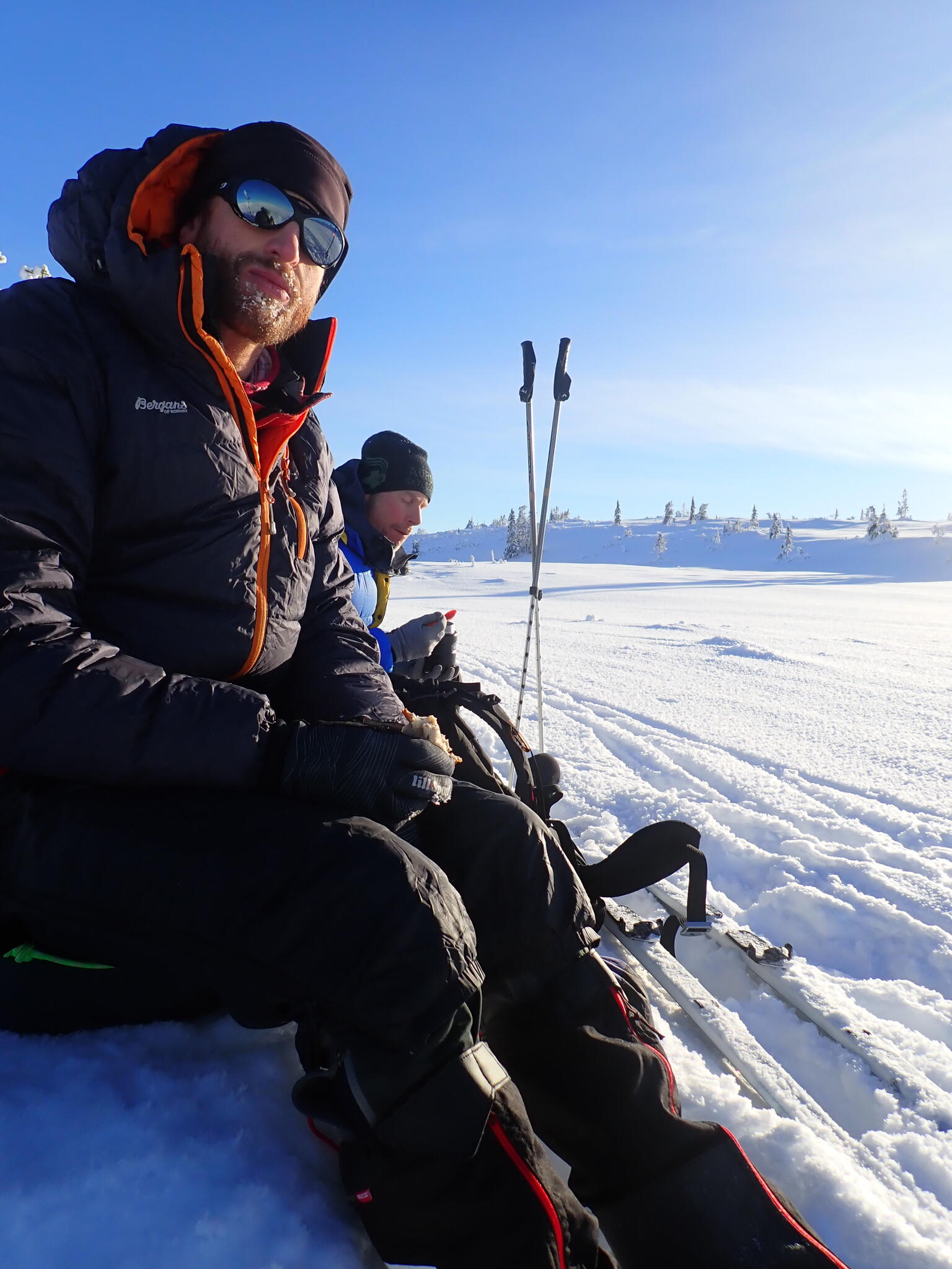 Vi skidade ner från Velivalen och tog en fikapaus i solen som var på väg neråt.