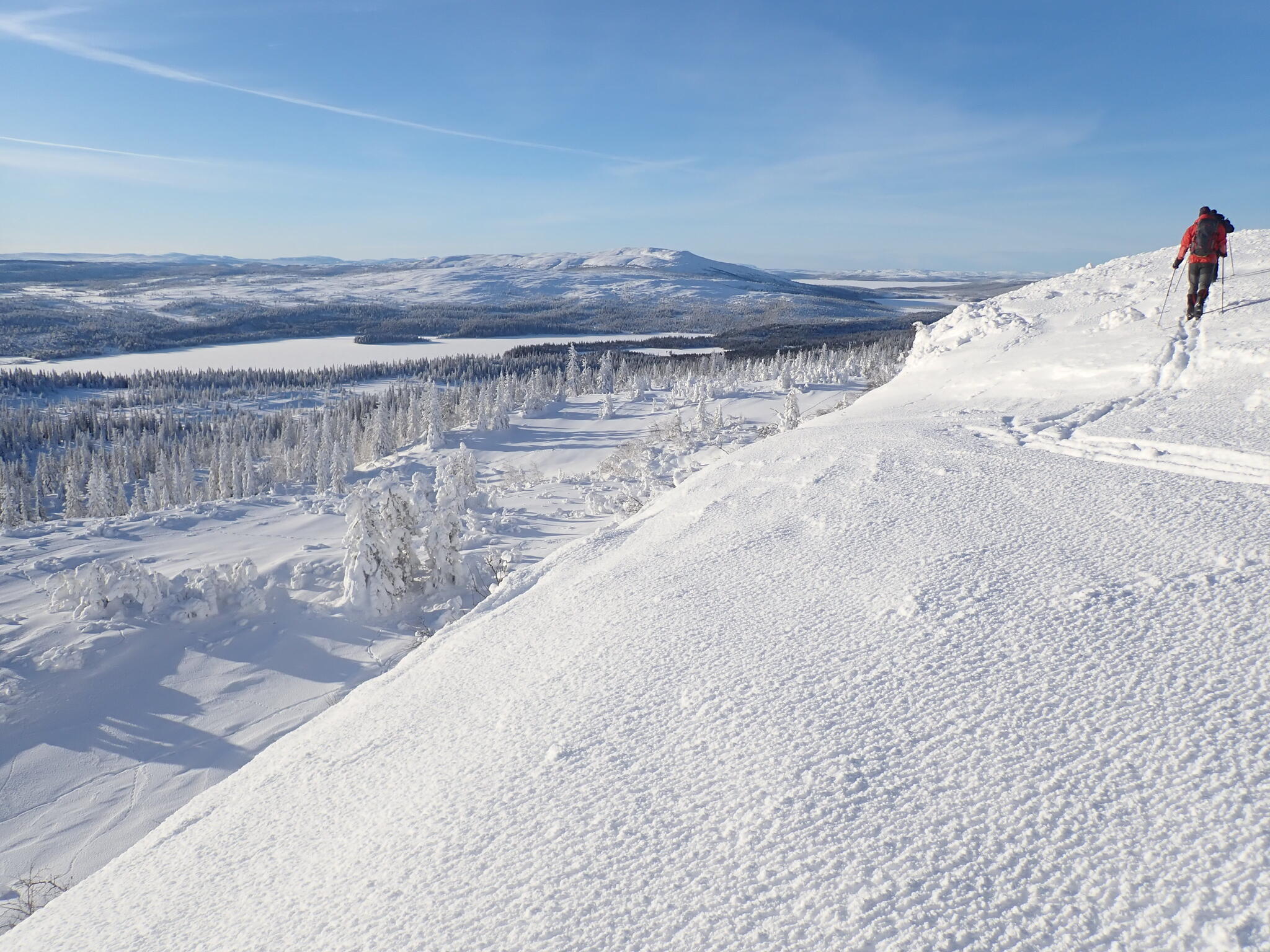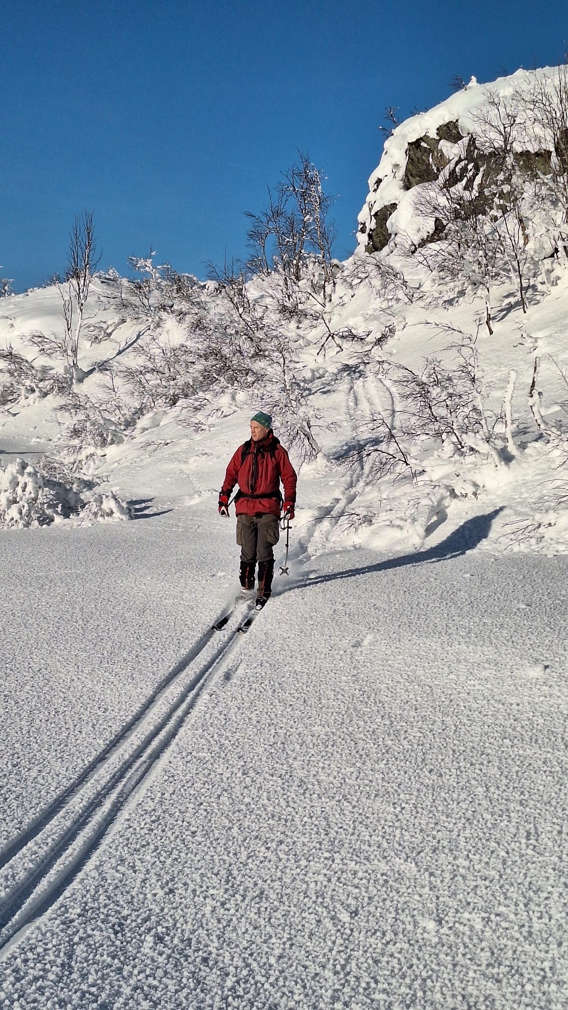 Återkommande under dagen var att vi behövde ta oss förbi några långsträckta branter. Snön var fluffig och mjuk så det gick bra.