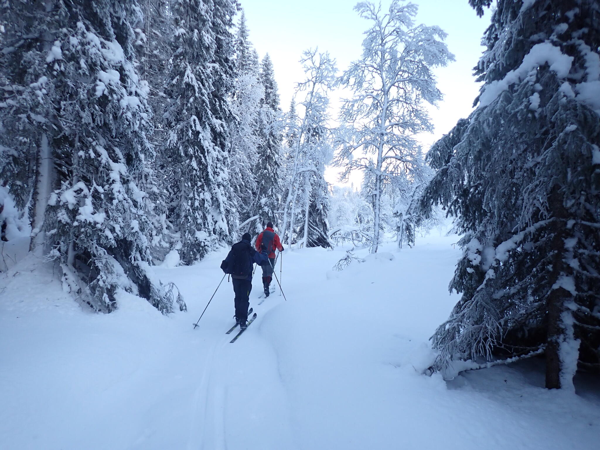 Sista biten ner till bilen åkte vi i slag ner för den bitvis branta skogen. Under granarna fanns det ibland rätt isiga snöfält. Men det gick bra.