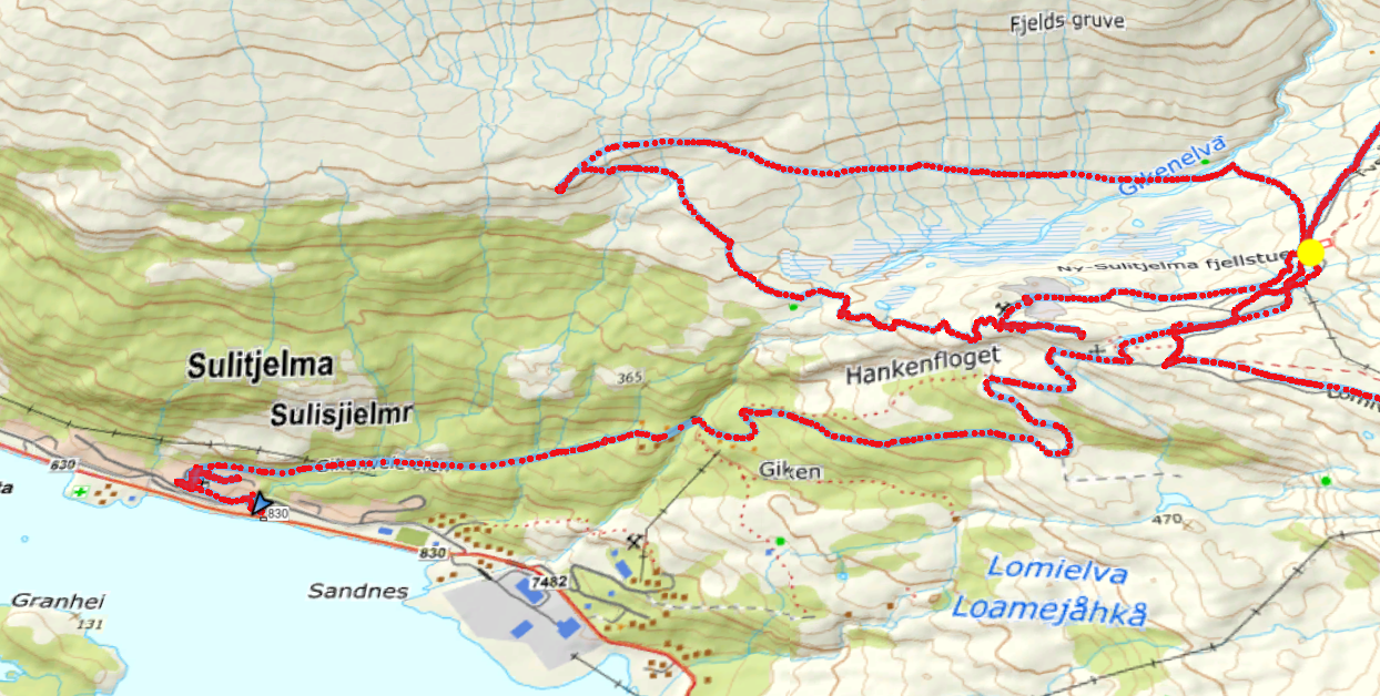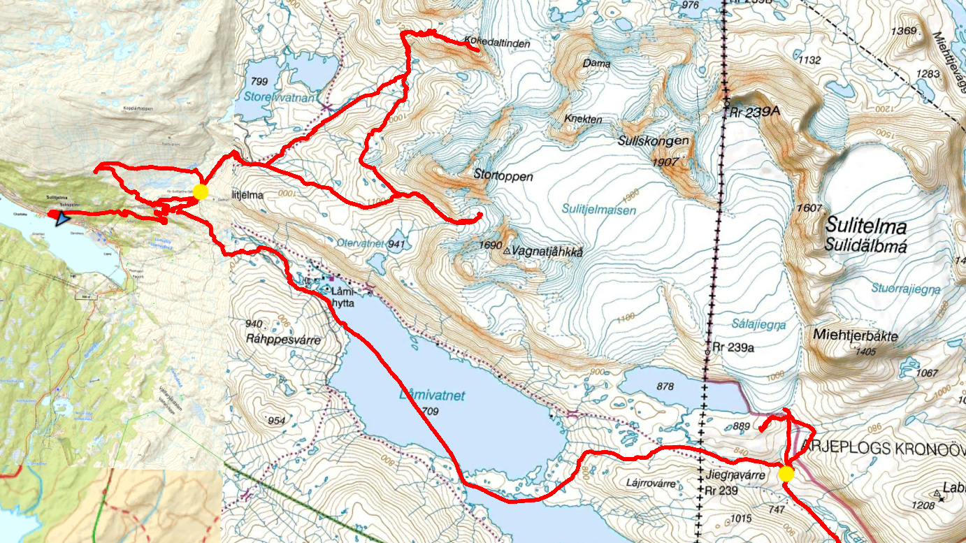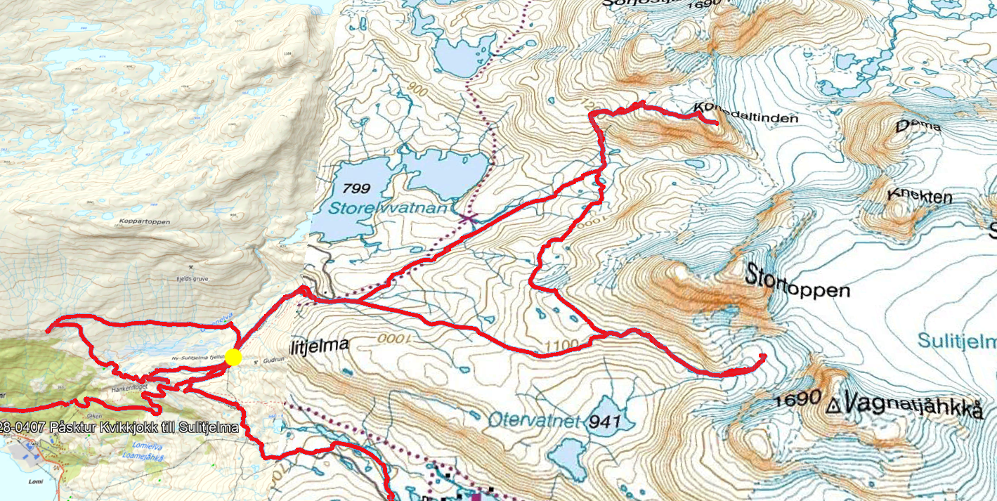 Denna dag hade vi en buss att passa ner i samhället Sulitjelma. Innan vi skidade ner dit var vi några som gjorde en kortare skidtur västerut. Se rundan på kartan ovan.