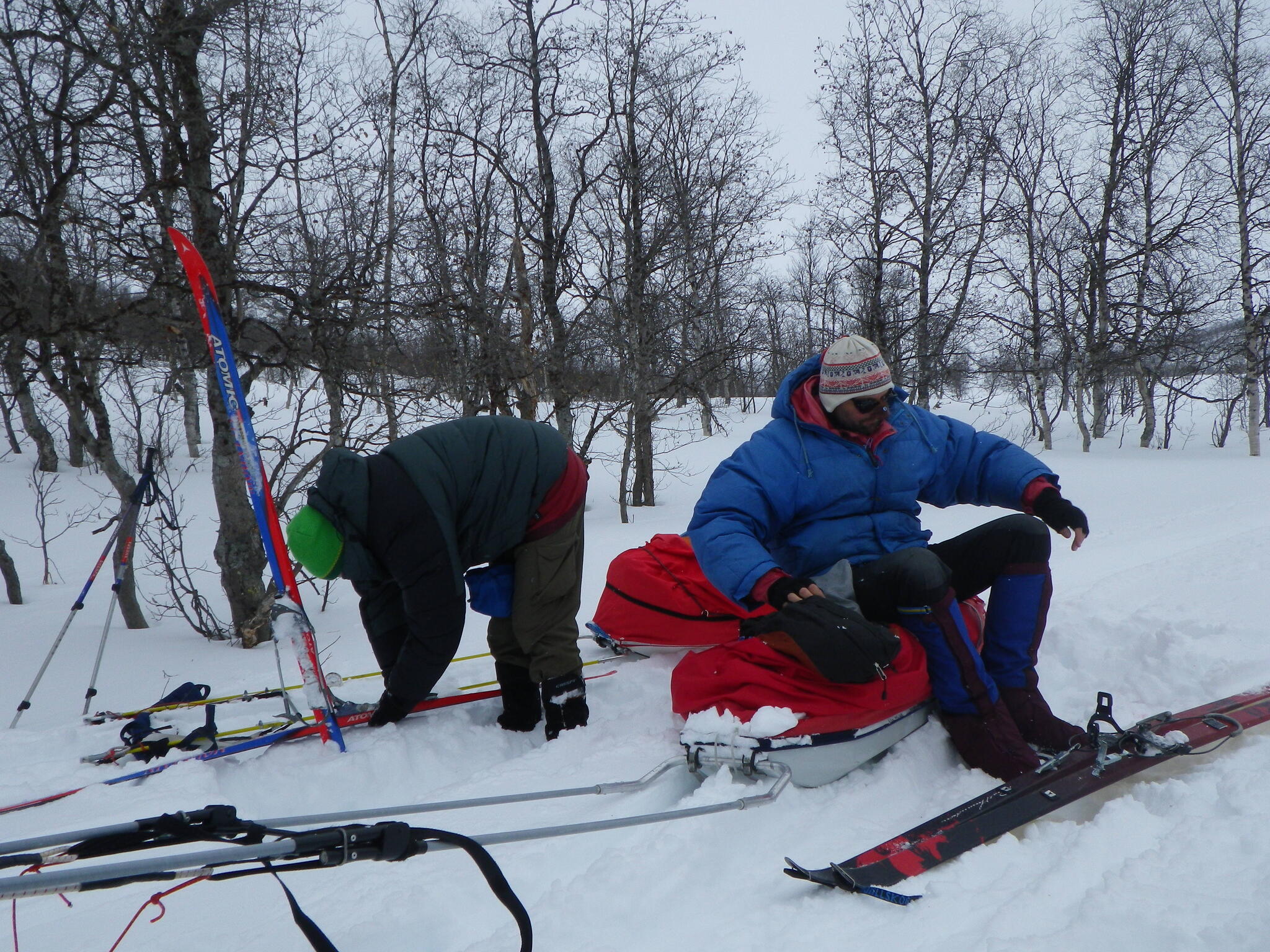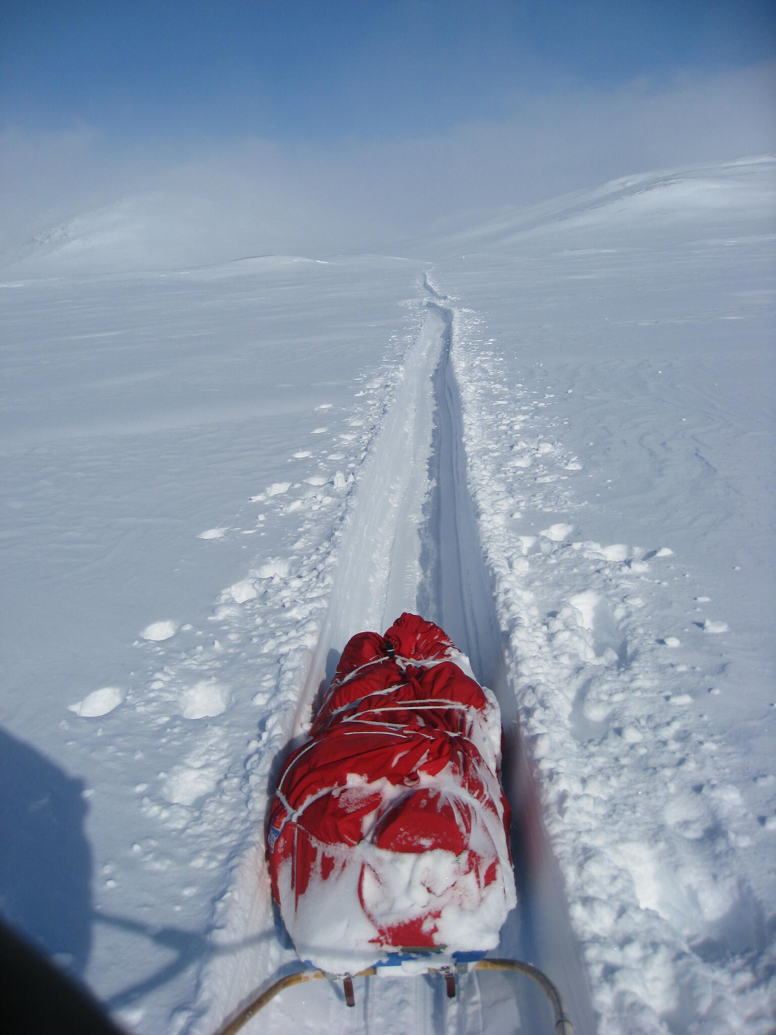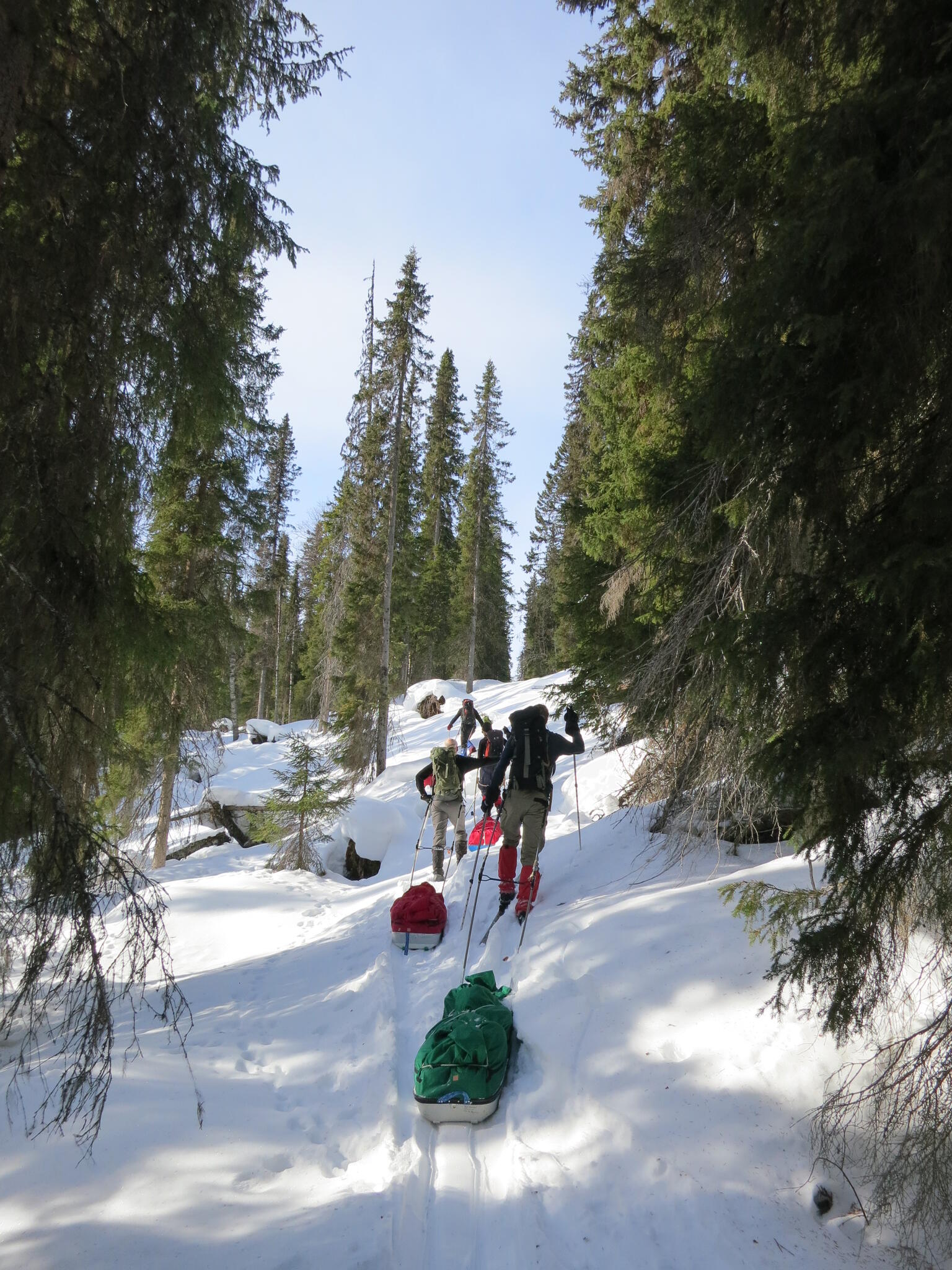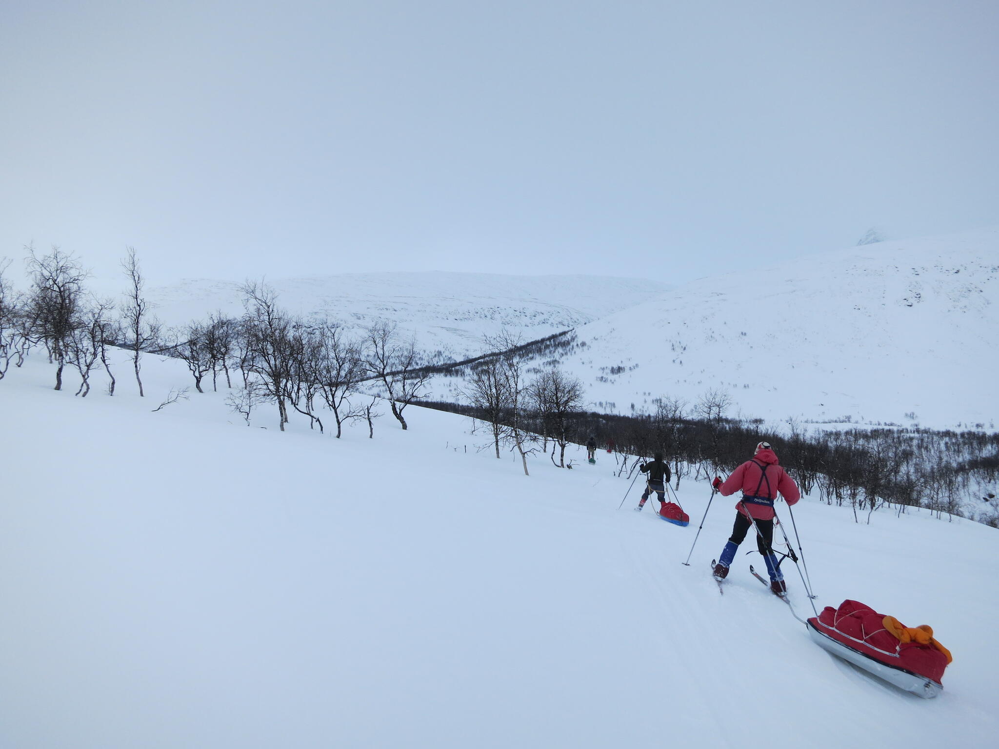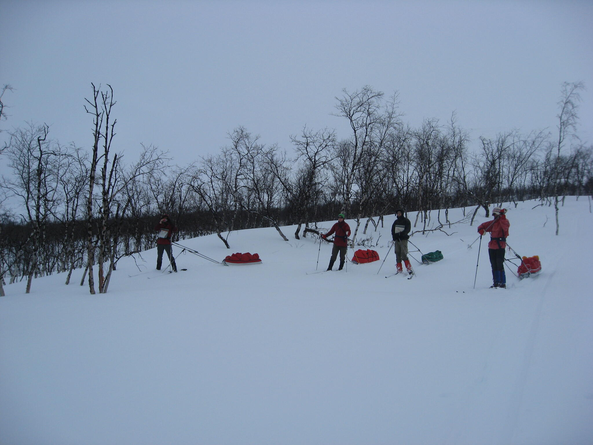 Vi började med att dra fullpackade pulkor uppför Prinskullen vid Kvikkjokk i djupsnö. Ibland fick vi dra dem över omkullvälta träd. Det var en lite väl tung start.