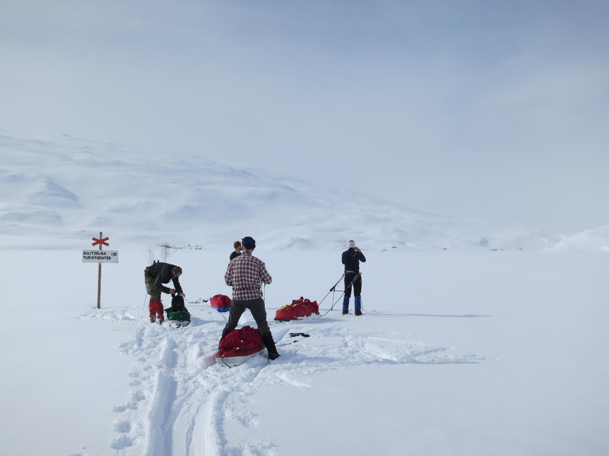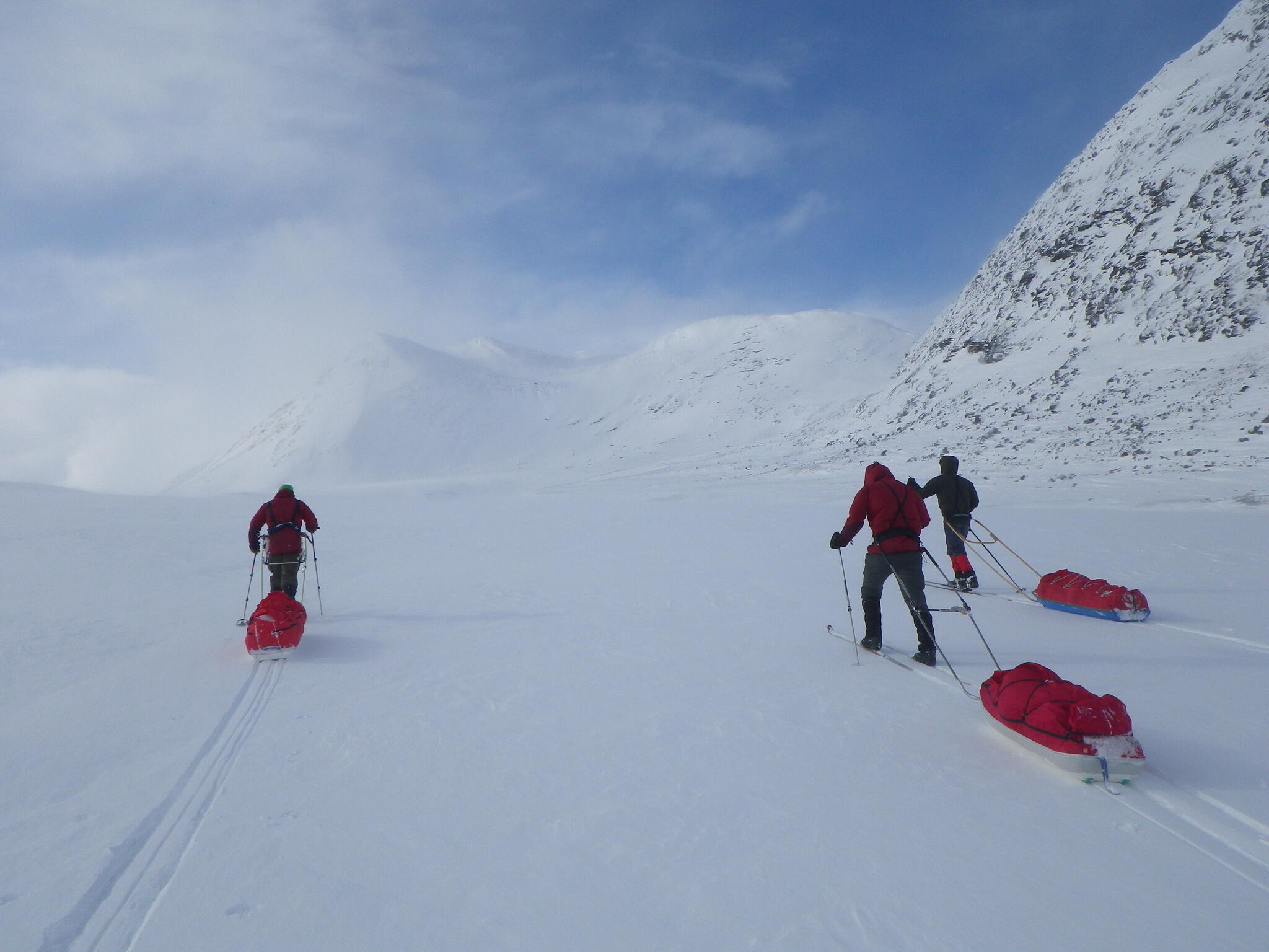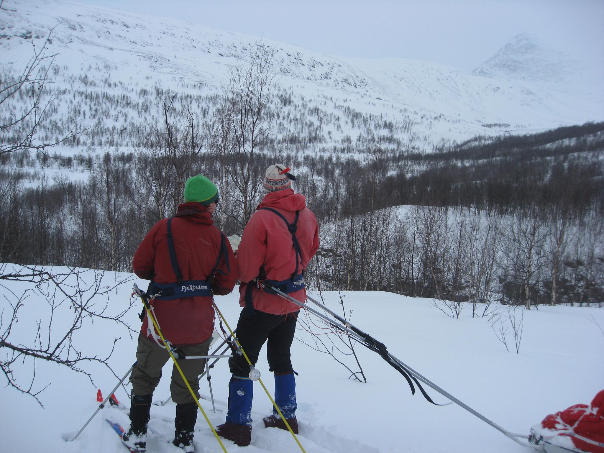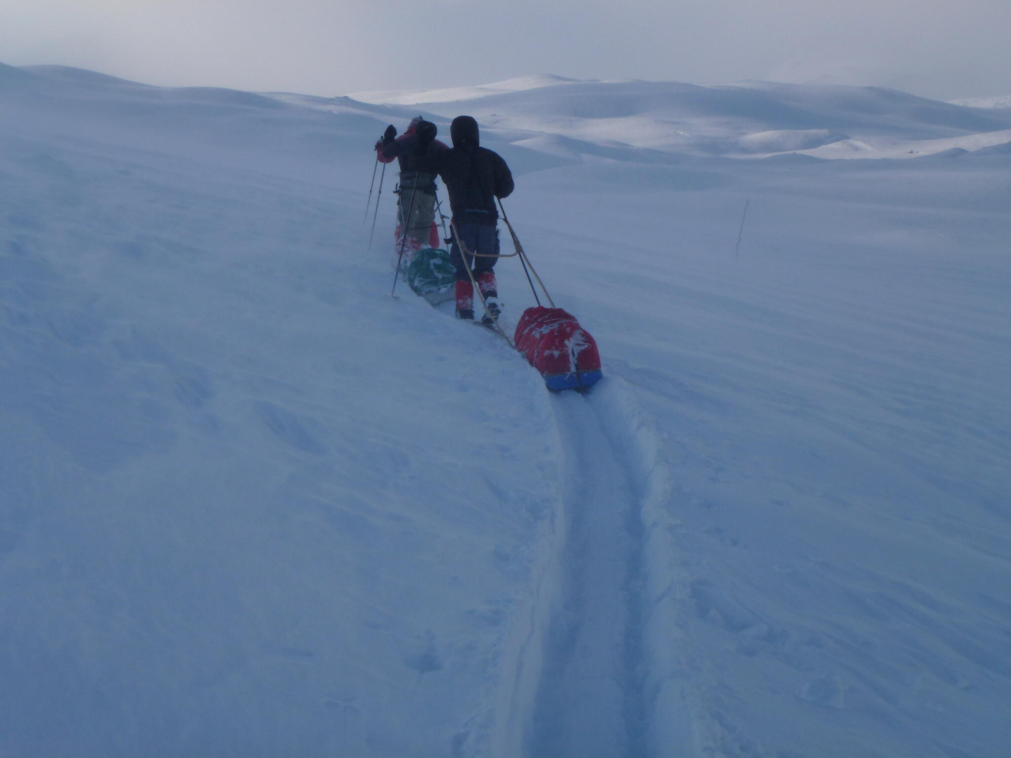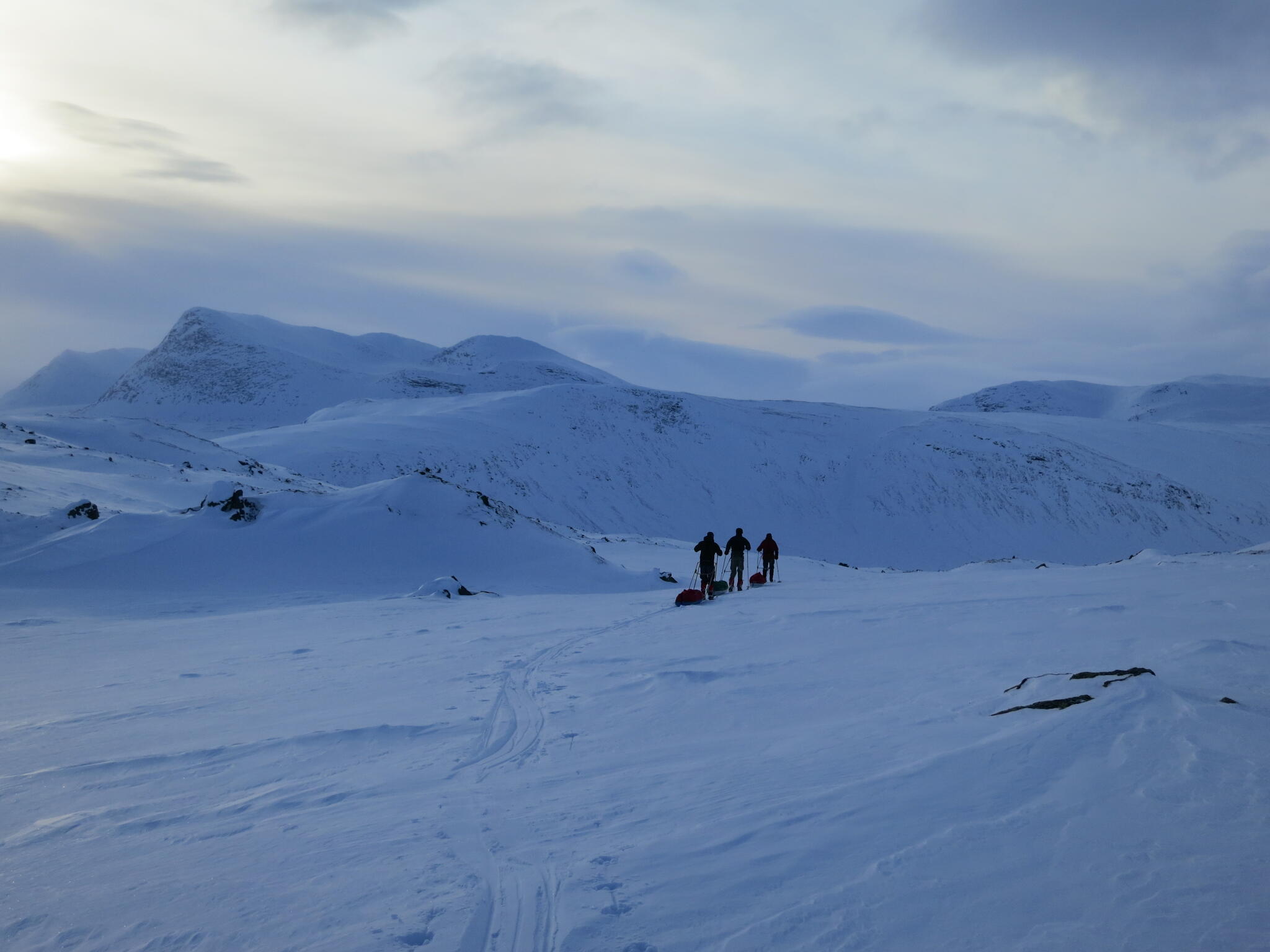 Vi började med att dra fullpackade pulkor uppför Prinskullen vid Kvikkjokk i djupsnö. Ibland fick vi dra dem över omkullvälta träd. Det var en lite väl tung start.