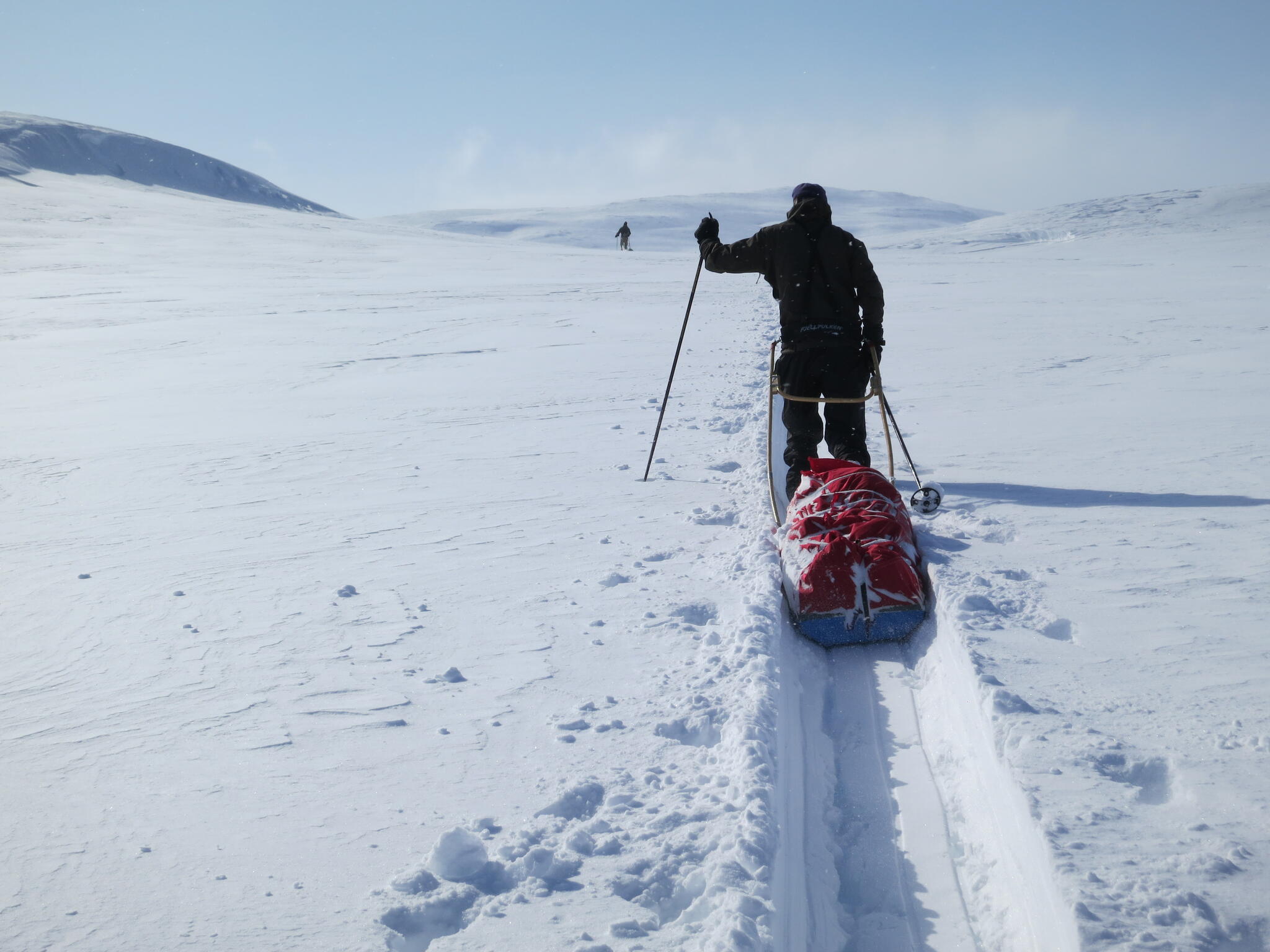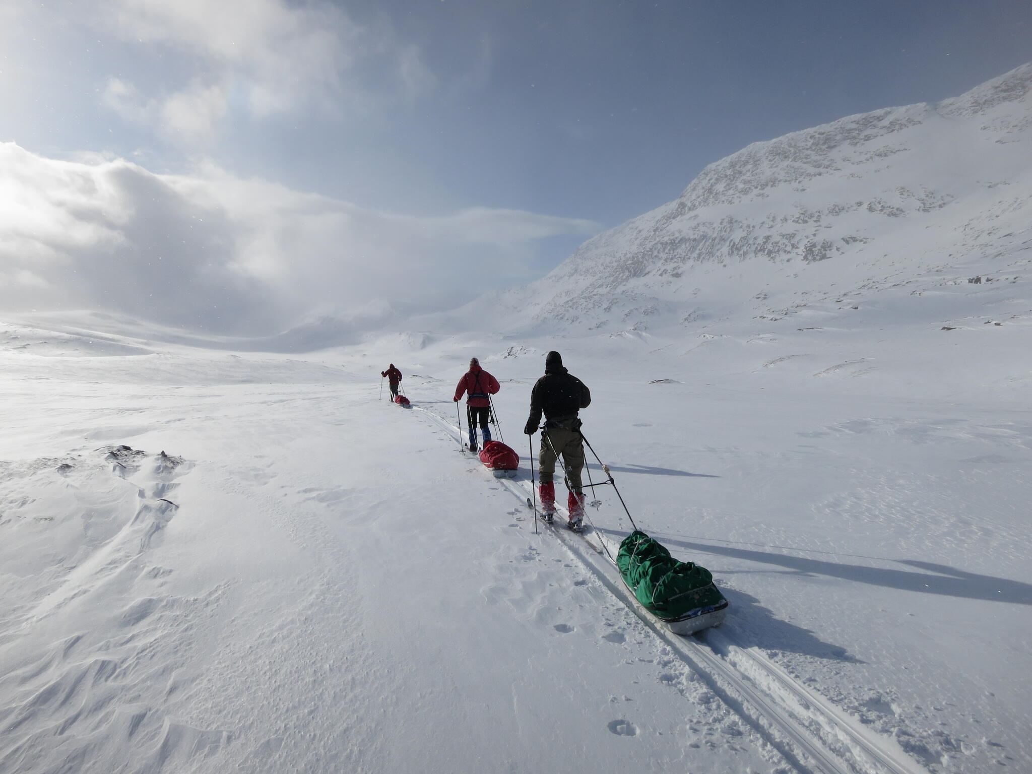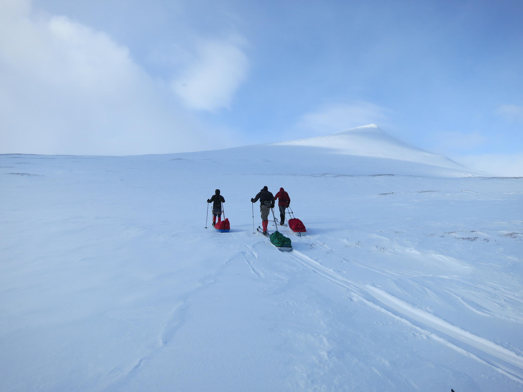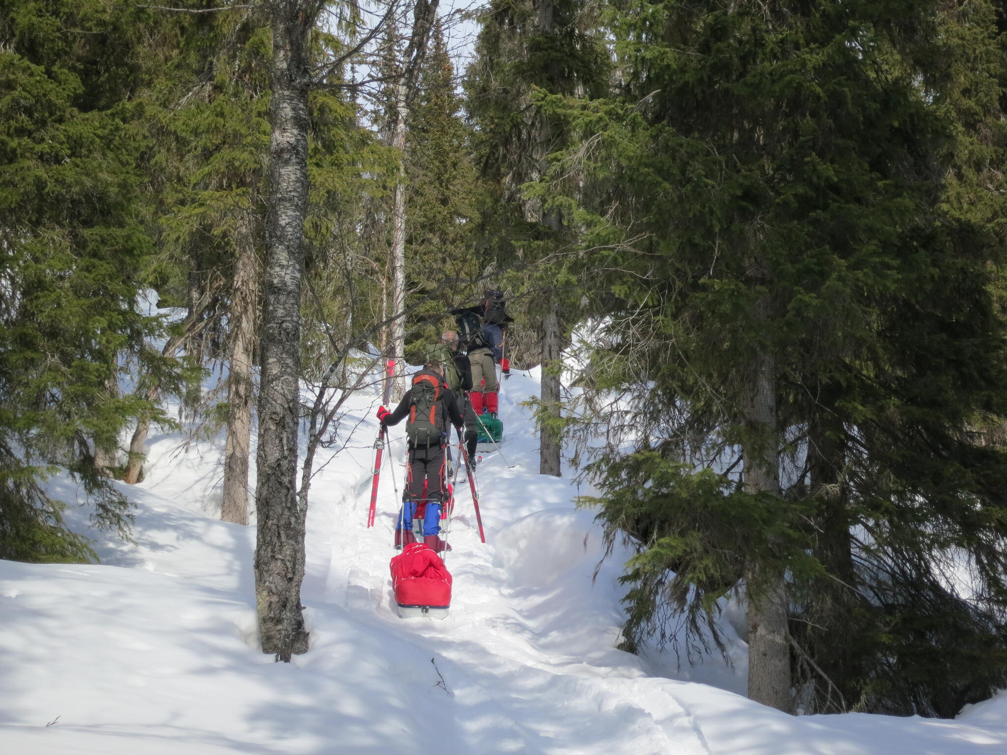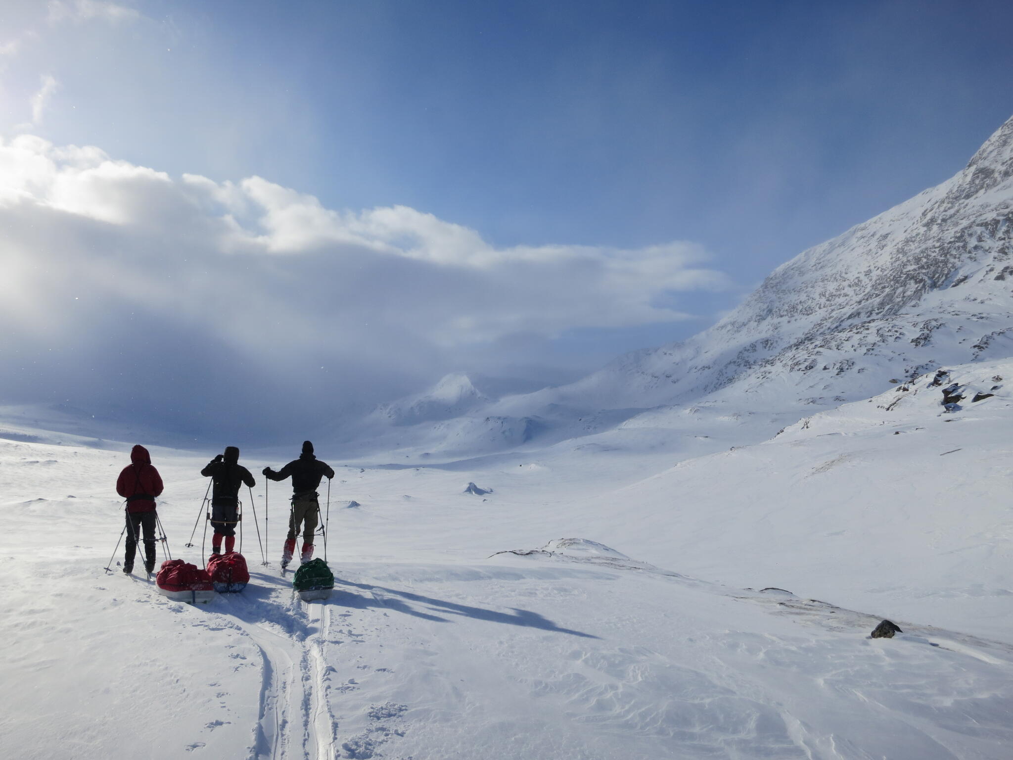 Vi började med att dra fullpackade pulkor uppför Prinskullen vid Kvikkjokk i djupsnö. Ibland fick vi dra dem över omkullvälta träd. Det var en lite väl tung start.