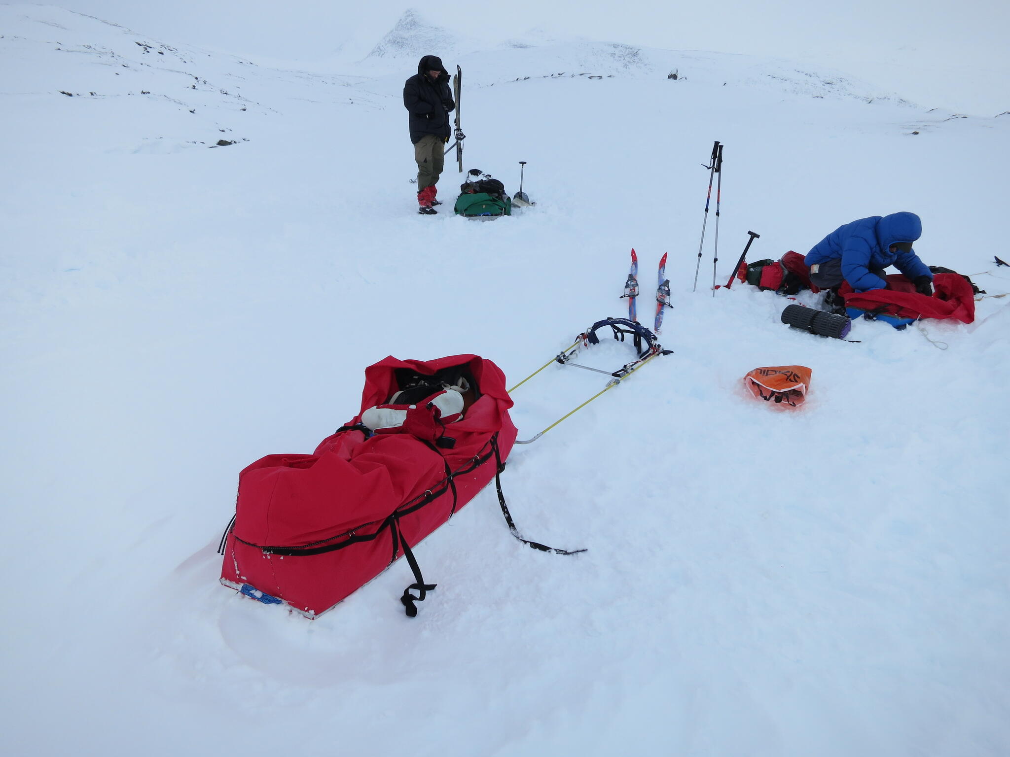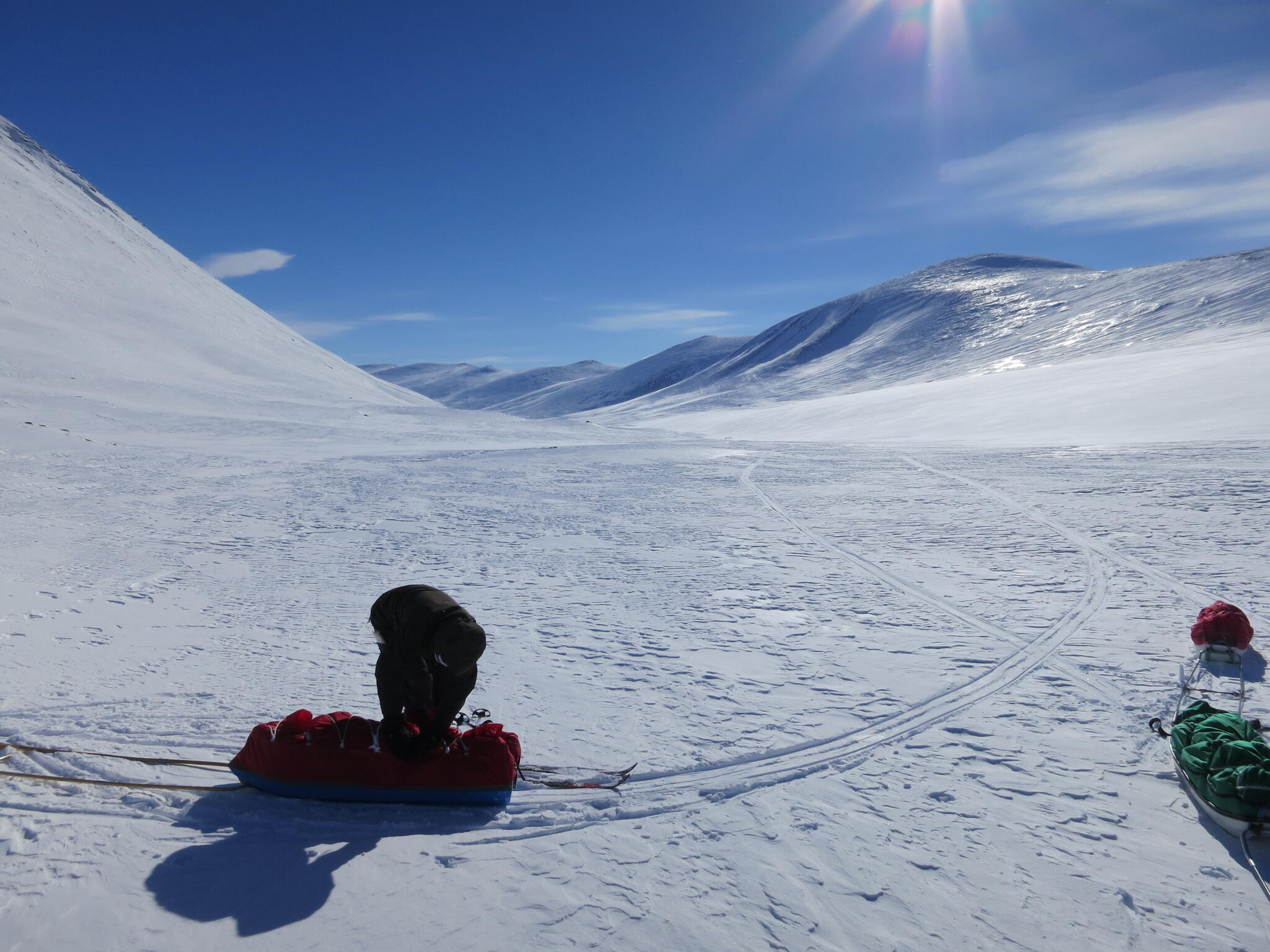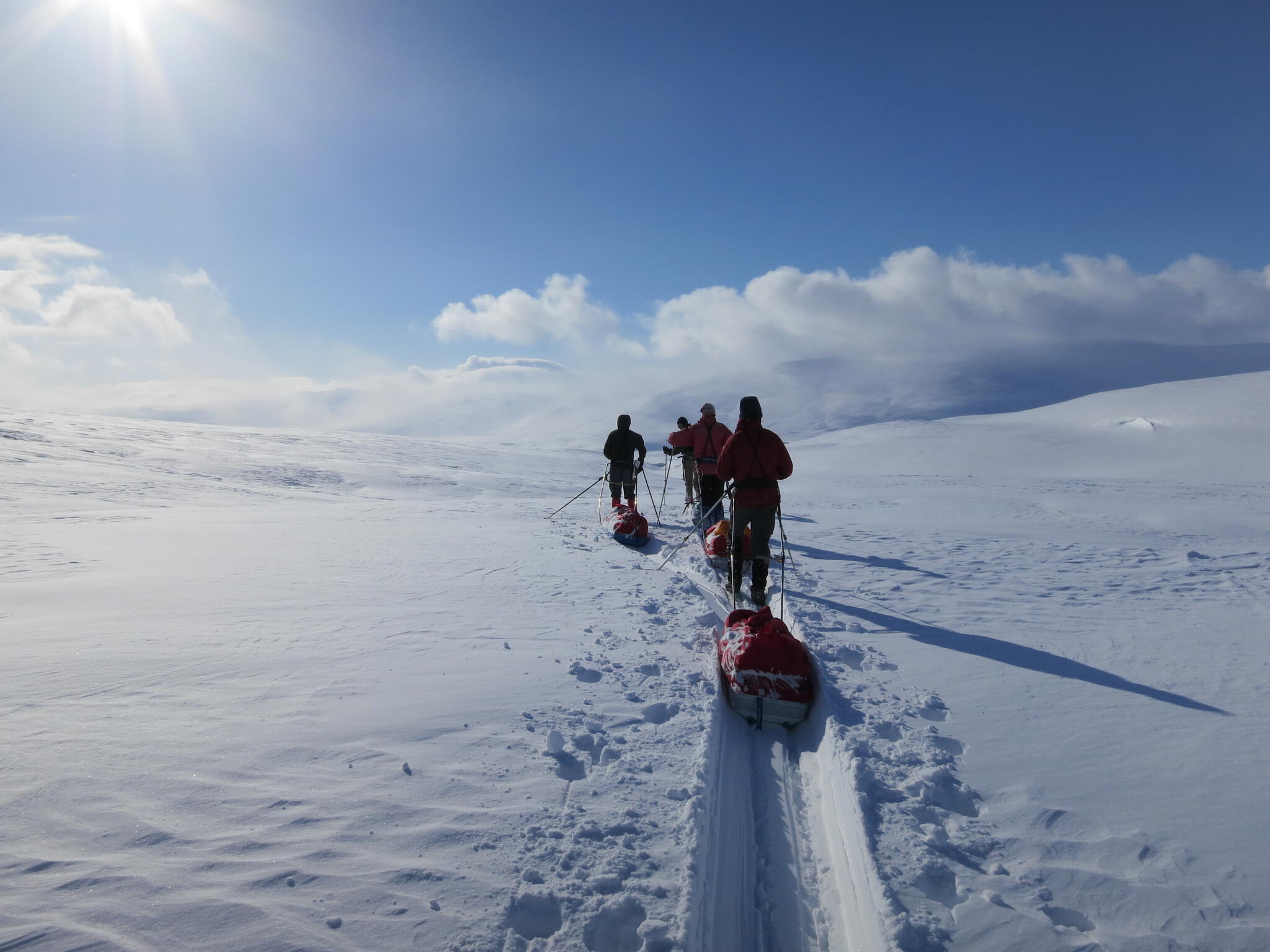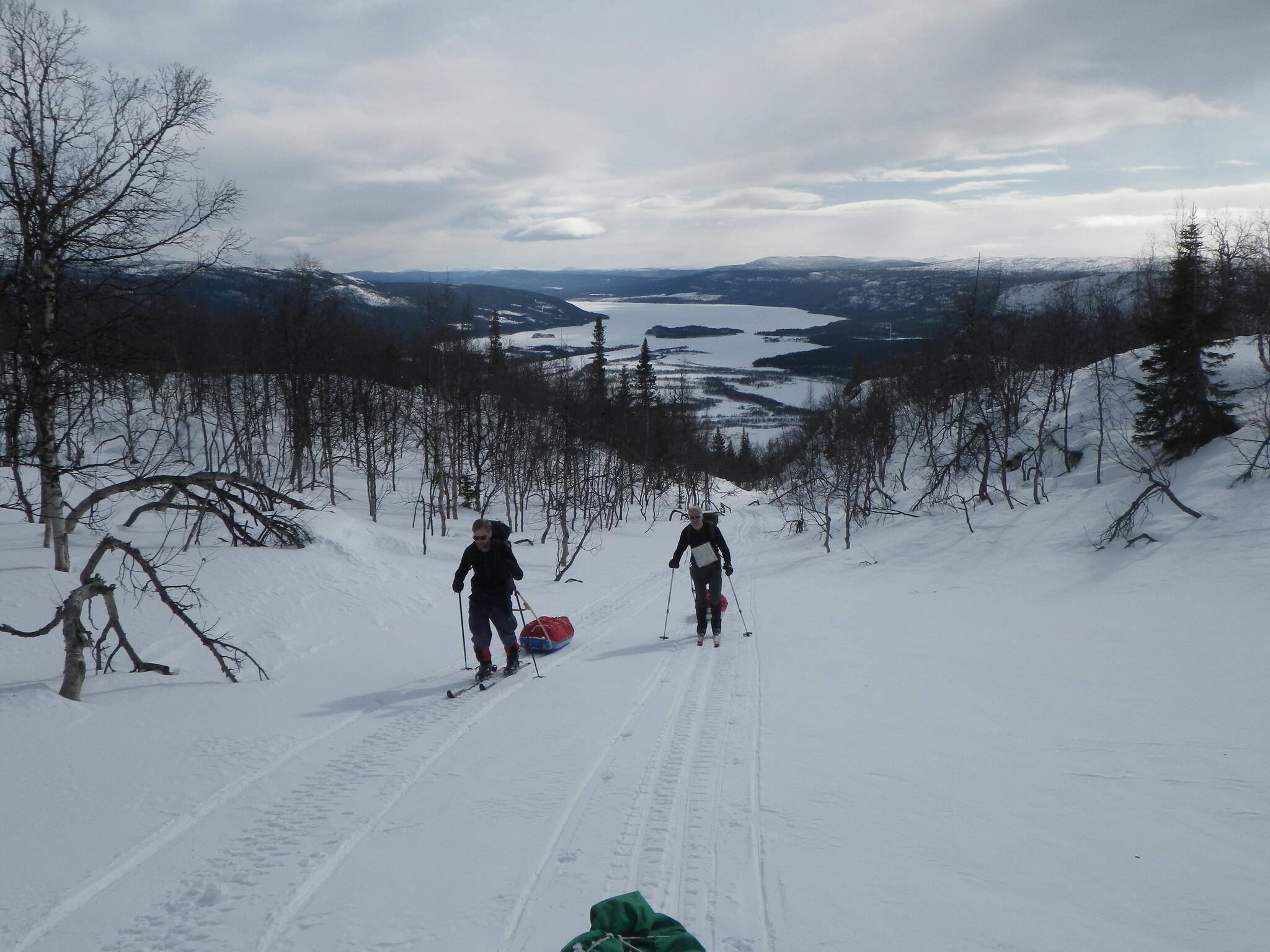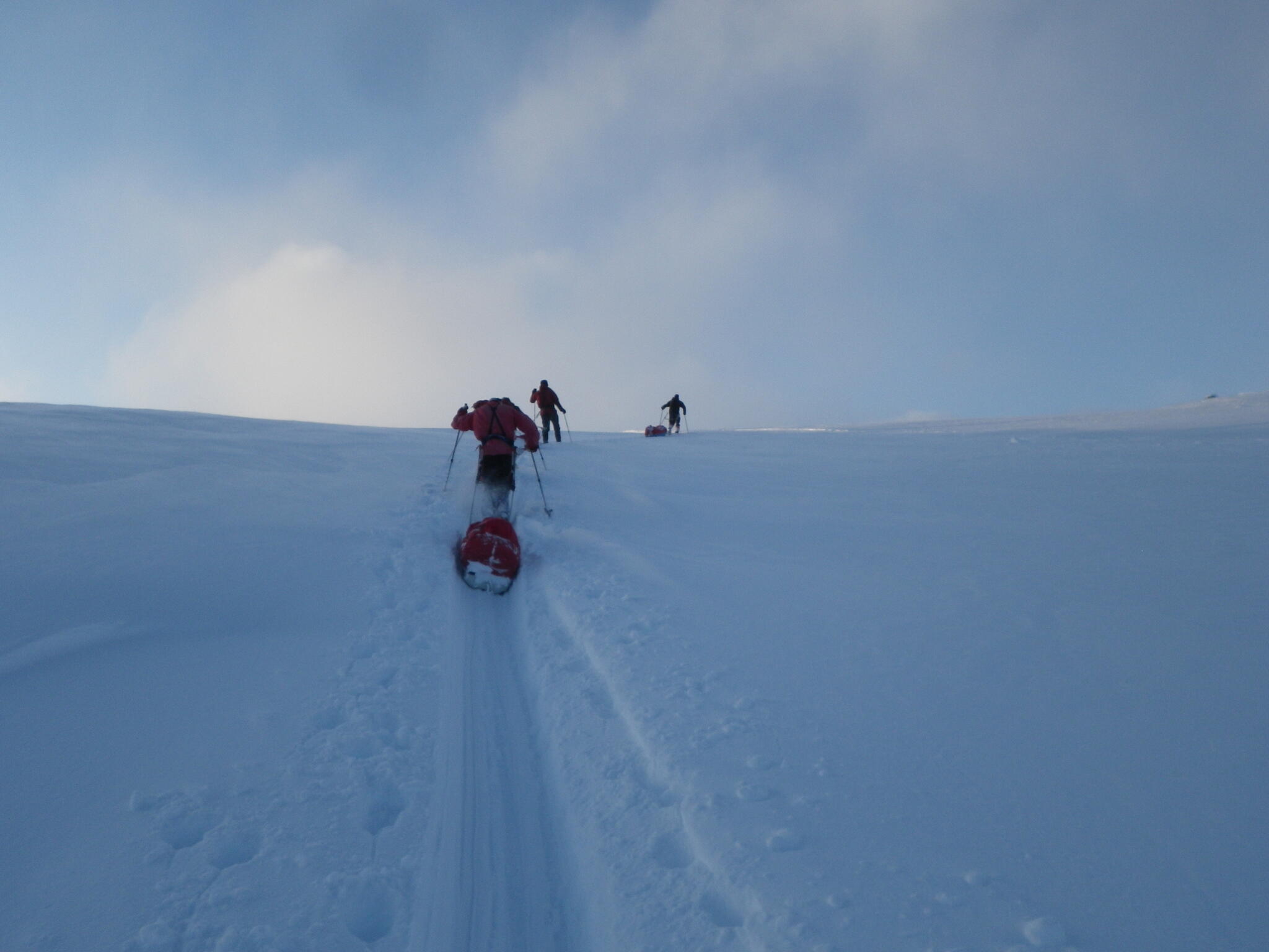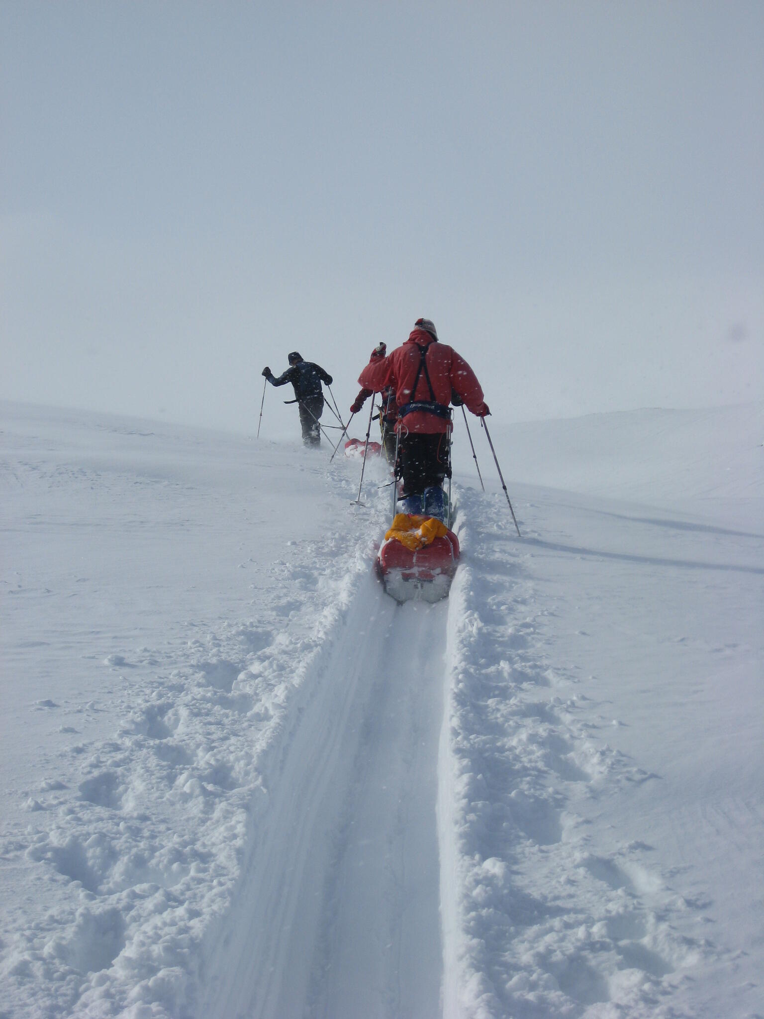 Vi började med att dra fullpackade pulkor uppför Prinskullen vid Kvikkjokk i djupsnö. Ibland fick vi dra dem över omkullvälta träd. Det var en lite väl tung start.
