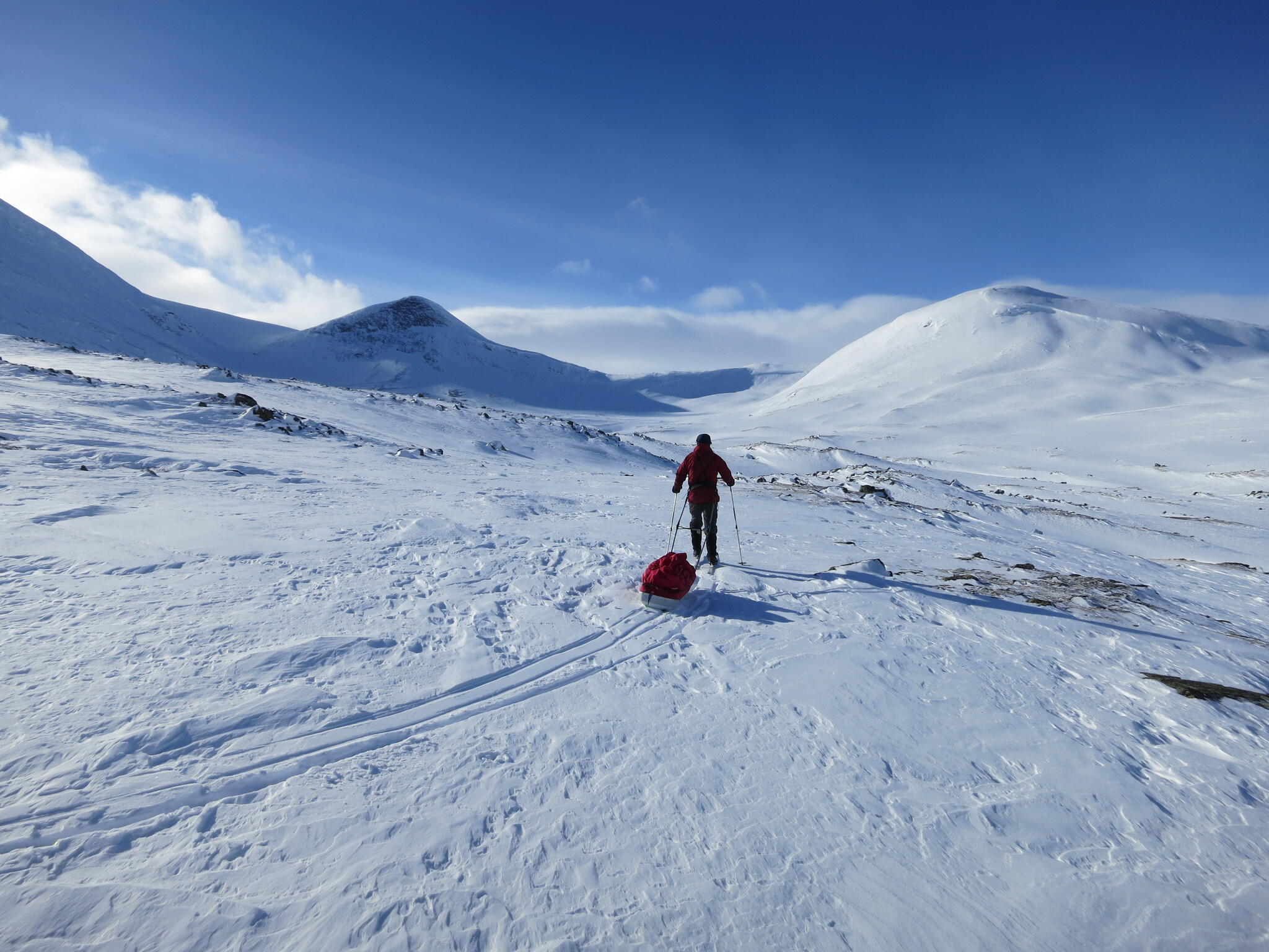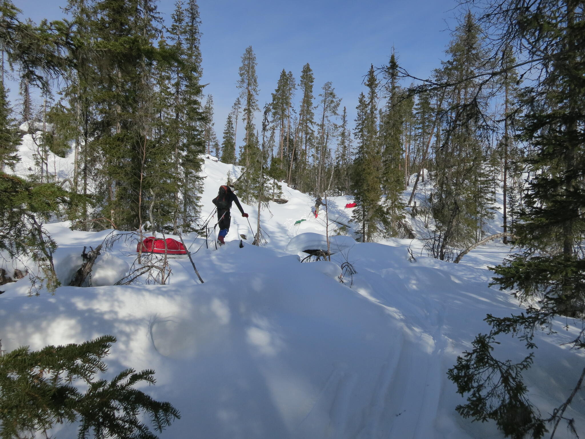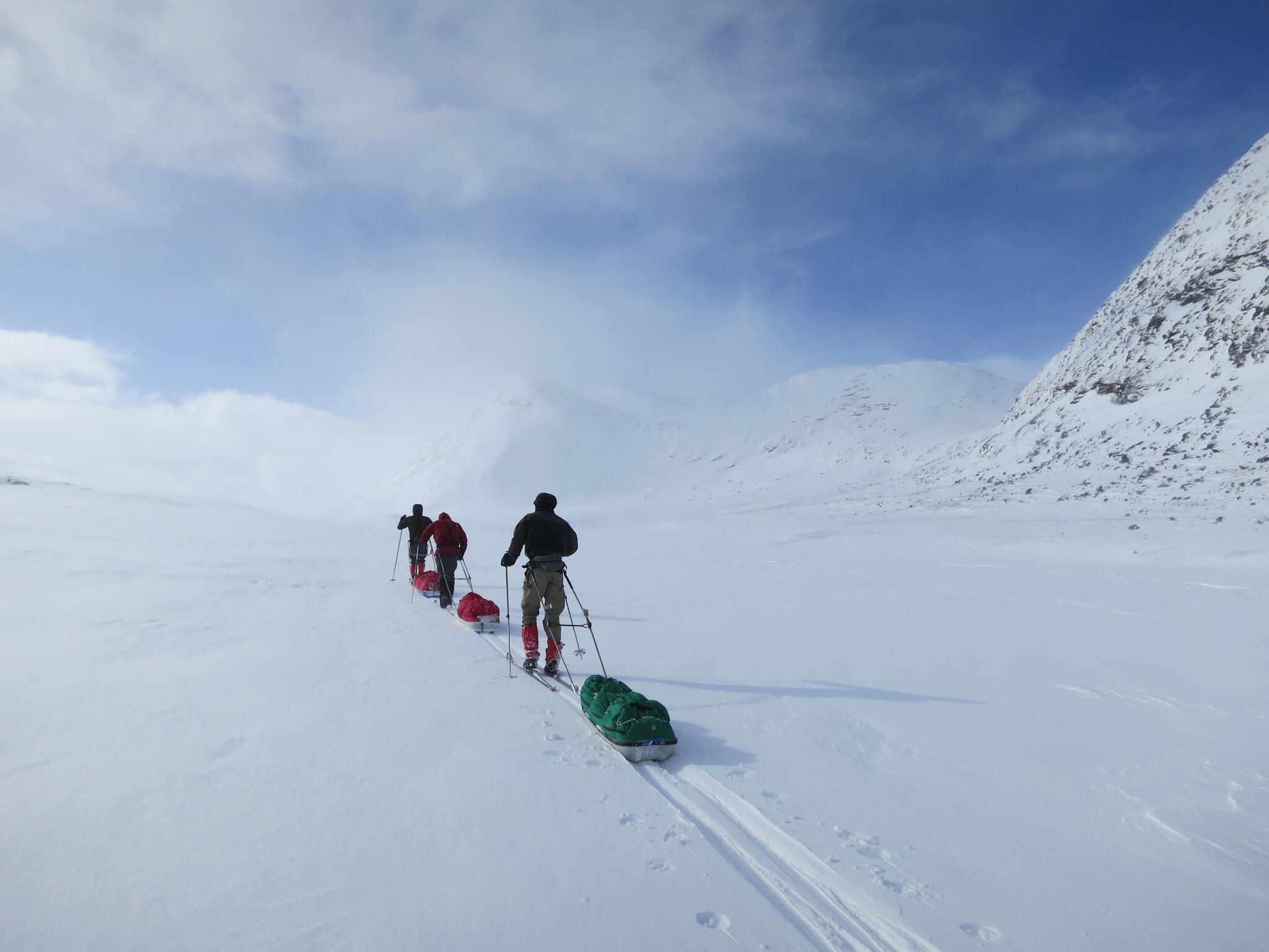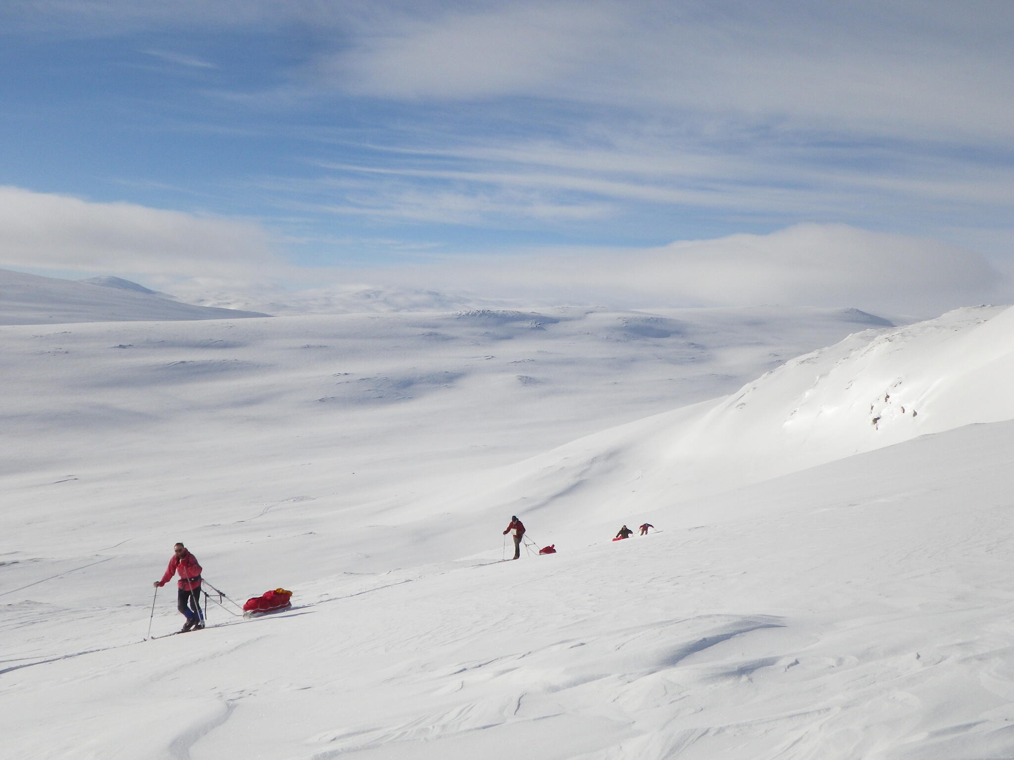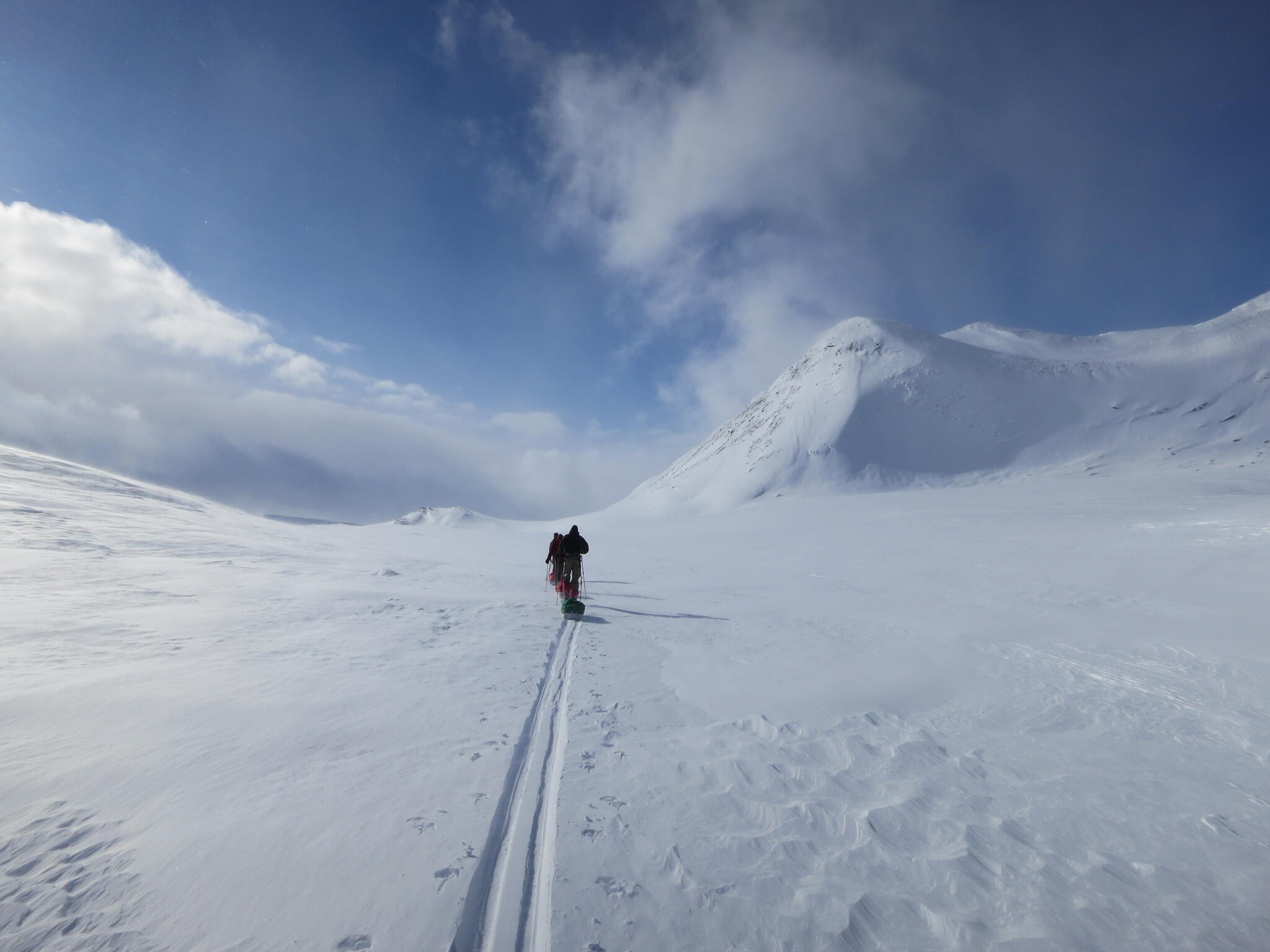 Vi började med att dra fullpackade pulkor uppför Prinskullen vid Kvikkjokk i djupsnö. Ibland fick vi dra dem över omkullvälta träd. Det var en lite väl tung start.