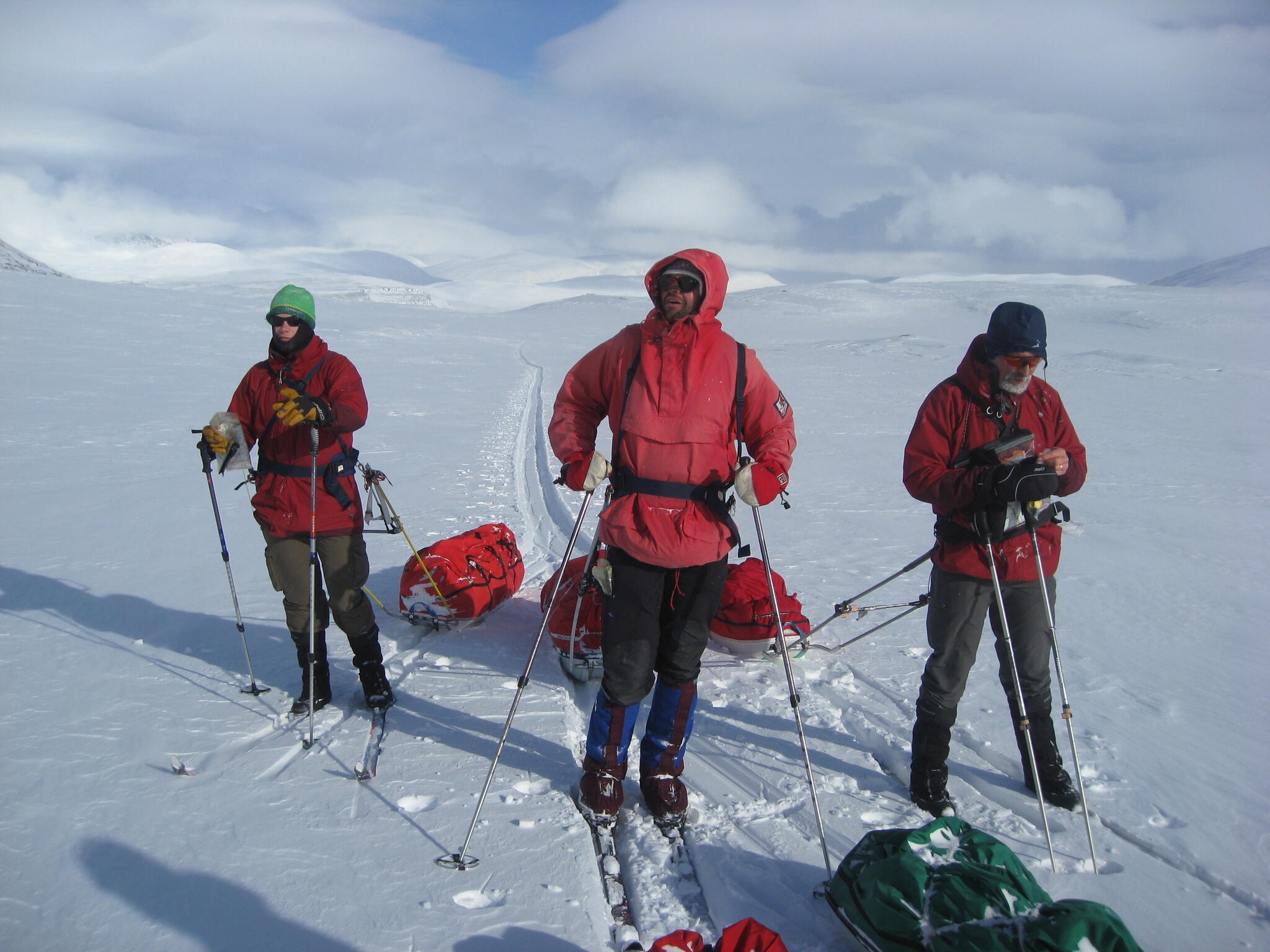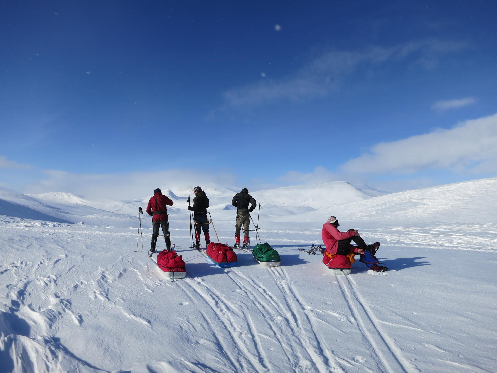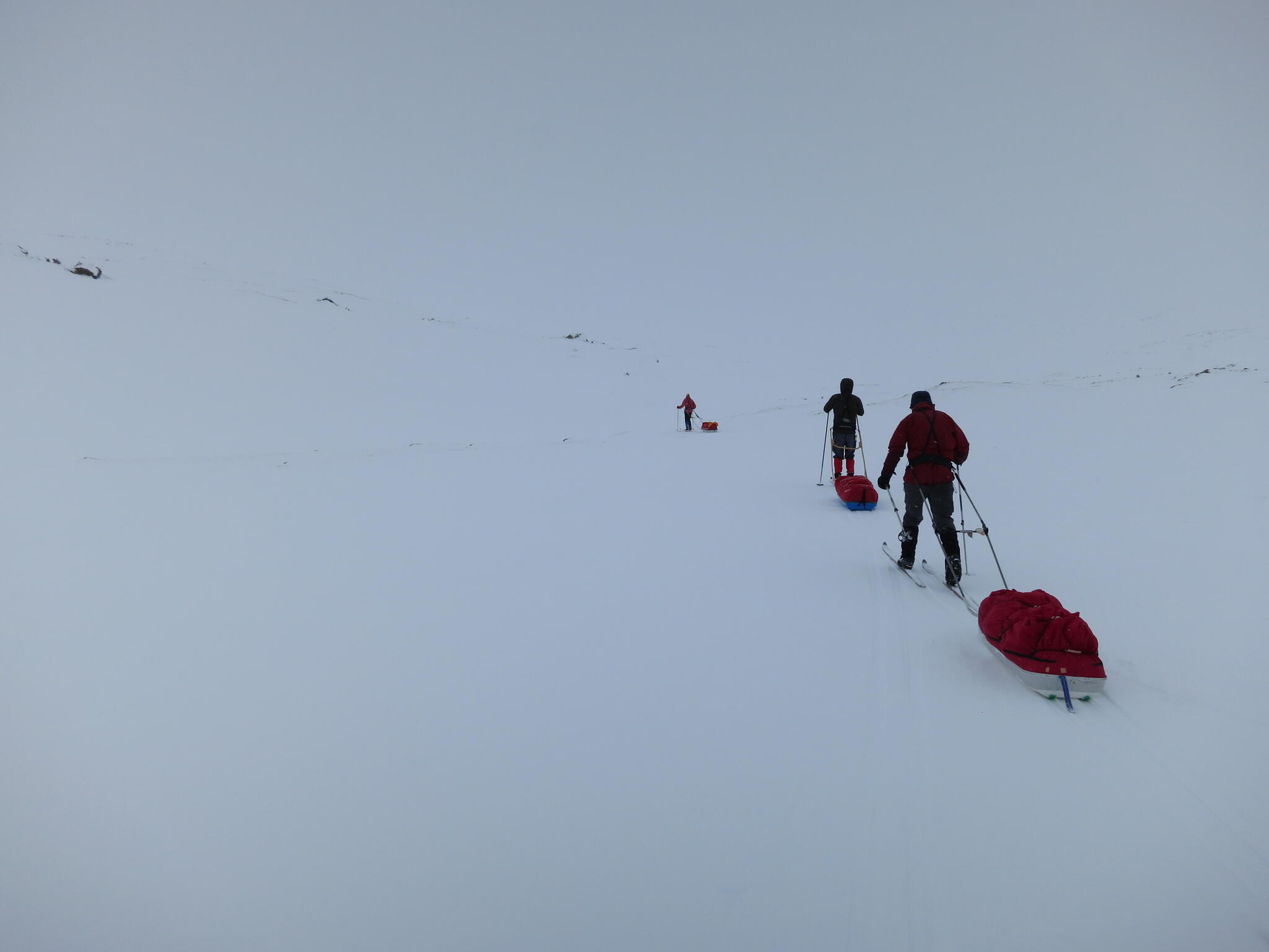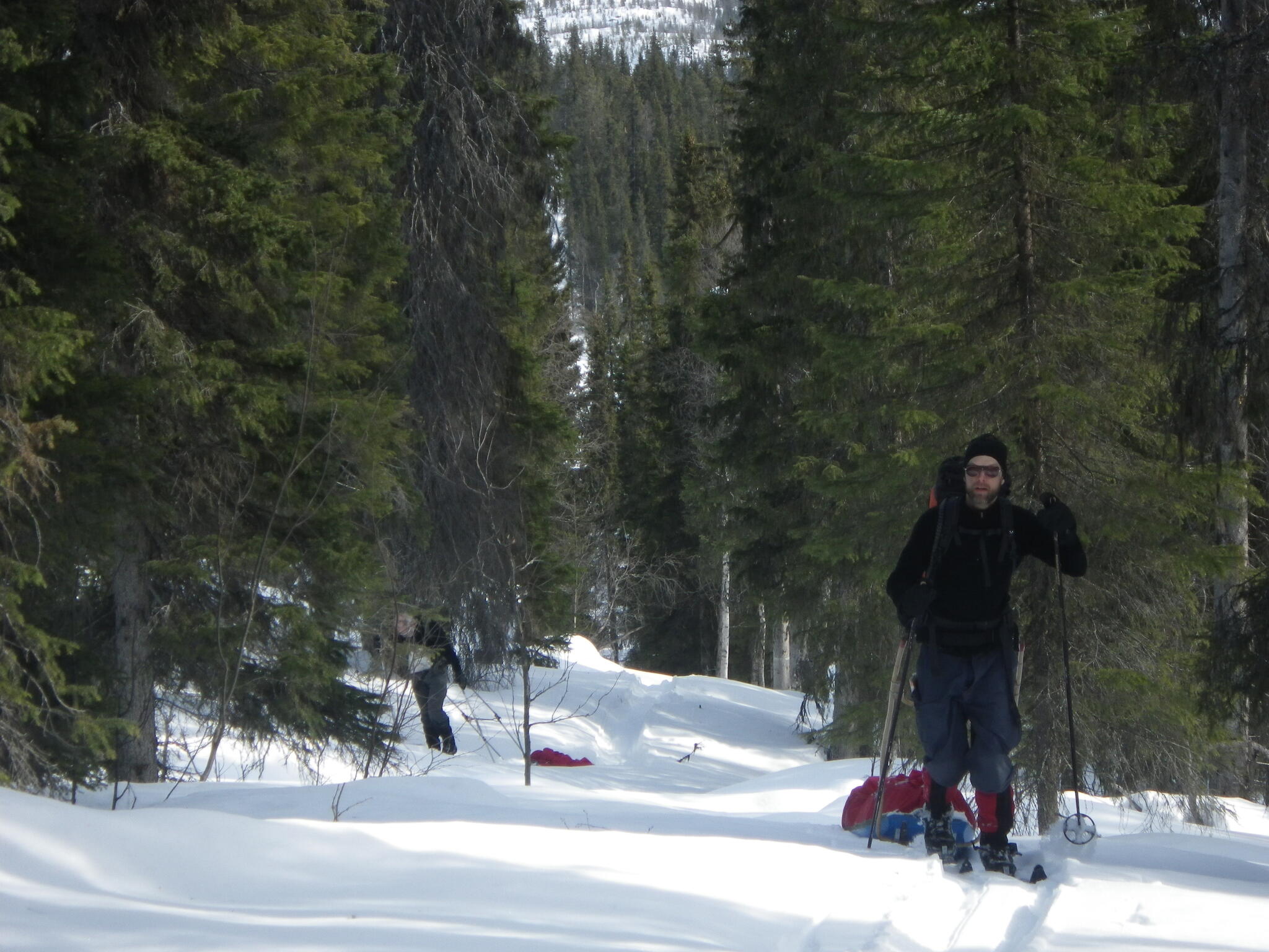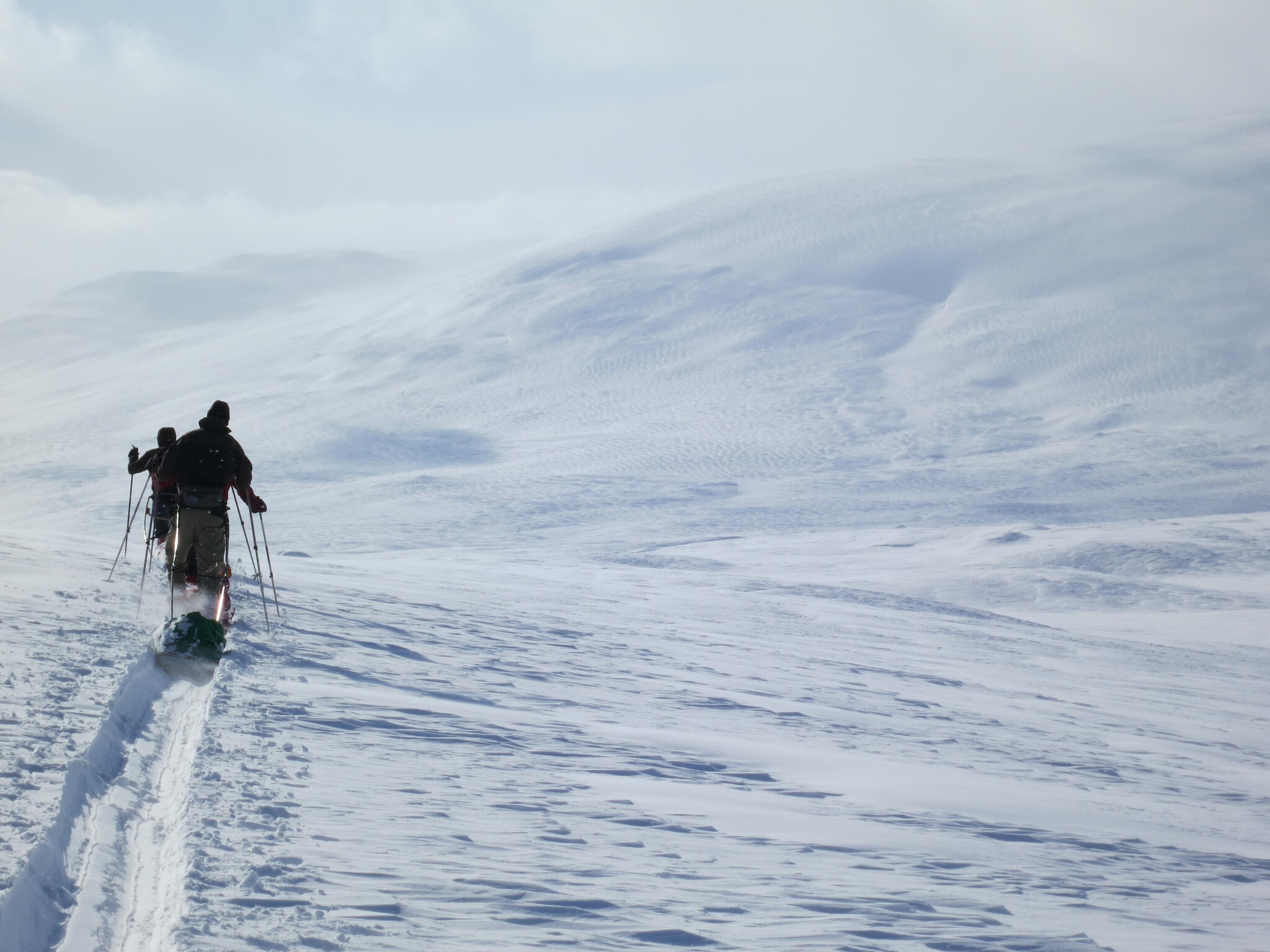 Vi började med att dra fullpackade pulkor uppför Prinskullen vid Kvikkjokk i djupsnö. Ibland fick vi dra dem över omkullvälta träd. Det var en lite väl tung start.