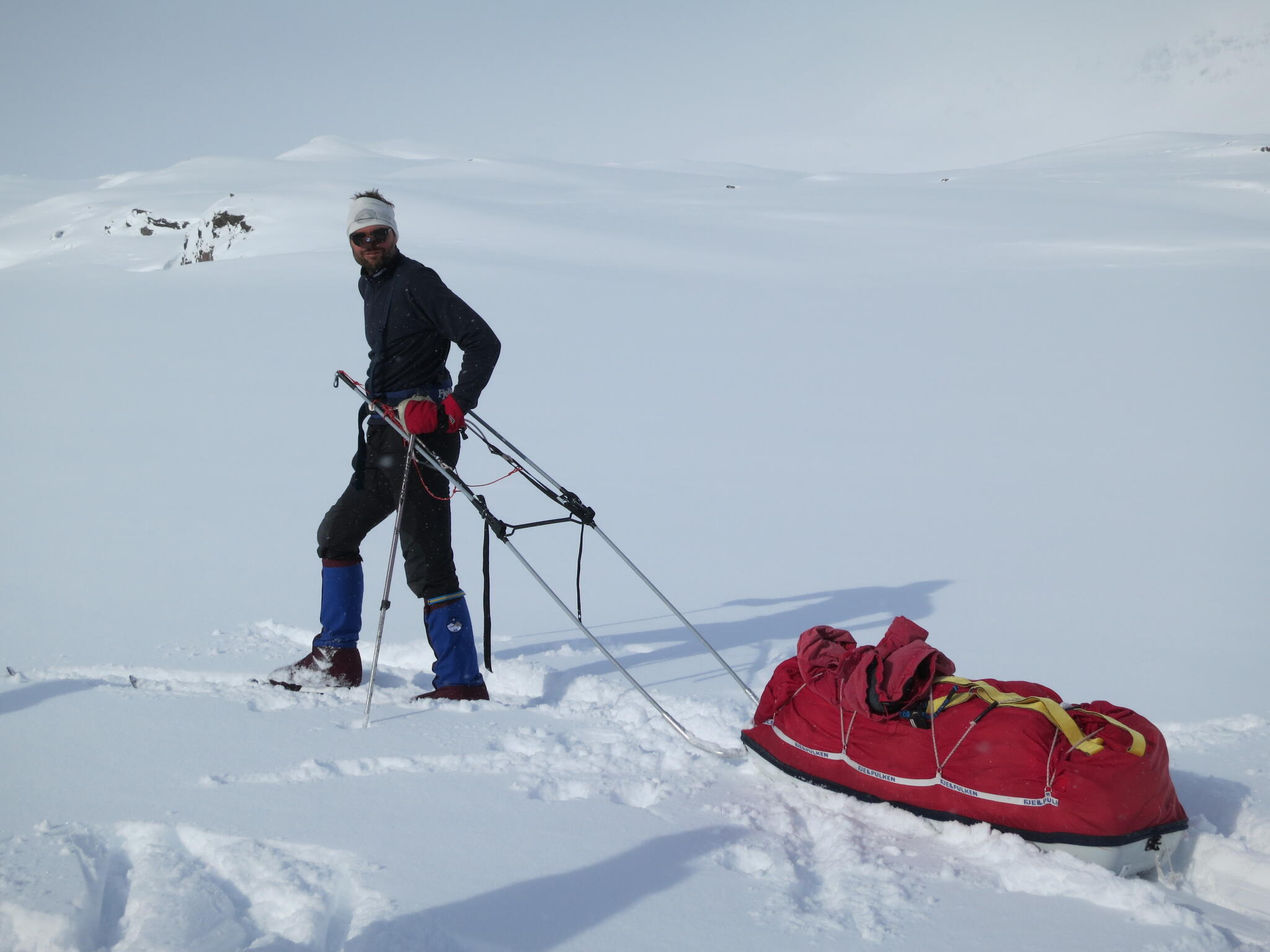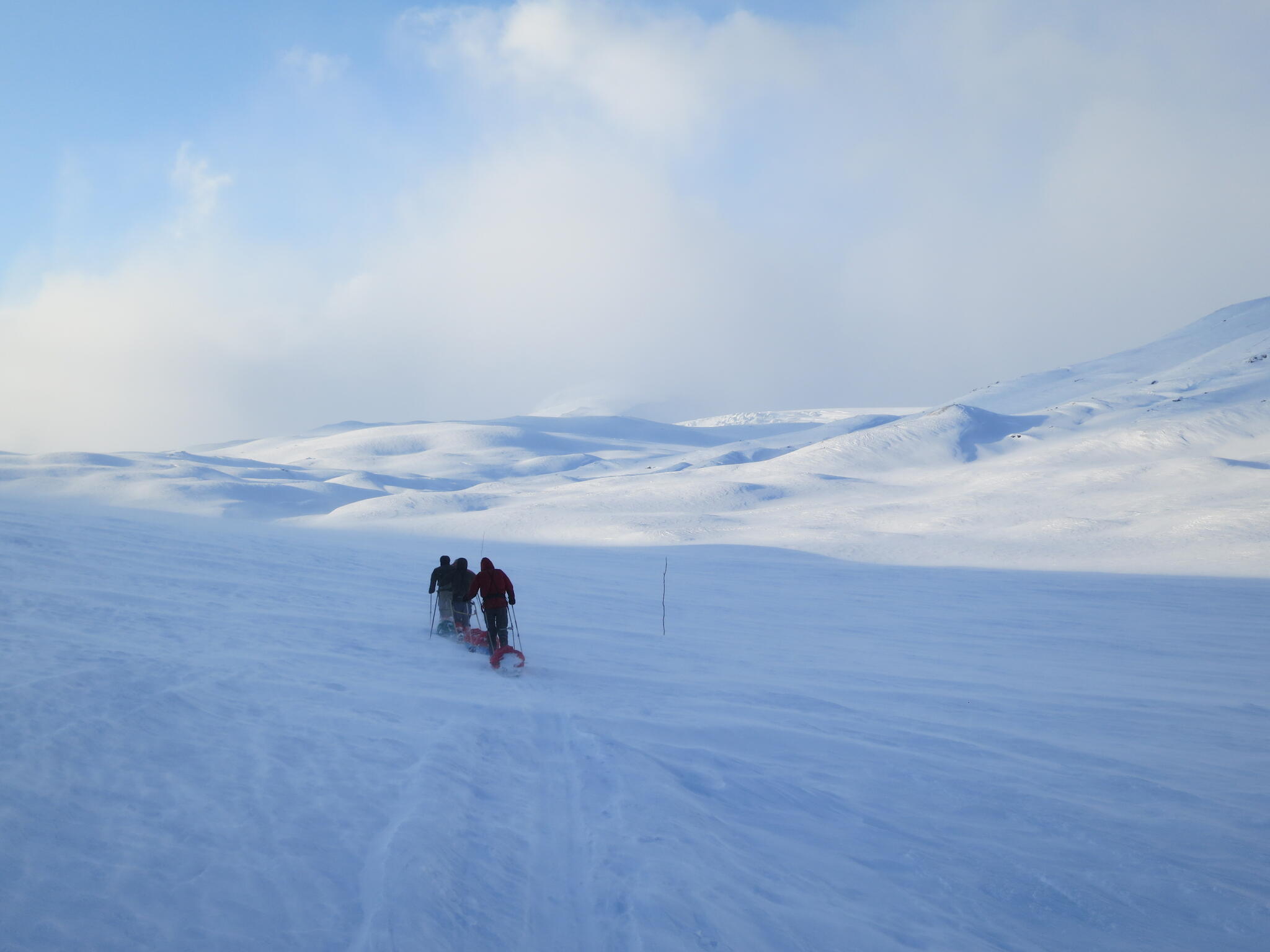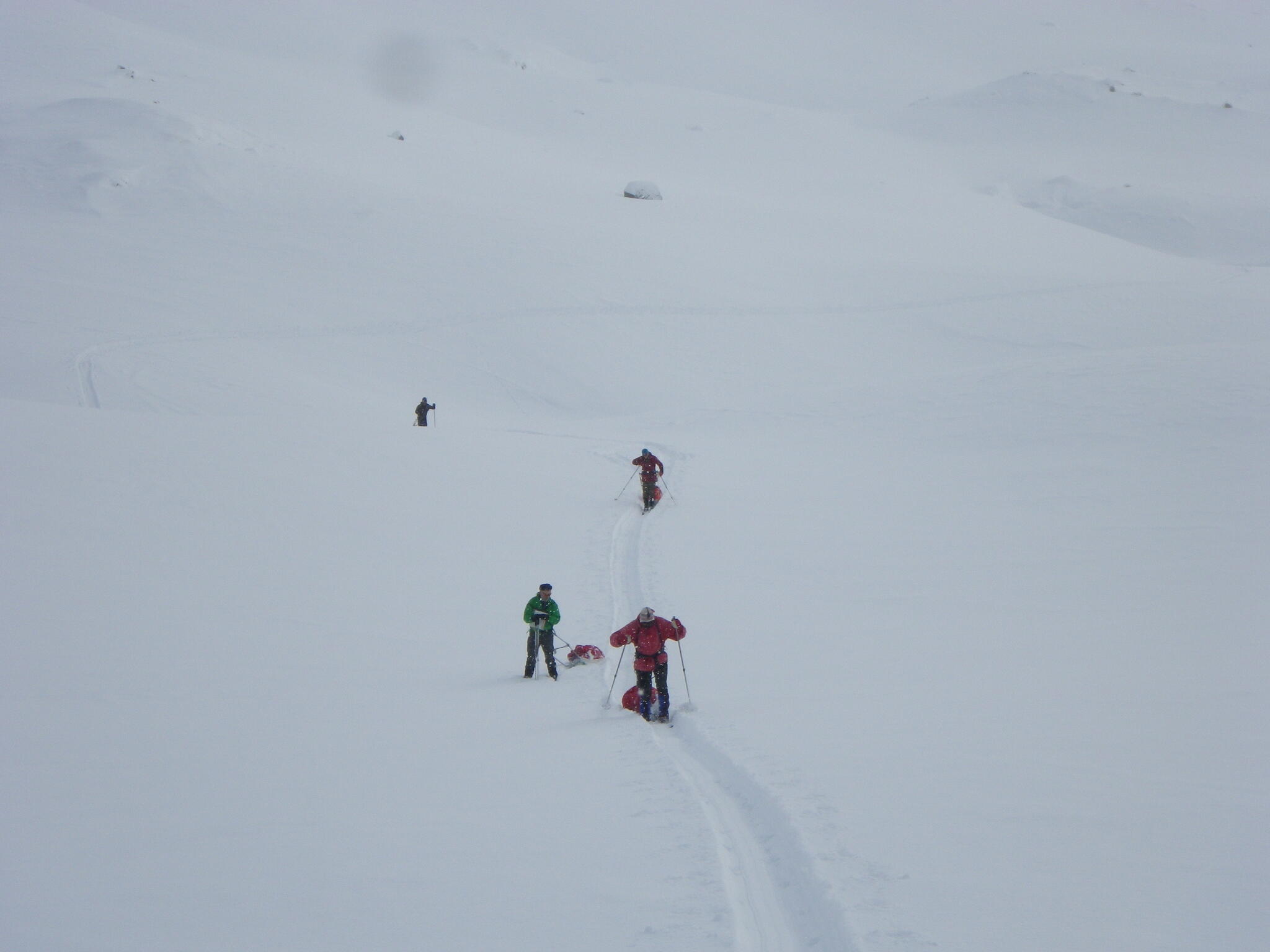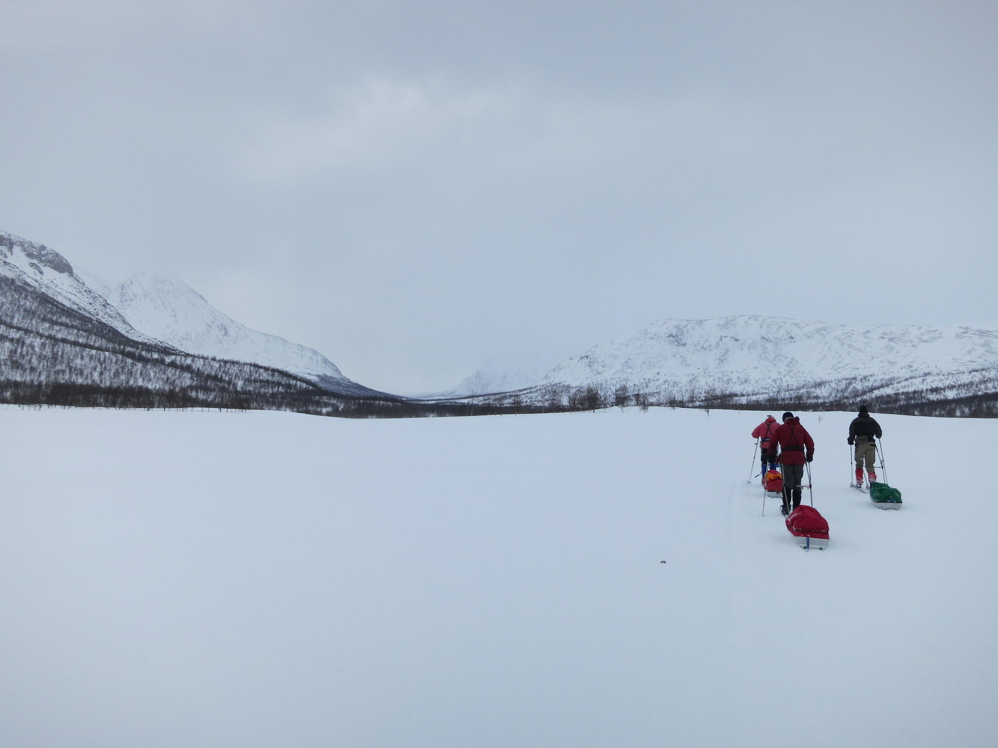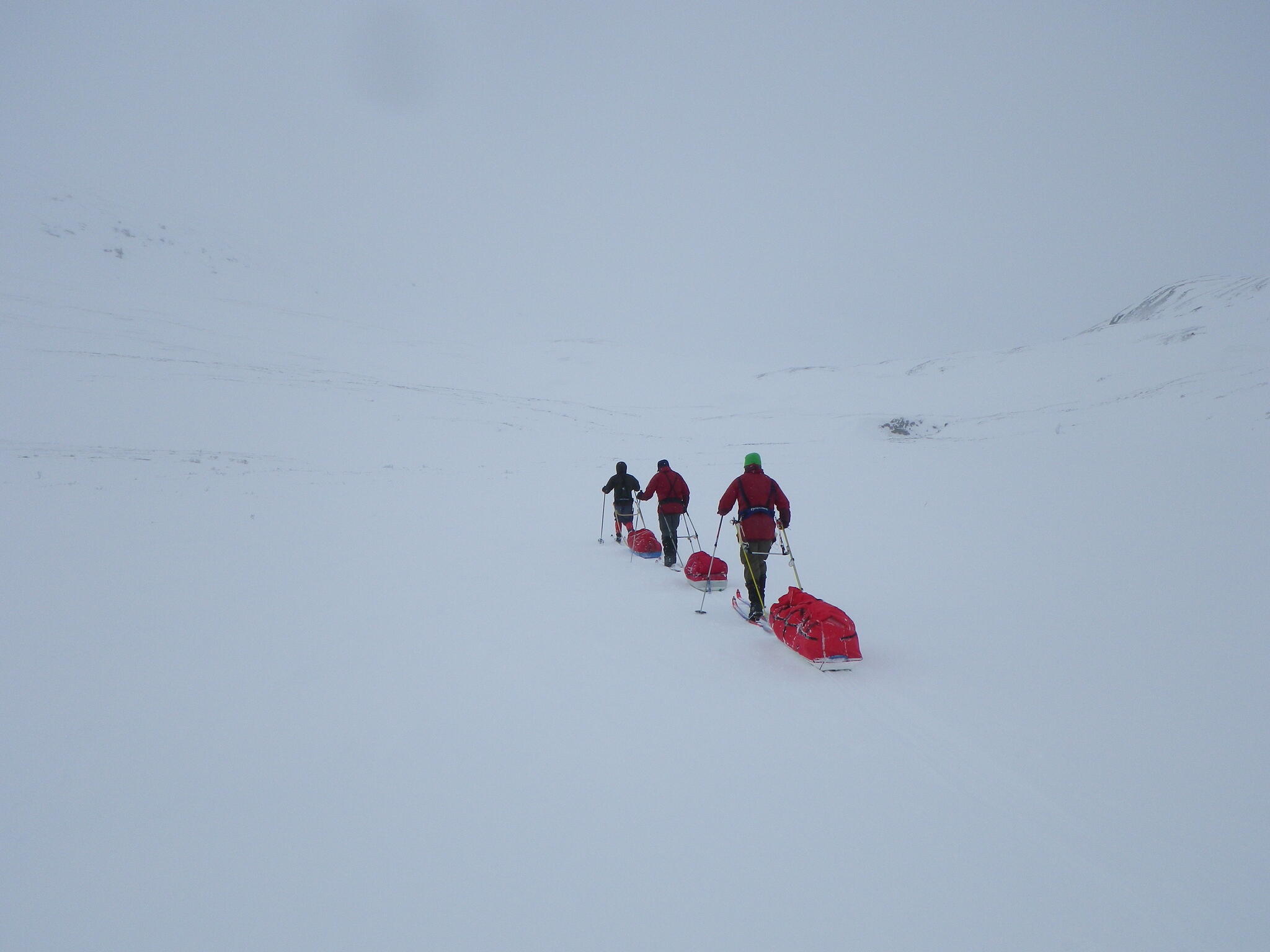 Vi började med att dra fullpackade pulkor uppför Prinskullen vid Kvikkjokk i djupsnö. Ibland fick vi dra dem över omkullvälta träd. Det var en lite väl tung start.
