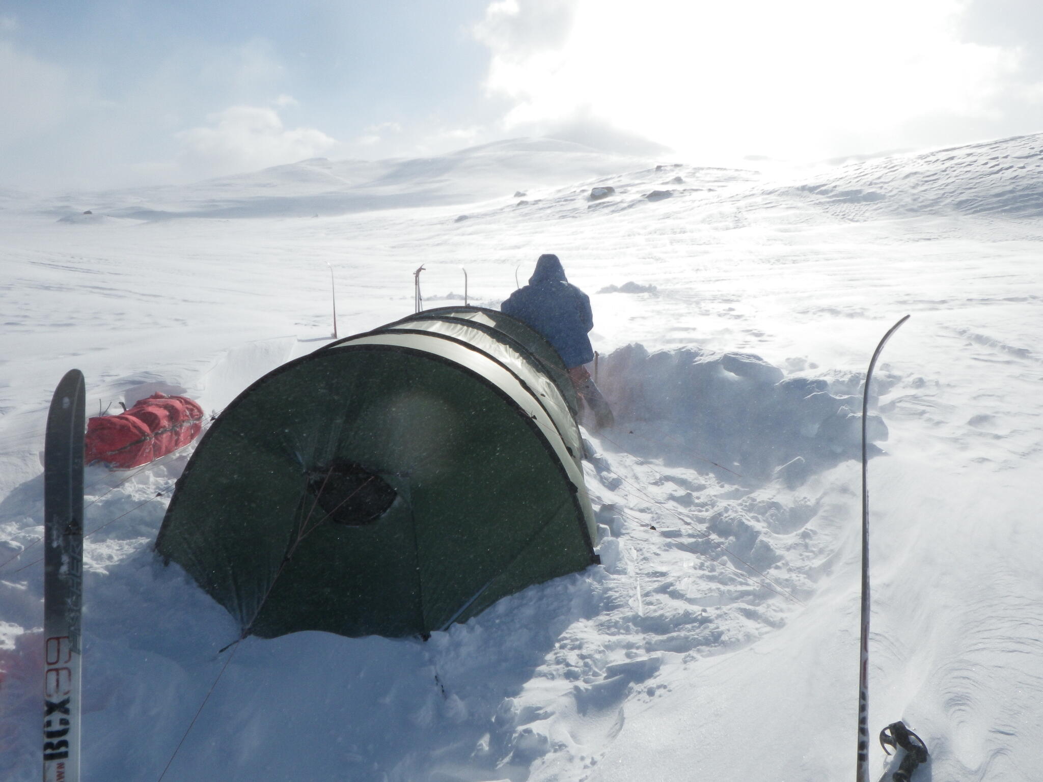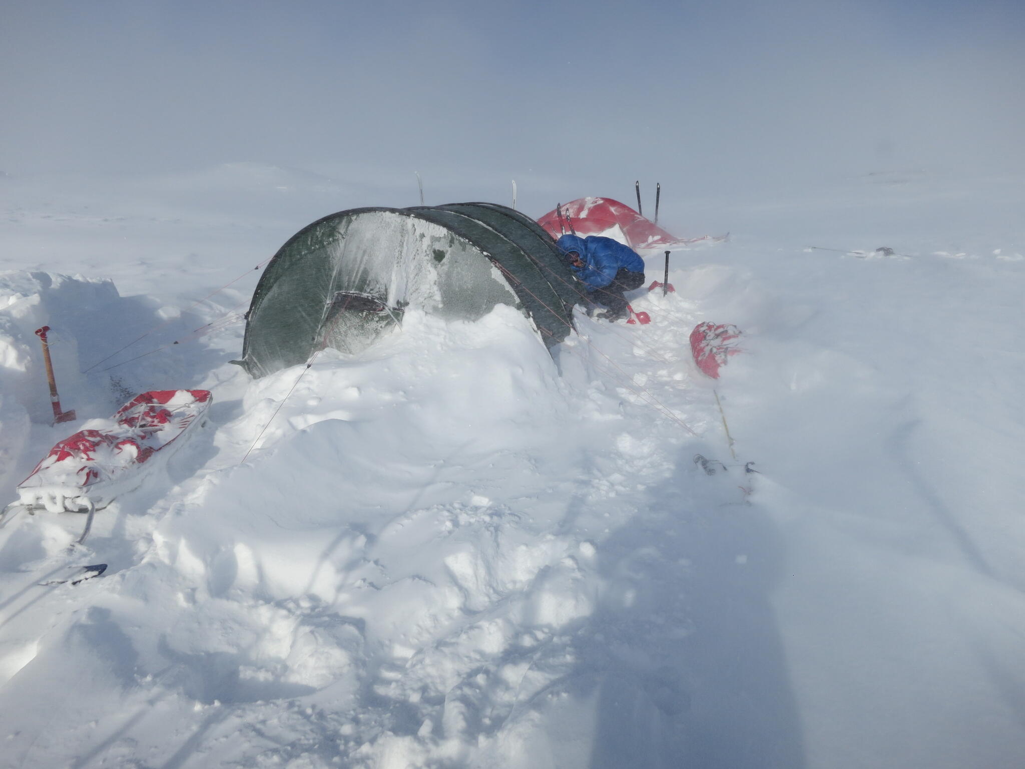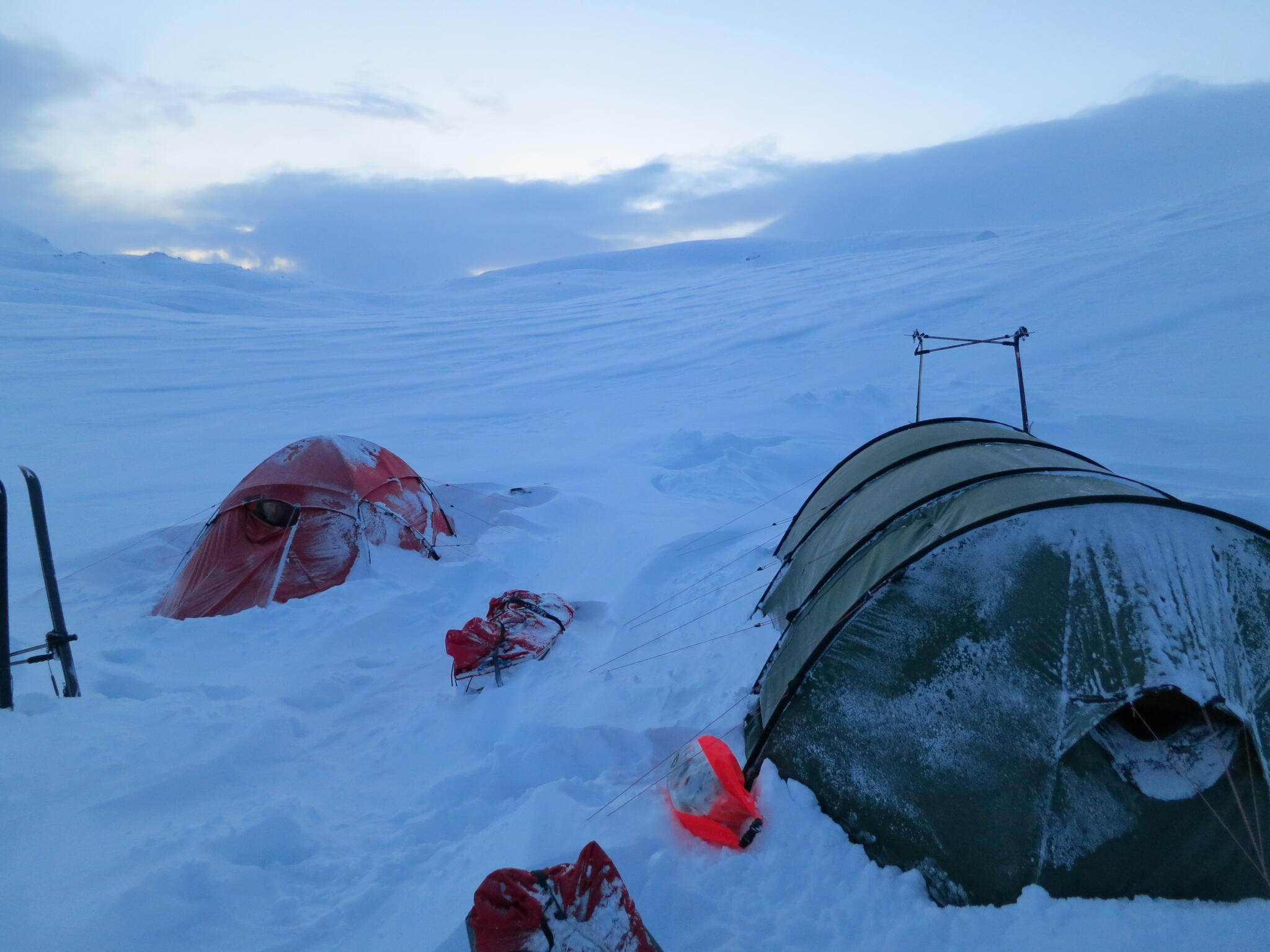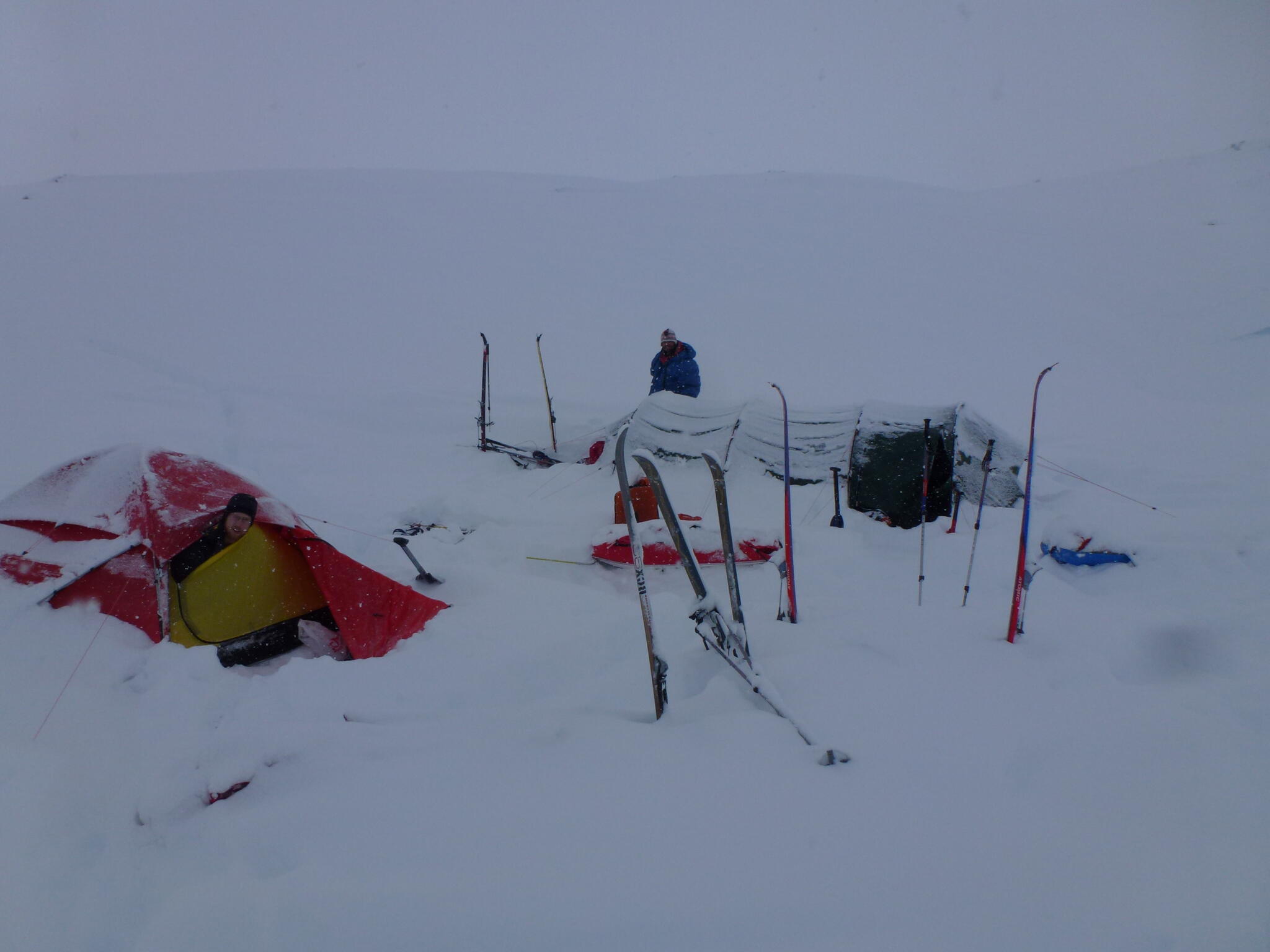 Vi slog läger strax söder om Sulitelma-massivet. Vi hade förhoppning om att kunna göra topptur på Suliskongen från det hållet, via glaciären. Om det bara inte skulle snöa och blåsa så mycket.