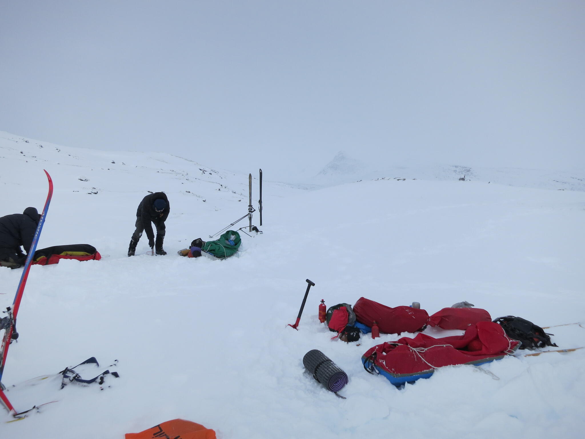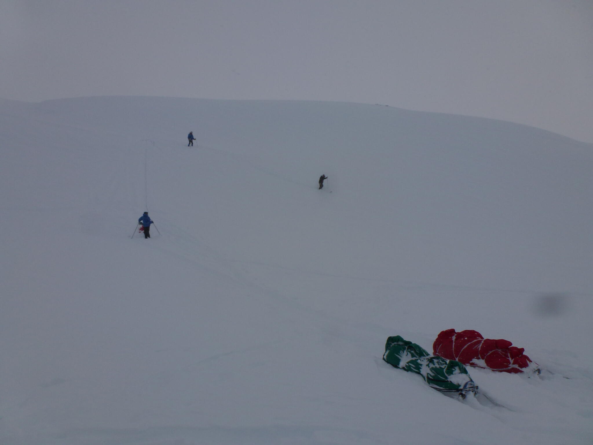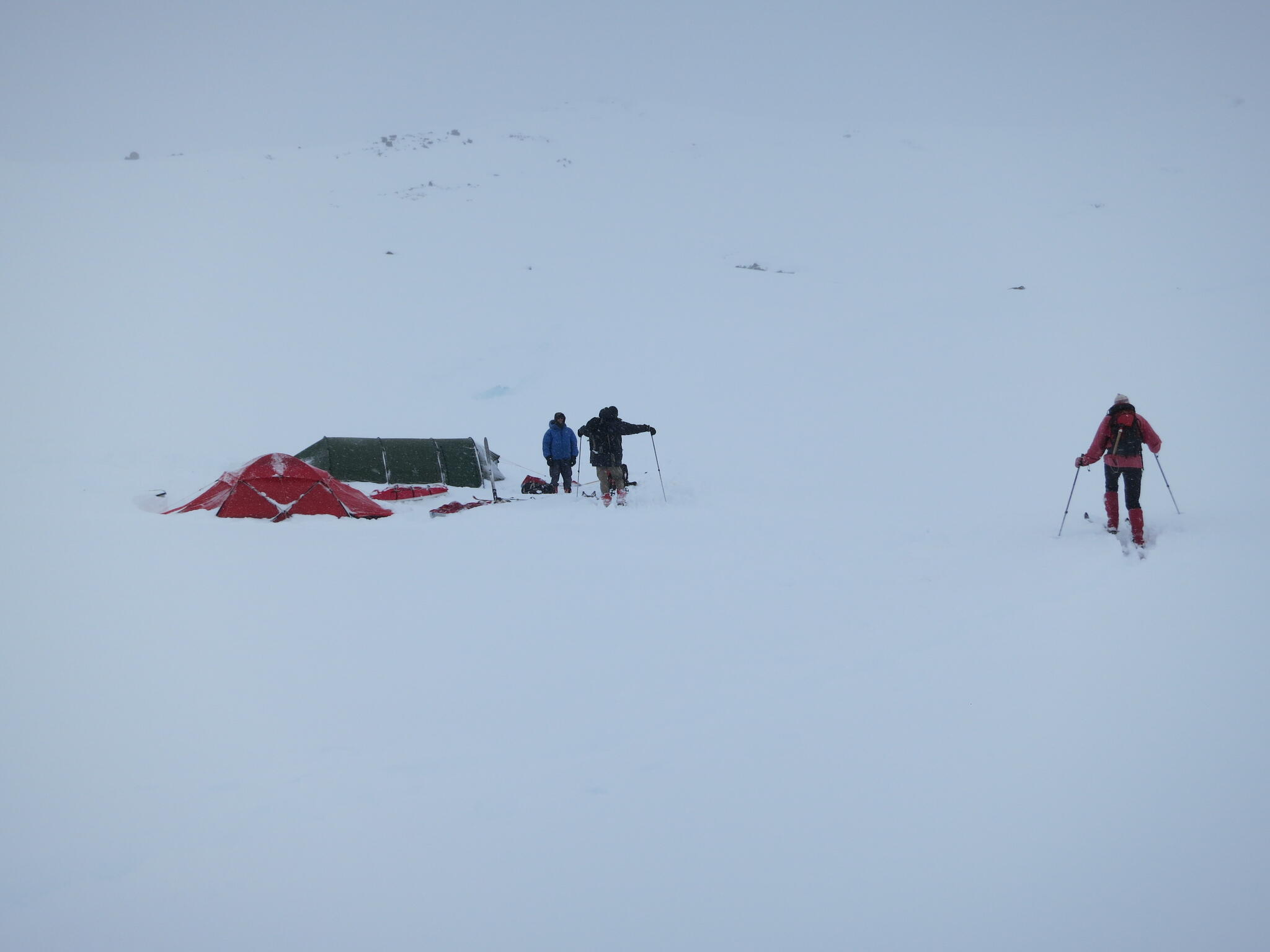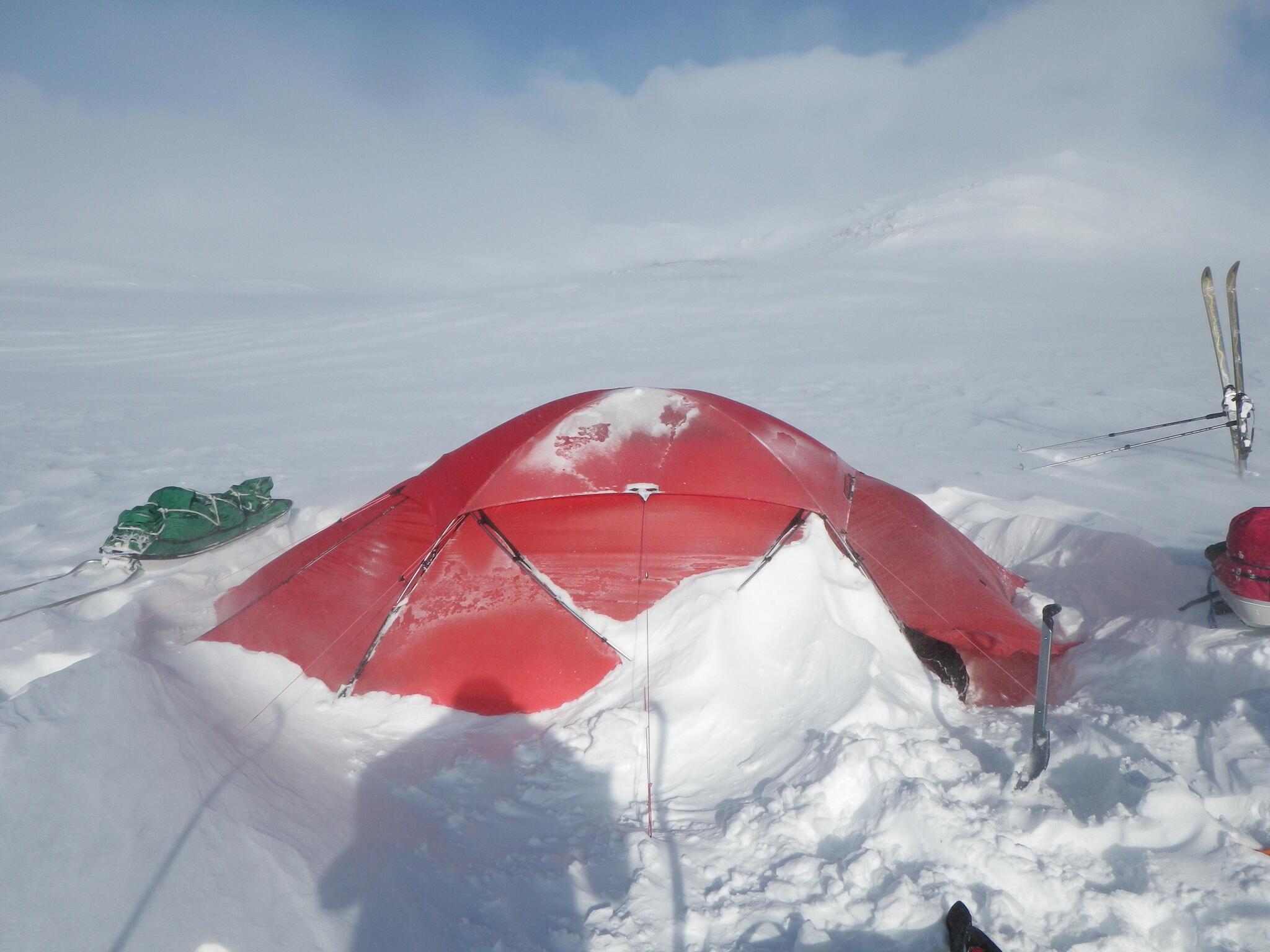 Vi slog läger strax söder om Sulitelma-massivet. Vi hade förhoppning om att kunna göra topptur på Suliskongen från det hållet, via glaciären. Om det bara inte skulle snöa och blåsa så mycket.