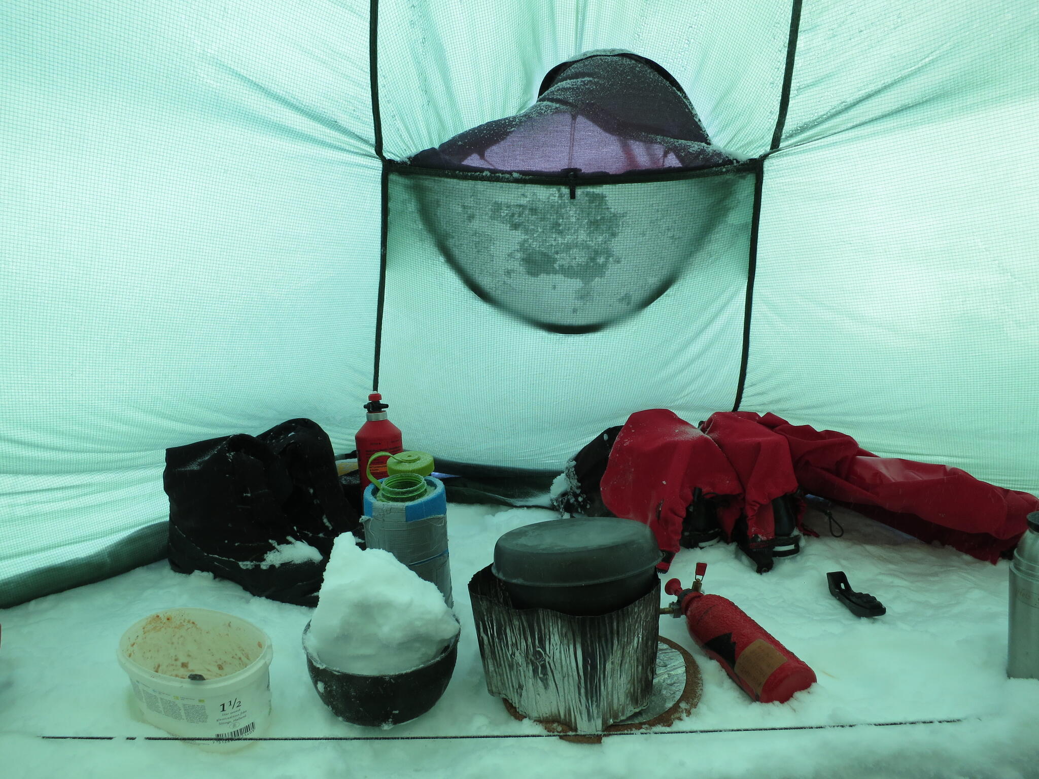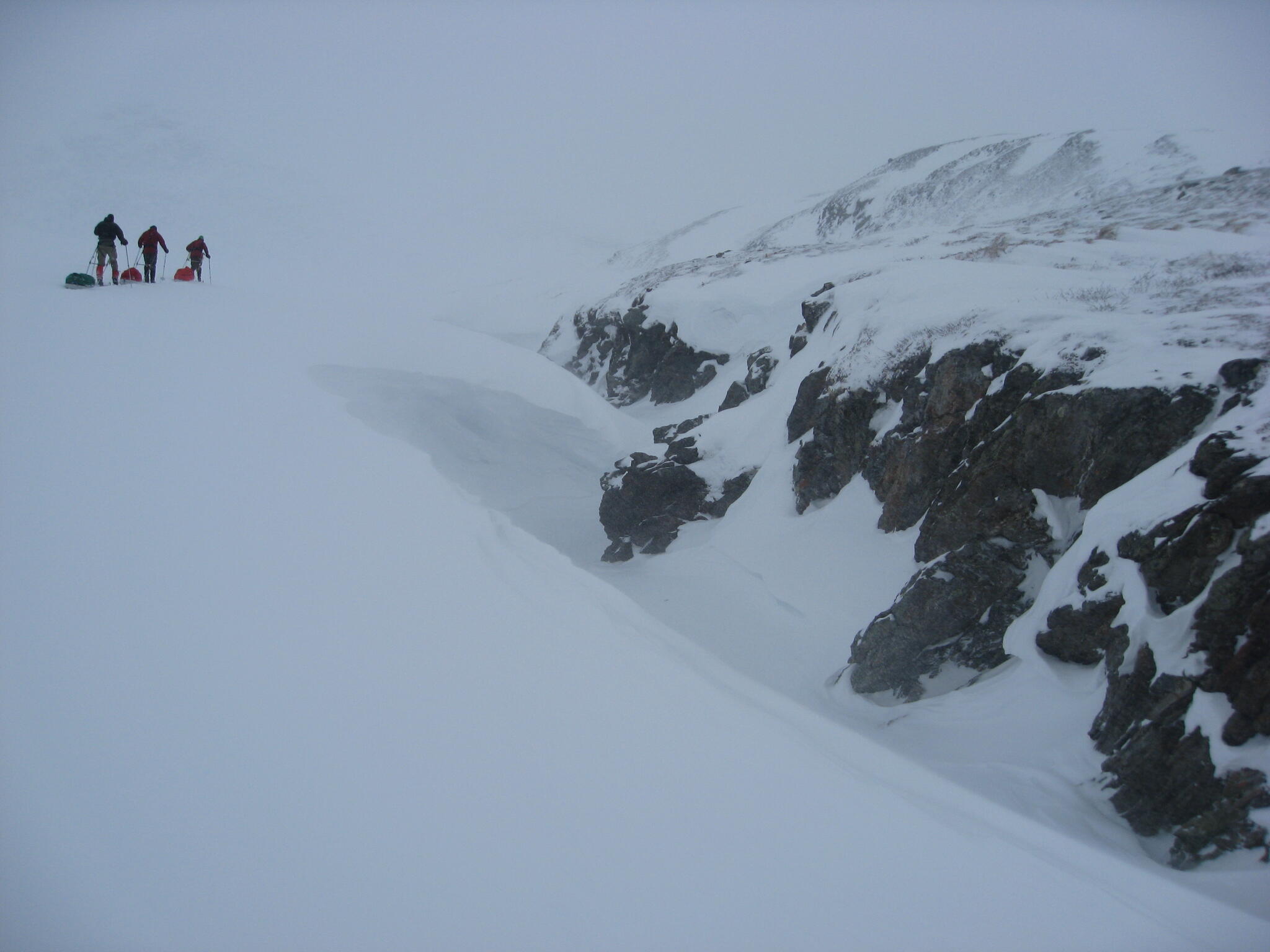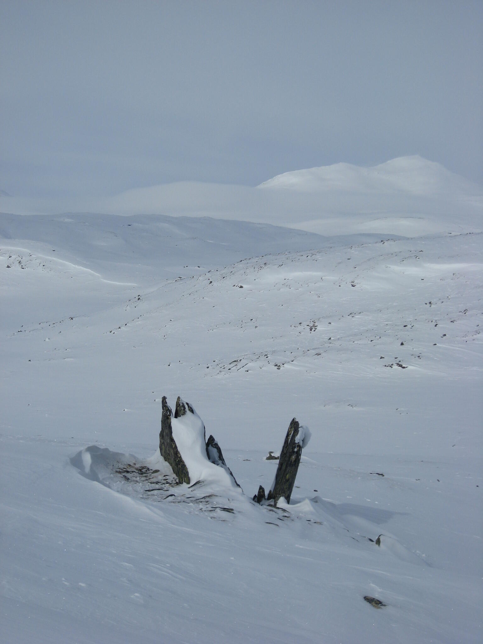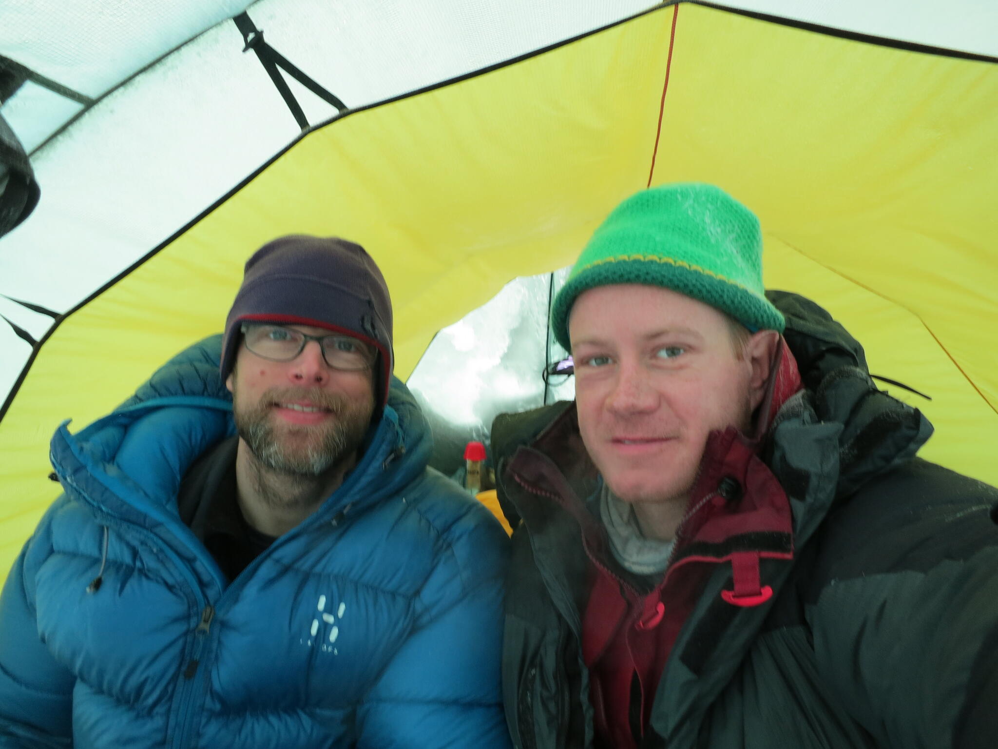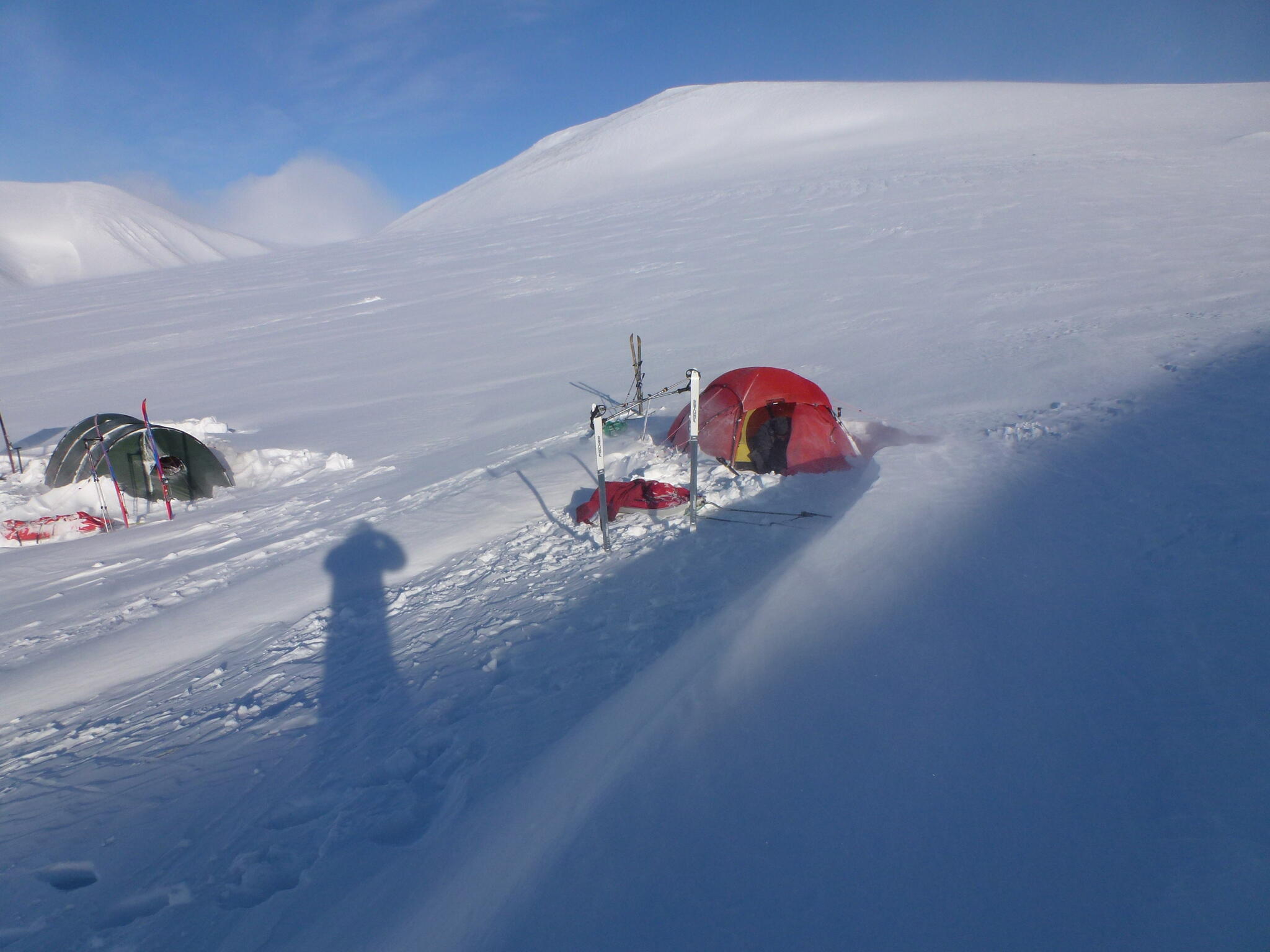 Vi slog läger strax söder om Sulitelma-massivet. Vi hade förhoppning om att kunna göra topptur på Suliskongen från det hållet, via glaciären. Om det bara inte skulle snöa och blåsa så mycket.