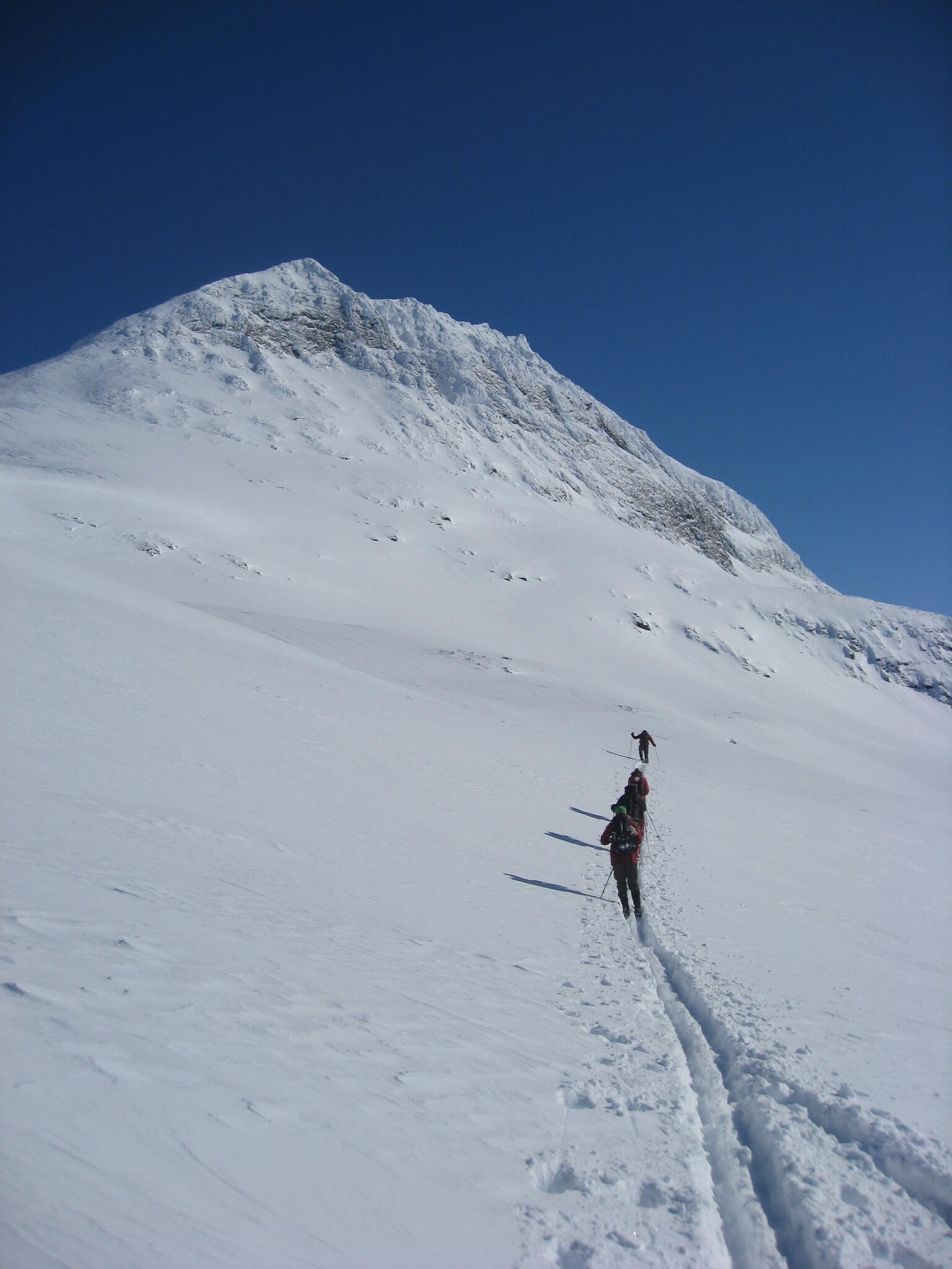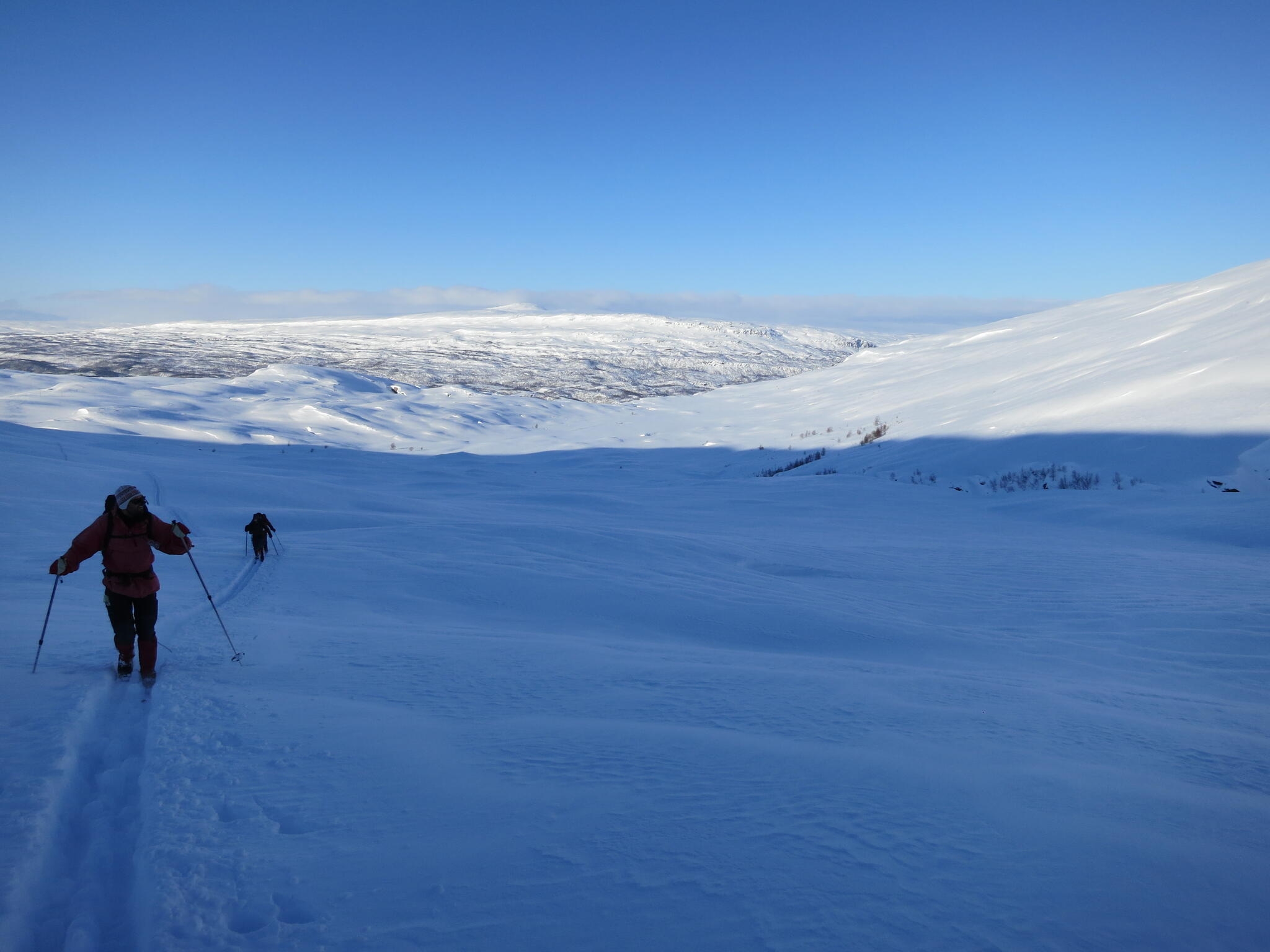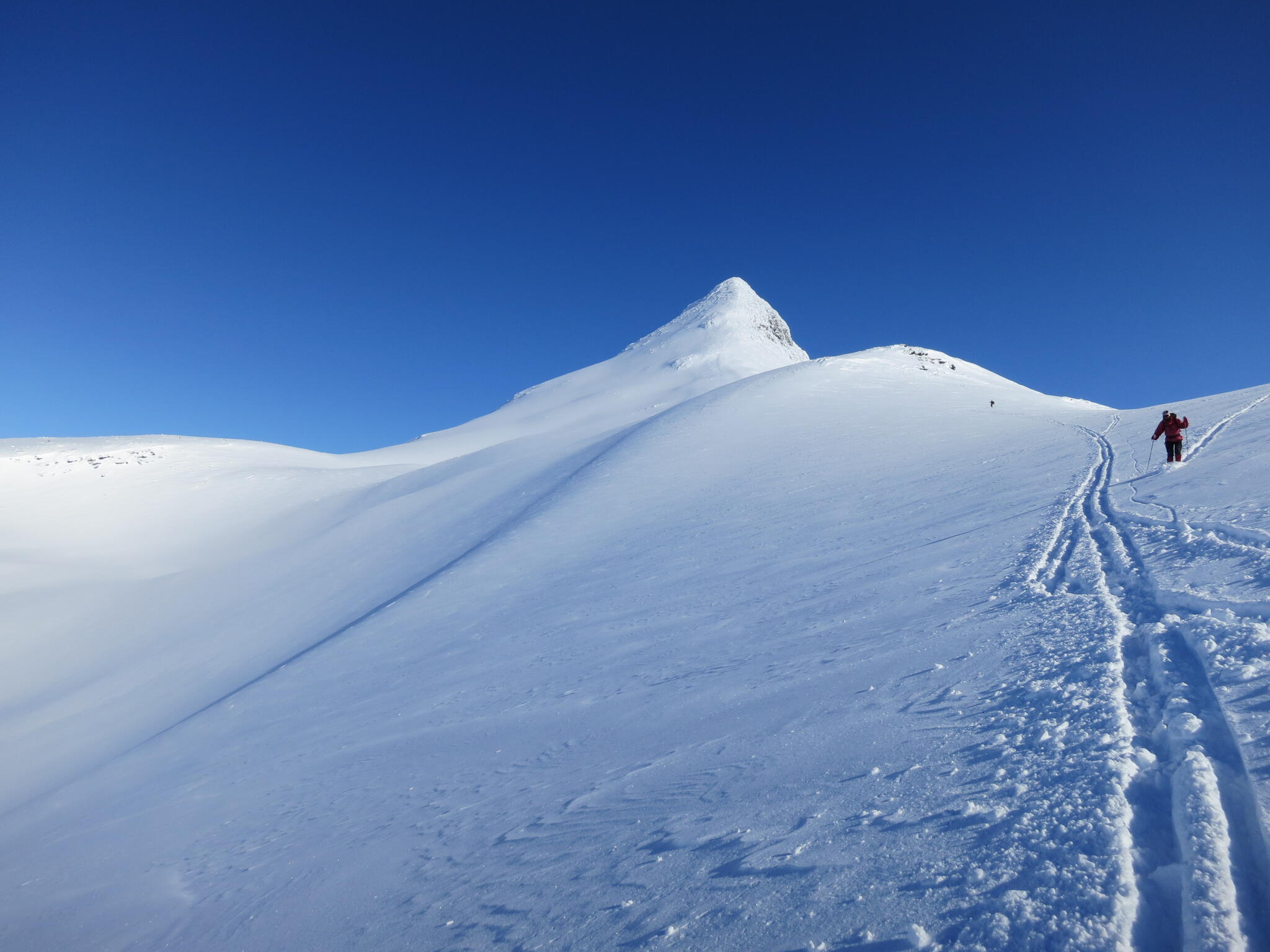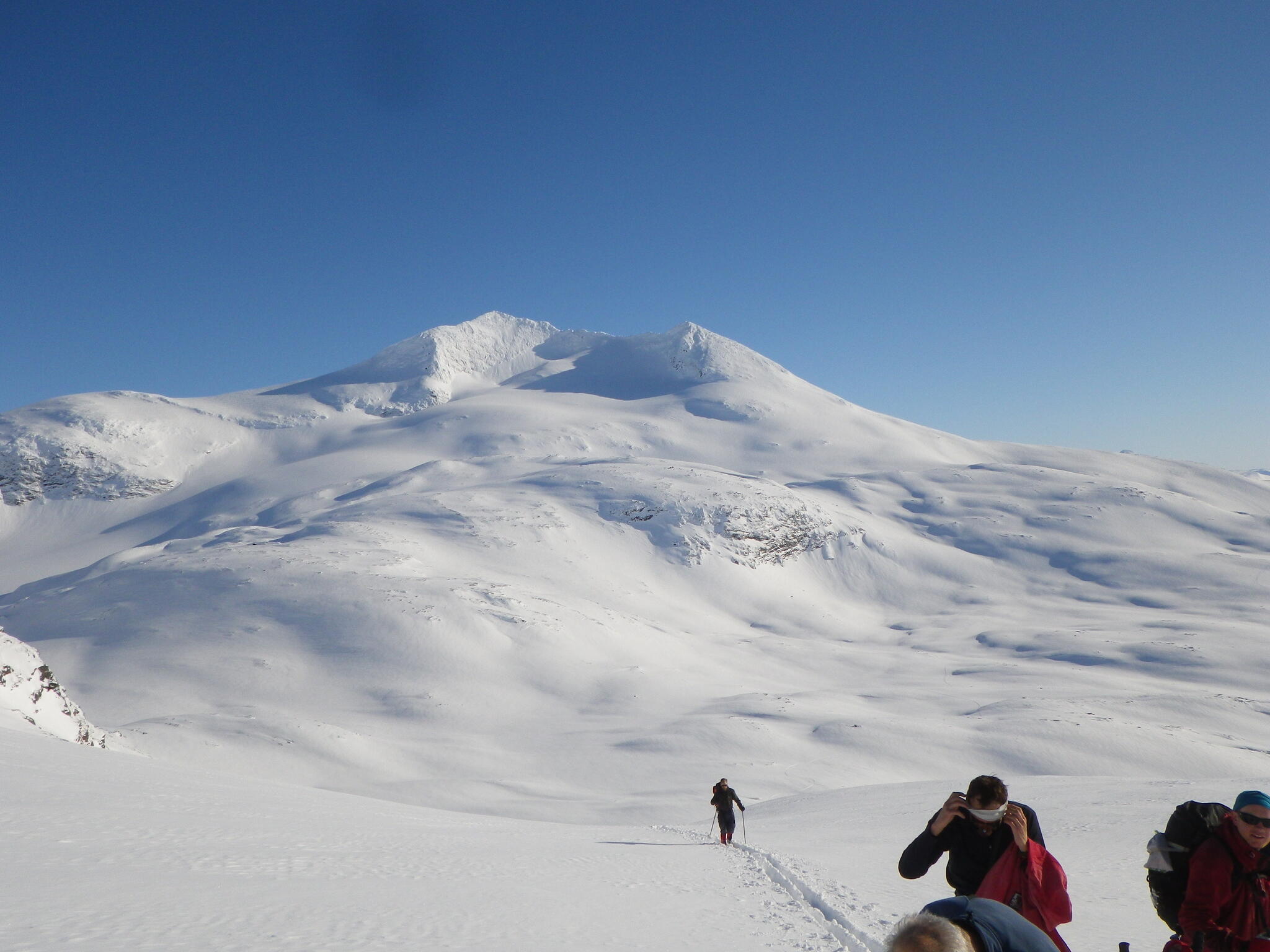 Denna dag var vi verkligen taggade på en topptur. Fint väder: vindstilla, sol och massor av pudersnö. Vi siktade in oss på den höga toppen Suliskongen.