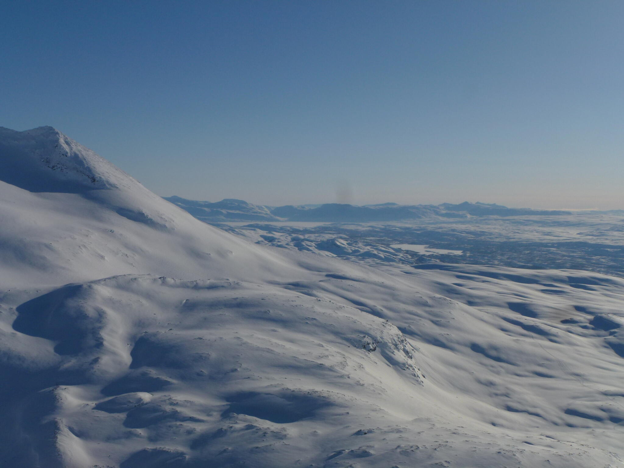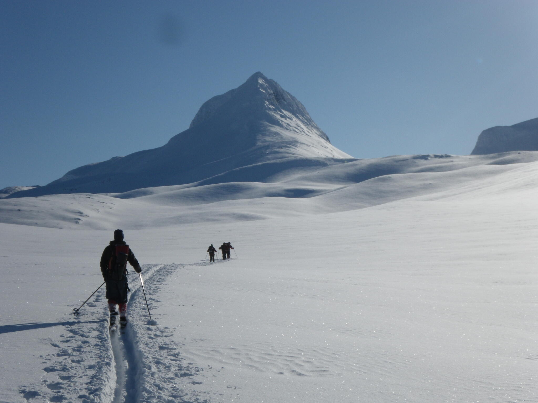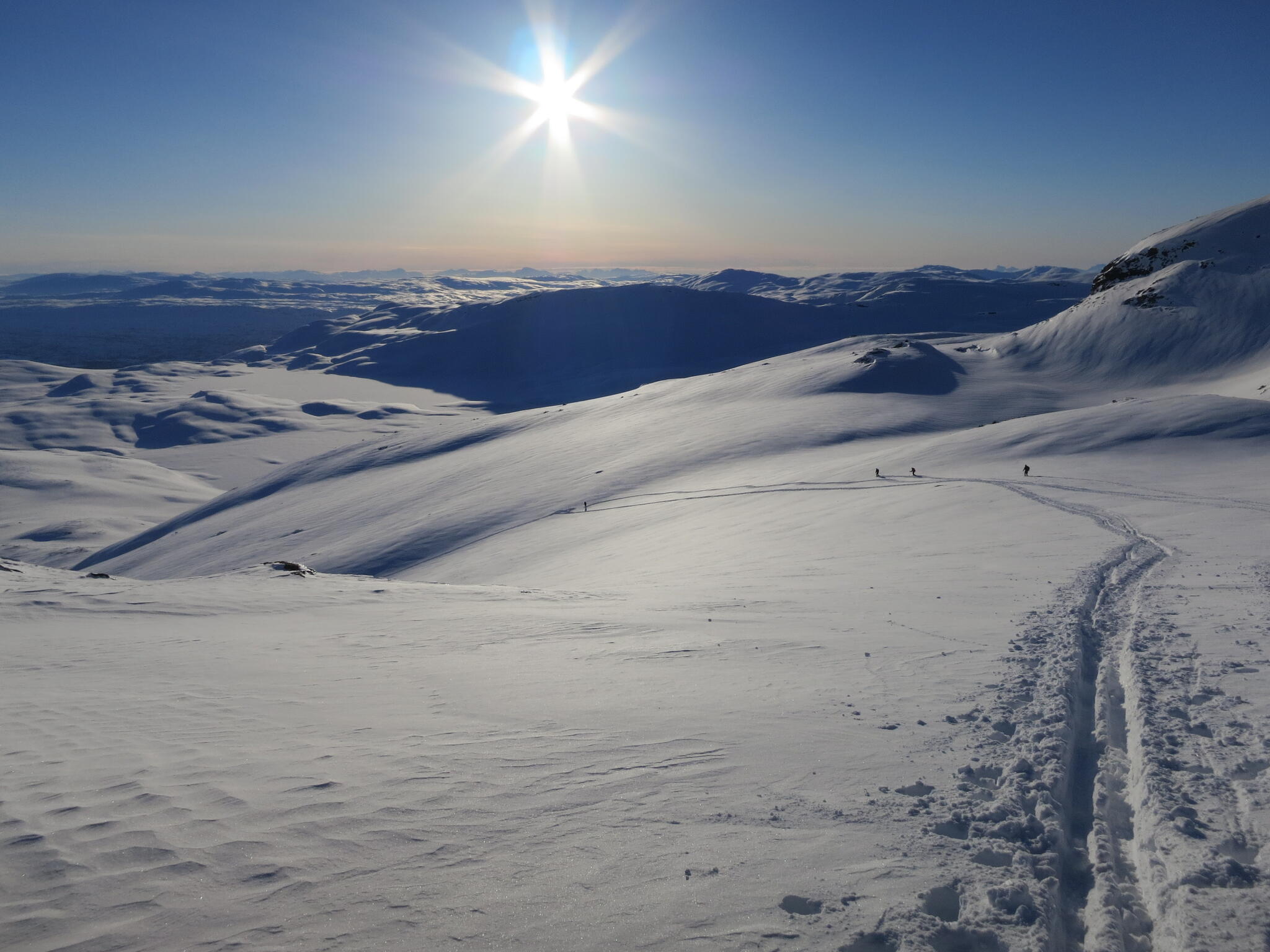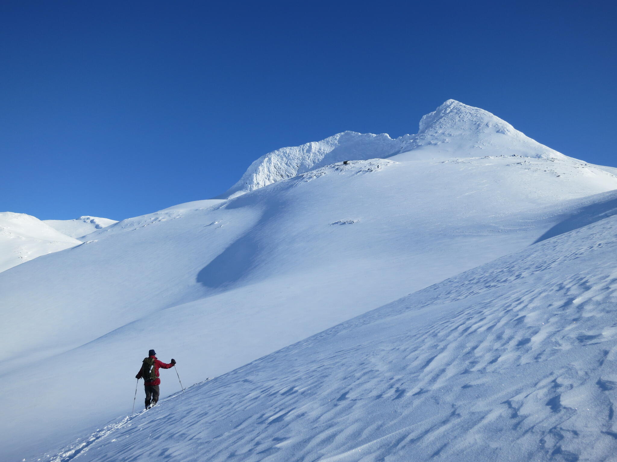 Denna dag var vi verkligen taggade på en topptur. Fint väder: vindstilla, sol och massor av pudersnö. Vi siktade in oss på den höga toppen Suliskongen.