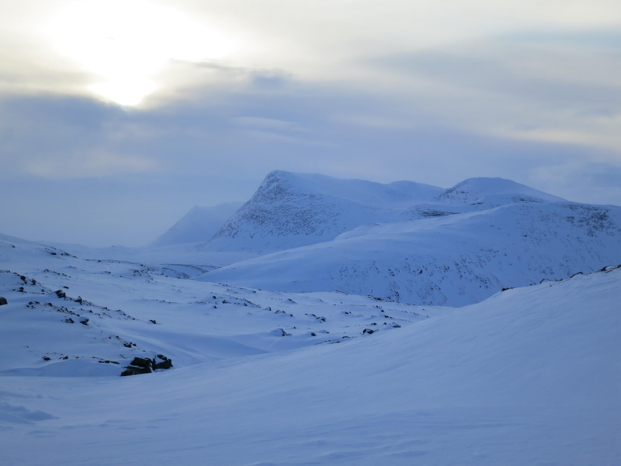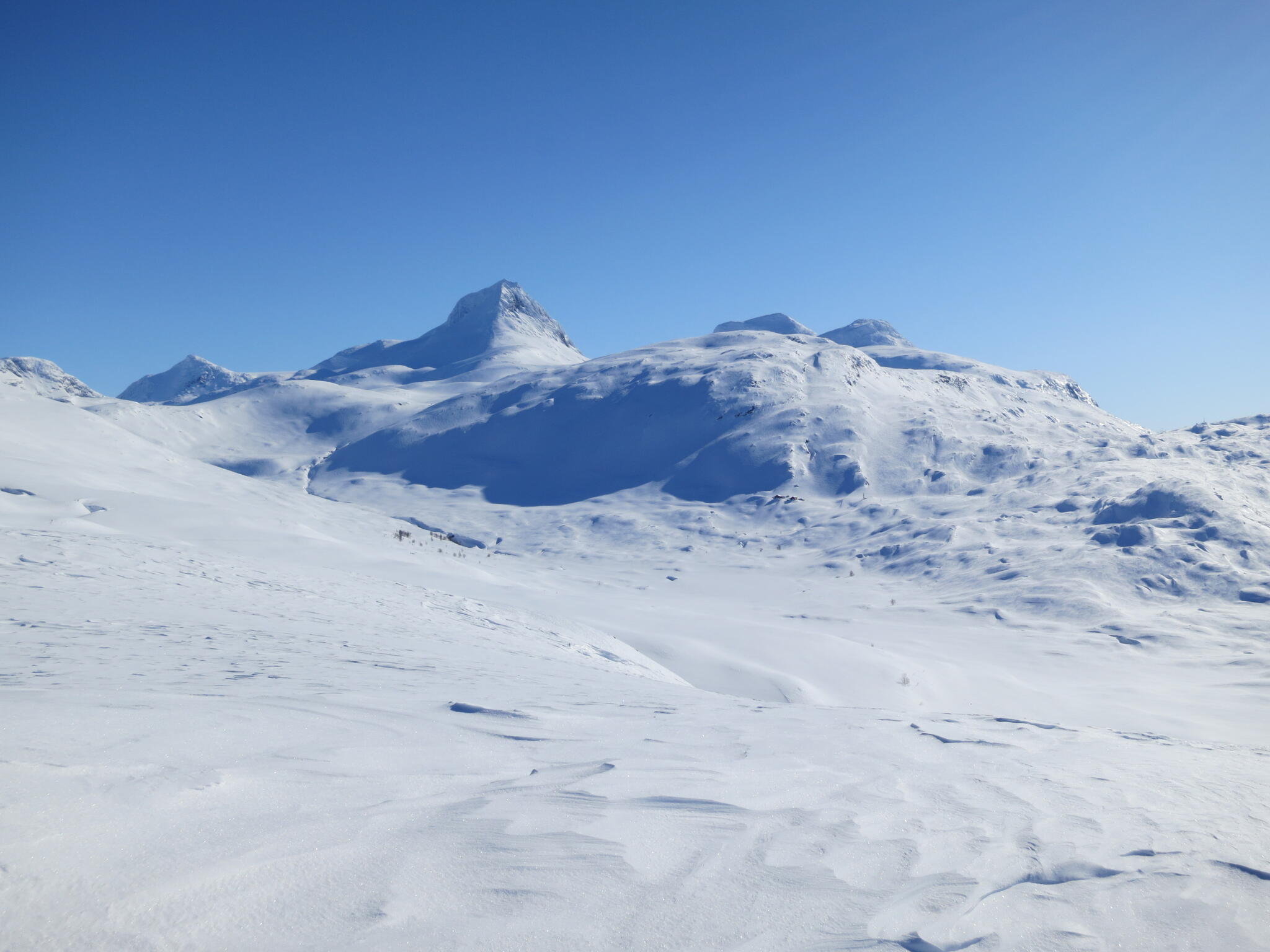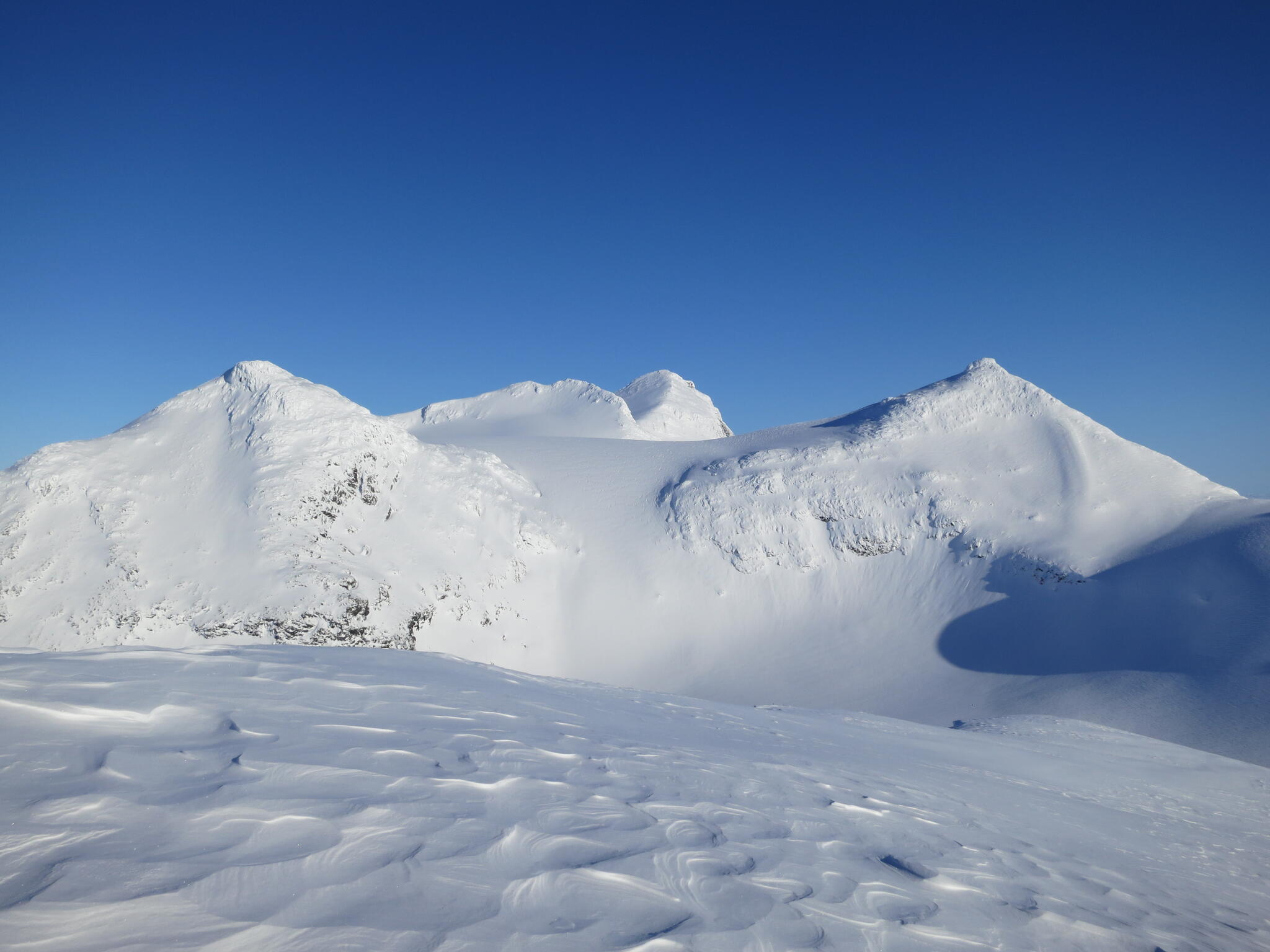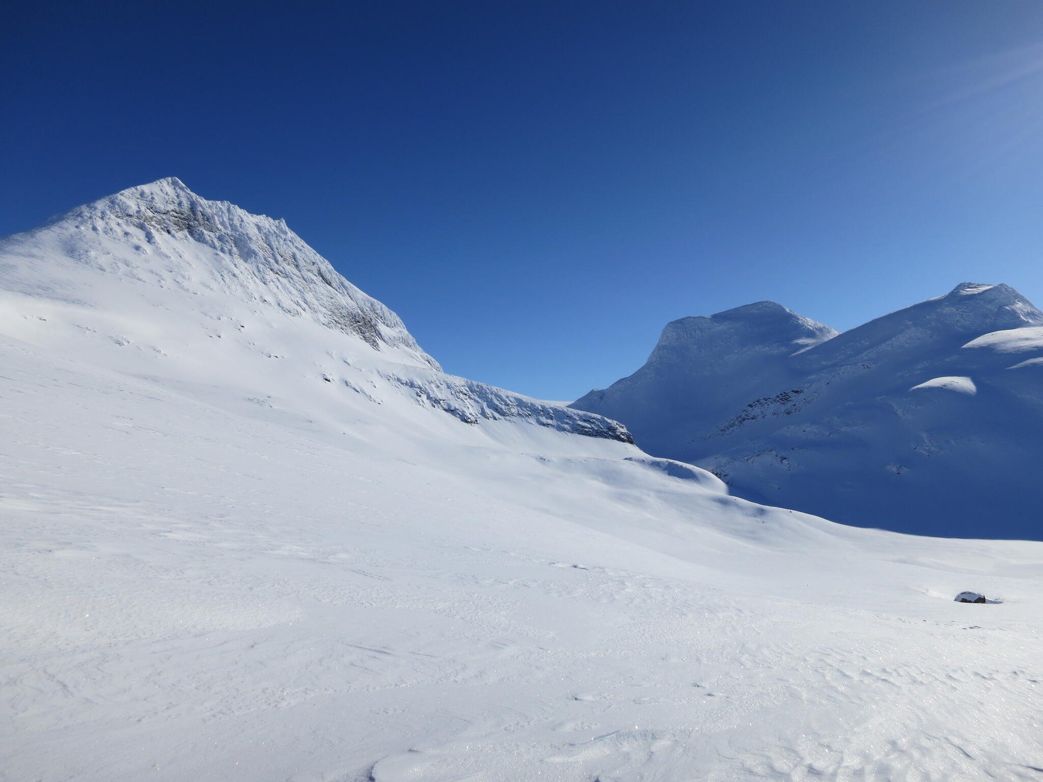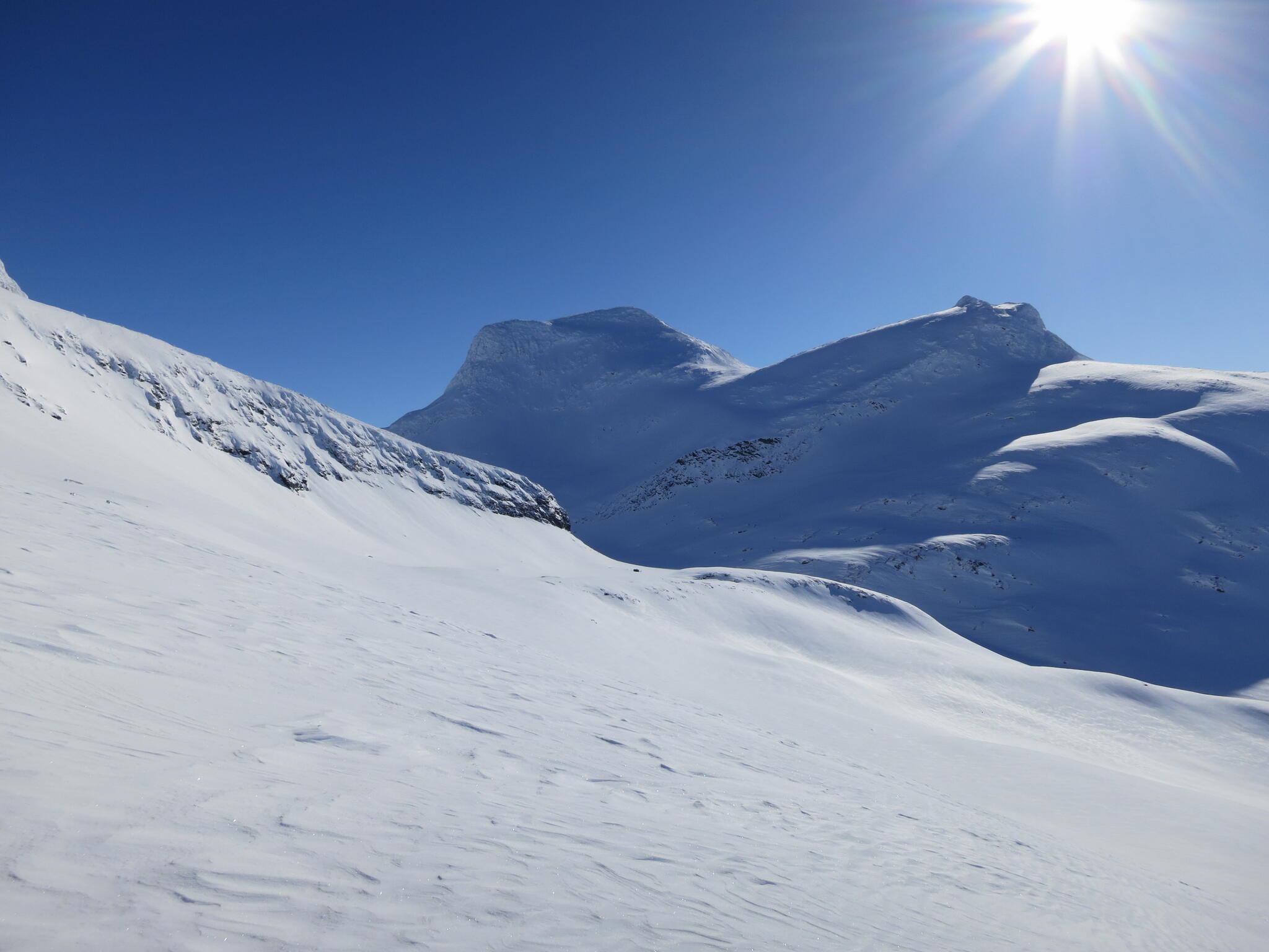 Vi fick Vardetoppen i blickfånget. Till höger om den skulle vi skida. Foto: Magnus AhnesjöFoto: Michael HeumanSårjåstjåhkka och Kokedaltinden lite längre norrut.Vardetoppen till vänster och Vágnjatjåhkkå/Otertinden till höger. Vi skulle in mellan de två bergen. Foto: Magnus AhnesjöFoto: Michael Heuman