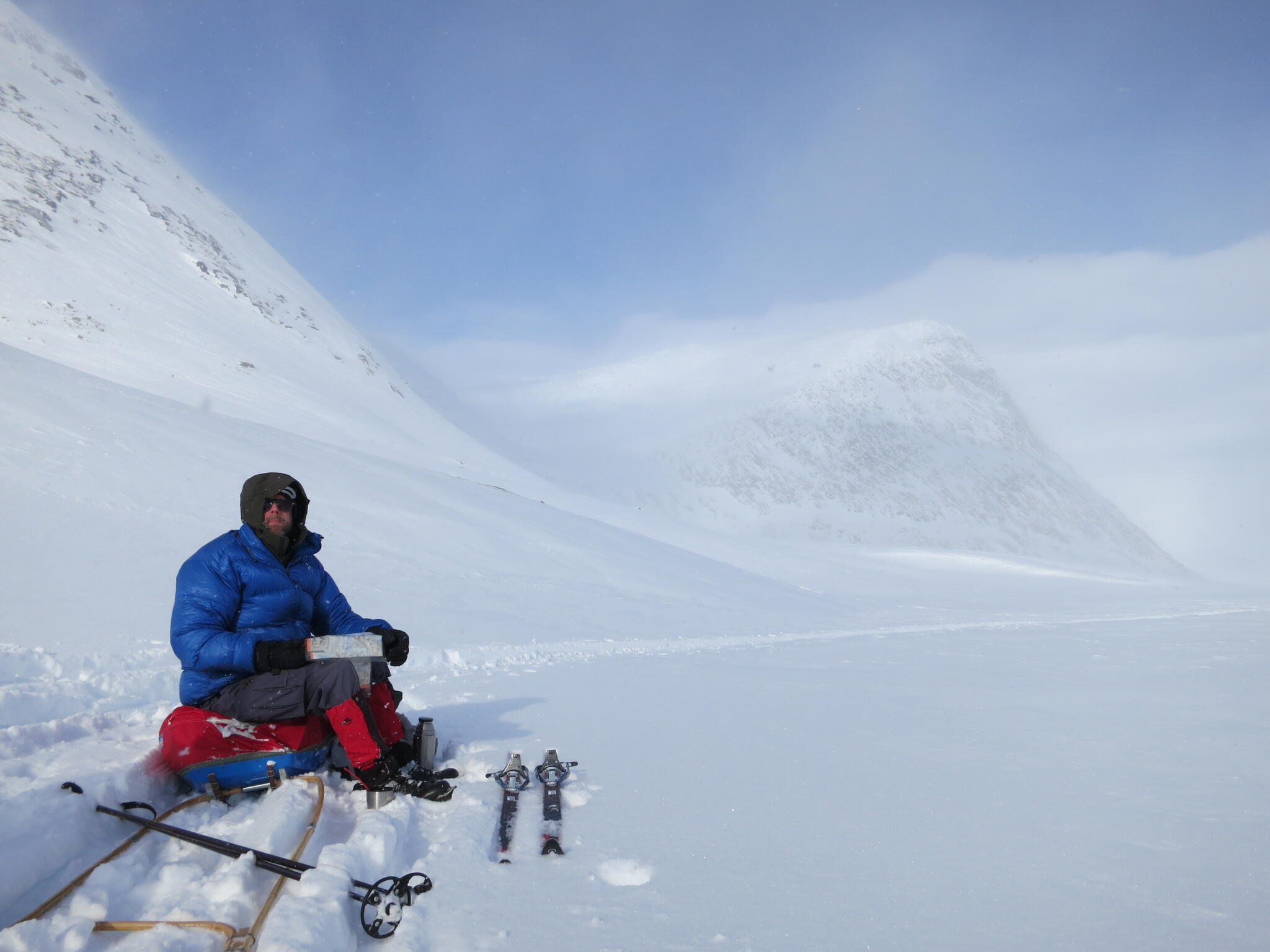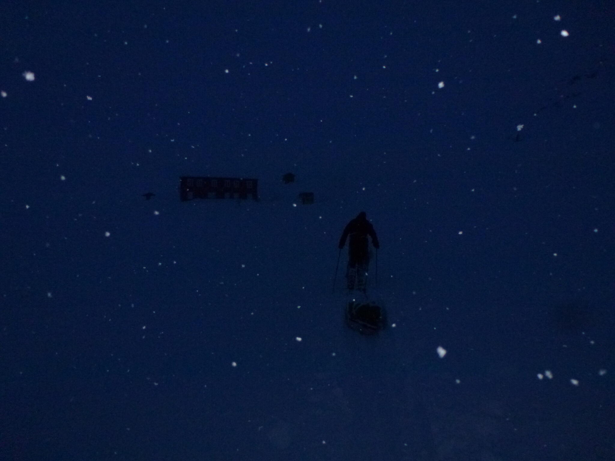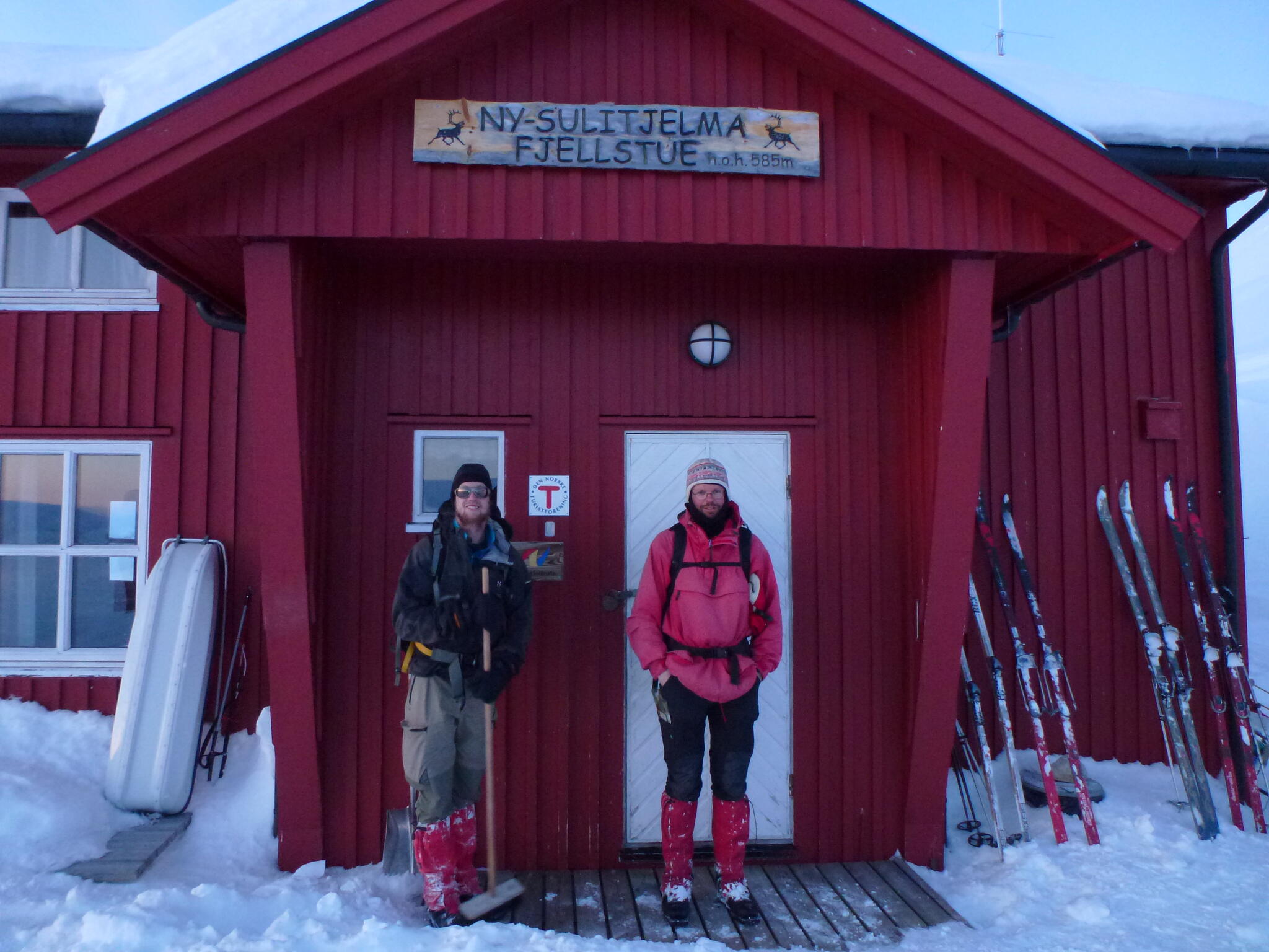 Sämre sikt kom och det började bli sent. Vägen vi skidade på hade snödrivor som var svåra att passera. Vi valde att fira ner pulkorna med rep, ner till sjön. Foto: Magnus AhnesjöFoto: Anders AhnesjöDet började mörkna och vi försökte hitta en bra väg till turisthyttan Ny-Sulitjelma. Foto: Anders AhnesjöVi kom till slut fram till Ny-Sulitjelma. I mörkret. Foto: Anders Ahnesjö