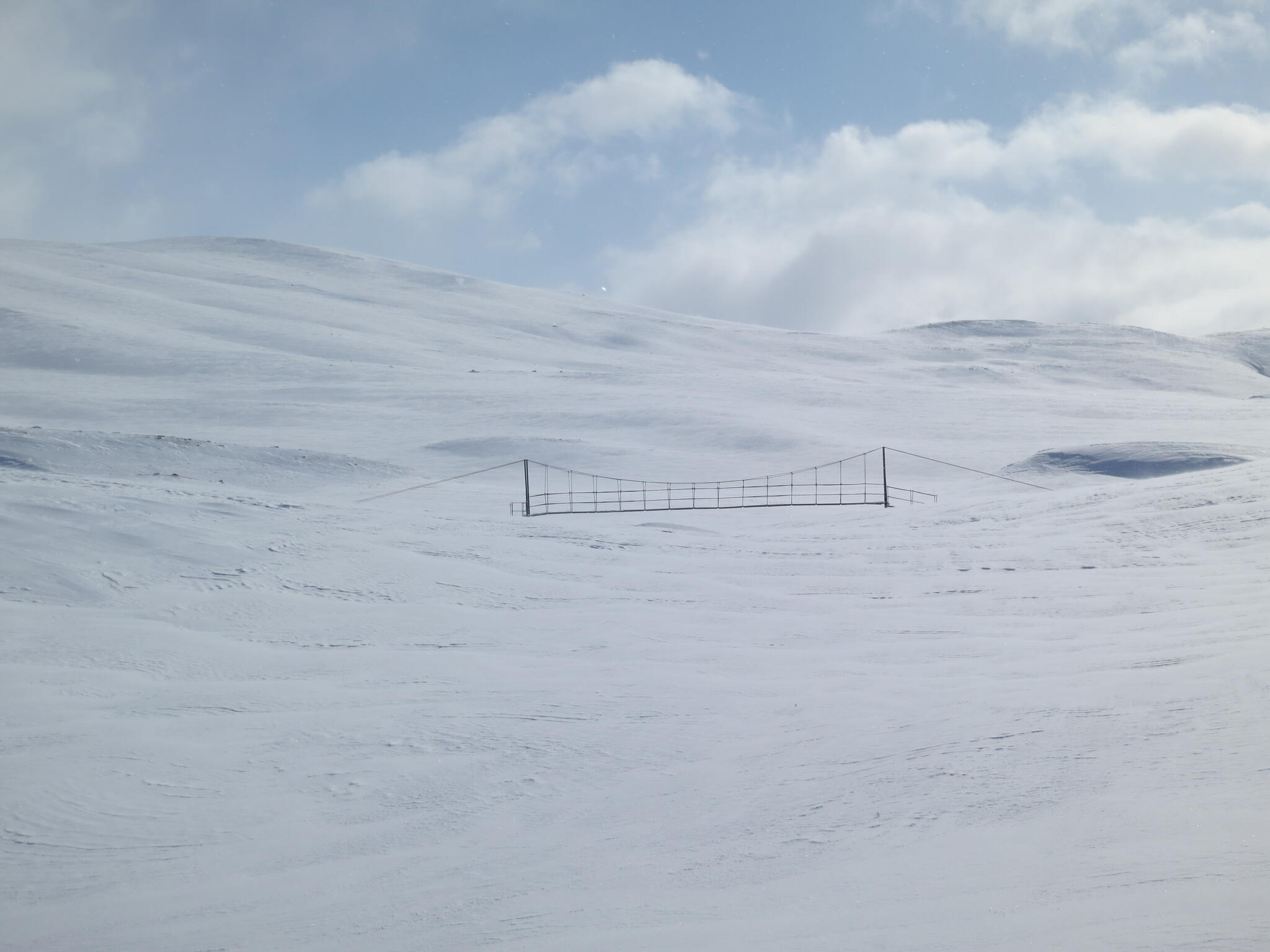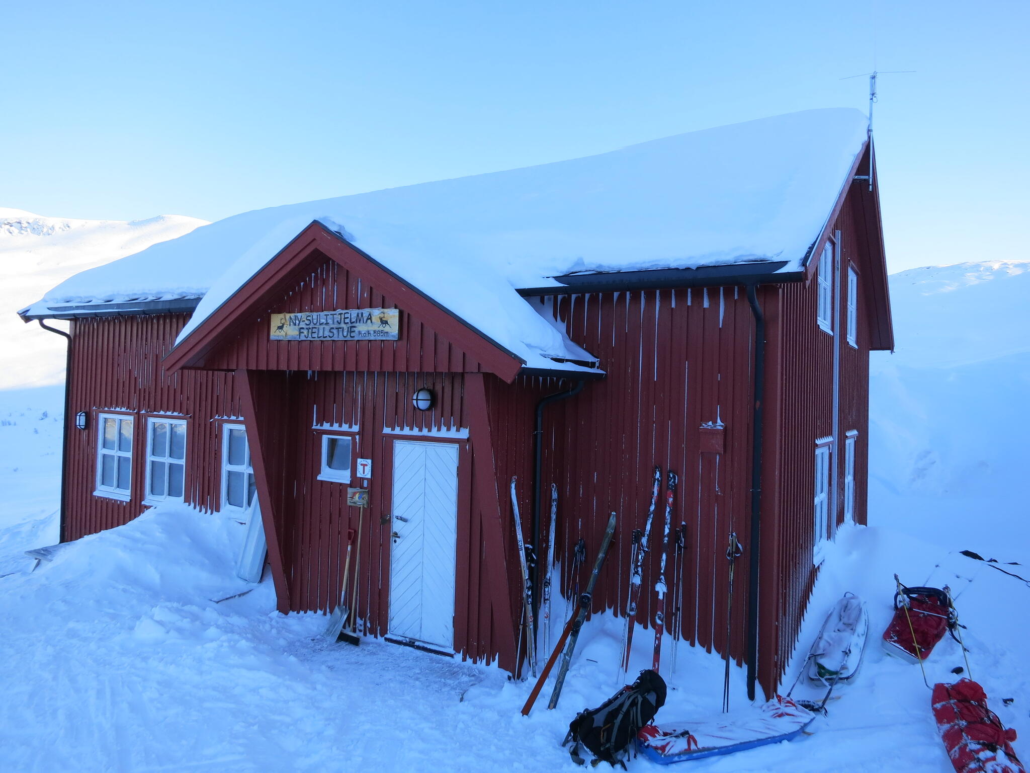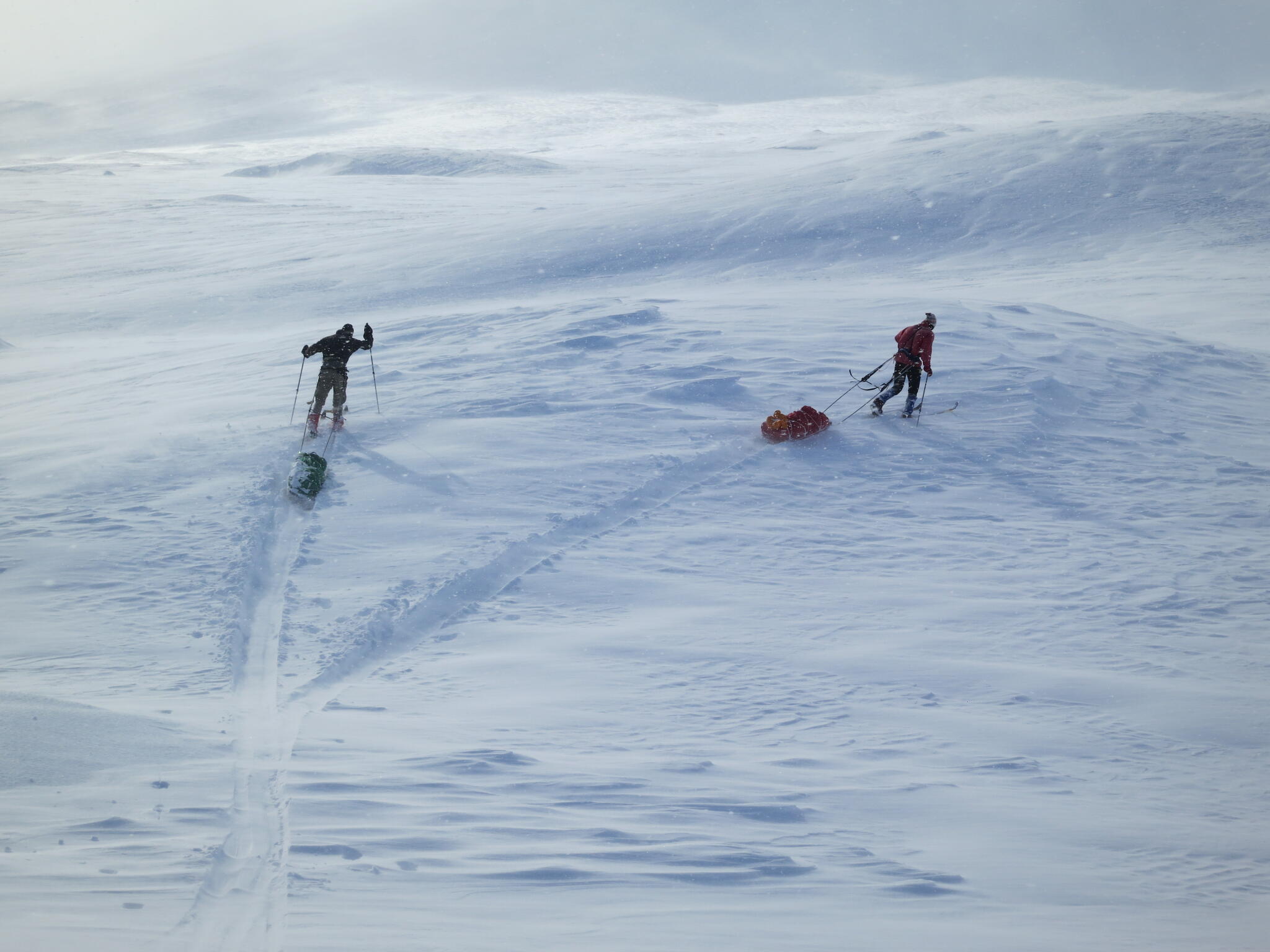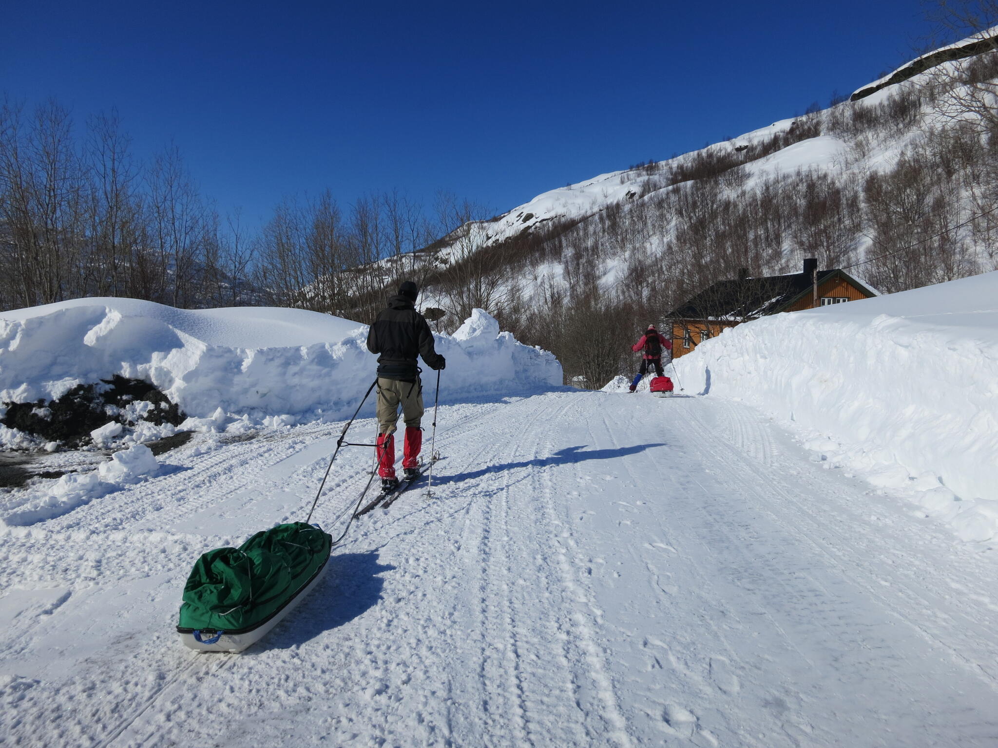Sämre sikt kom och det började bli sent. Vägen vi skidade på hade snödrivor som var svåra att passera. Vi valde att fira ner pulkorna med rep, ner till sjön. Foto: Magnus AhnesjöFoto: Anders AhnesjöDet började mörkna och vi försökte hitta en bra väg till turisthyttan Ny-Sulitjelma. Foto: Anders AhnesjöVi kom till slut fram till Ny-Sulitjelma. I mörkret. Foto: Anders Ahnesjö