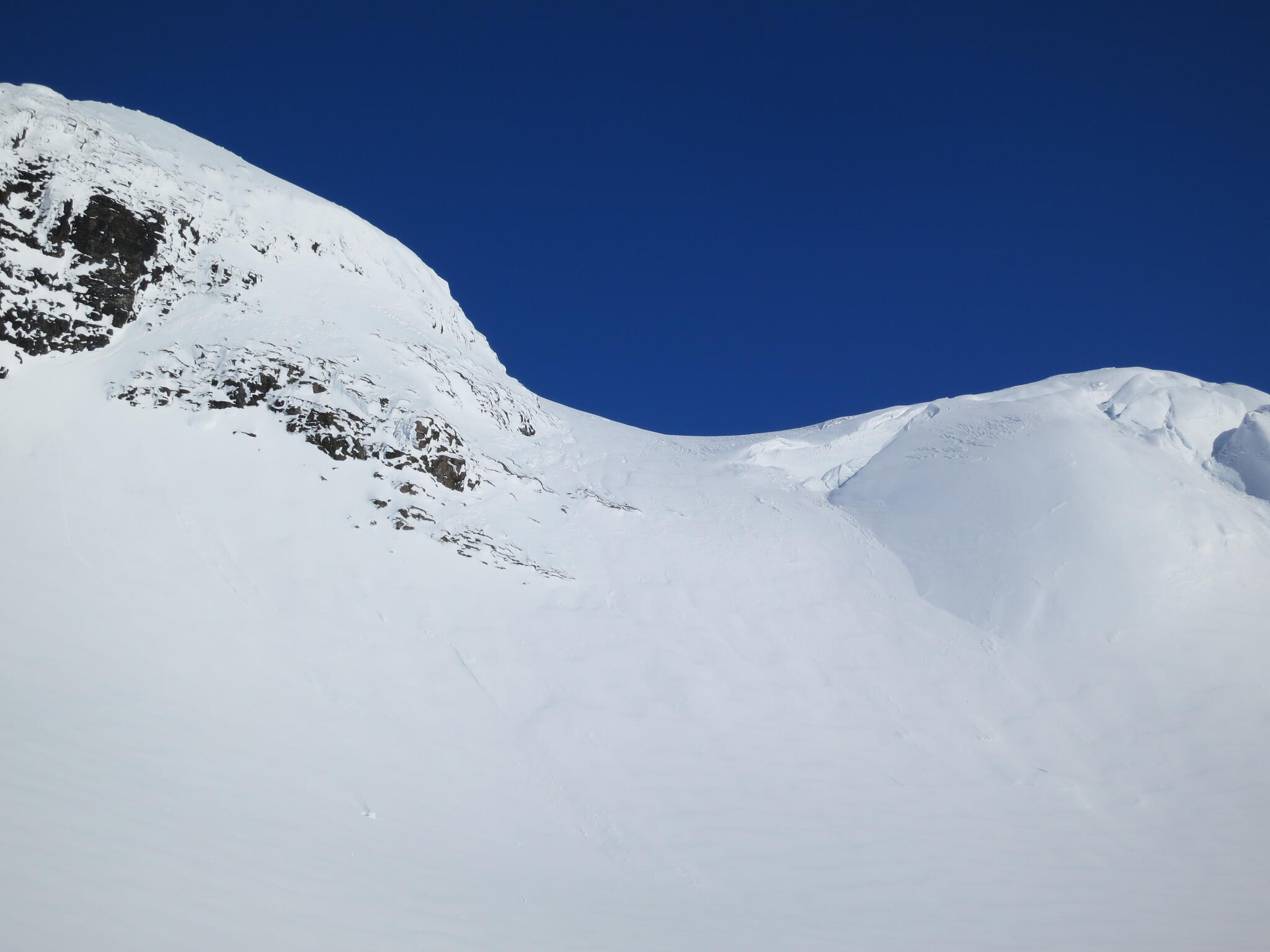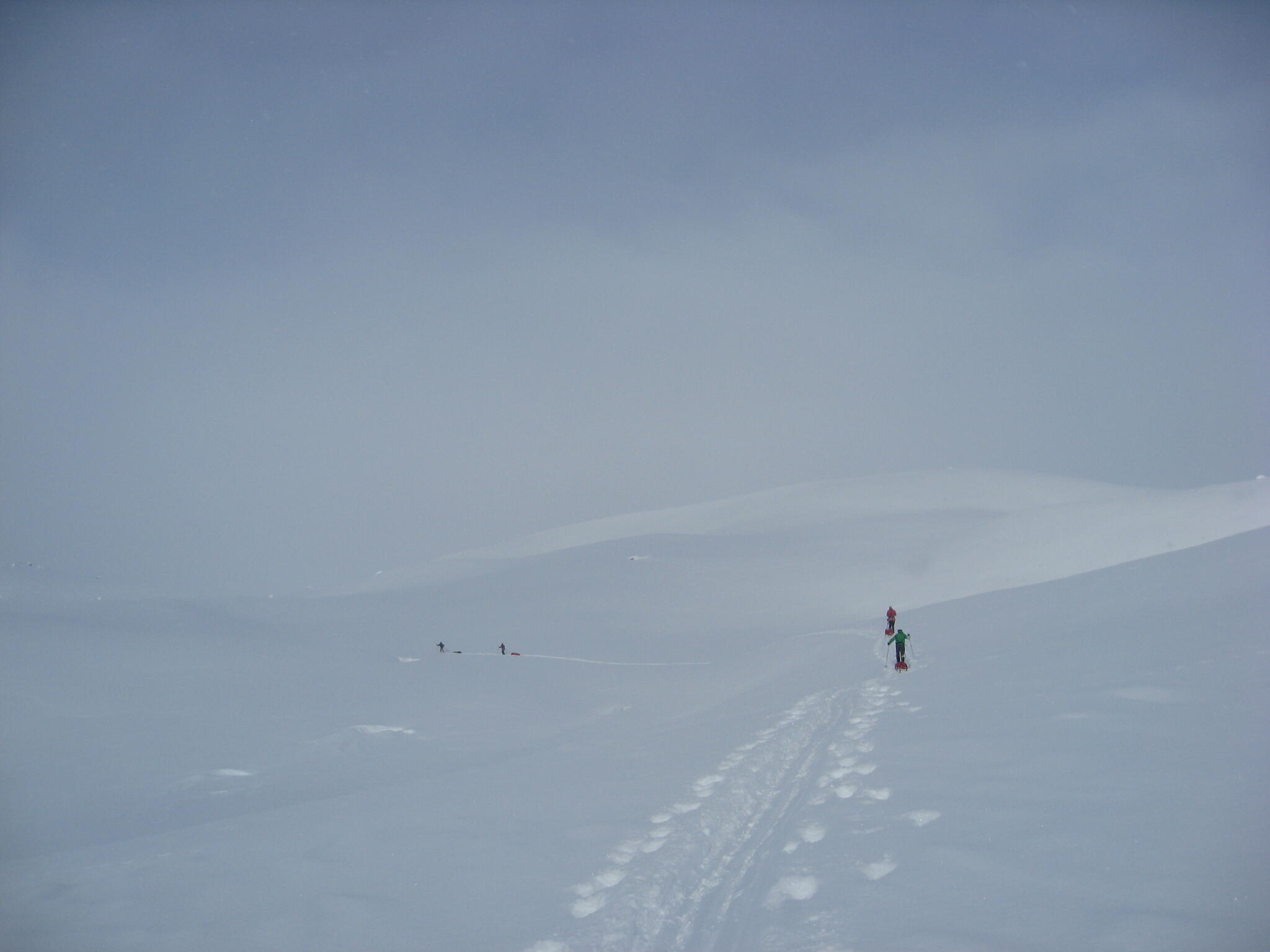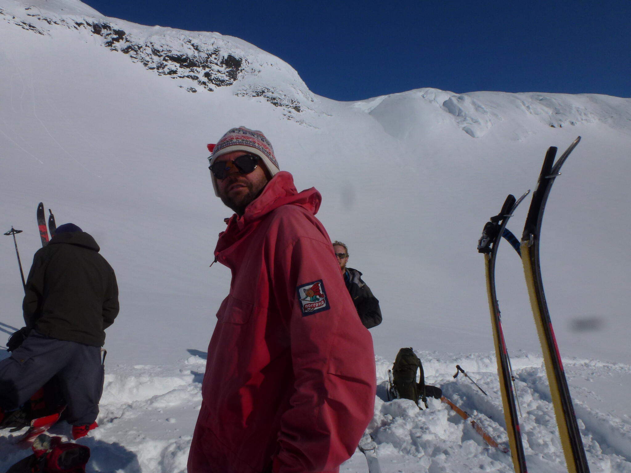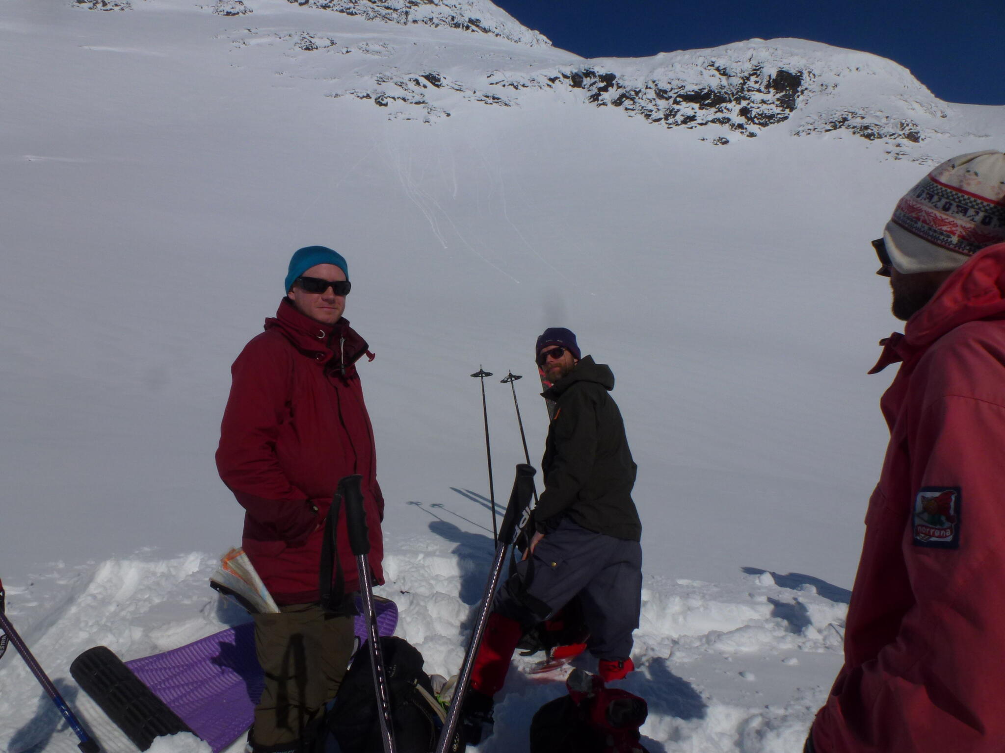 Vi velade hur vi skulle göra. Mycket lössnö på en brant sluttning. Förmodligen skulle det fungera, men vi kom fram till att vi inte skulle ta risken. Vi skidade istället till Kokdaltinden. En topp som såg ut att erbjuda fin utsikt.