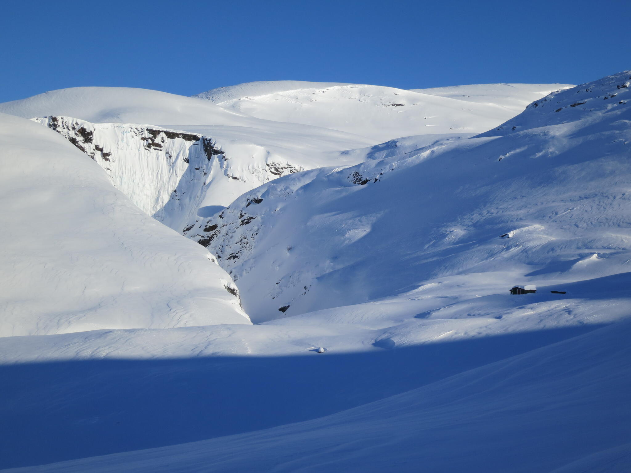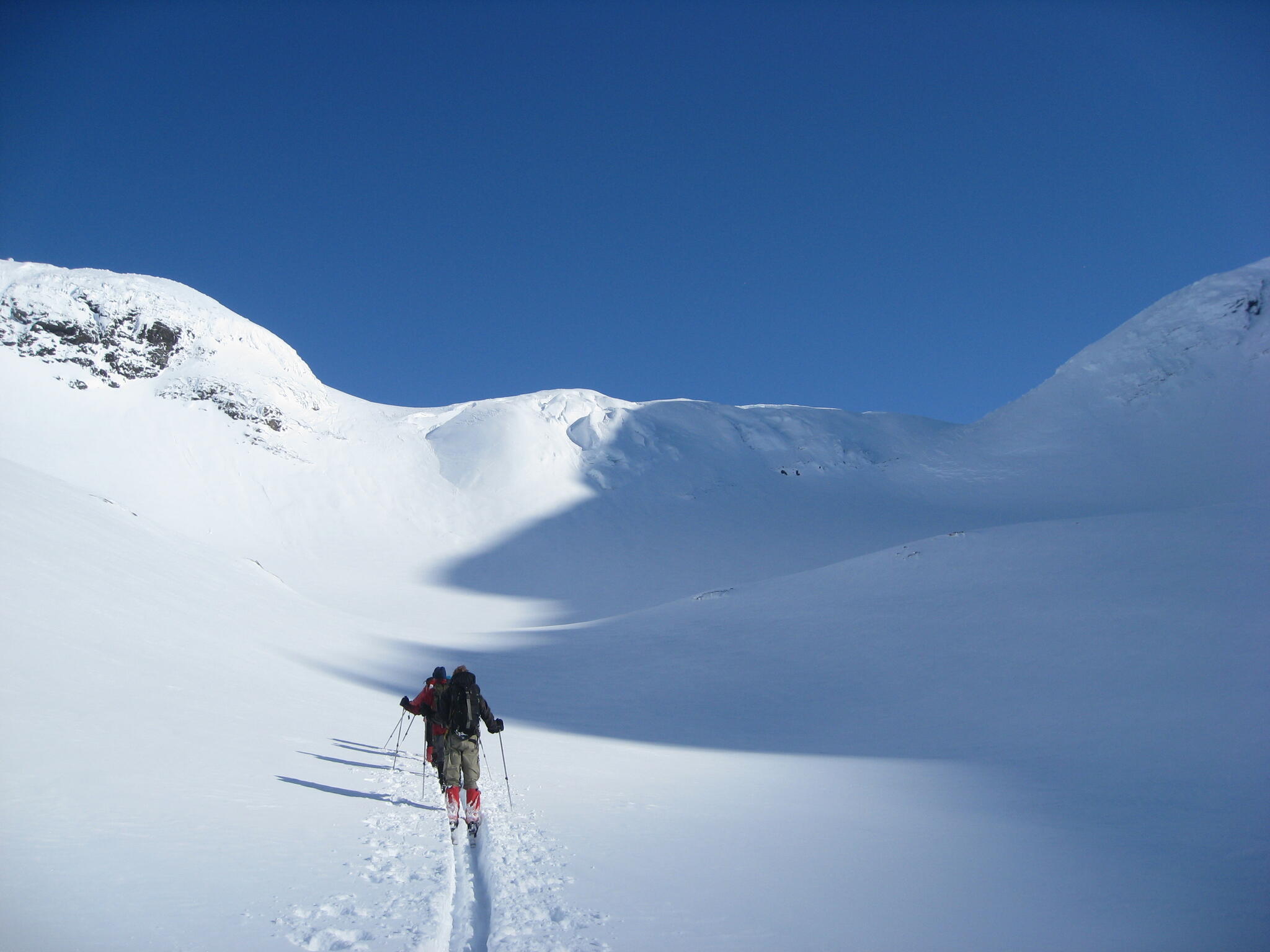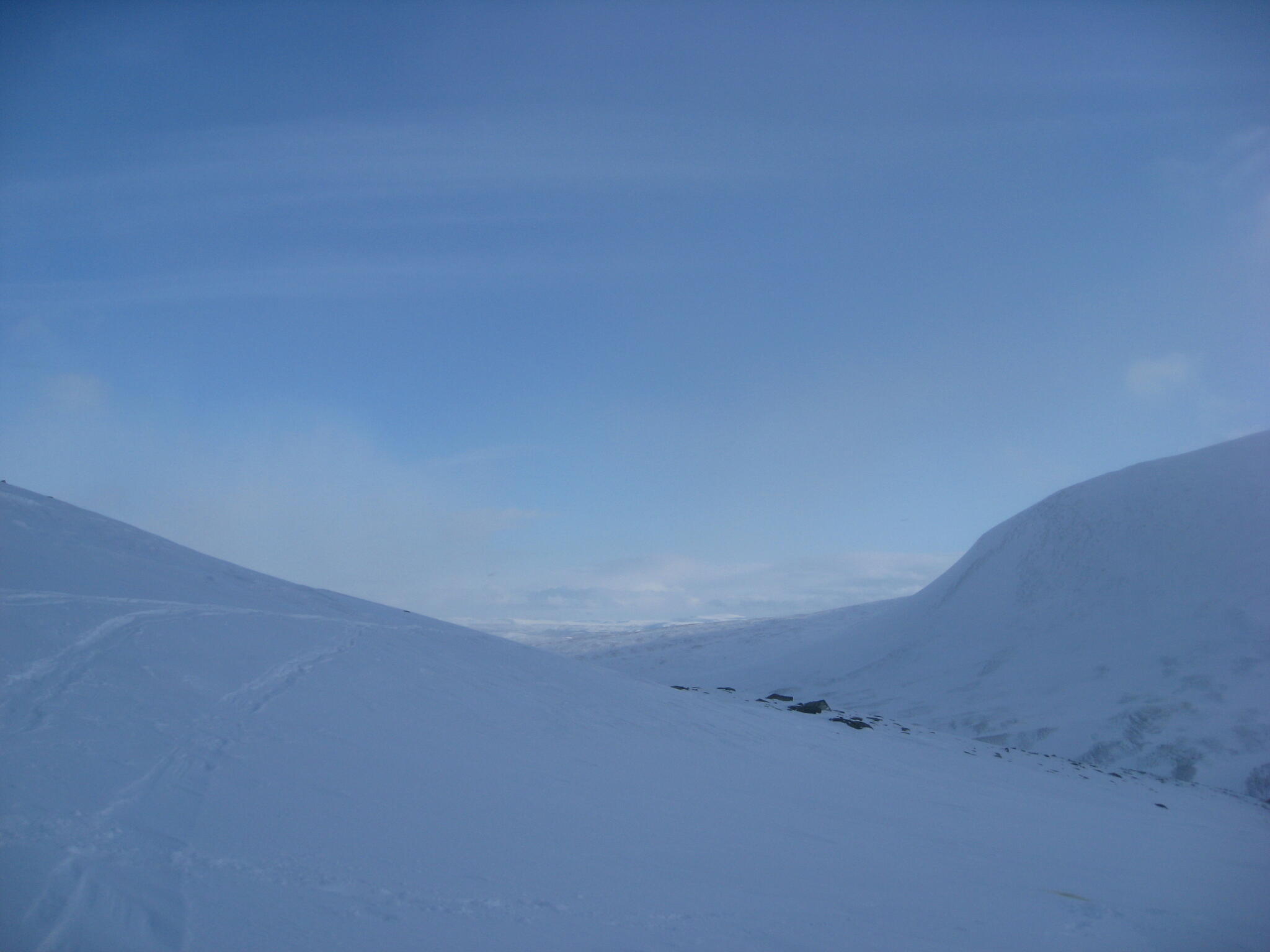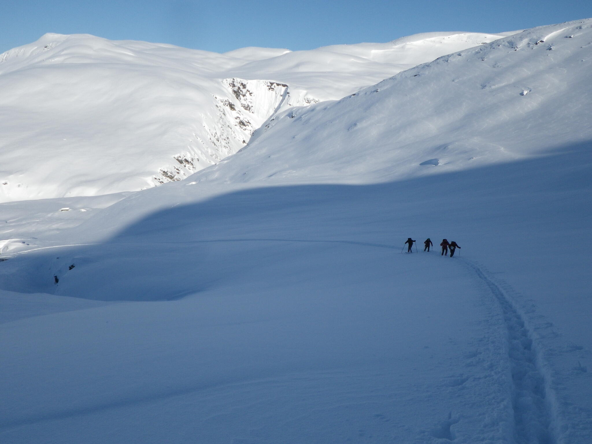 Vi velade hur vi skulle göra. Mycket lössnö på en brant sluttning. Förmodligen skulle det fungera, men vi kom fram till att vi inte skulle ta risken. Vi skidade istället till Kokdaltinden. En topp som såg ut att erbjuda fin utsikt.