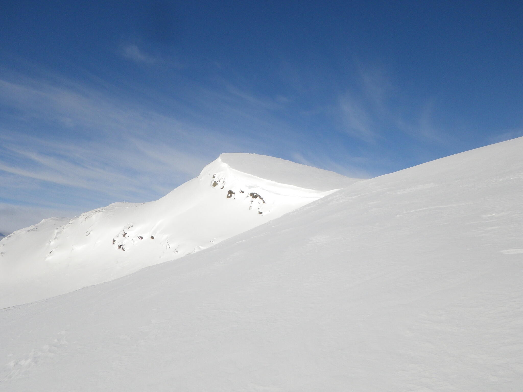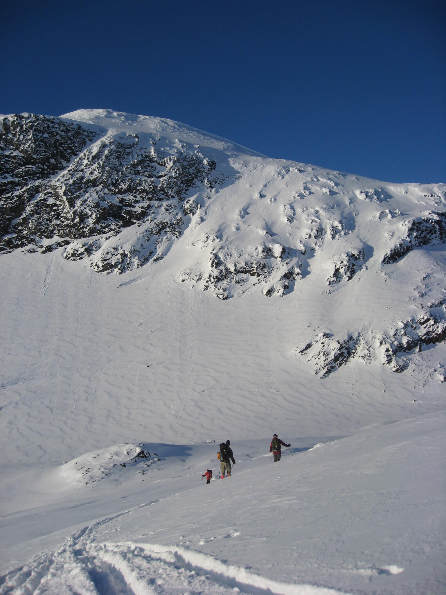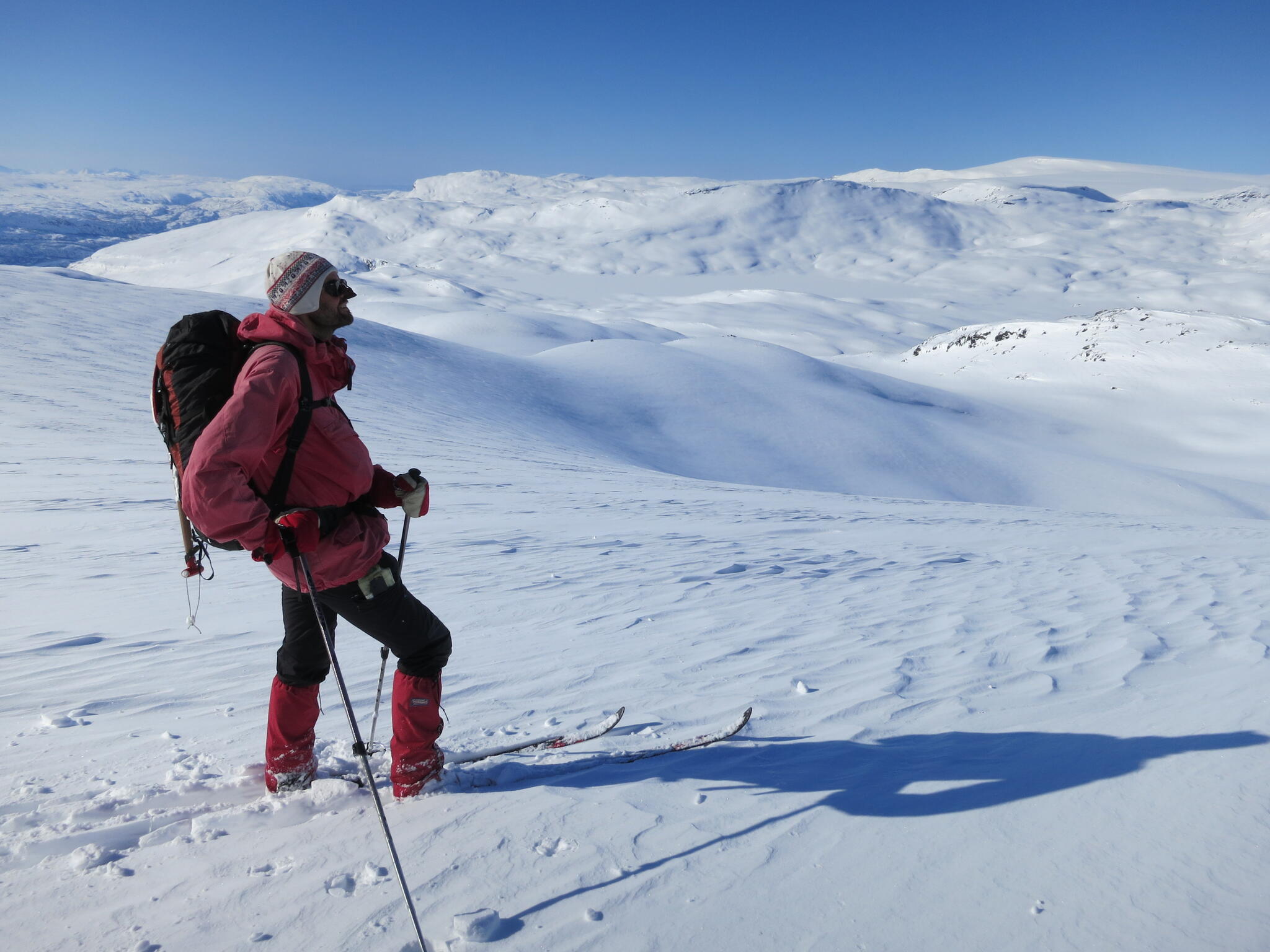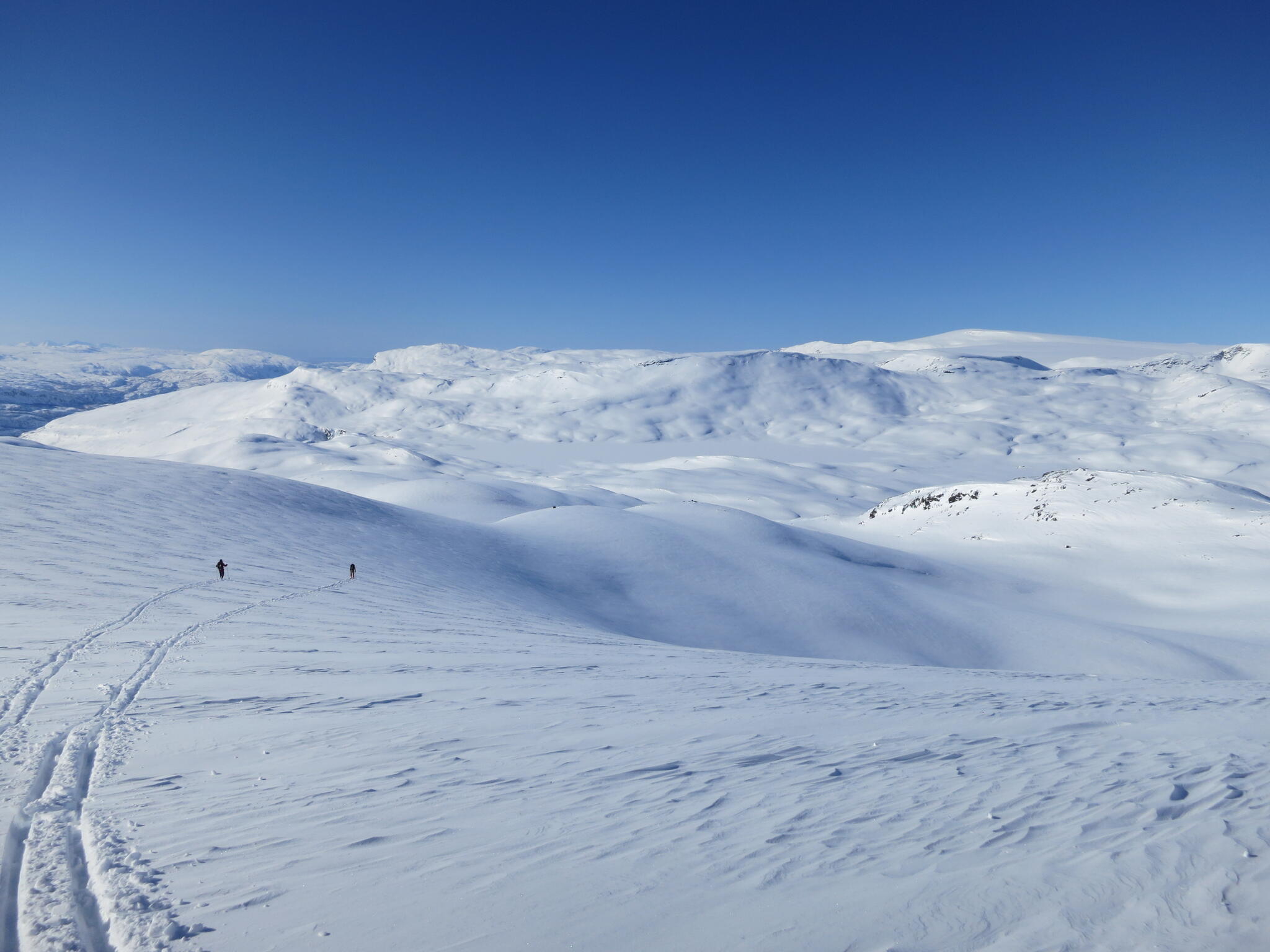 Vi velade hur vi skulle göra. Mycket lössnö på en brant sluttning. Förmodligen skulle det fungera, men vi kom fram till att vi inte skulle ta risken. Vi skidade istället till Kokdaltinden. En topp som såg ut att erbjuda fin utsikt.