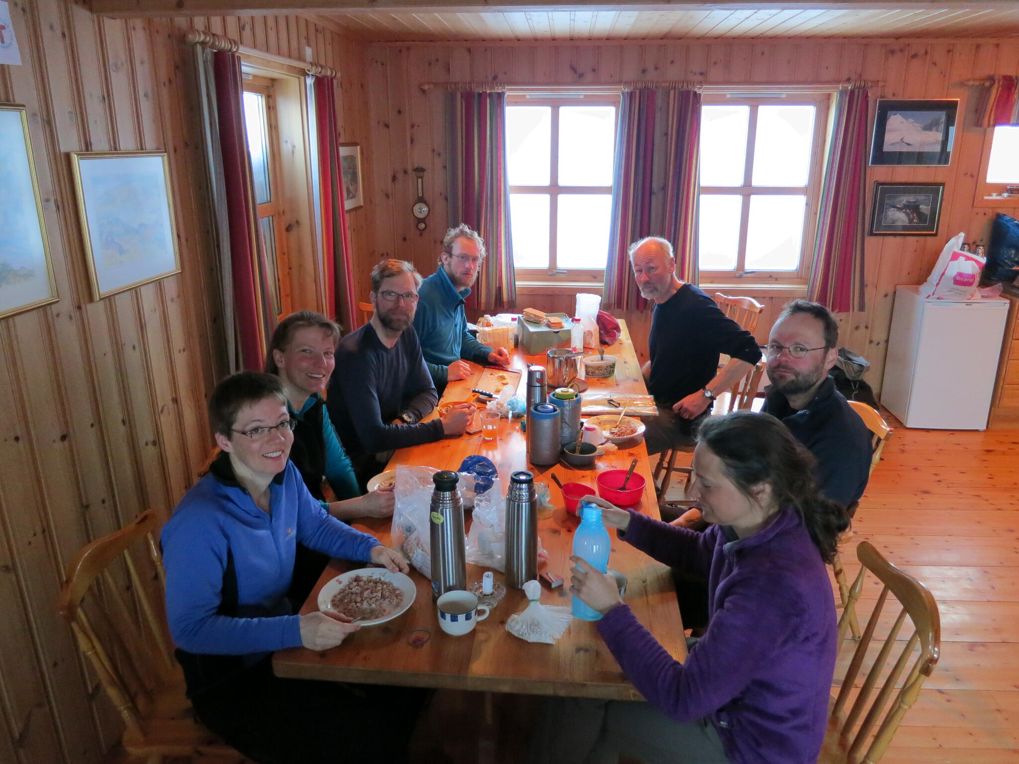 Vi var inte ensamma i stugan. Det blev en stor kontrast mot hårt slitande ute i snön till att äta fruskot i en ovanligt lyxig fjällstuga, dessutom tillsammans med andra.