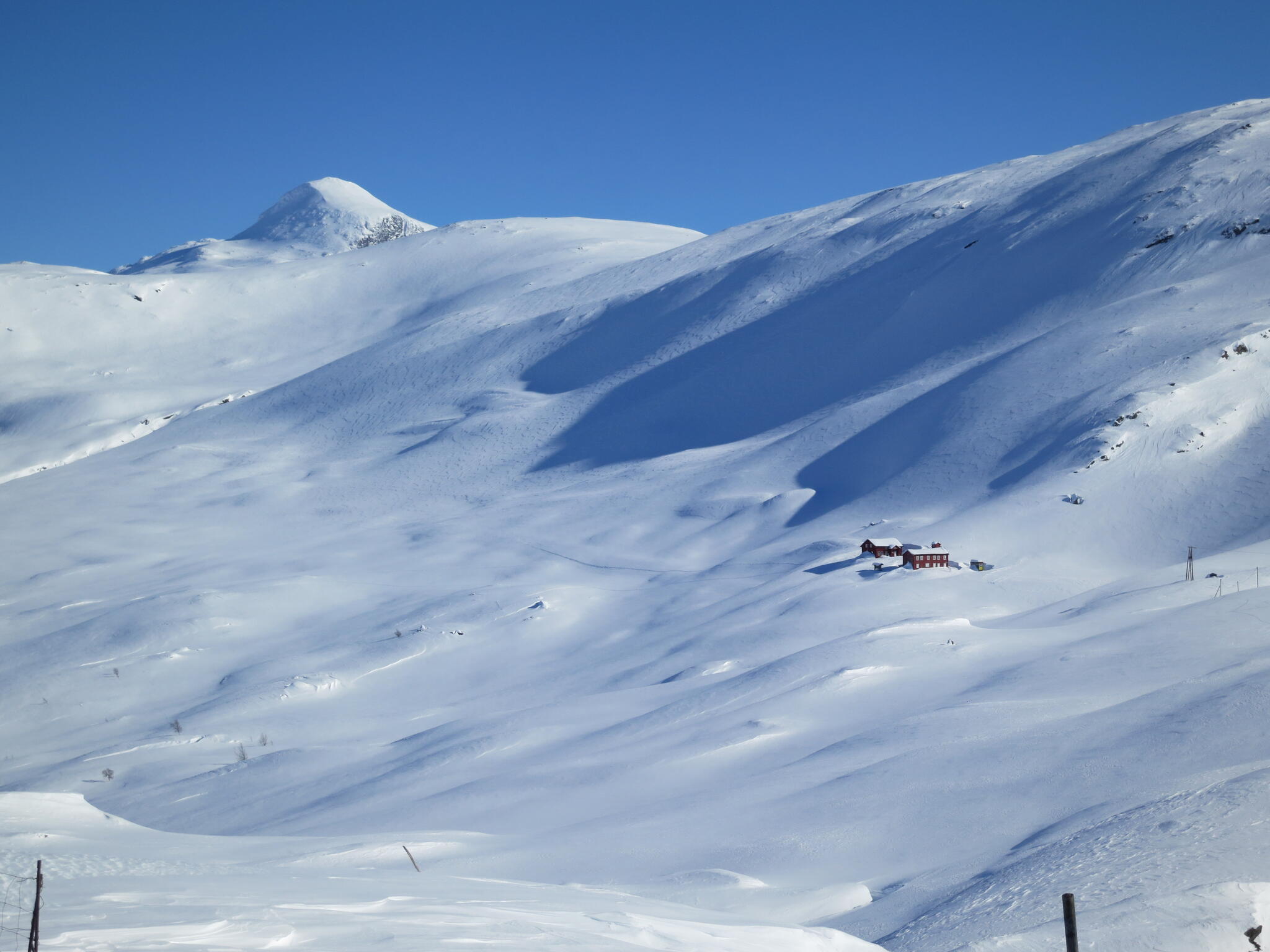 Stugan vi bott i syns tydligt på bilden. Ny-Sulitjelma.Foto: Anders AhnesjöVi började vår vådliga nerfart mot samhället. Det är bitvis rätt brant . Man har en ganska smal väg att skida på med frusna skoterspår. Det gällde att bromsa hela tiden.