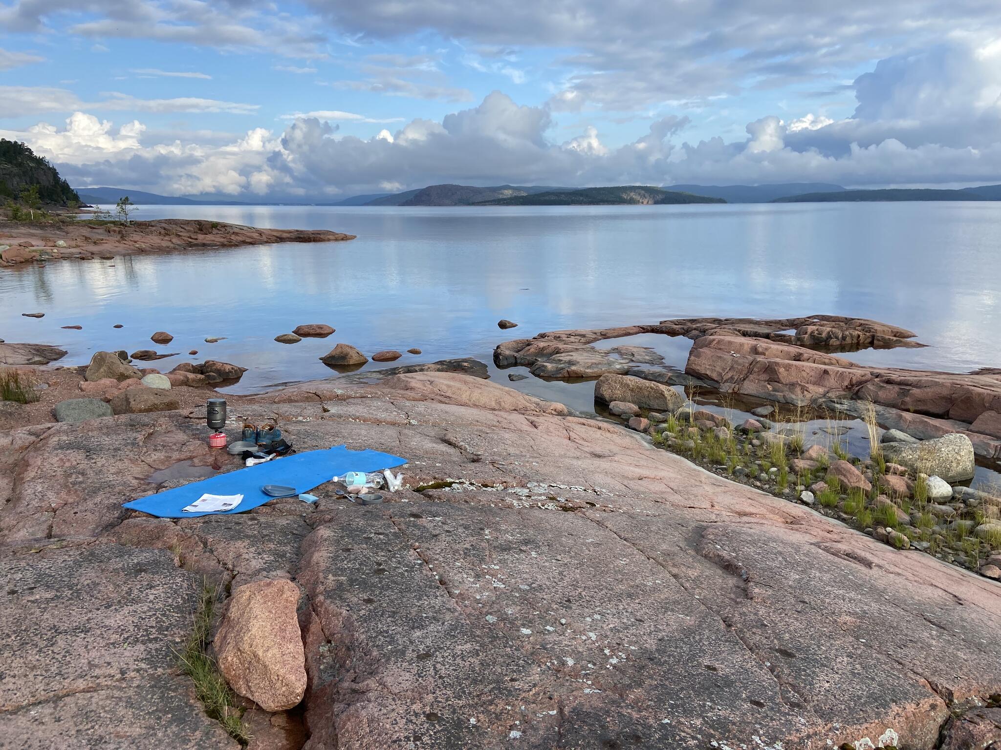 Vid ett vindskydd i Grönviksfjärden tältade jag. Det blev ett varmt dopp i skymningen och härligt att ligga på klipporna som värmts upp under dagen.