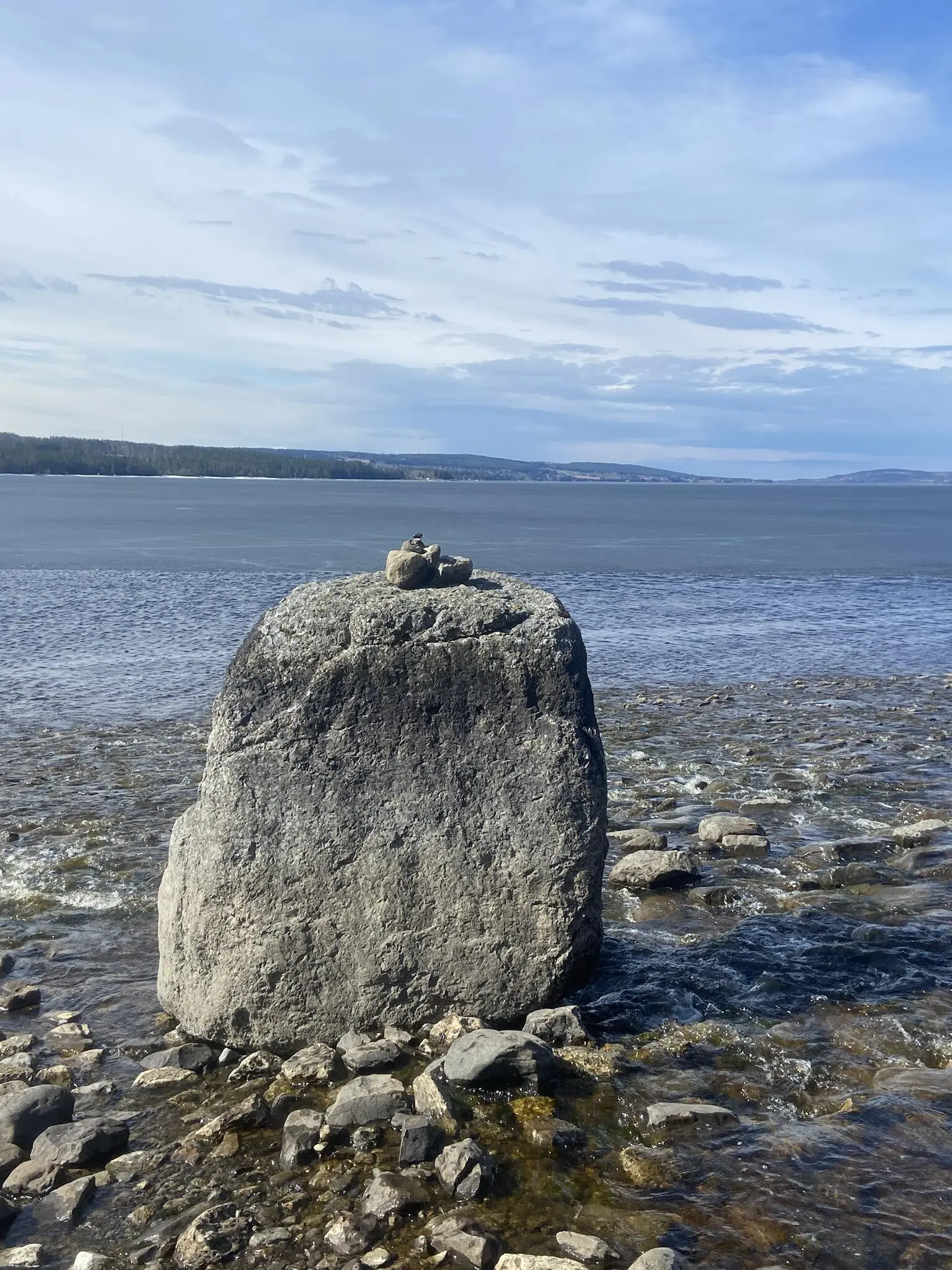 På en hög stor sten i vattenkanten byggde vi ett litet stenröse. Vi tänkte det kan se kul ut när stenen är en liten i sjön. Vi får återvända i sommar och kolla.